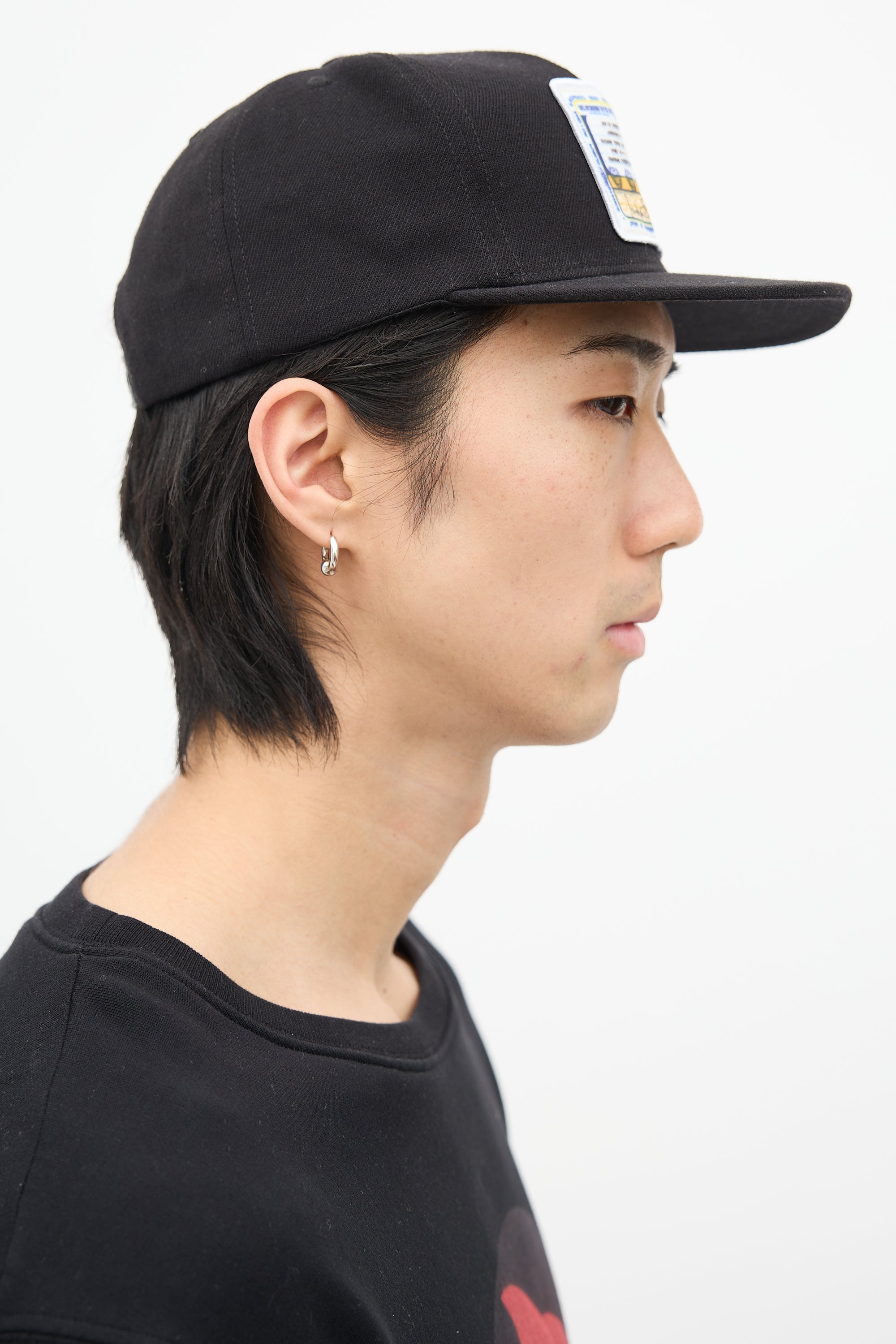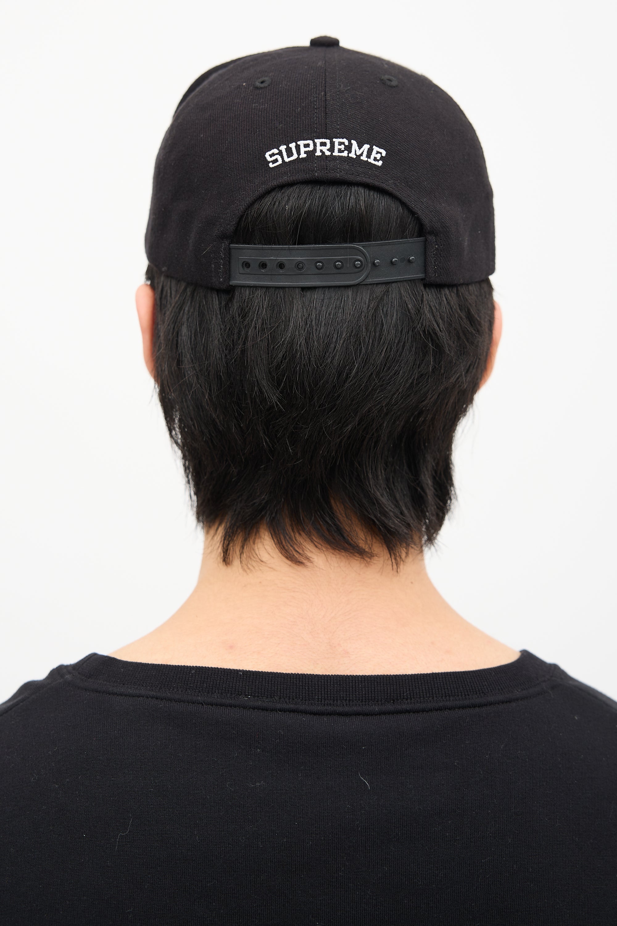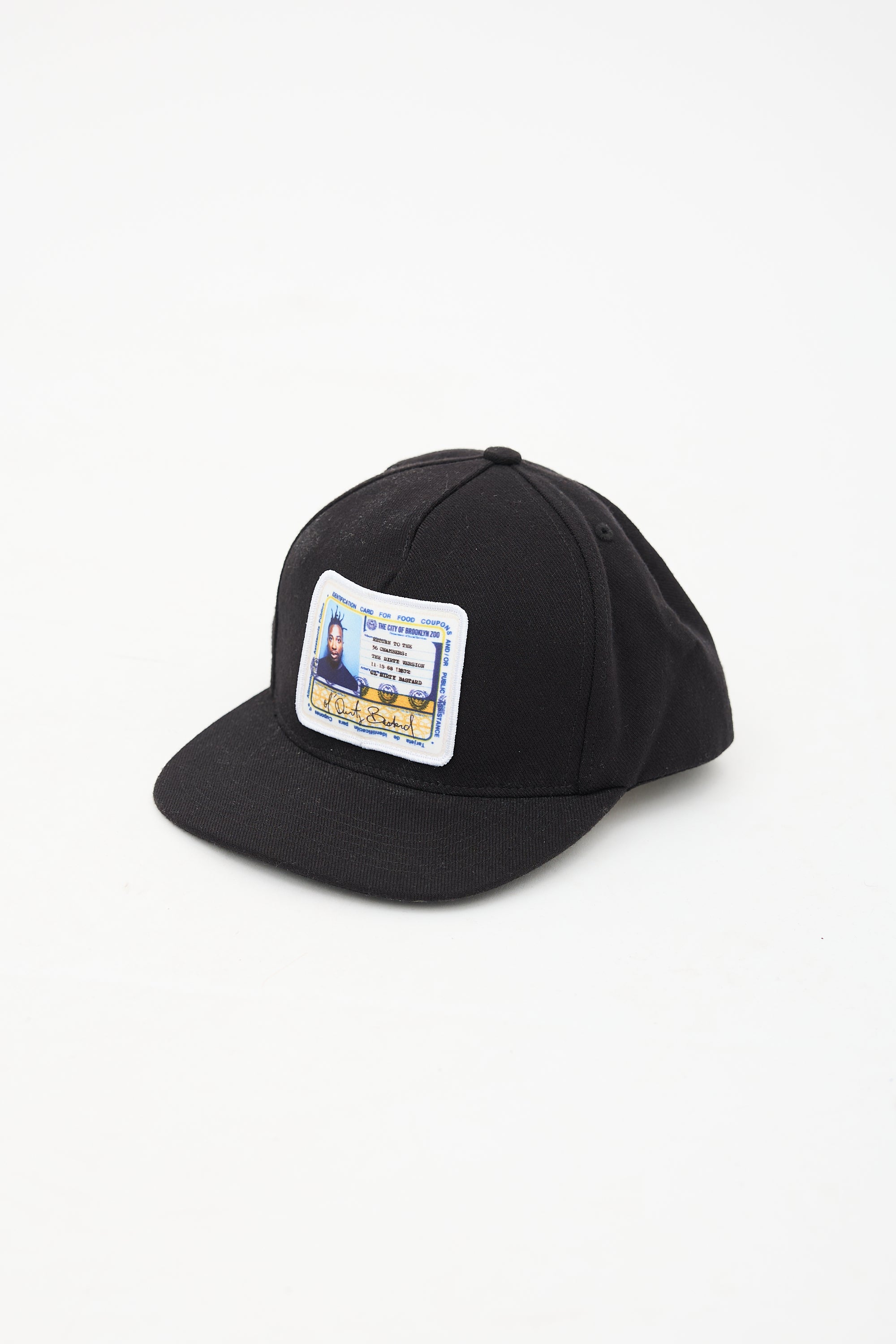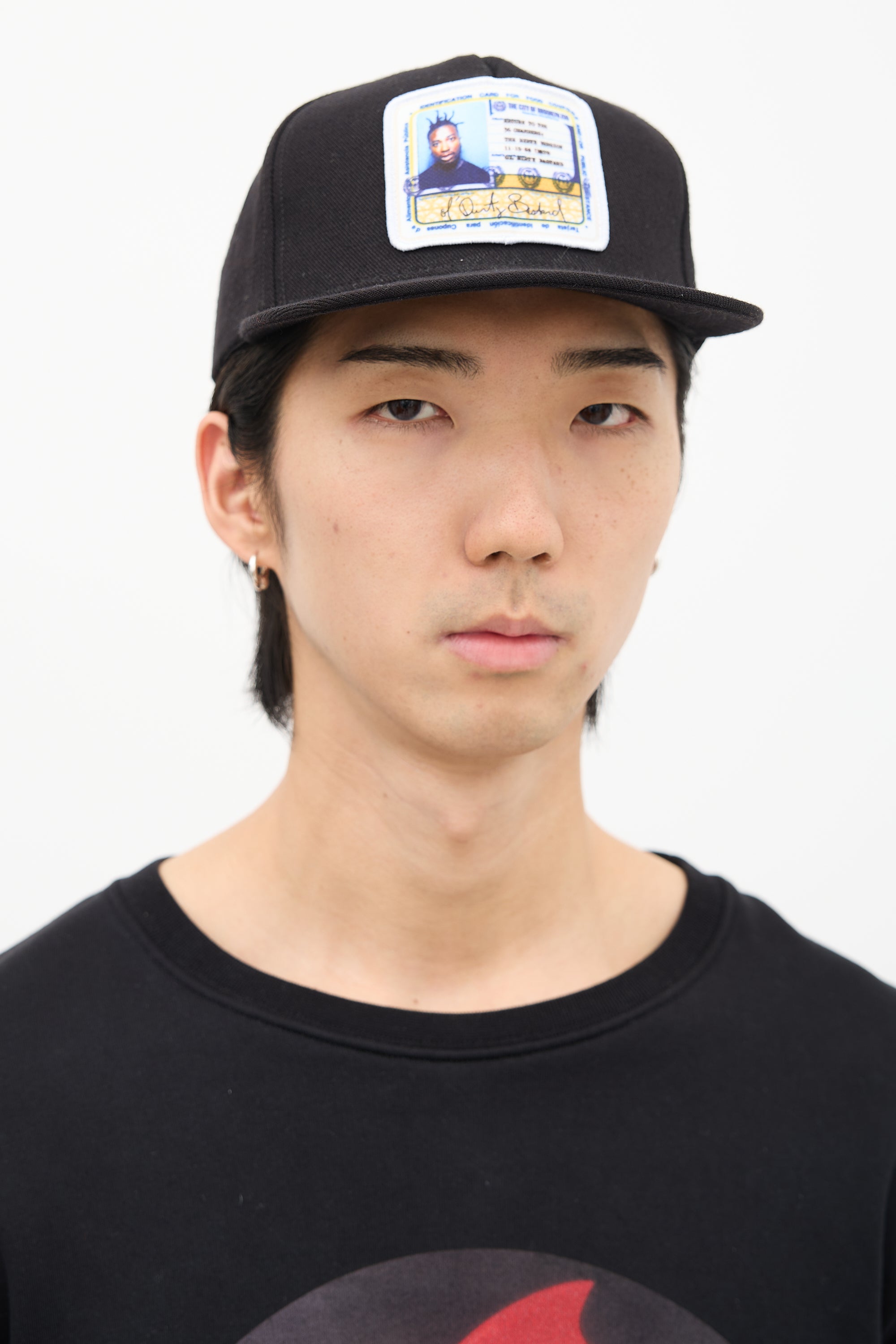 Pre-owned Supreme black hat featuring five panel design, multicolour Ol' Dirty Bastard ID motif patch at front, white embroidered logo at back, and snap back.