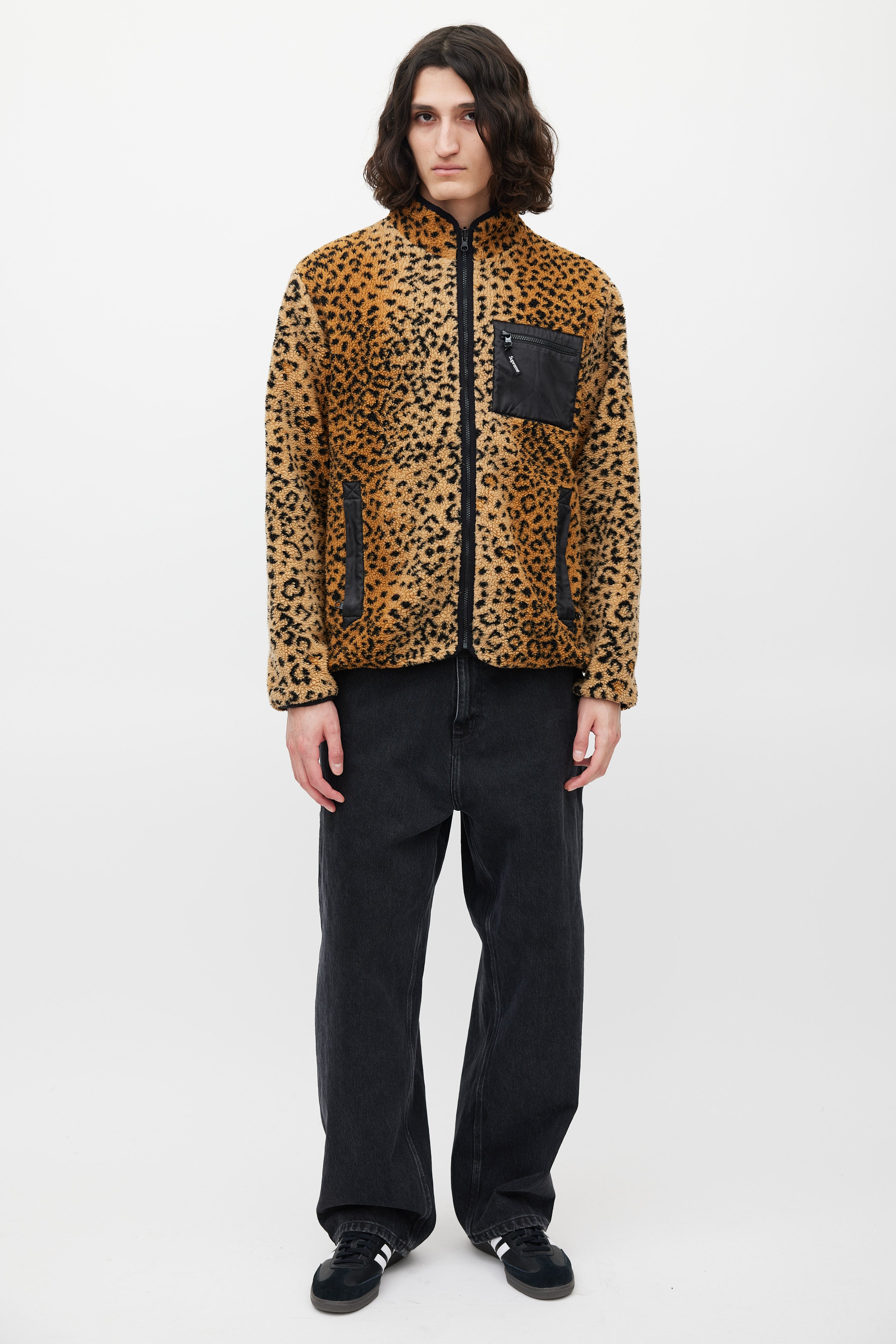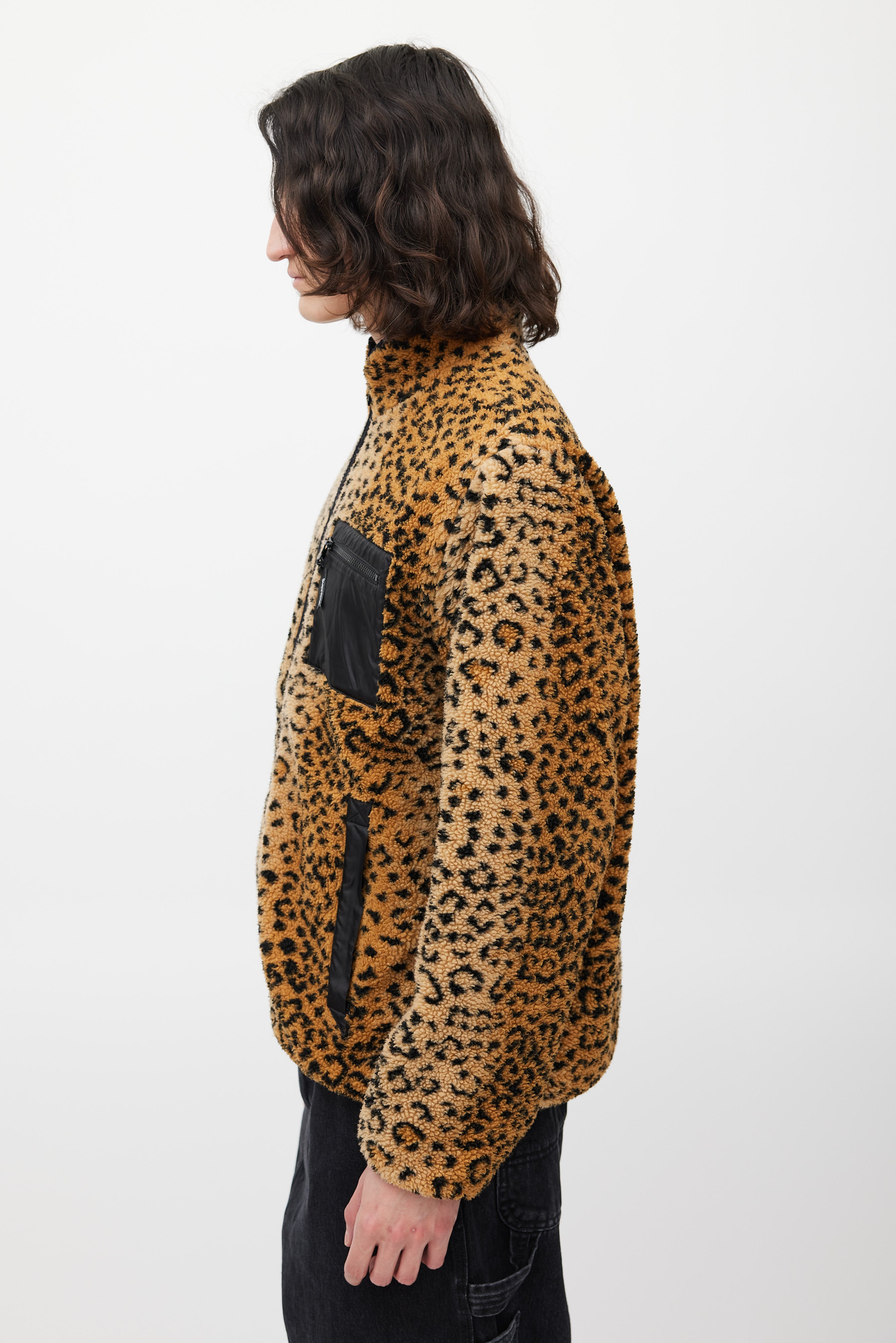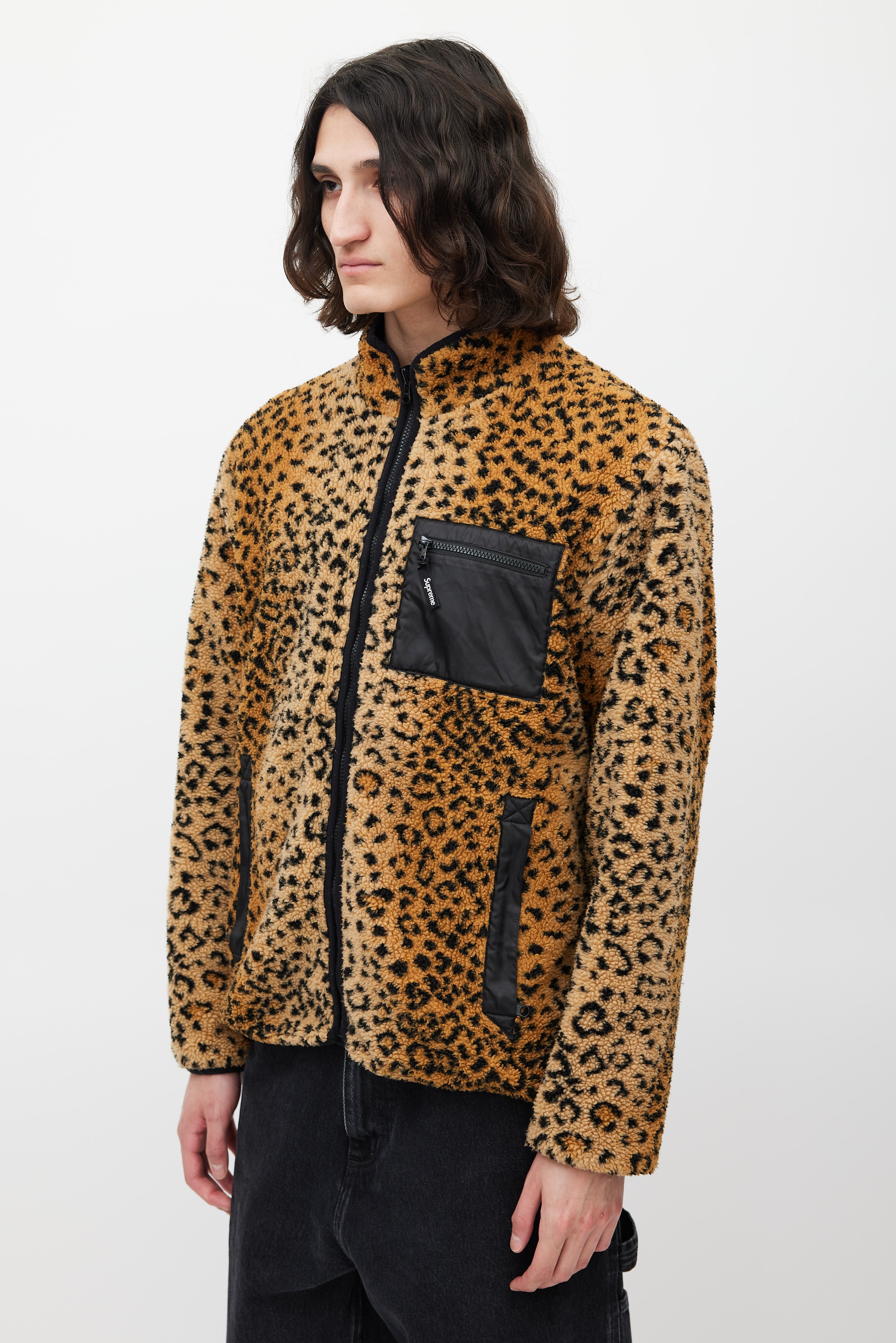 Pre-owned Supreme brown reversible fleece jacket featuring a black leopard pattern throughout funnel neck collar, two zip pockets at hip, one zip pocket at chest, and zip closure. Lined.