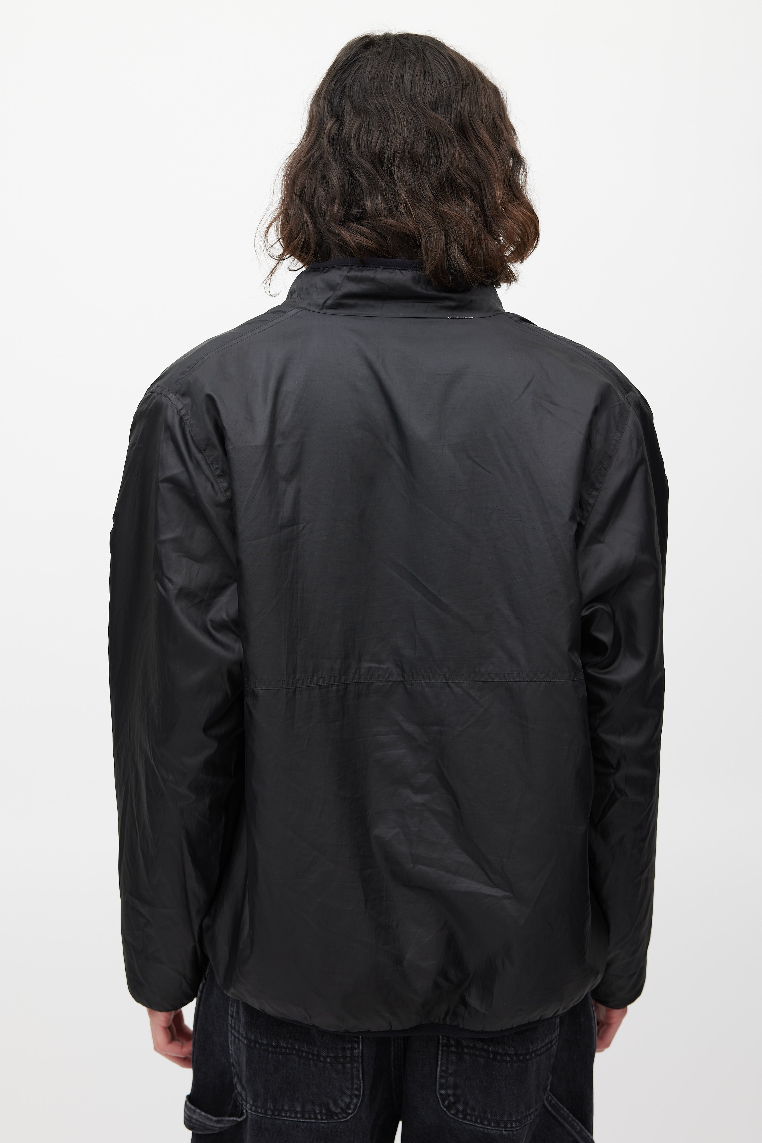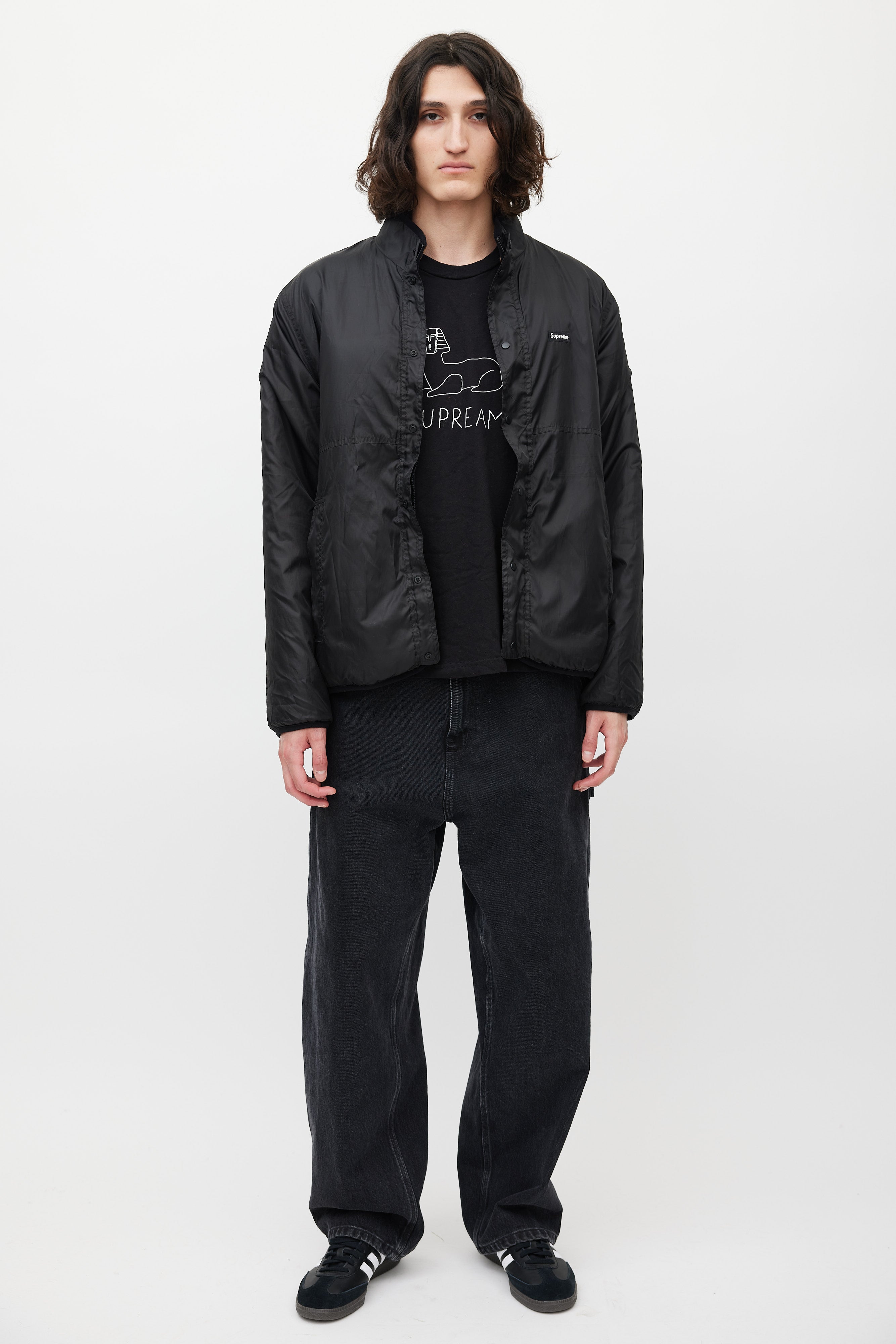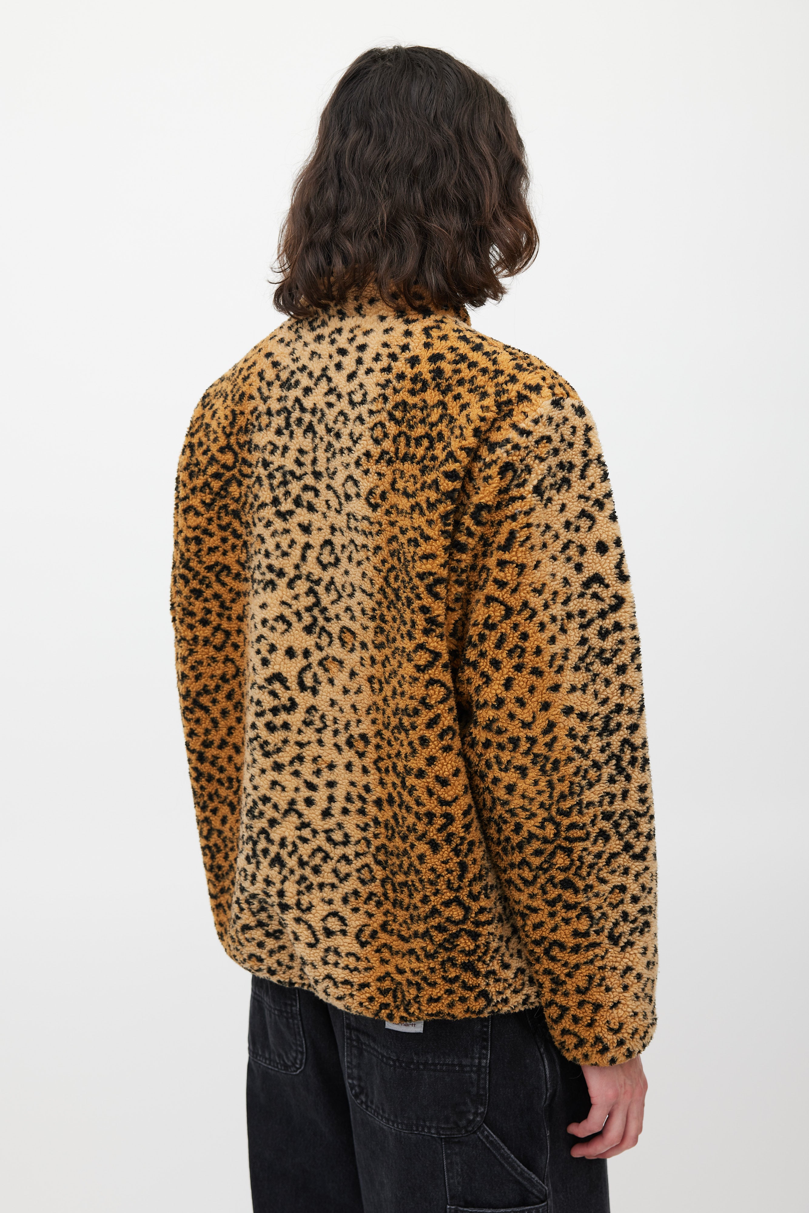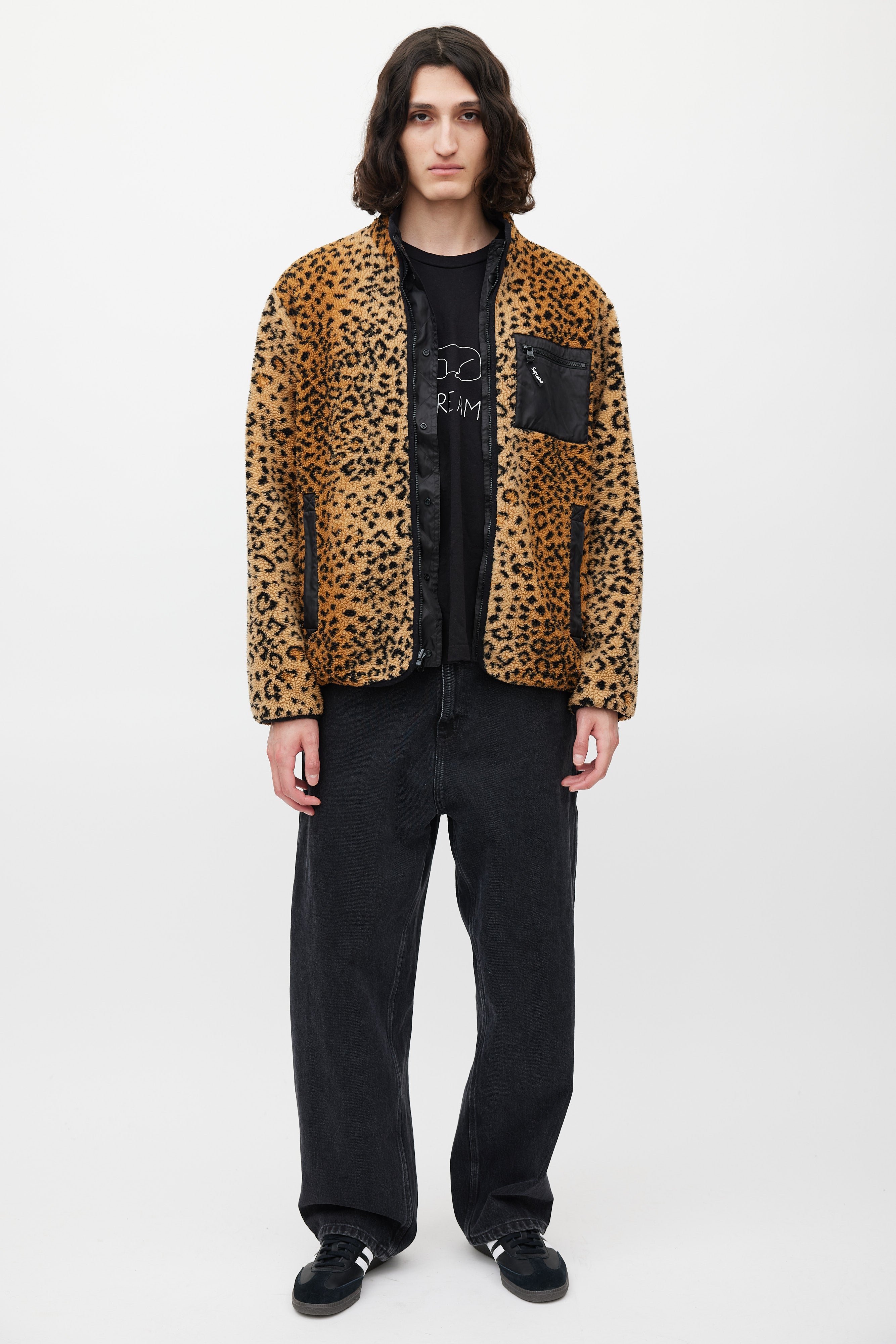Pre-owned Supreme brown reversible fleece jacket featuring a black leopard pattern throughout funnel neck collar, two zip pockets at hip, one zip pocket at chest, and zip closure. Lined.