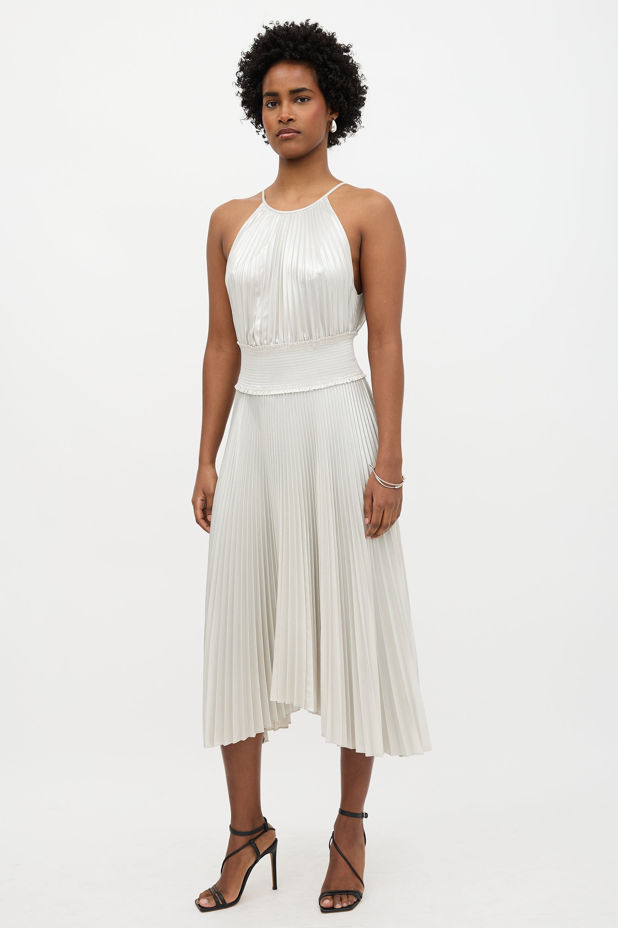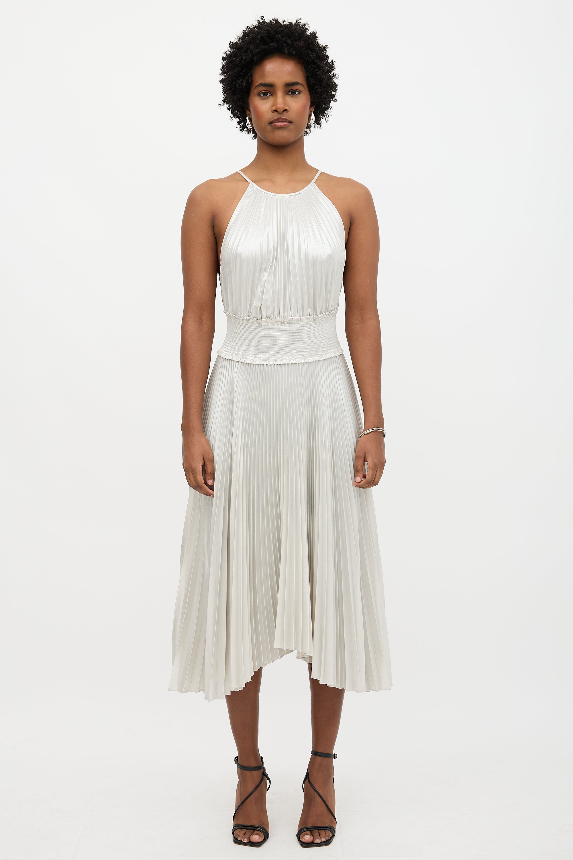 Pre-owned A.L.C. silver tone pleated lamé Weston midi dress featuring halter neckline, back keyhole with button closure, smocked waist, and handkerchief hem.