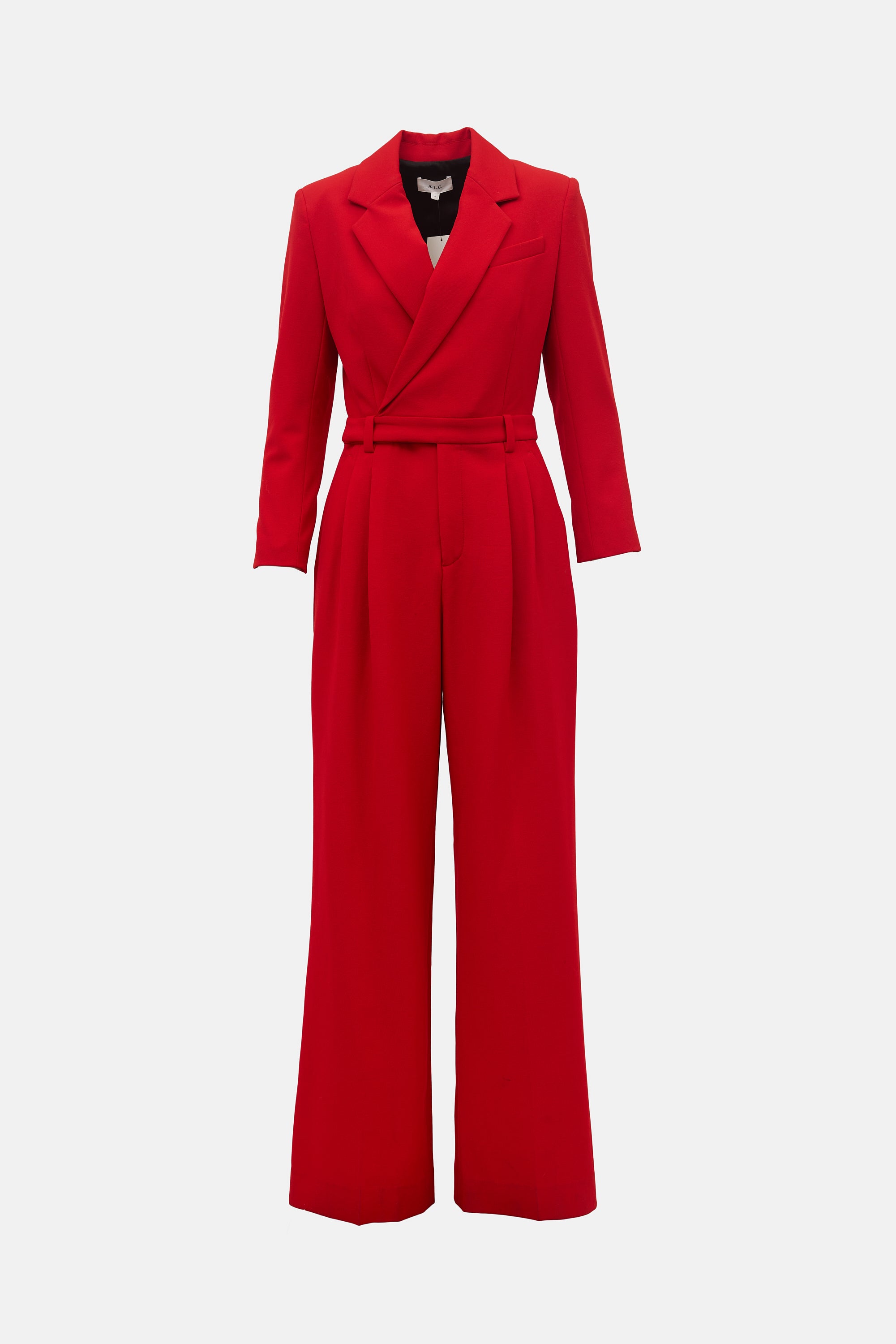 A.L.C. red Tatum jumpsuit featuring V-neckline, chest pocket, zip fly, belt loops, two hip pockets, two slit pockets at back, cutout back, and wide leg.