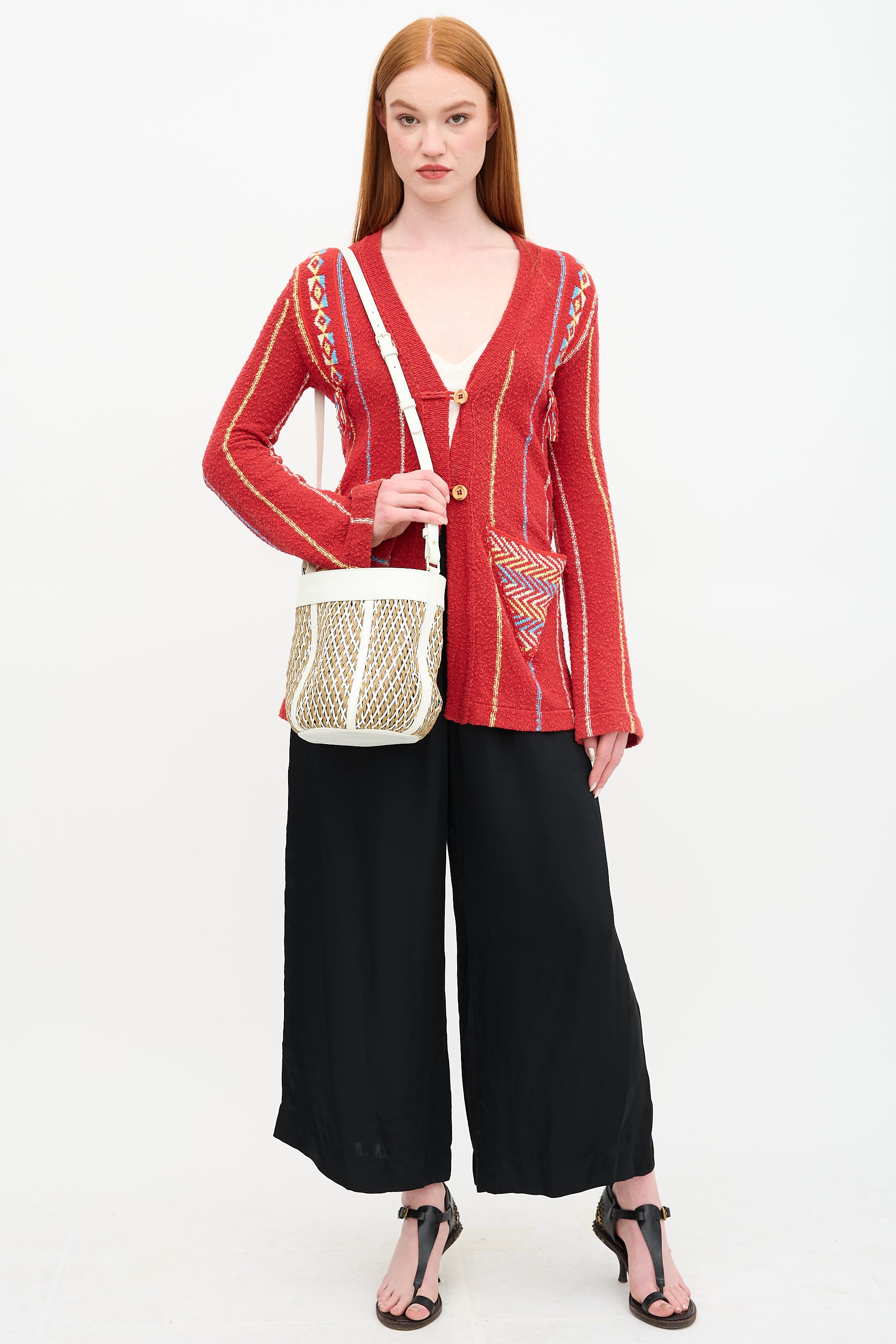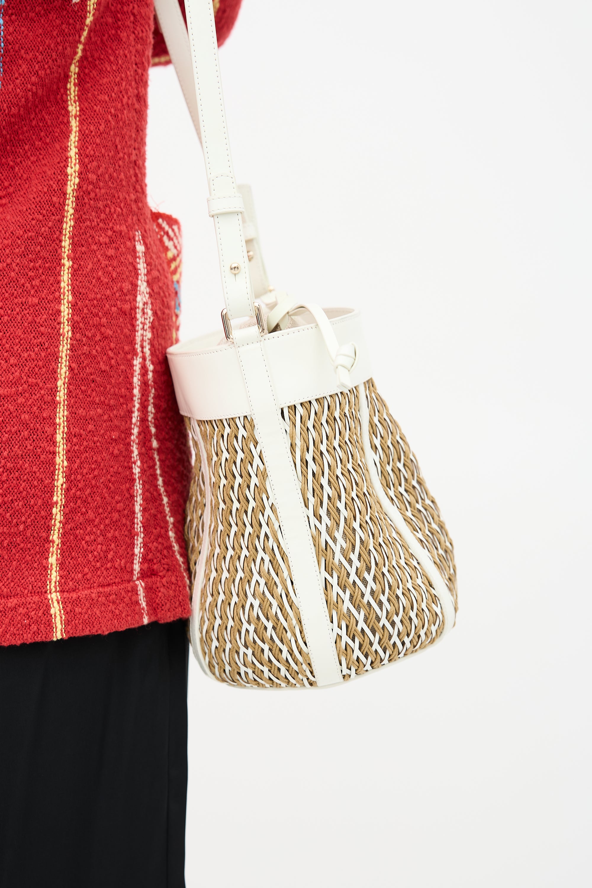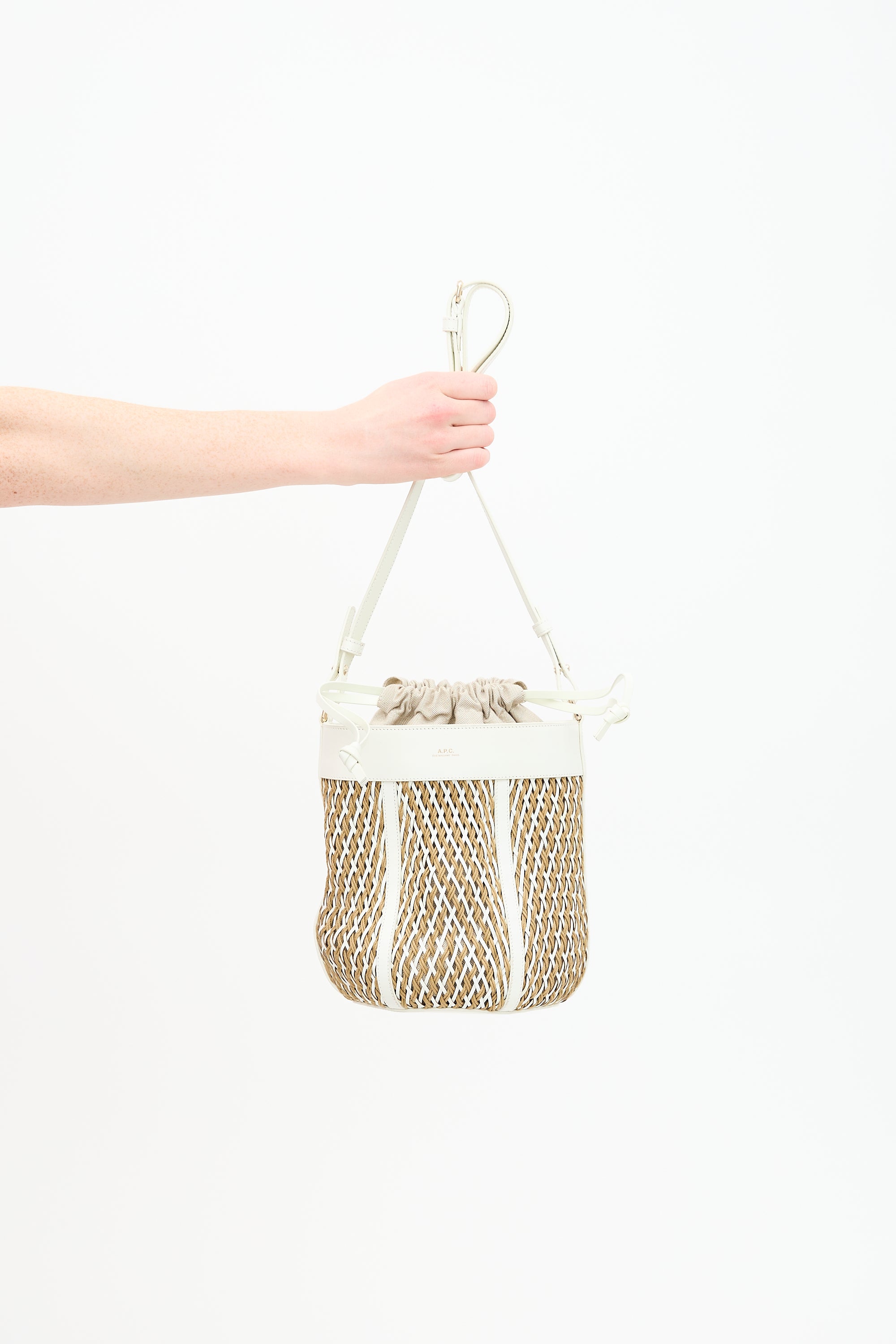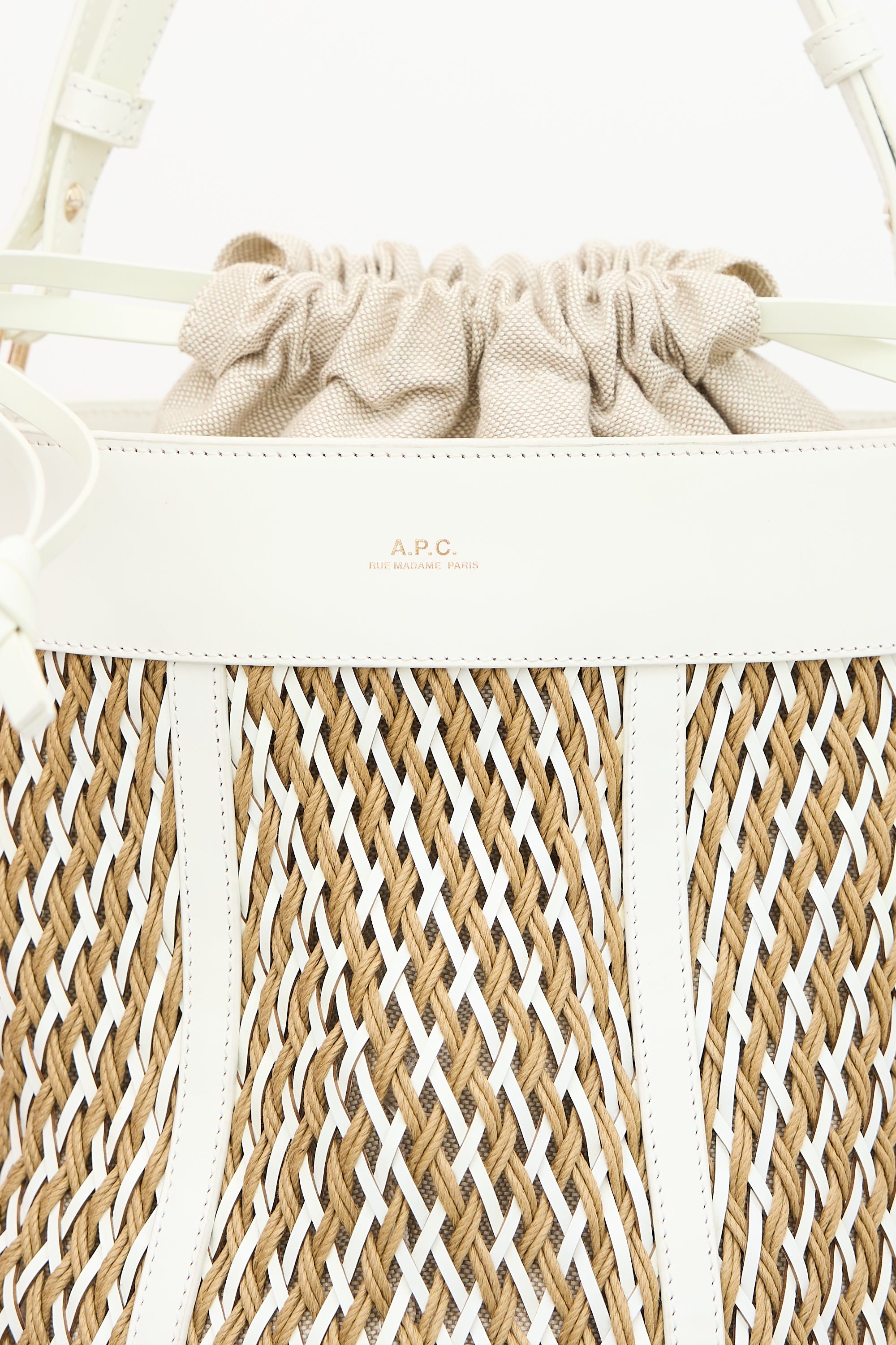 Pre-owned A.P.C. Garance bucket bag featuring woven white leather and brown rope panels, tonal stitching, pale gold tone hardware, front stamped logo, adjustable shoulder strap, inset drawstring top closure, and one lined main compartment with one slip pocket.