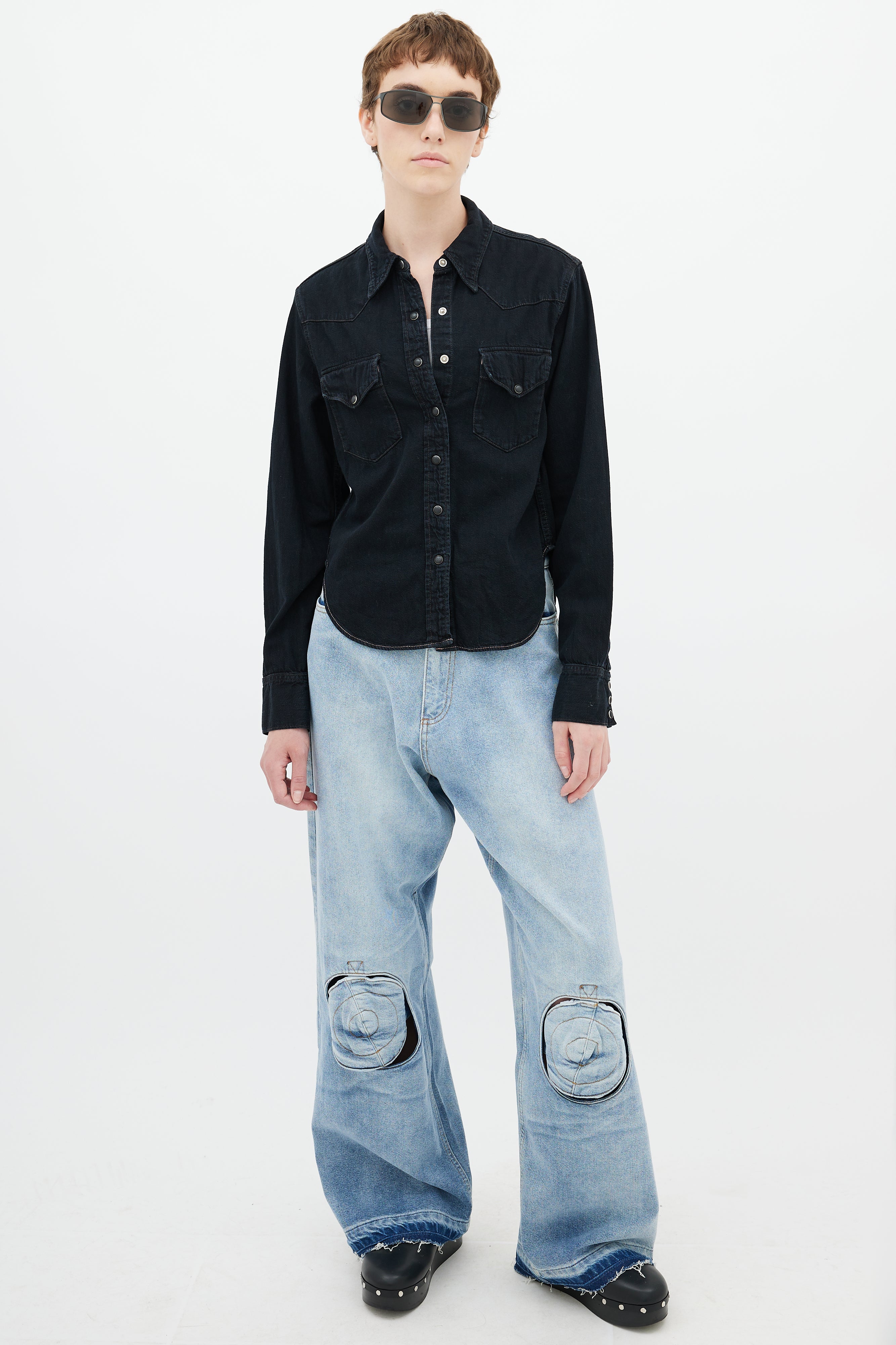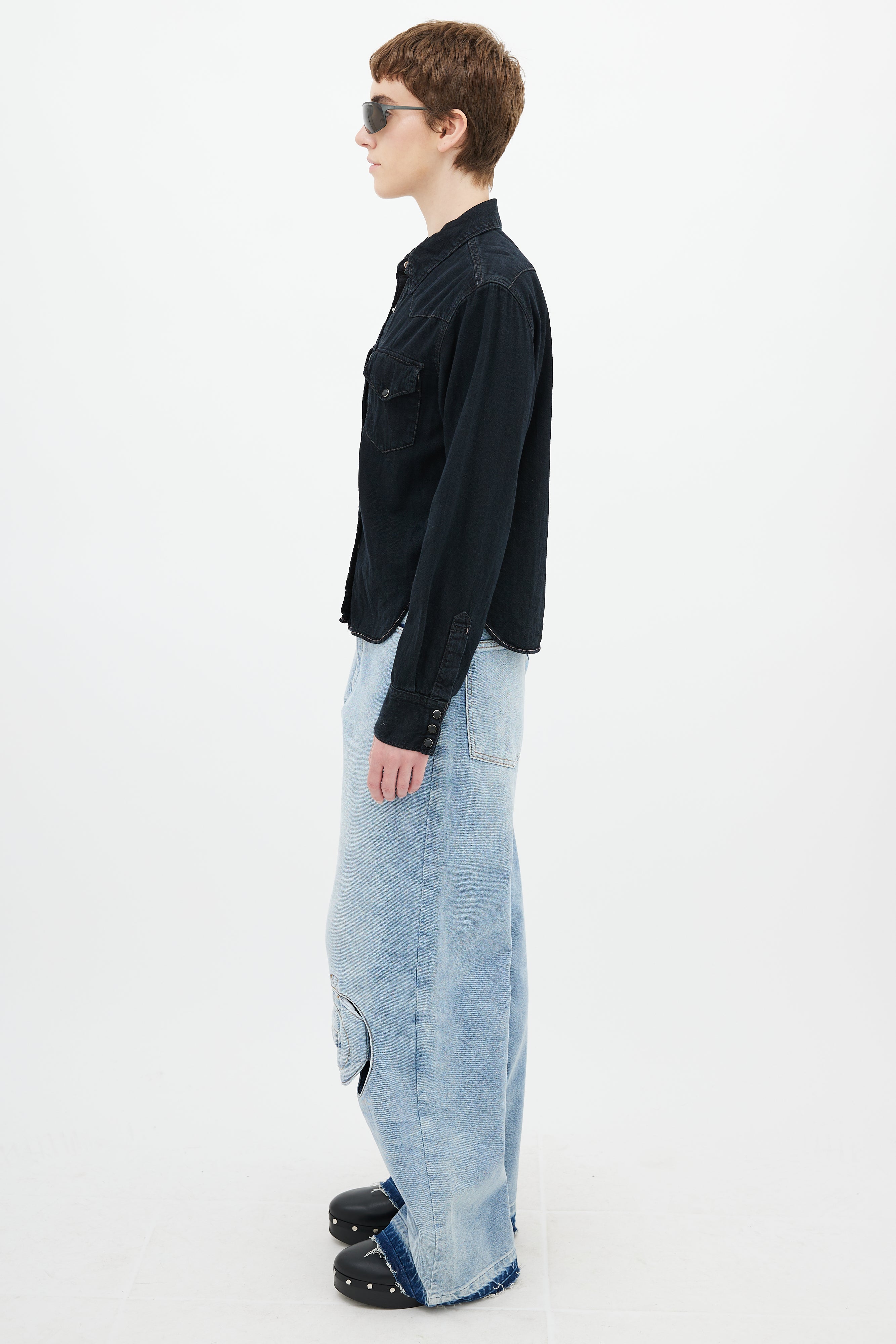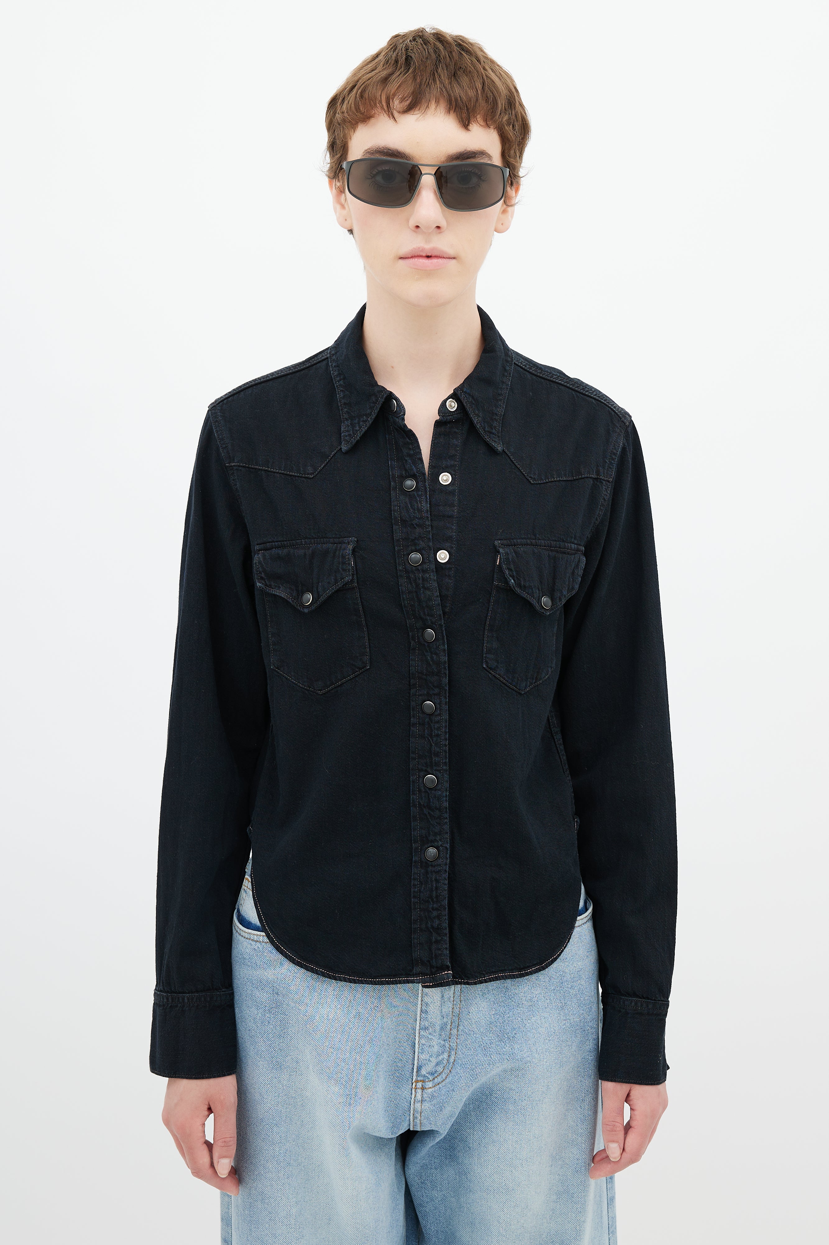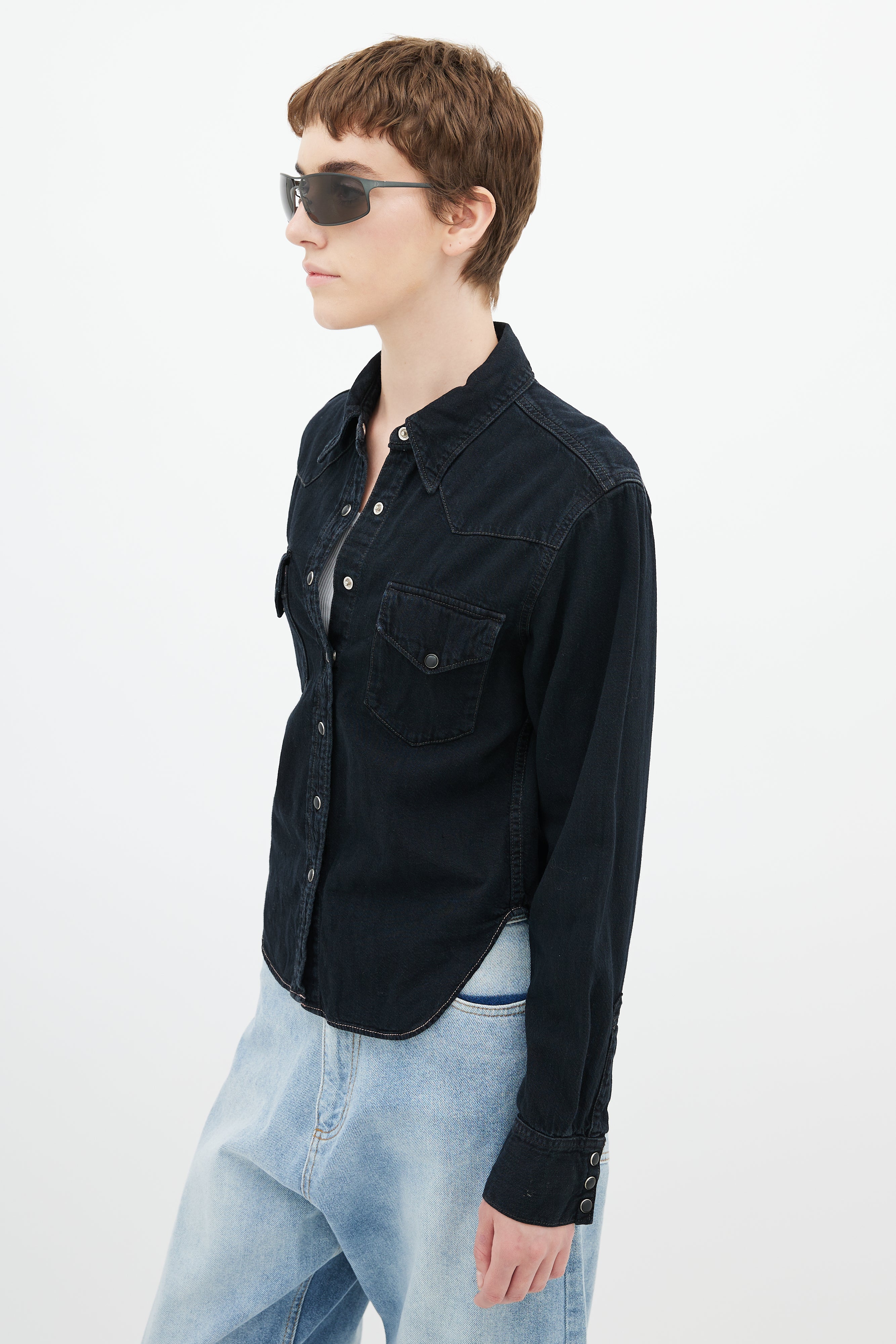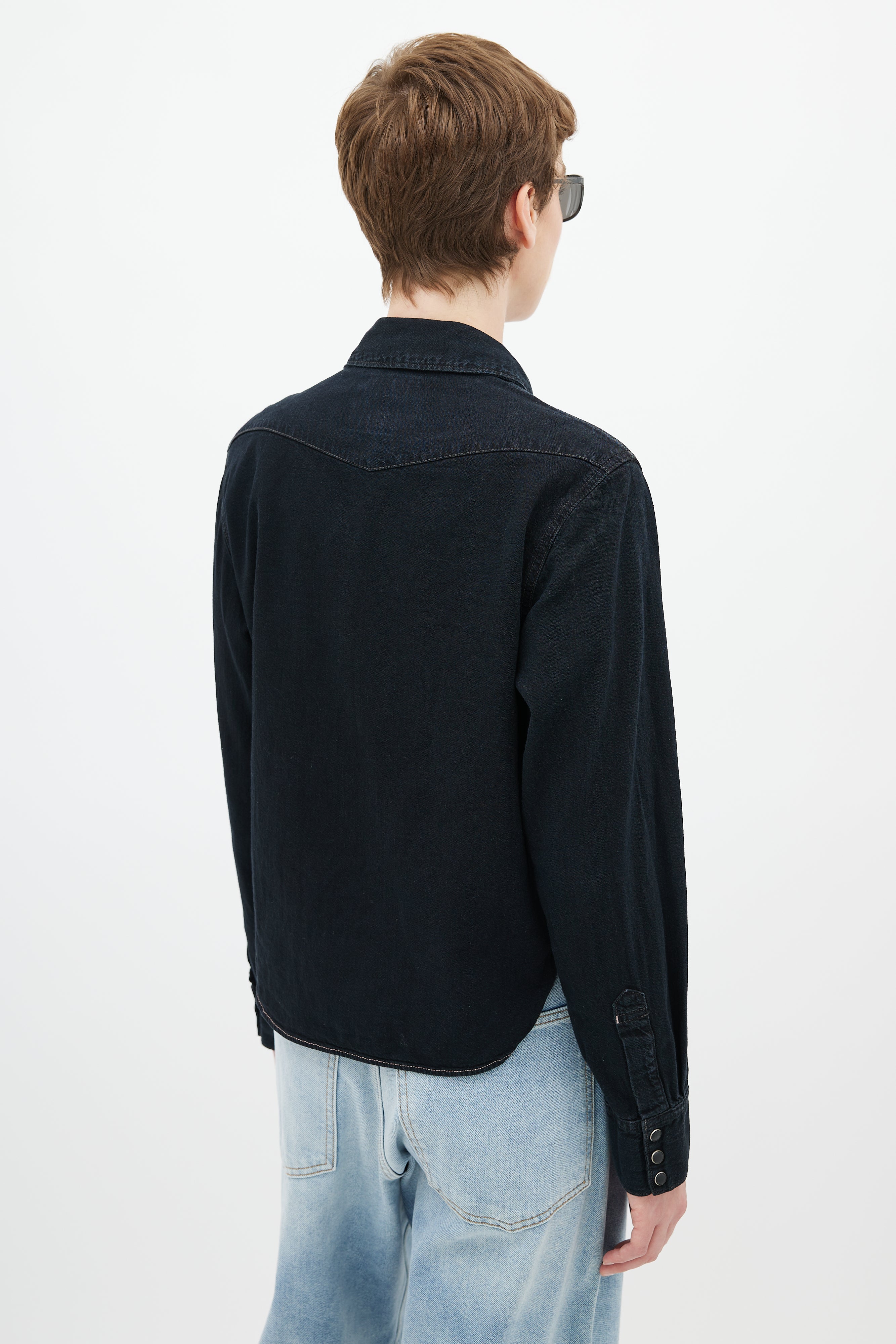 Pre-owned Acne Studios Blå Konst black Overdye shirt featuring classic collar, button up front, two buttoned pockets at chest, and buttoned cuffs.
