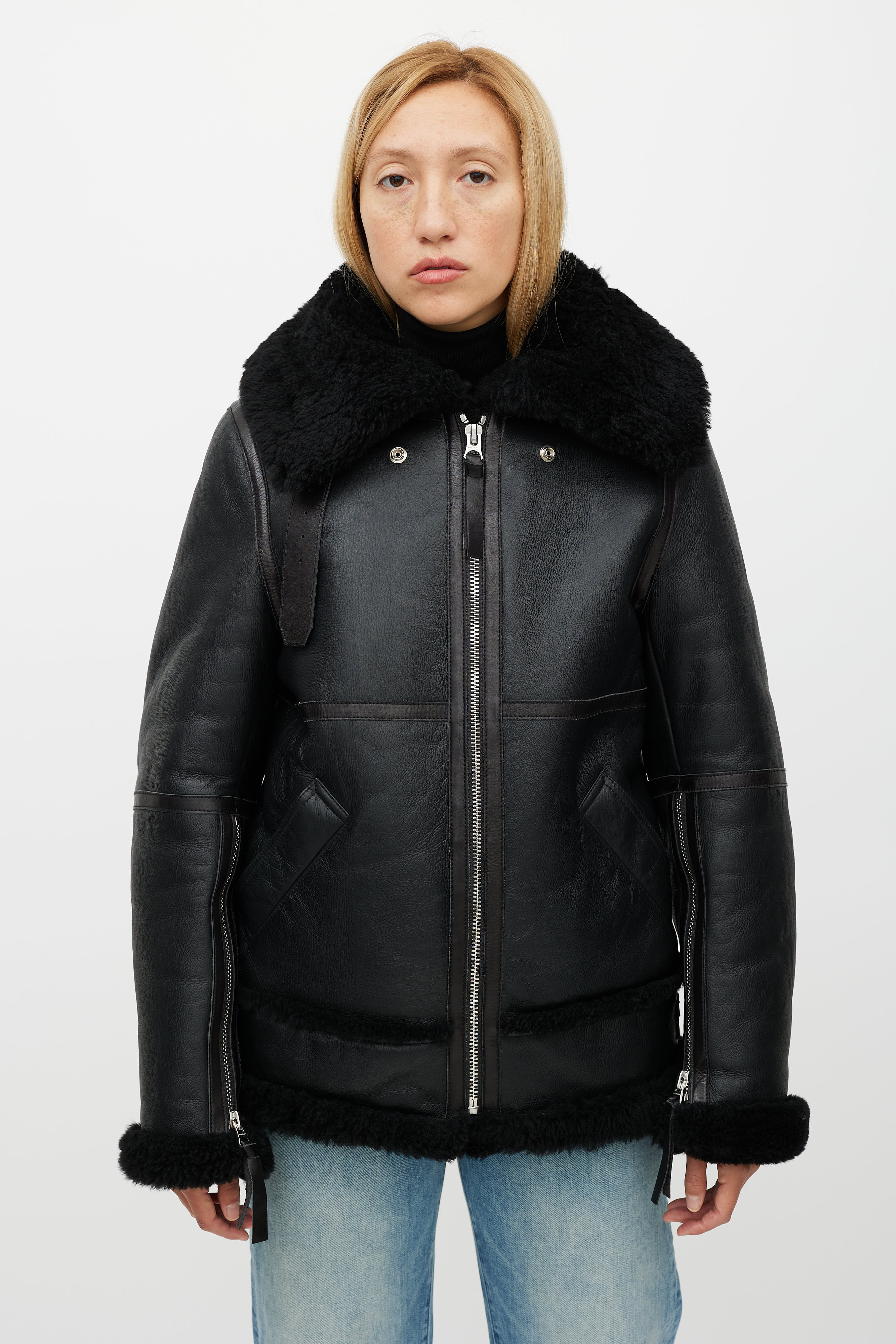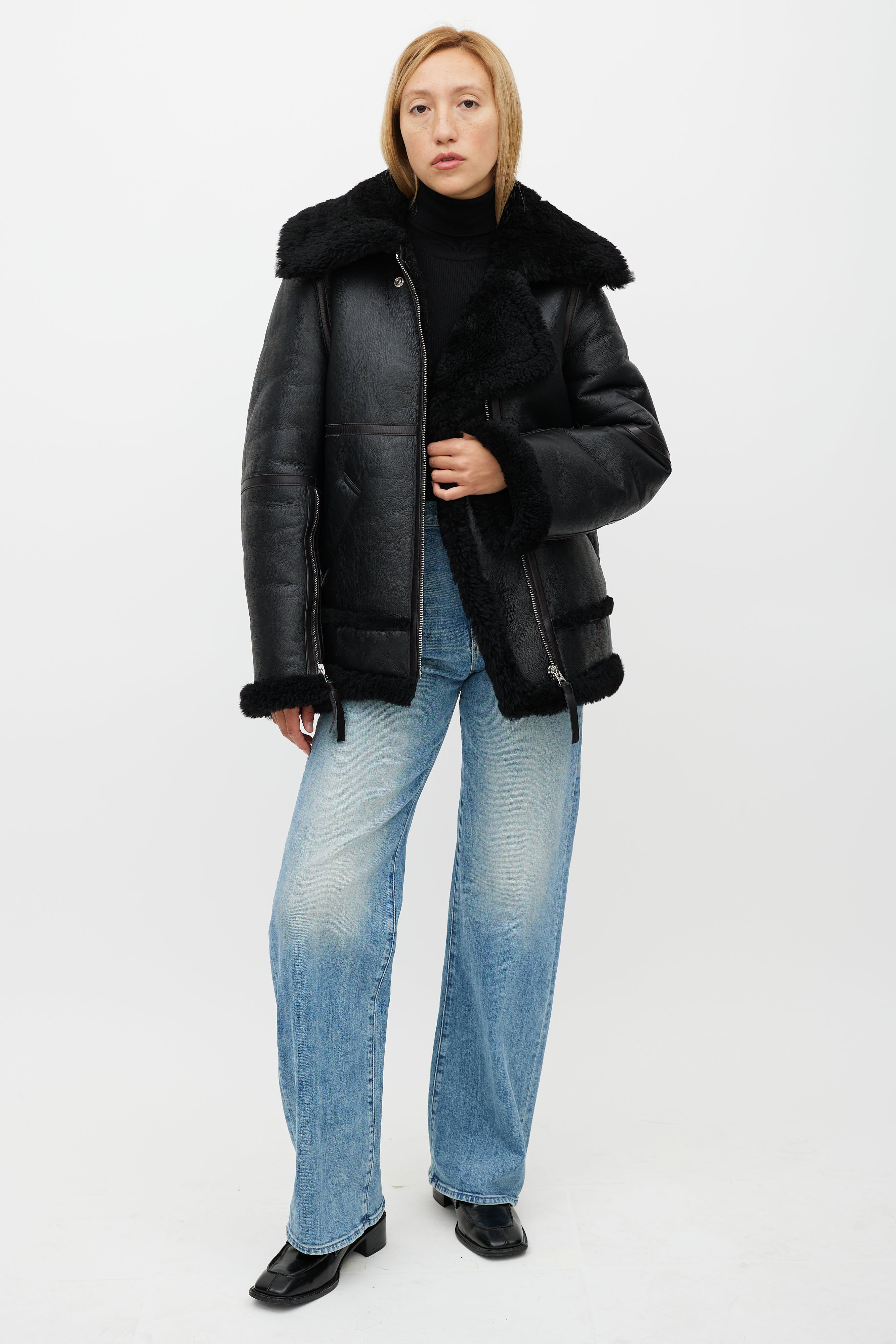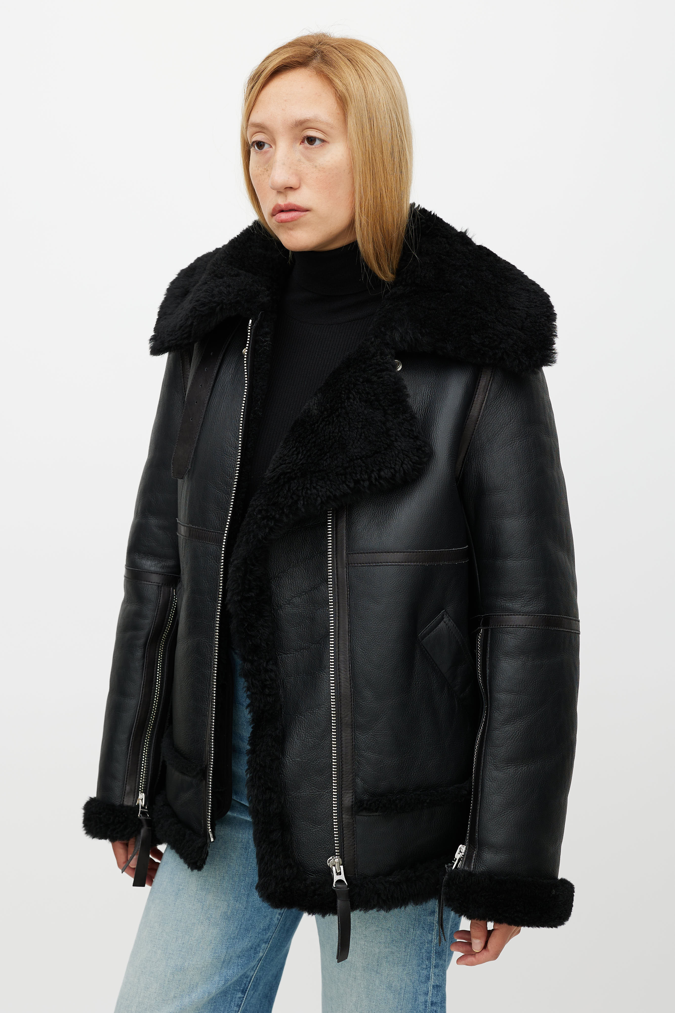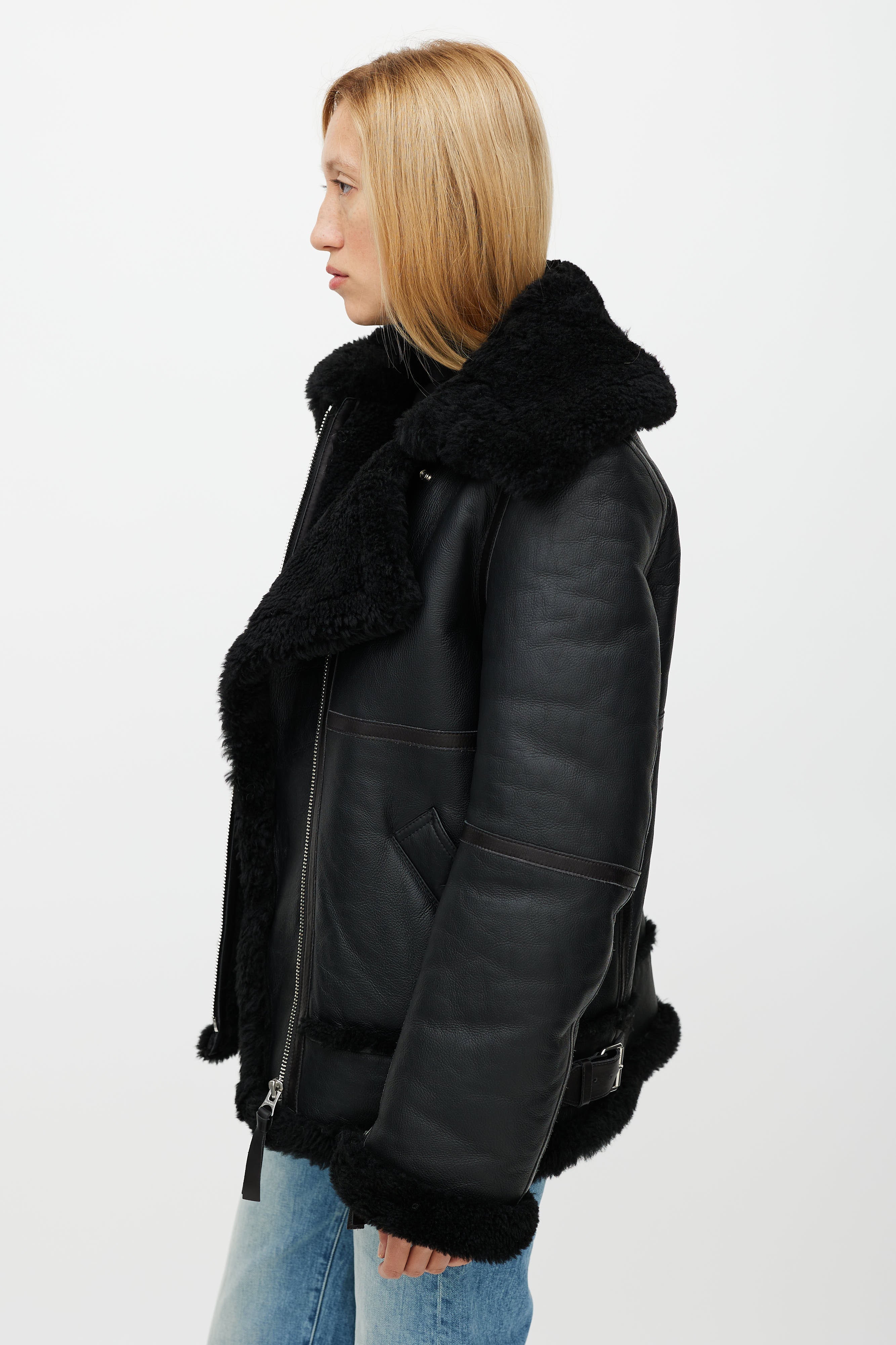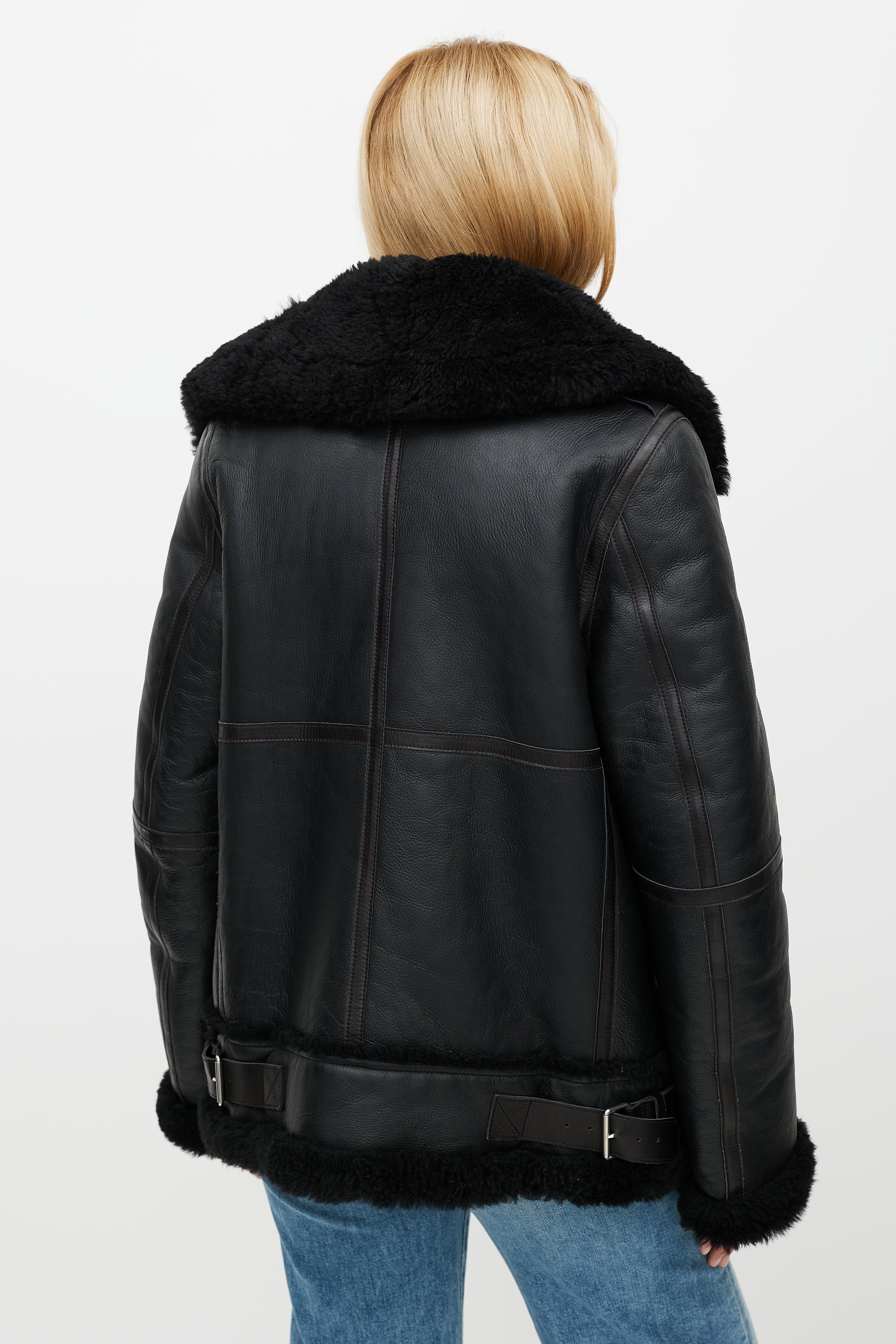 Pre-owned Acne Studios black leather shearling jacket featuring a notched lapel, long sleeves with belted cuffs, two zip pockets at hip, adjustable belt at waist, and zip closure.