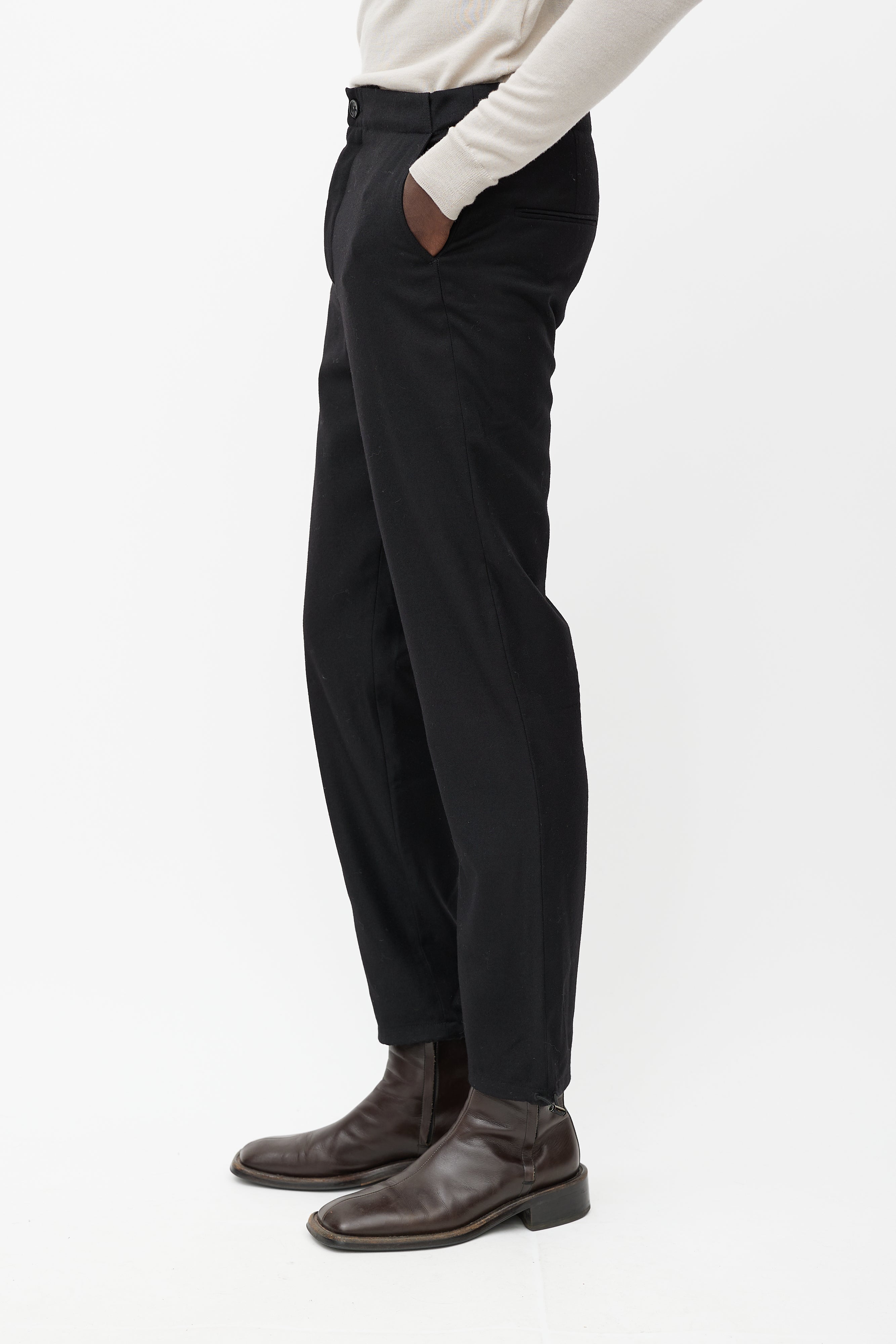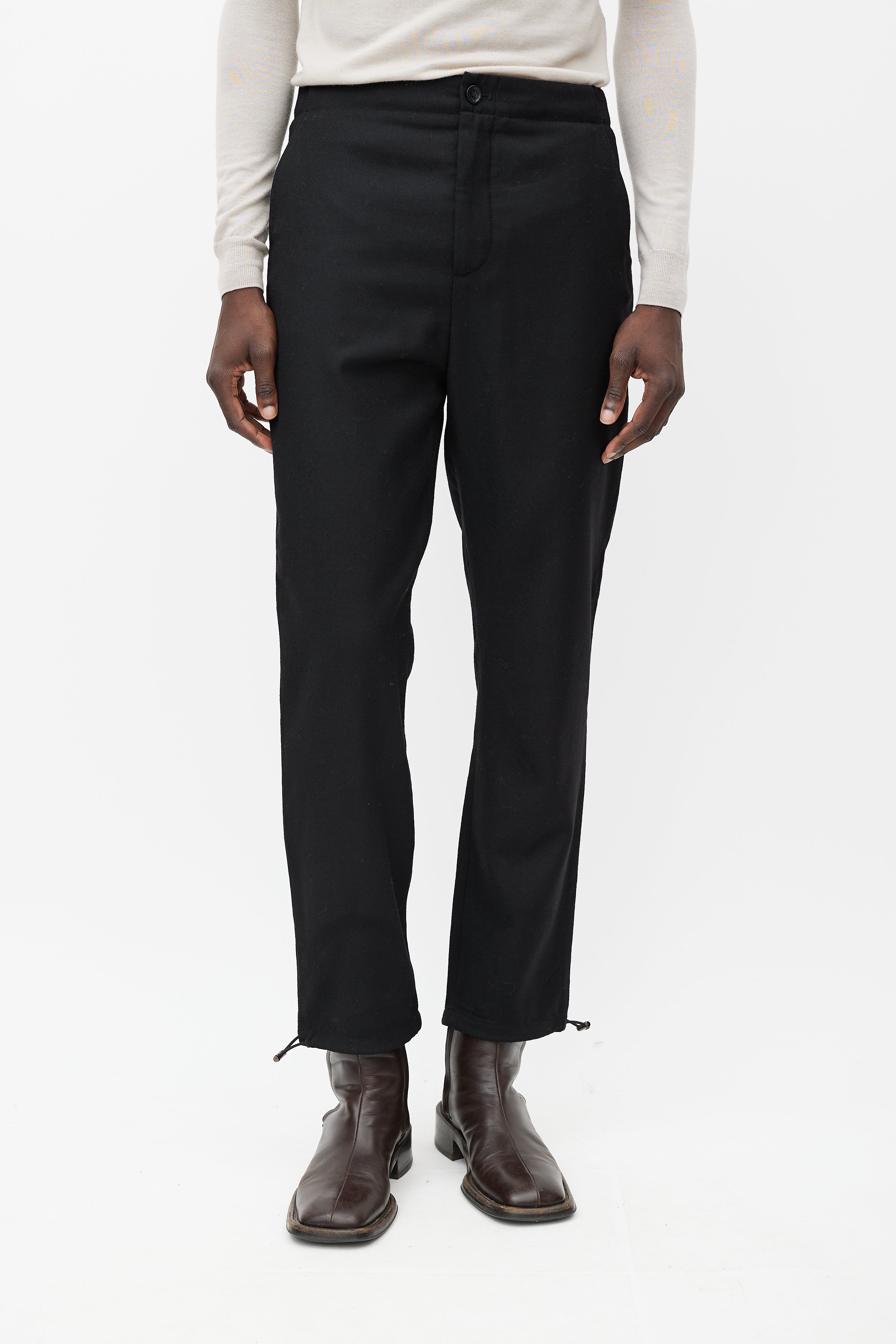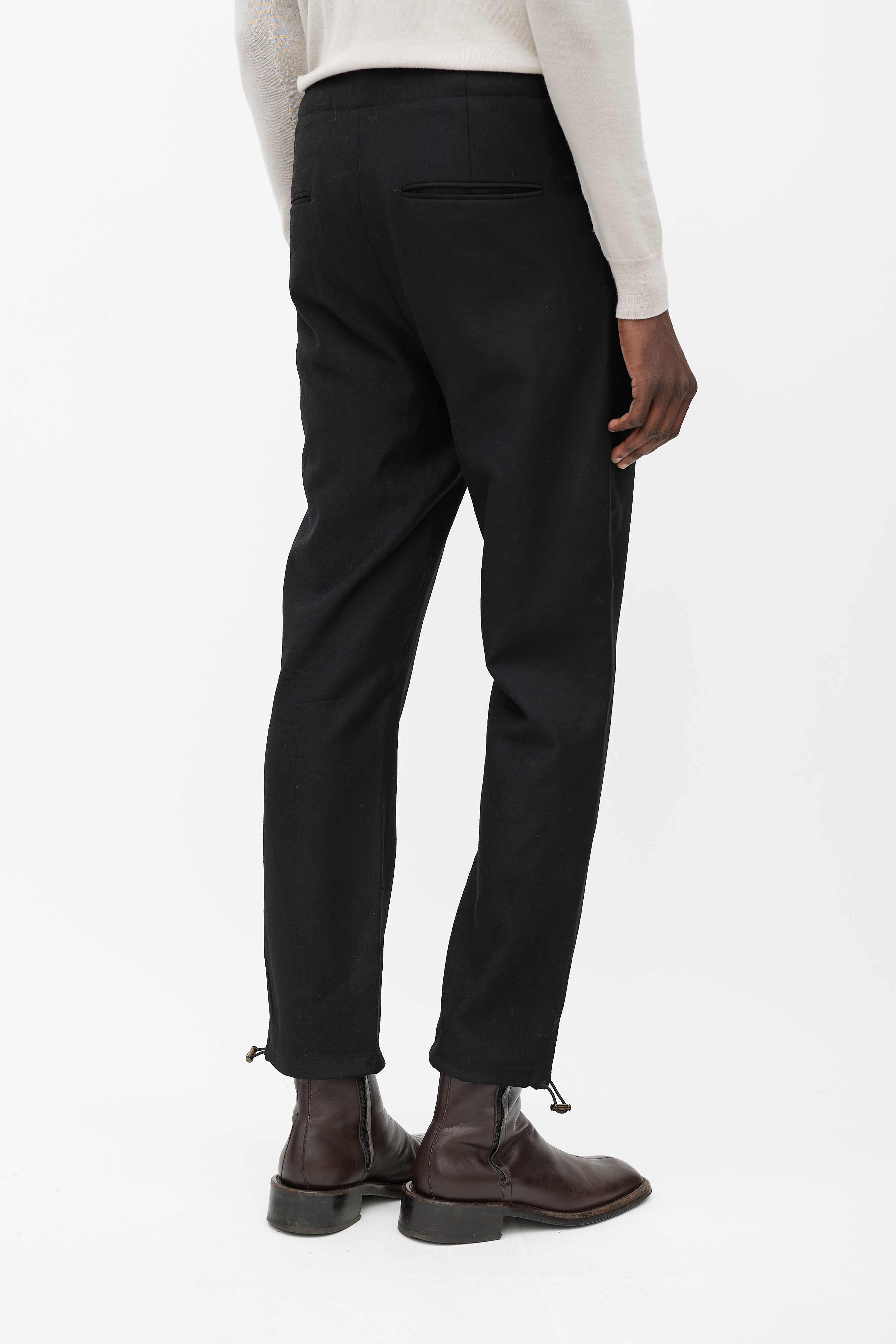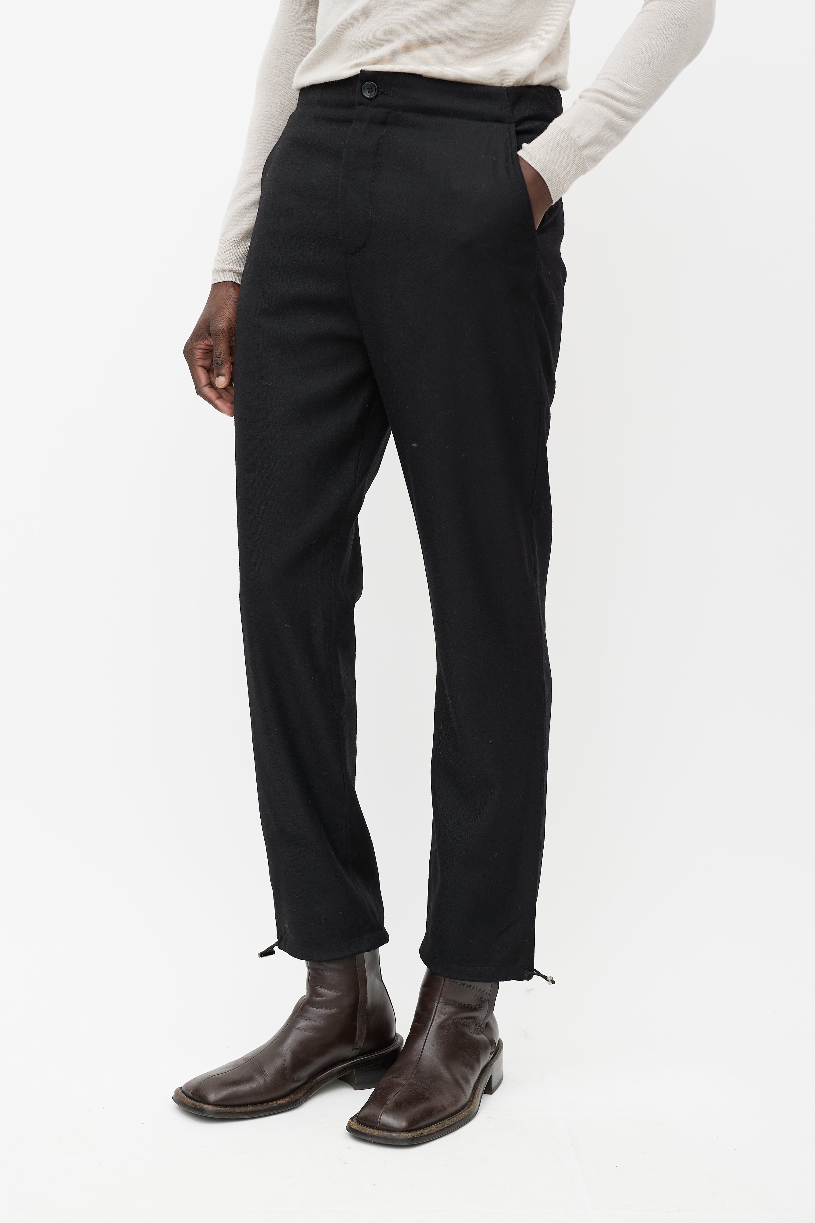 Pre-owned Acne Studios black trouser featuring zip fly, two slash pockets at hips, two welt pockets at back, and drawstring at cuffs.
