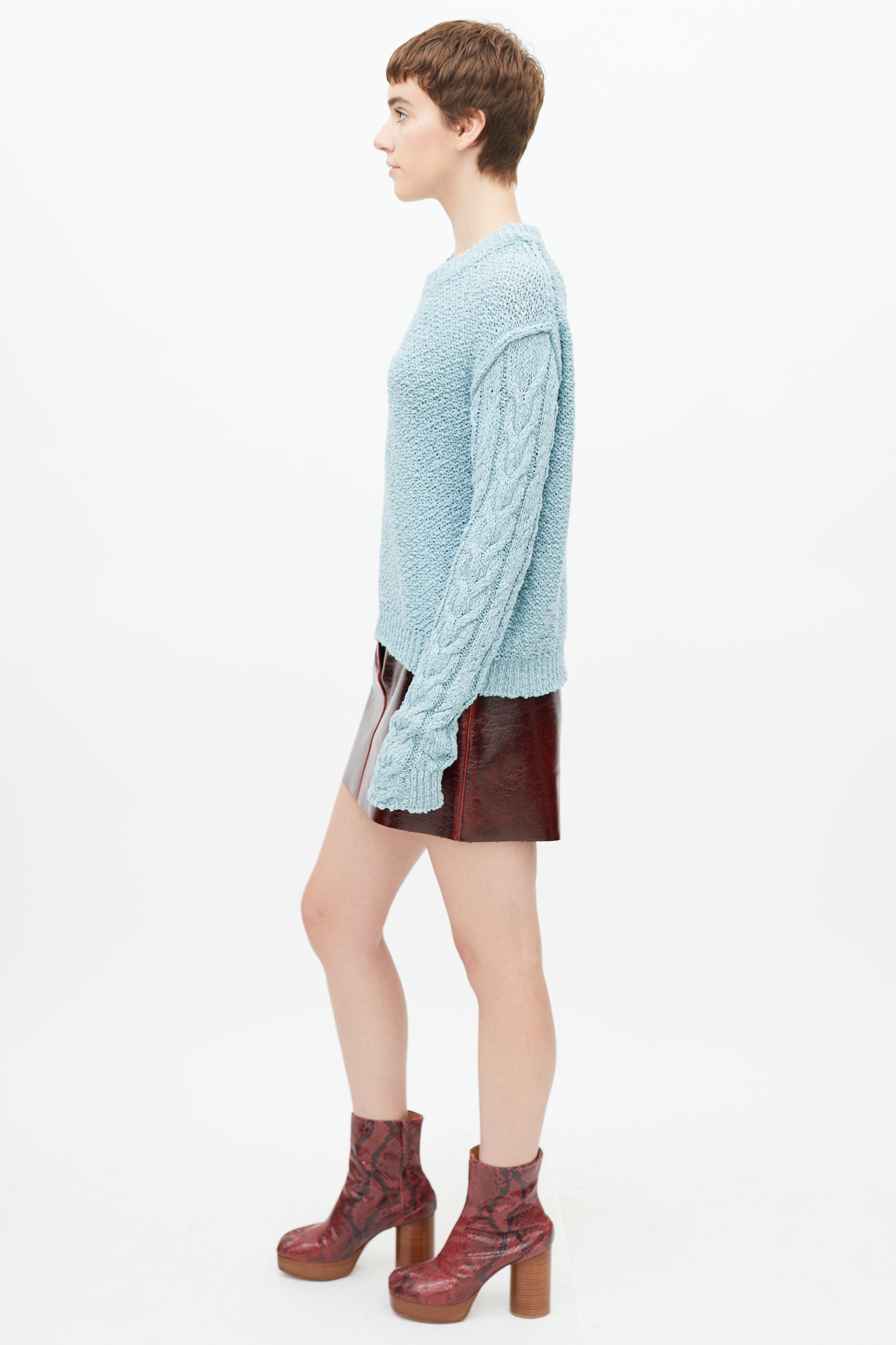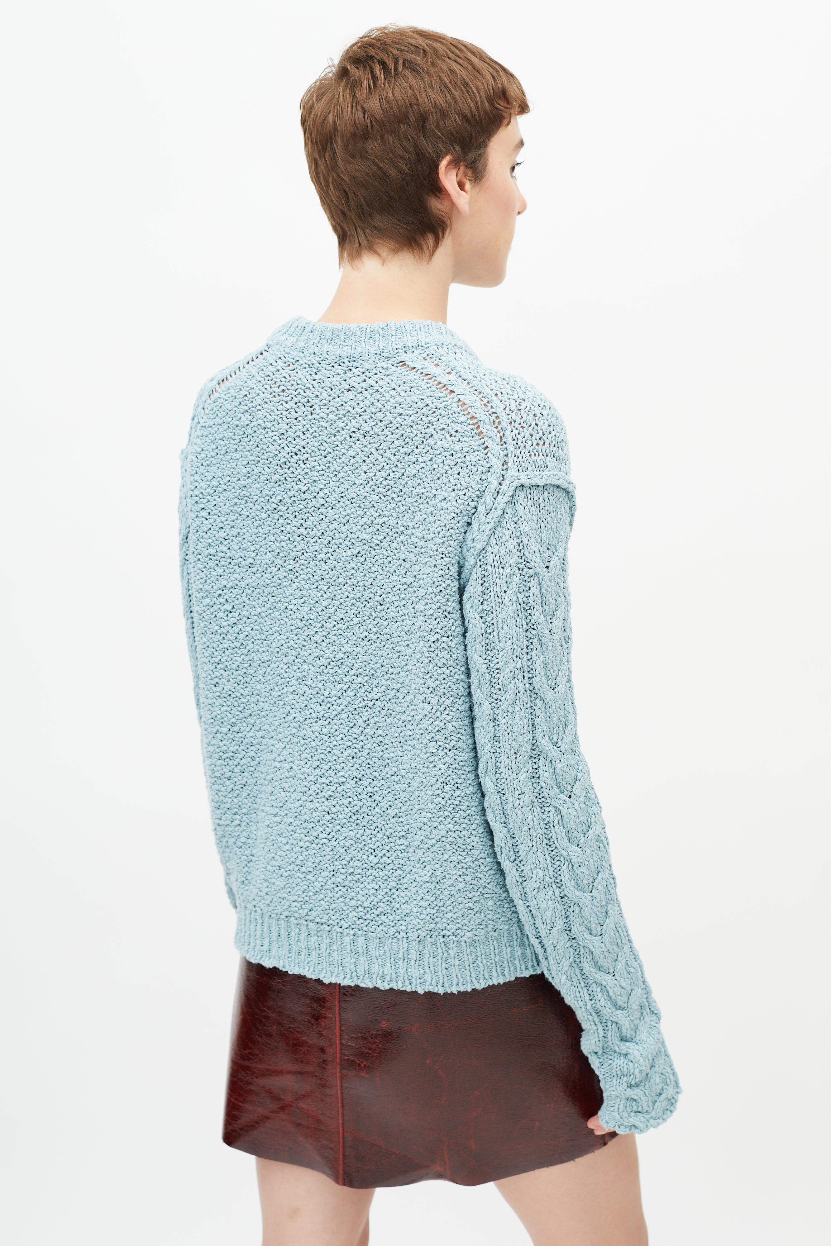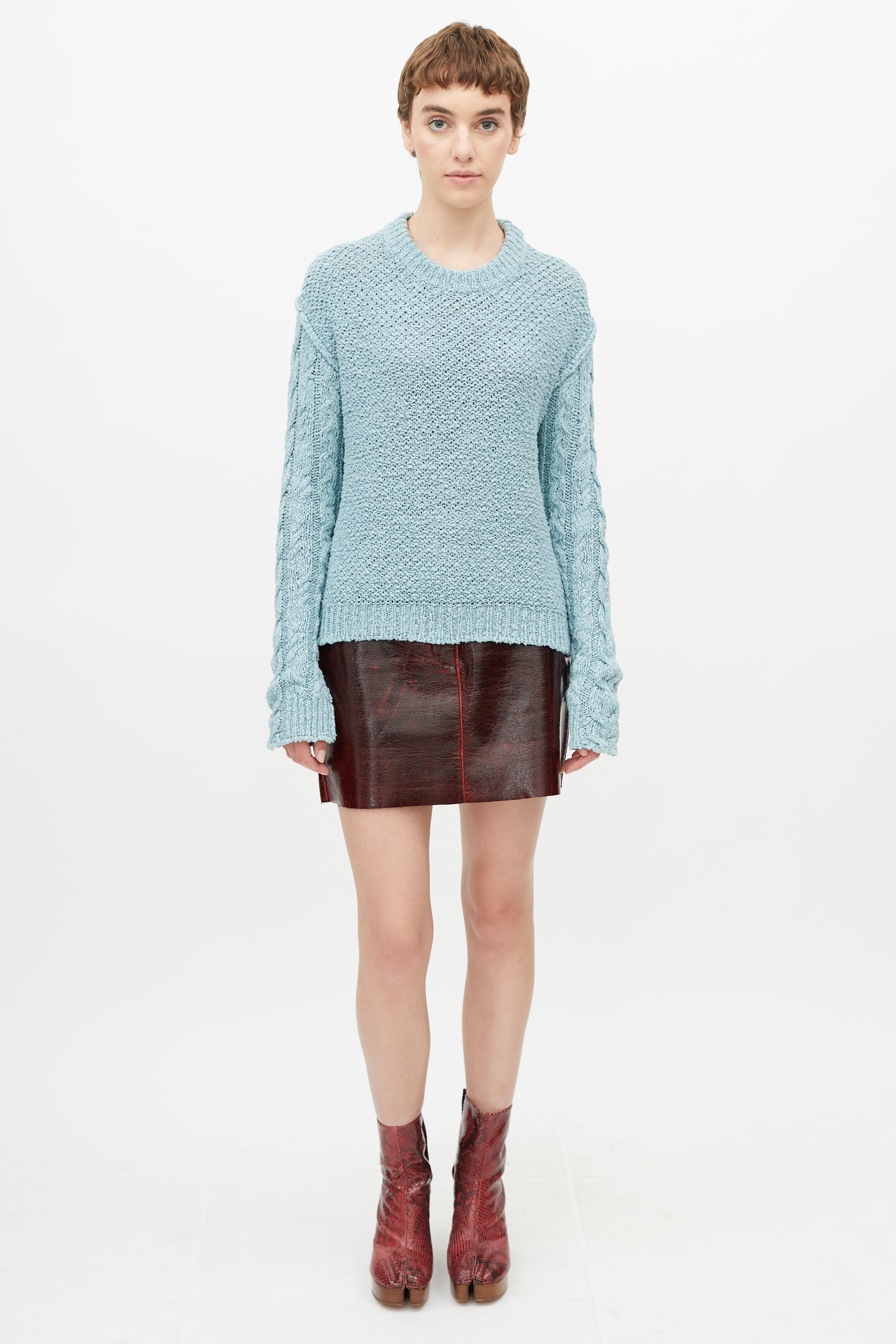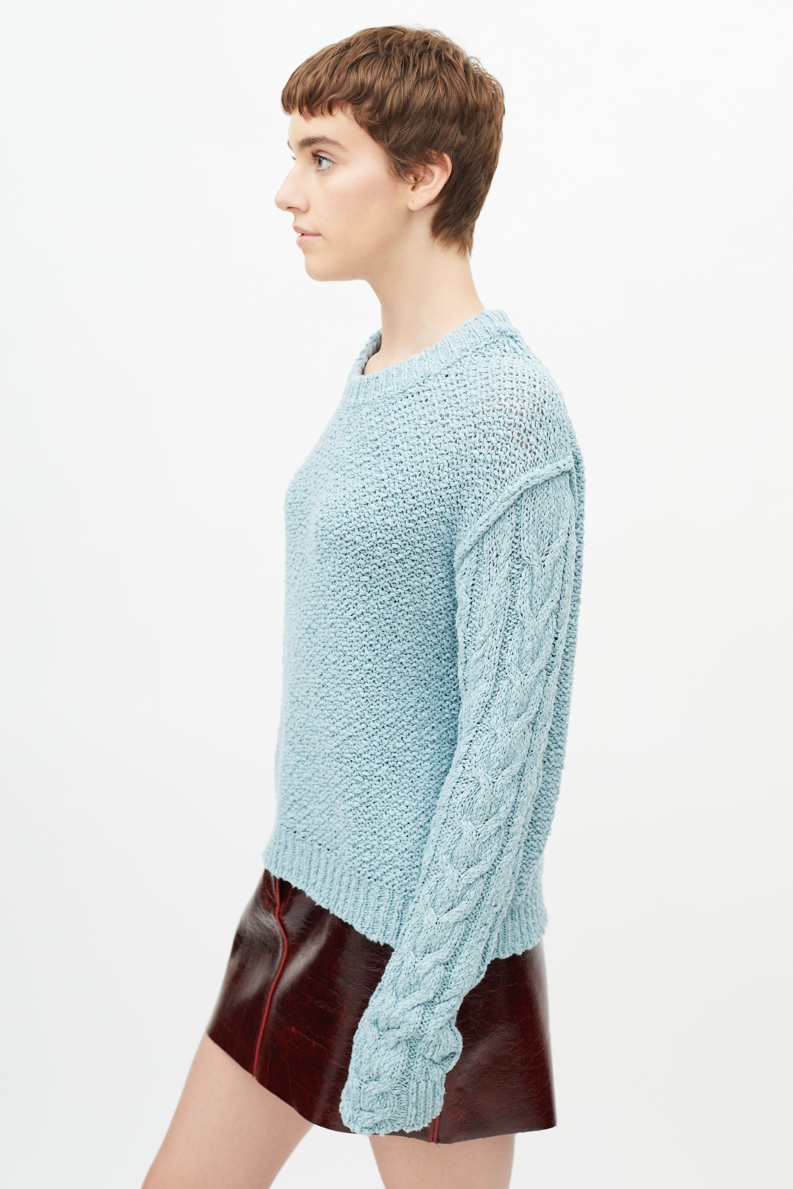 Pre-owned Acne Studios blue Hila sweater featuring crew neckline, ribbed hem and cuffs, exposed seams, and cable knit sleeves.