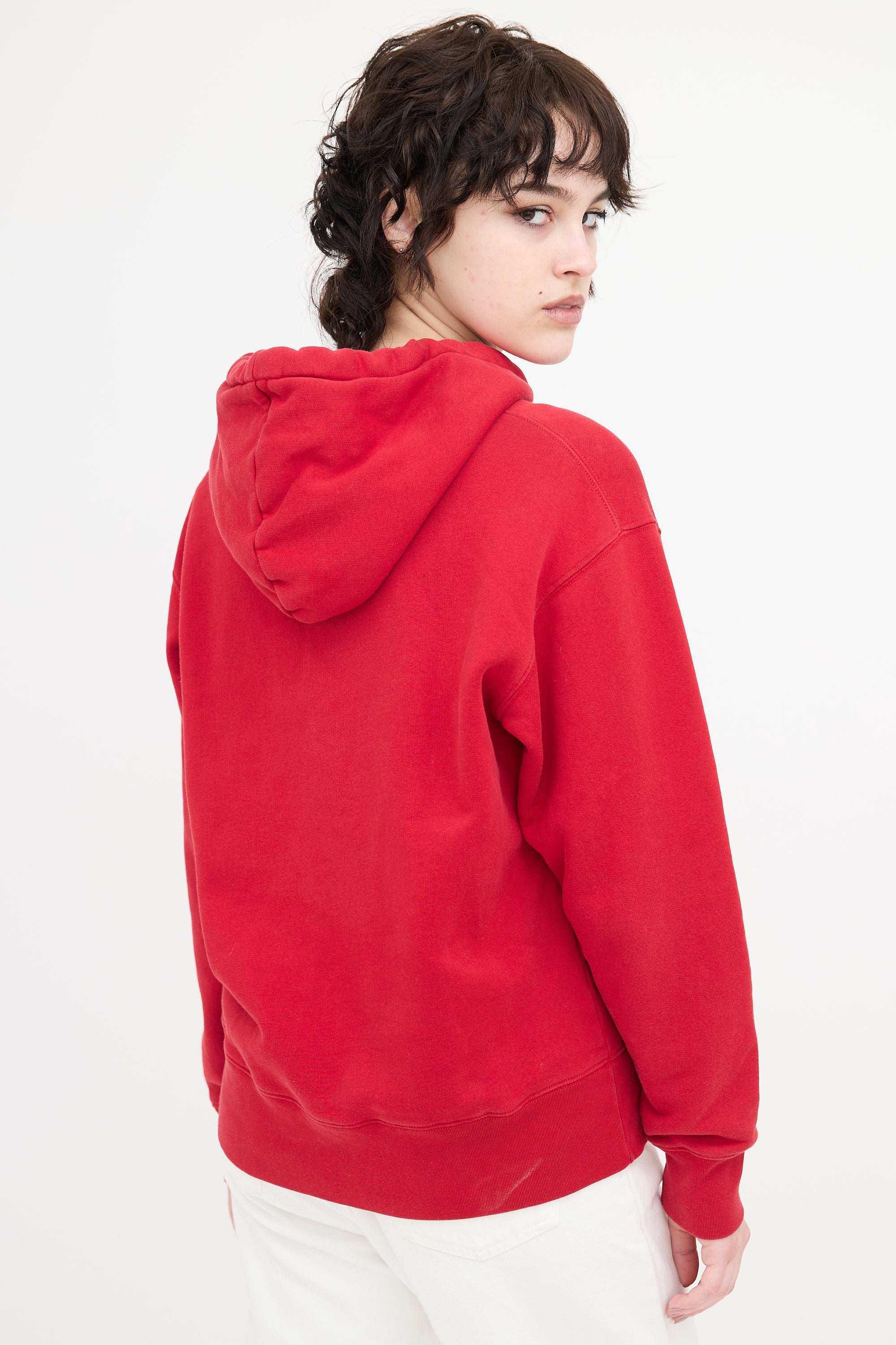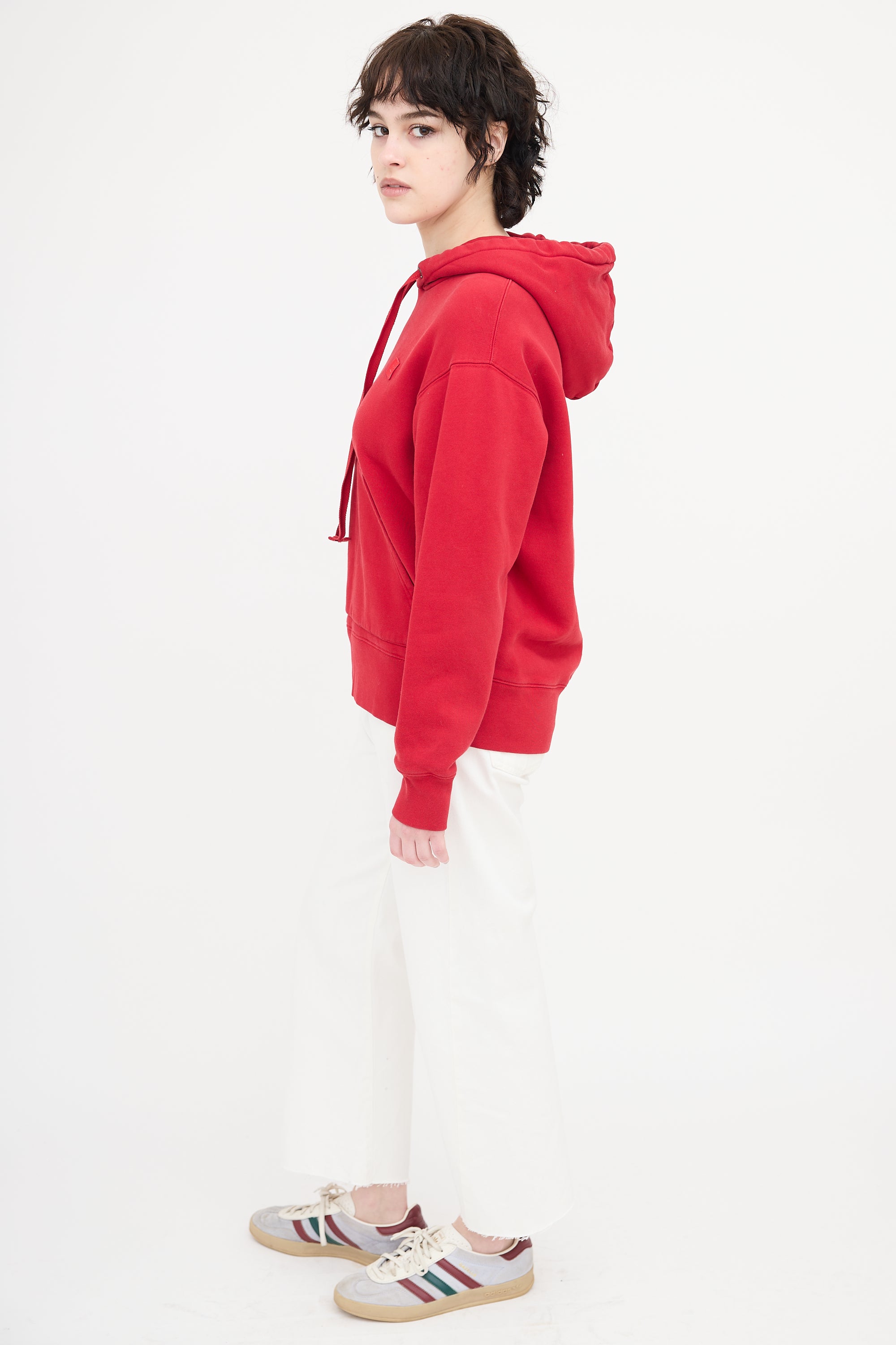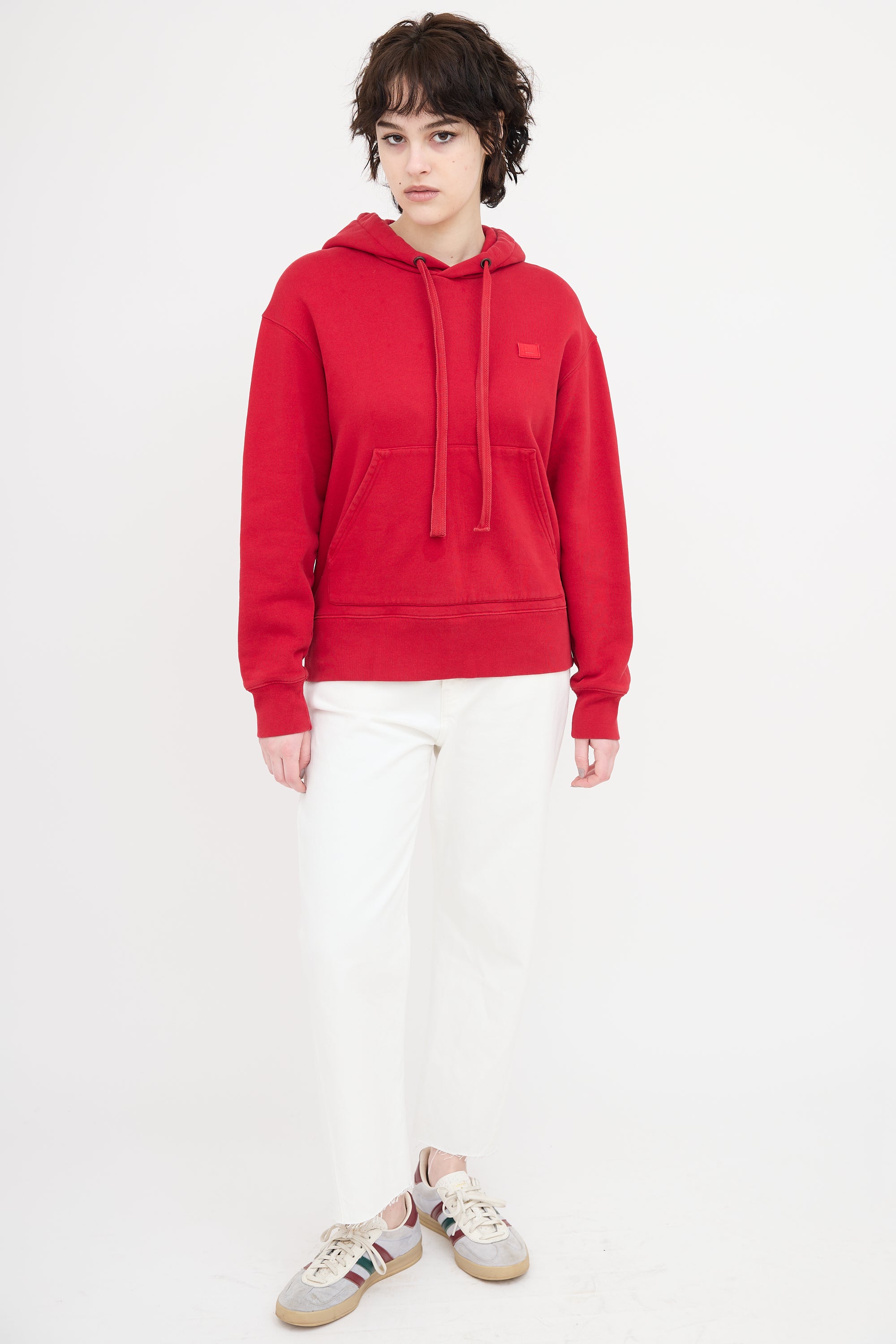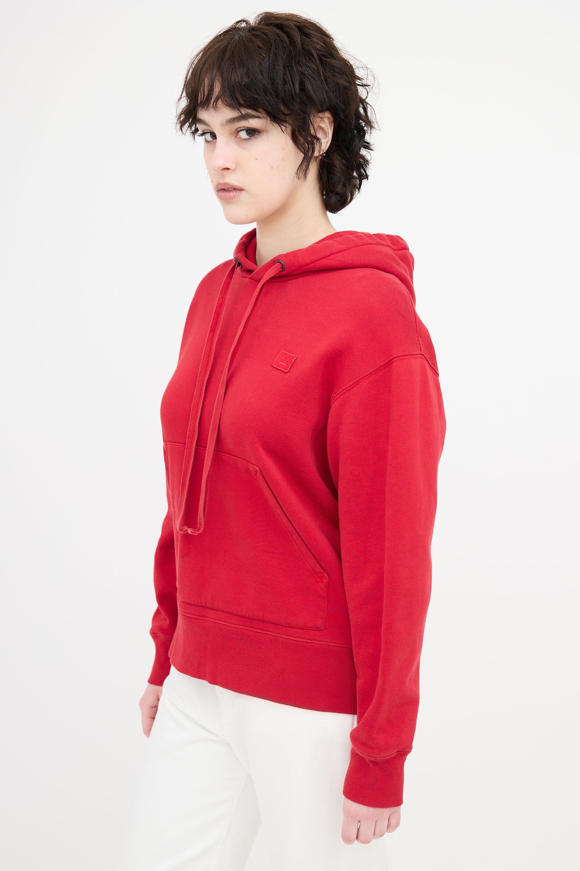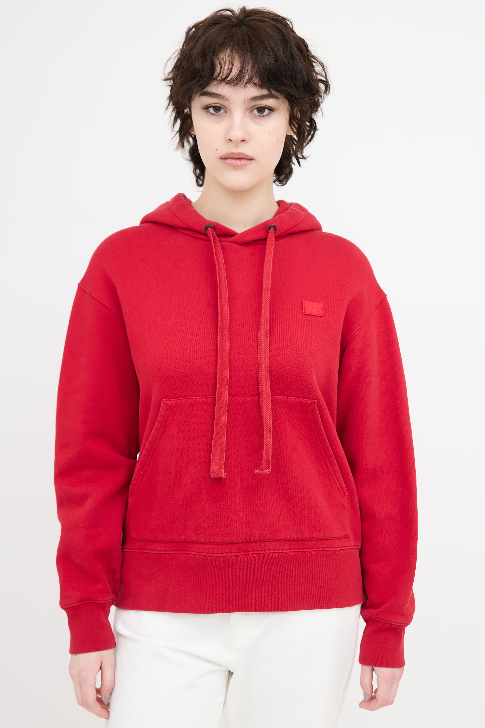 Pre-owned Acne Studios red Ferris hoodie featuring a drawstring hood, tonal signature face logo patch at chest, kangaroo pocket, and a ribbed hem and cuffs.