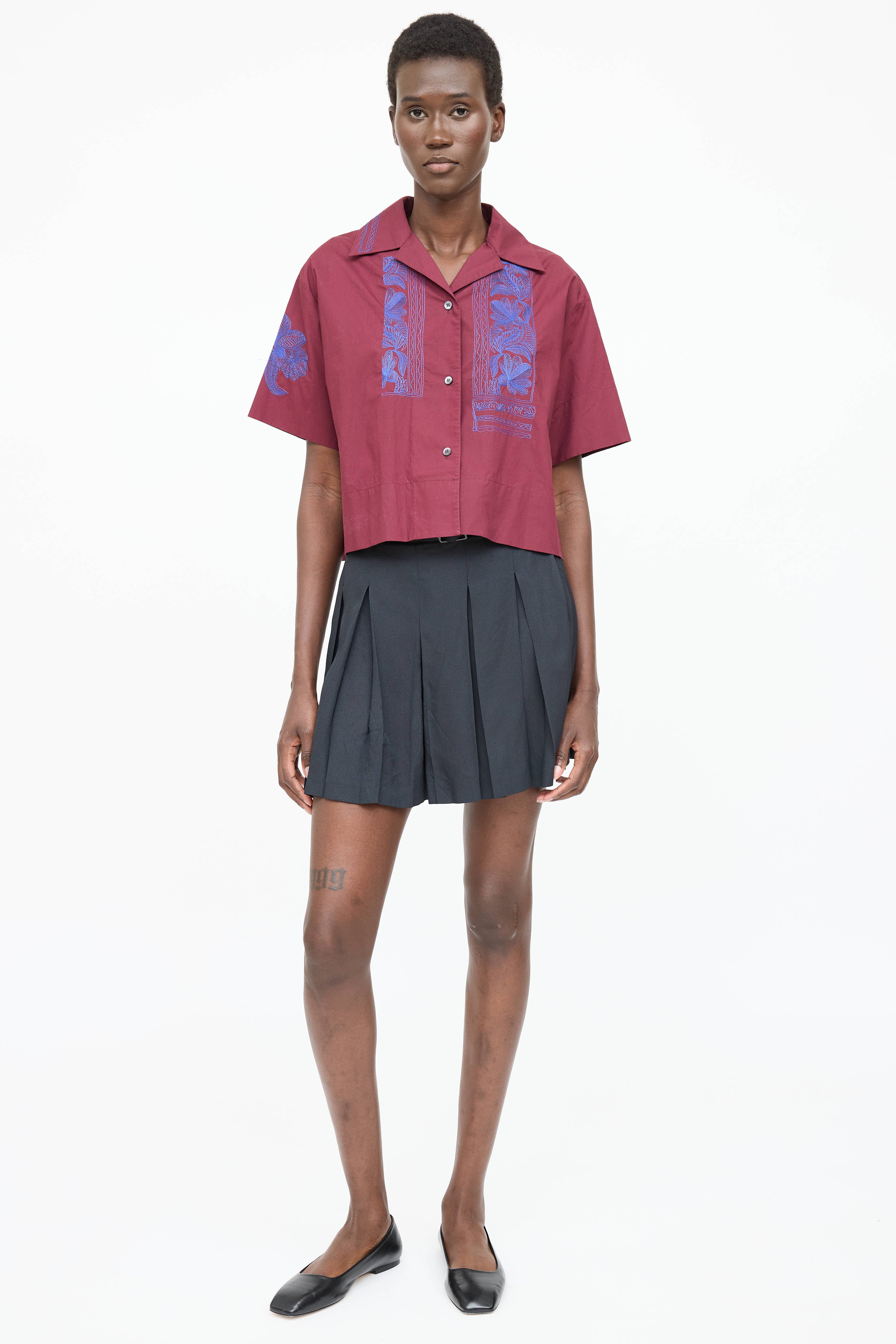 Pre-owned Acne Studios burgundy camp shirt featuring blue floral embroidery throughout, camp collar, short sleeves, cropped fit, and button up front.