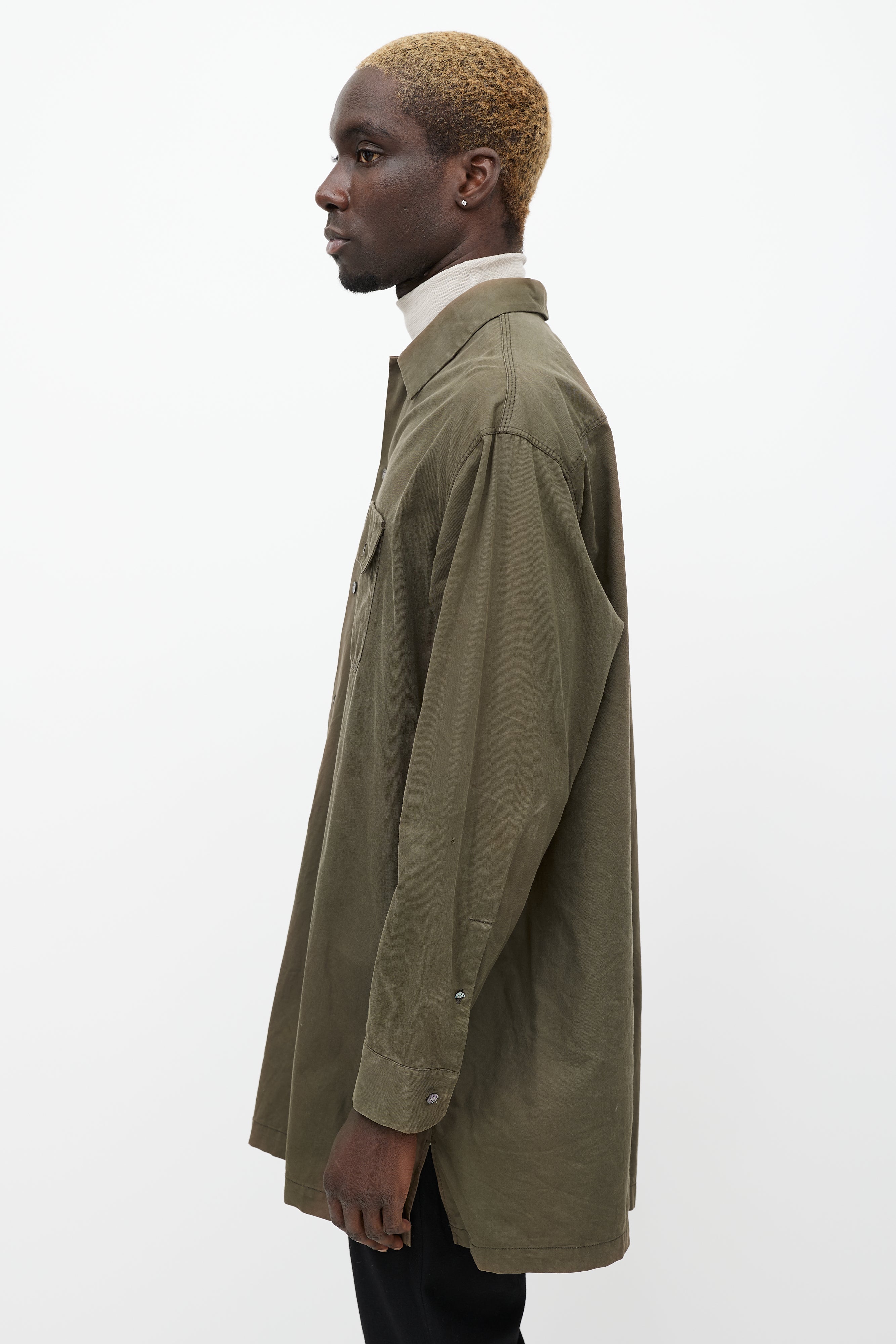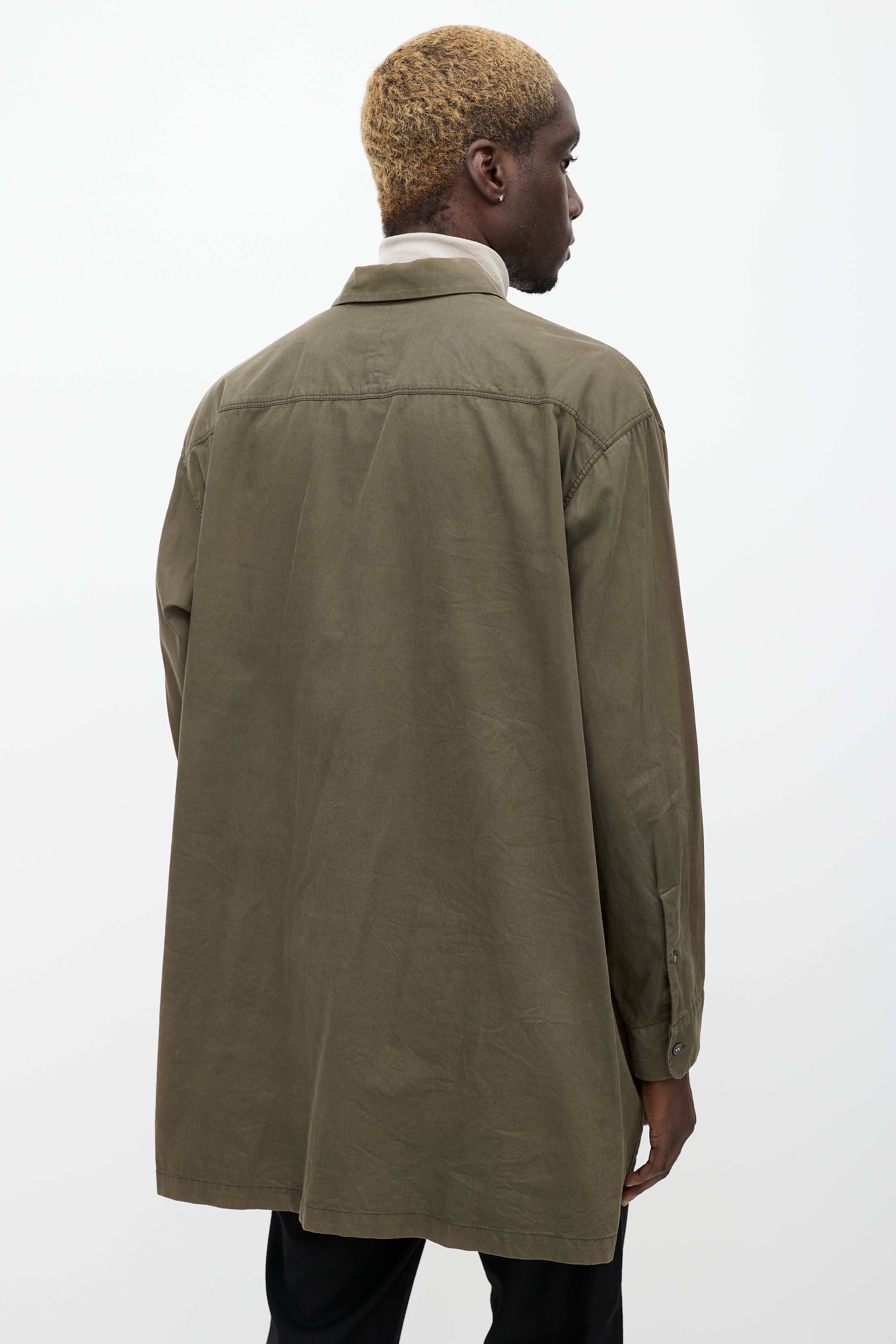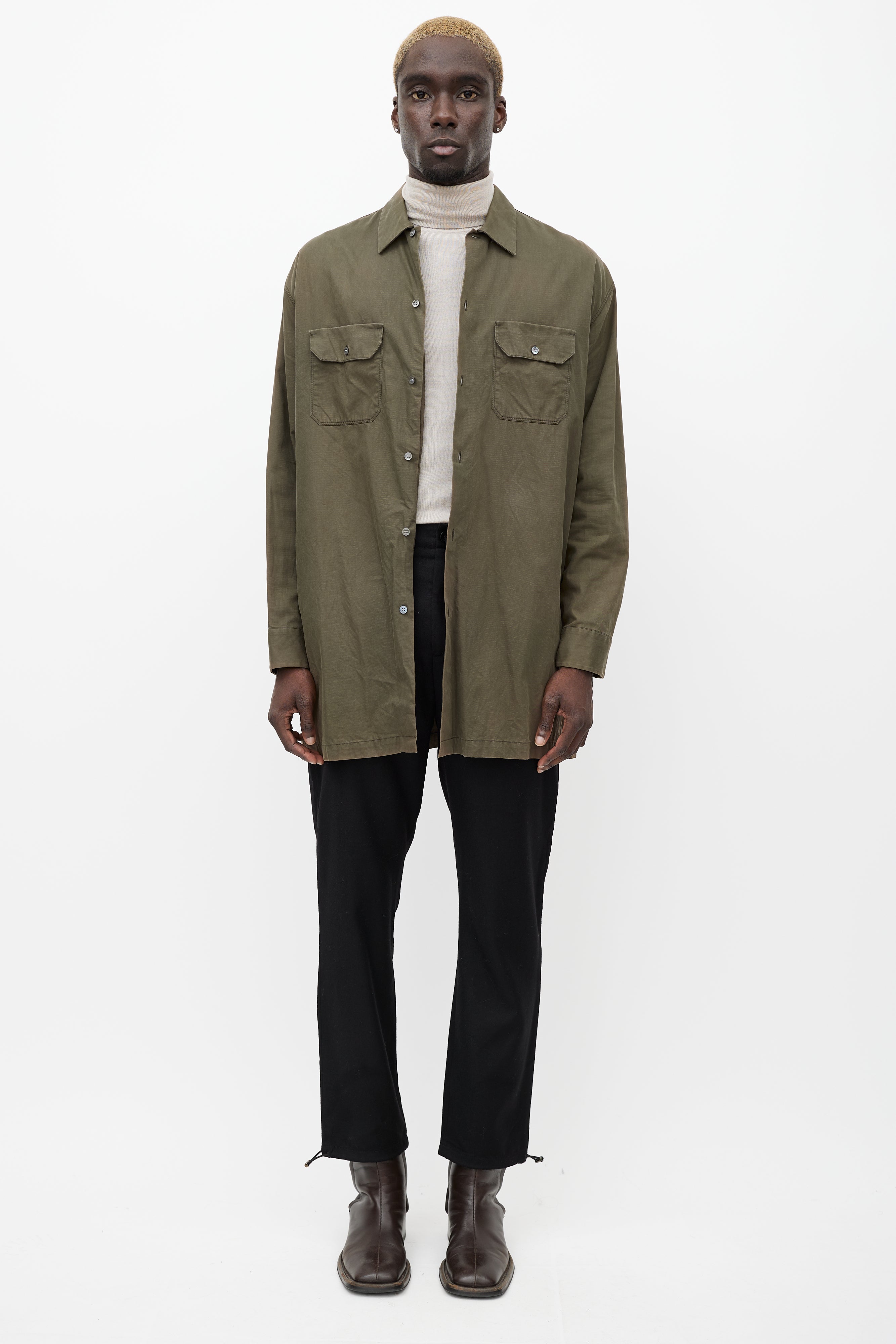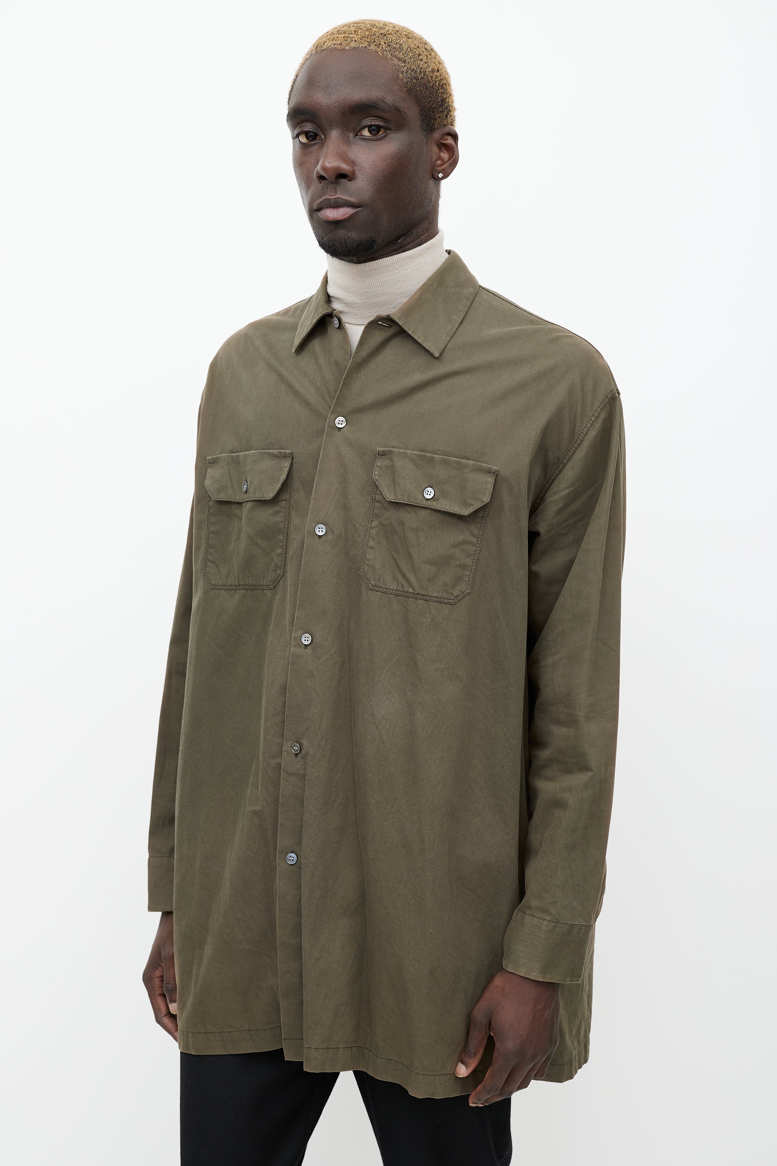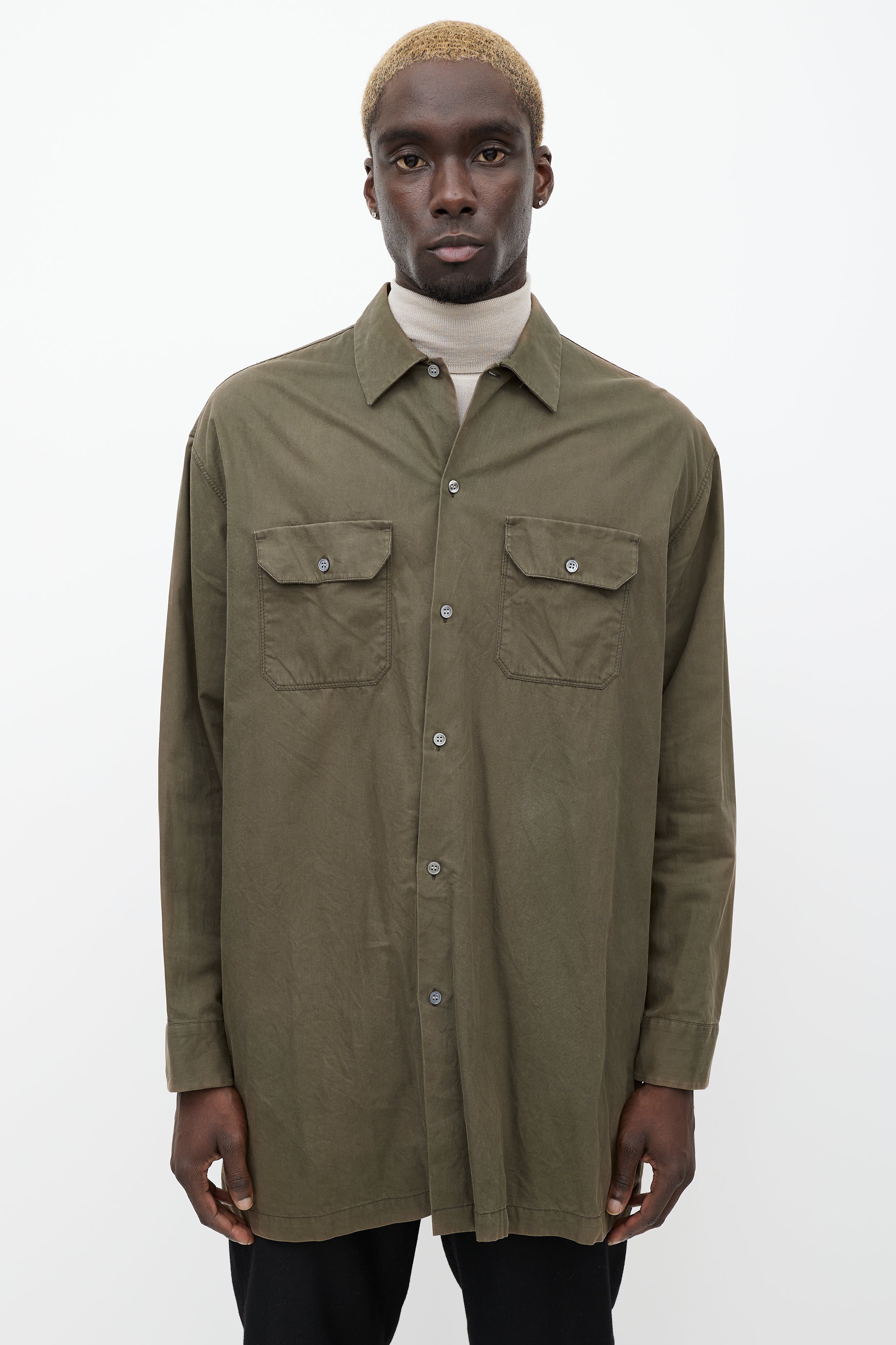 Pre-owned Acne Studios khaki green Santos oversized shirt featuring classic collar, button up front, buttoned cuffs, and two buttoned pockets at chest.