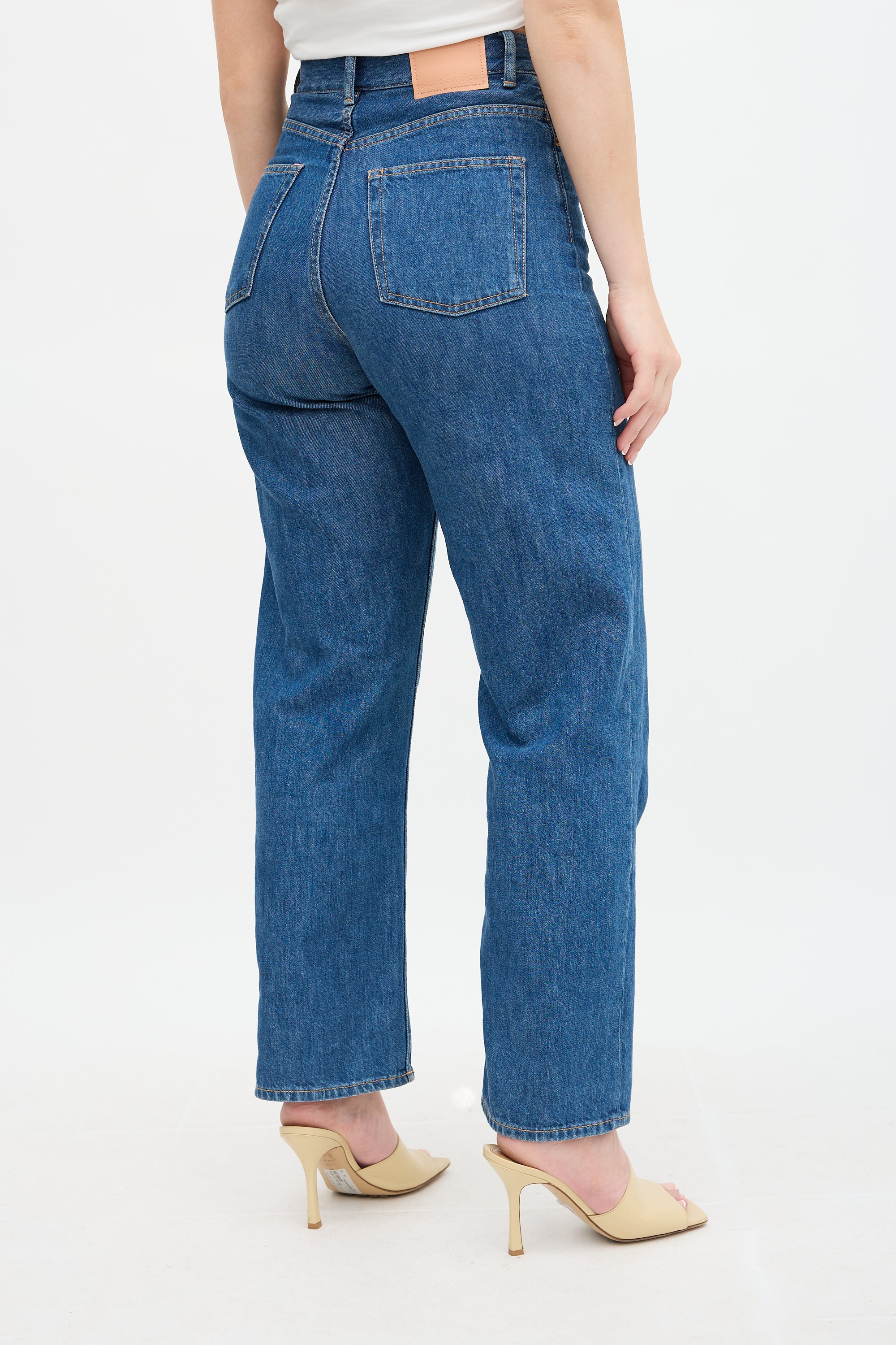 Pre-owned Acne Studios medium wash jeans featuring high waist, straight leg, five pocket styling, pink leather Jacron, and zip fly.