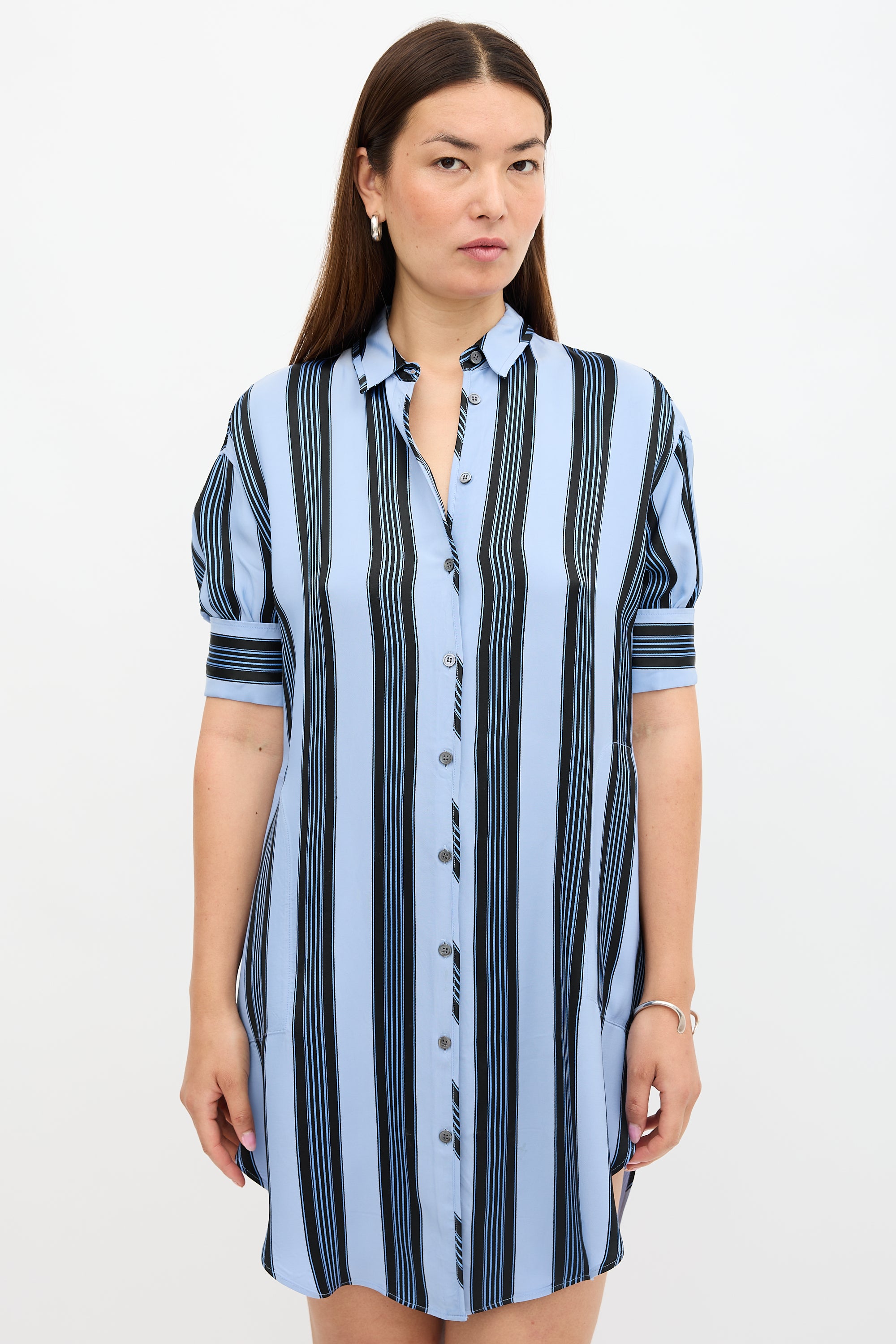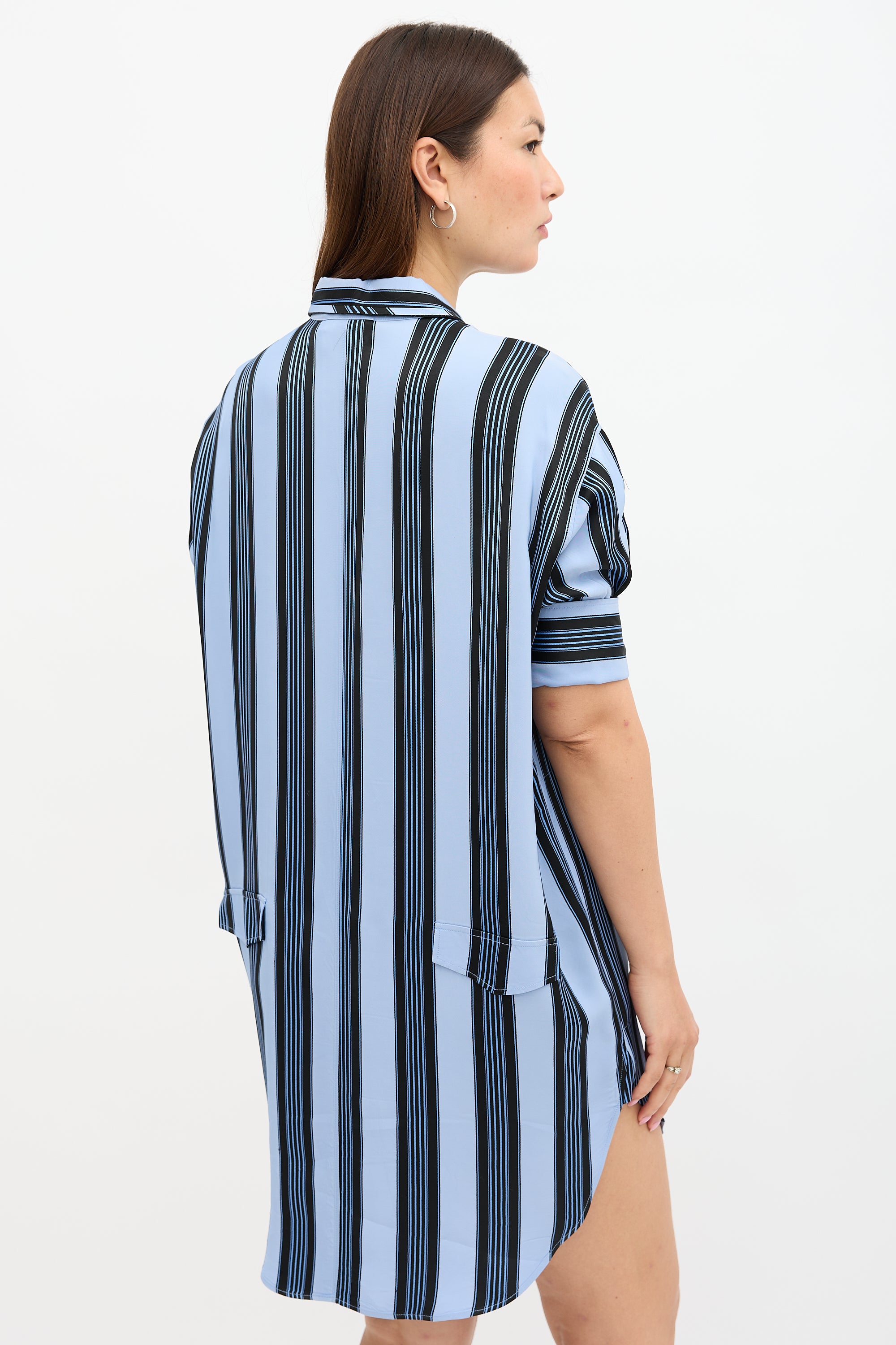 Pre-owned Acne Studios blue and black striped tunic dress featuring a point collar, button front, two slip pockets at hip, and two flap pockets at back.