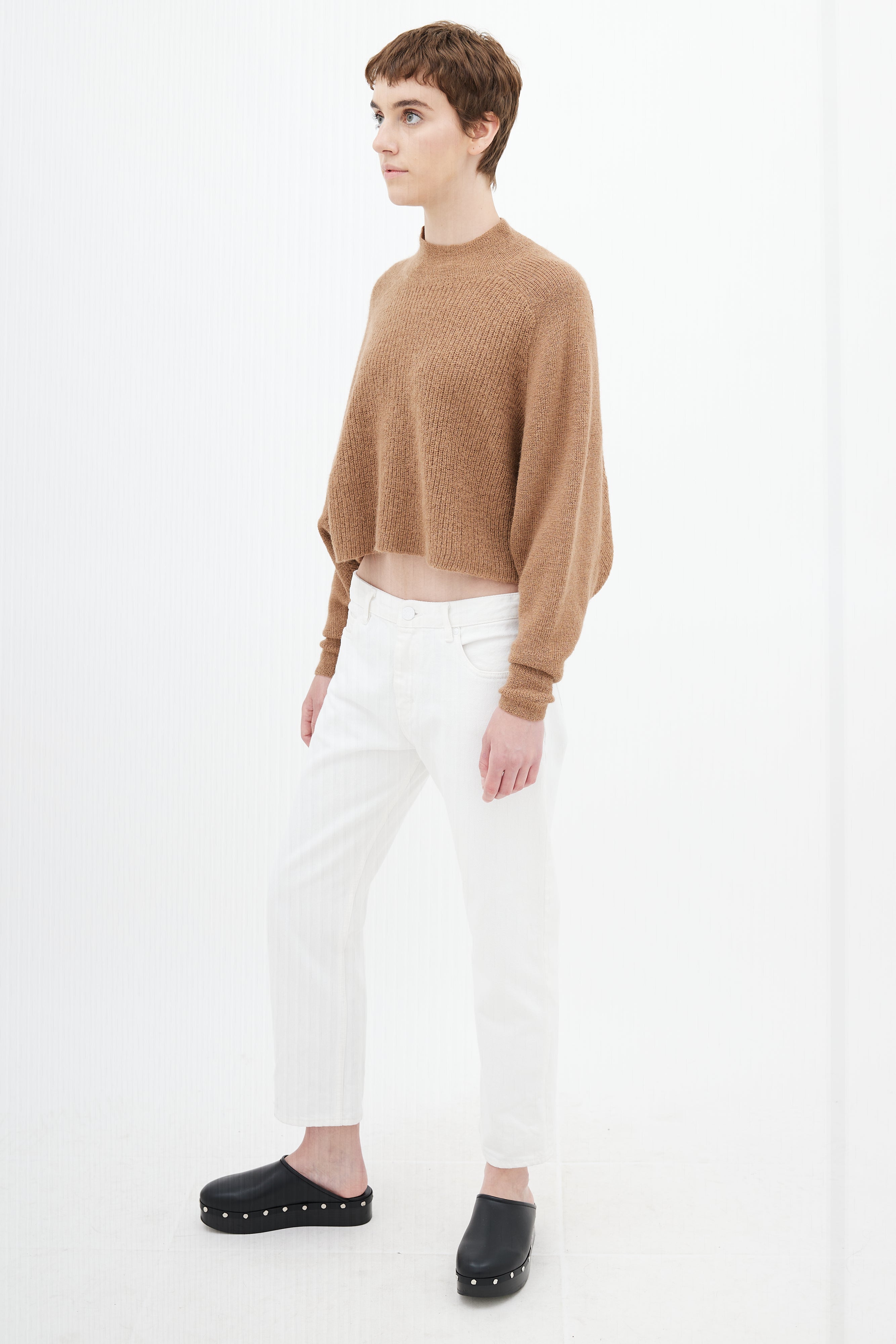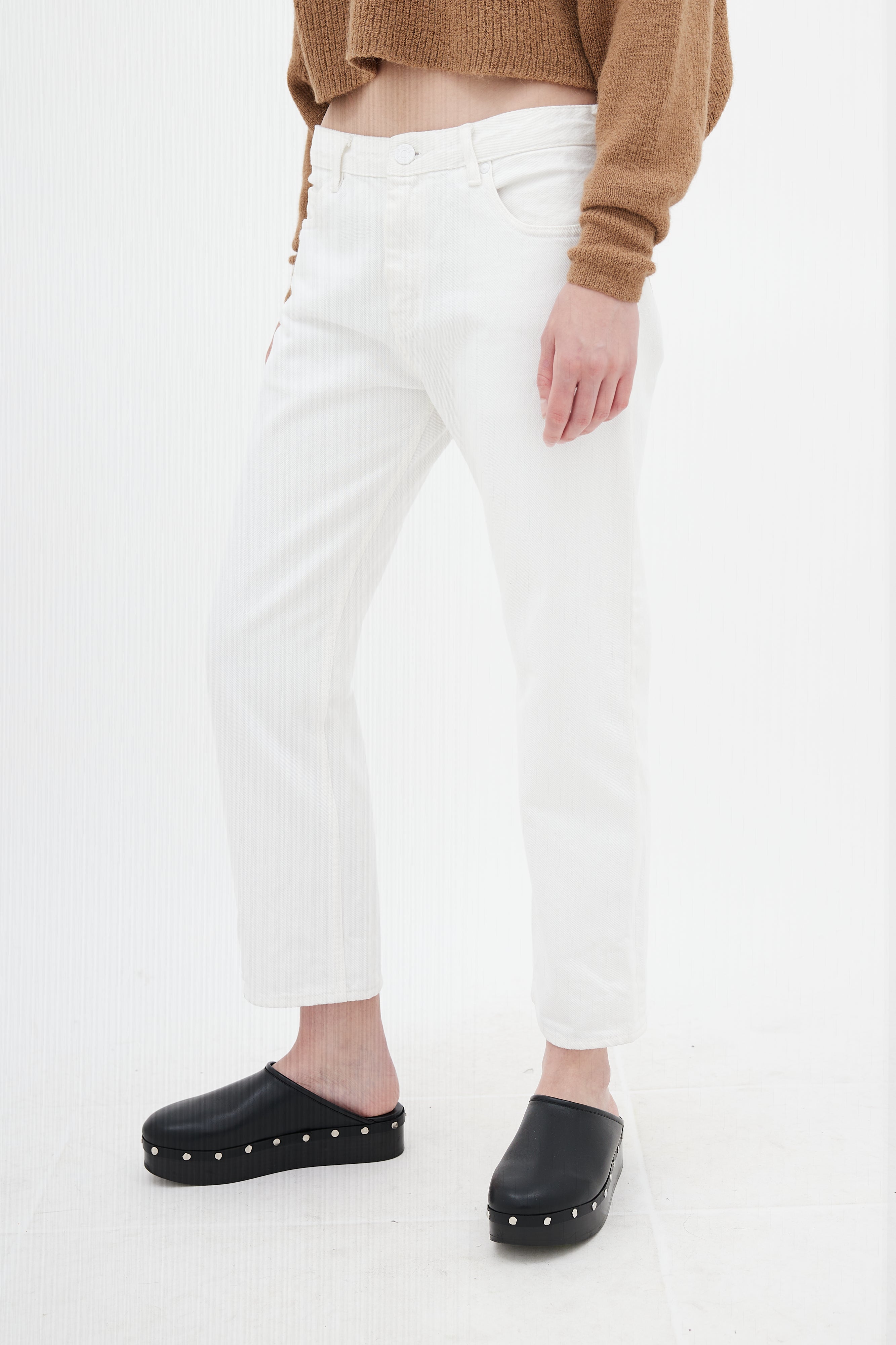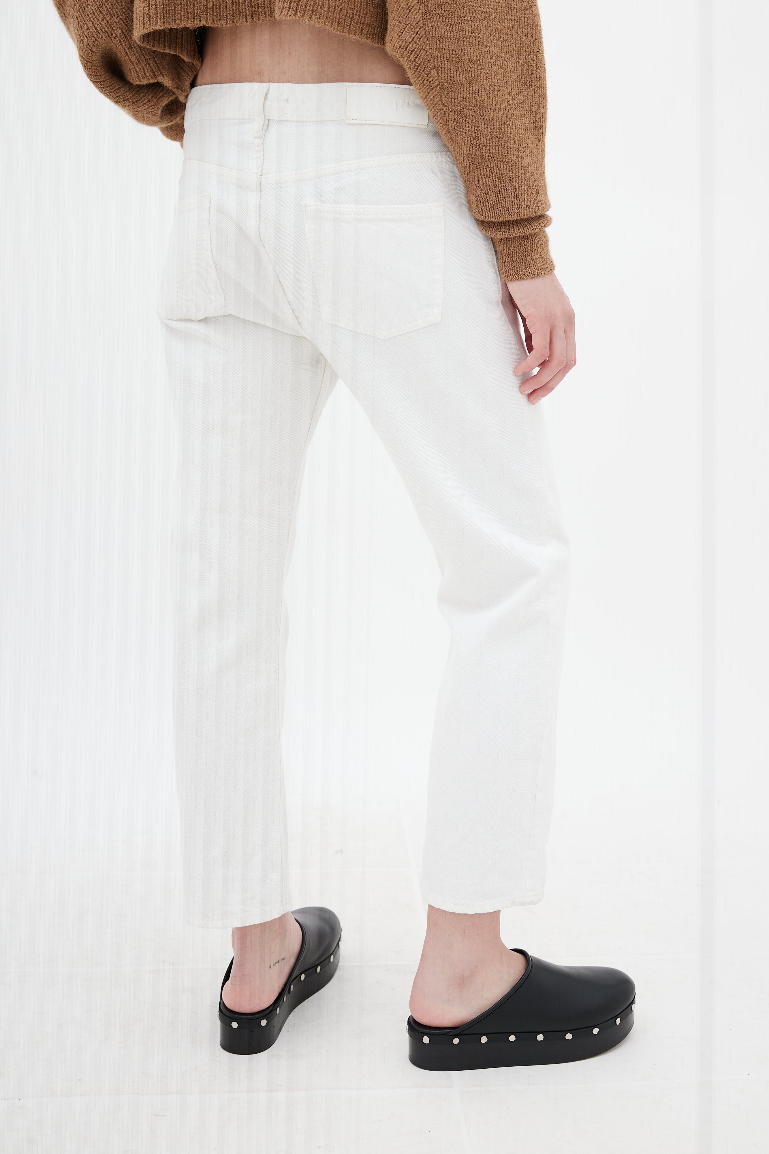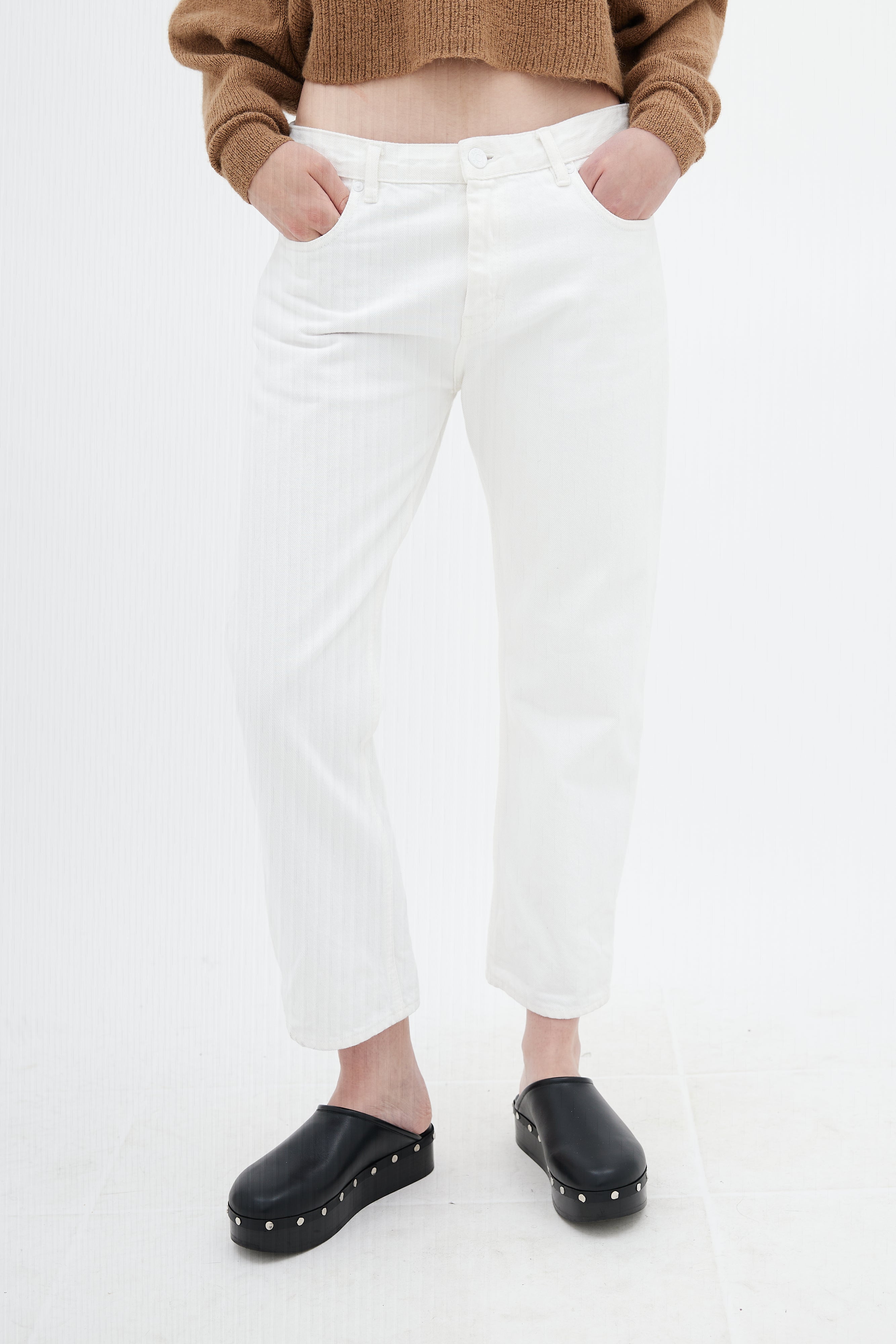Pre-owned Acne Studios white Pop jeans featuring belt loops, zip fly, tonal jacron patch at back, and five pocket styling.