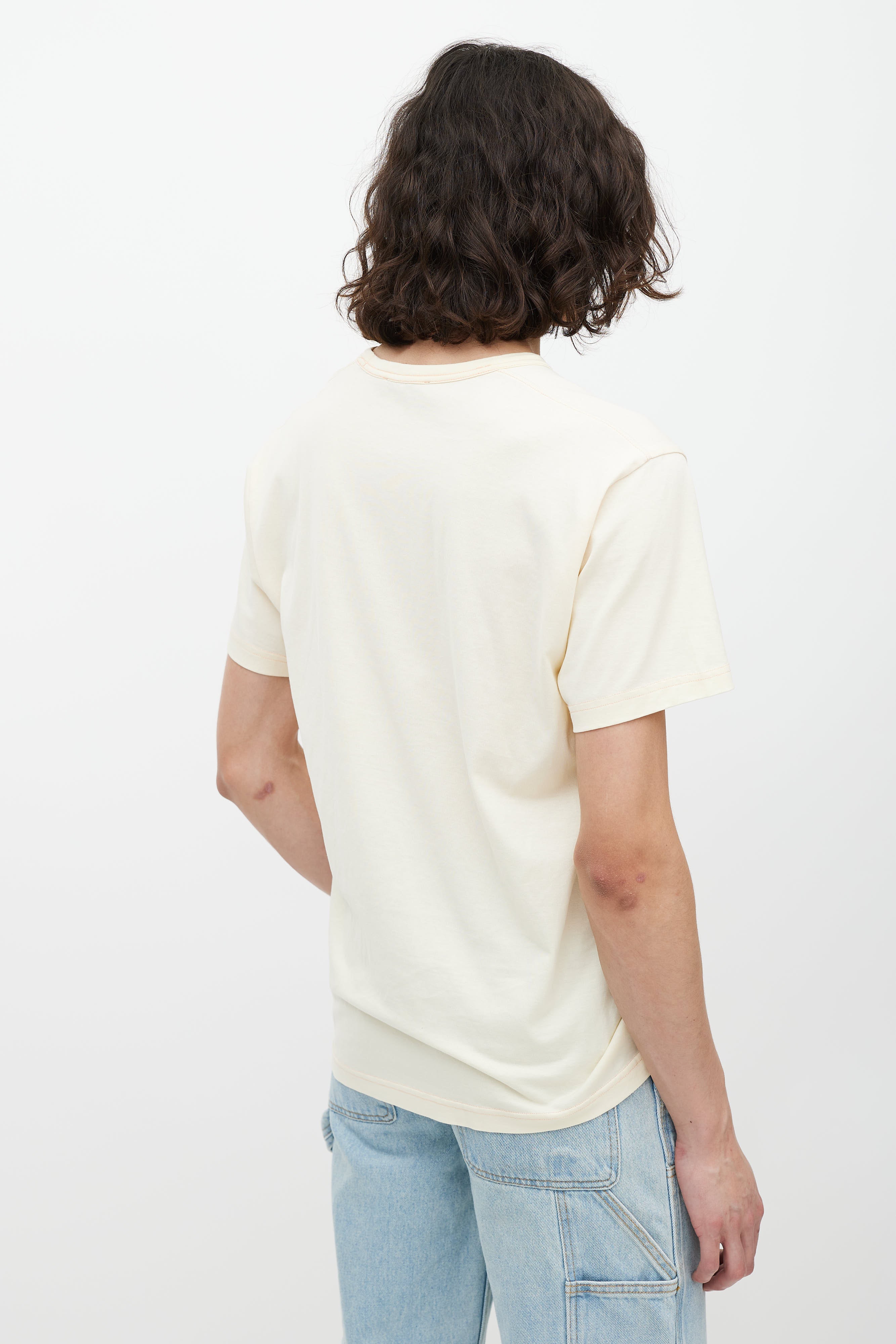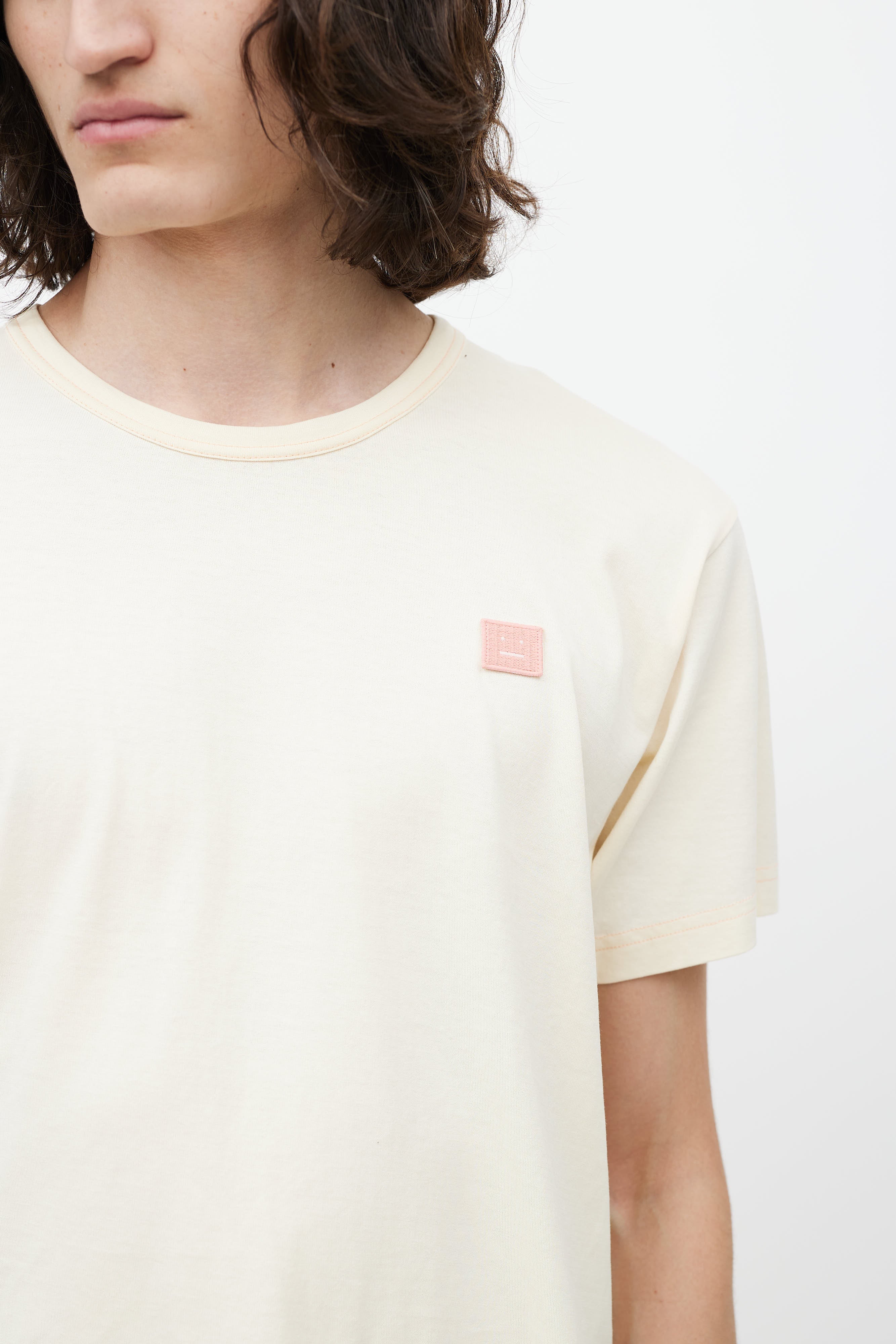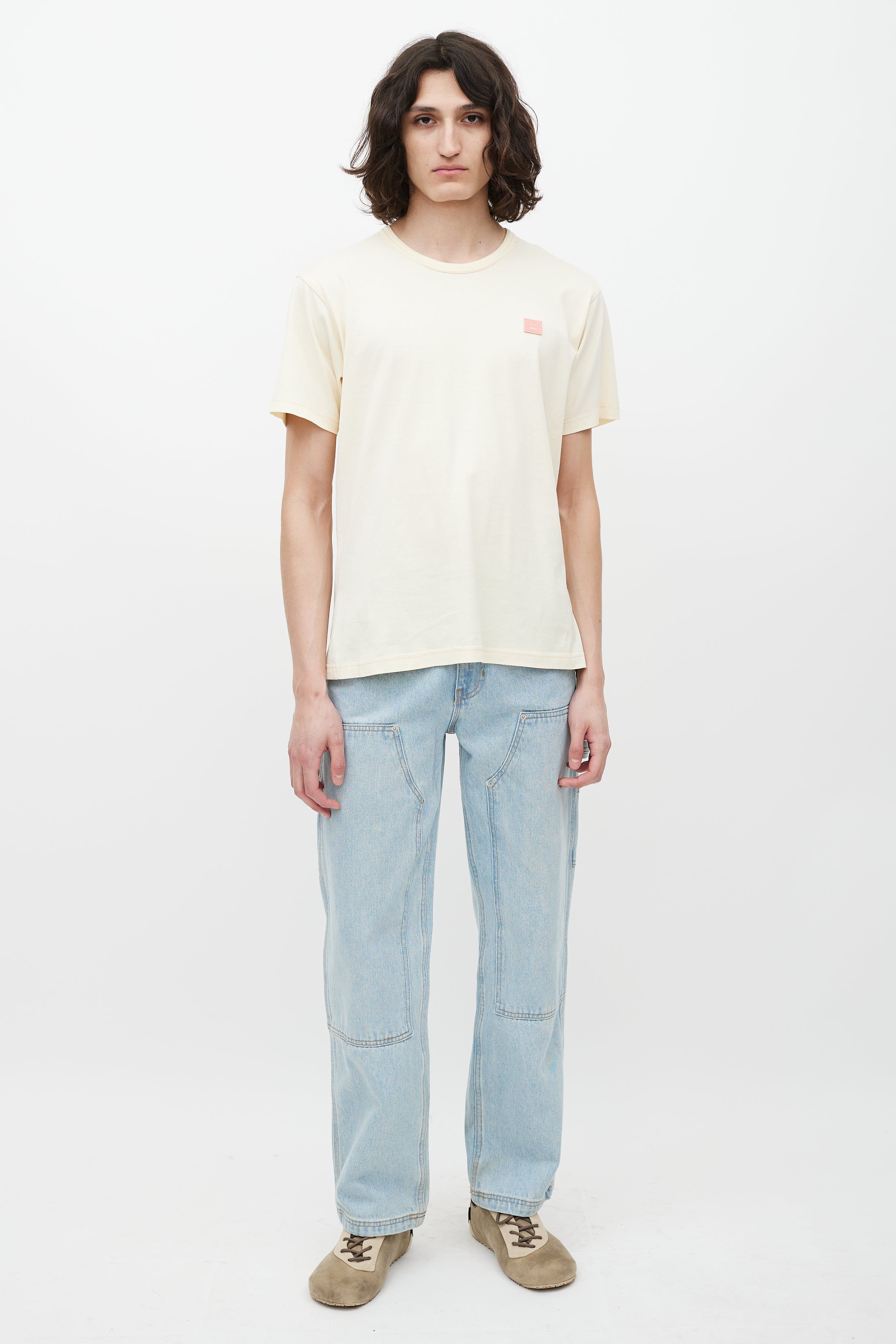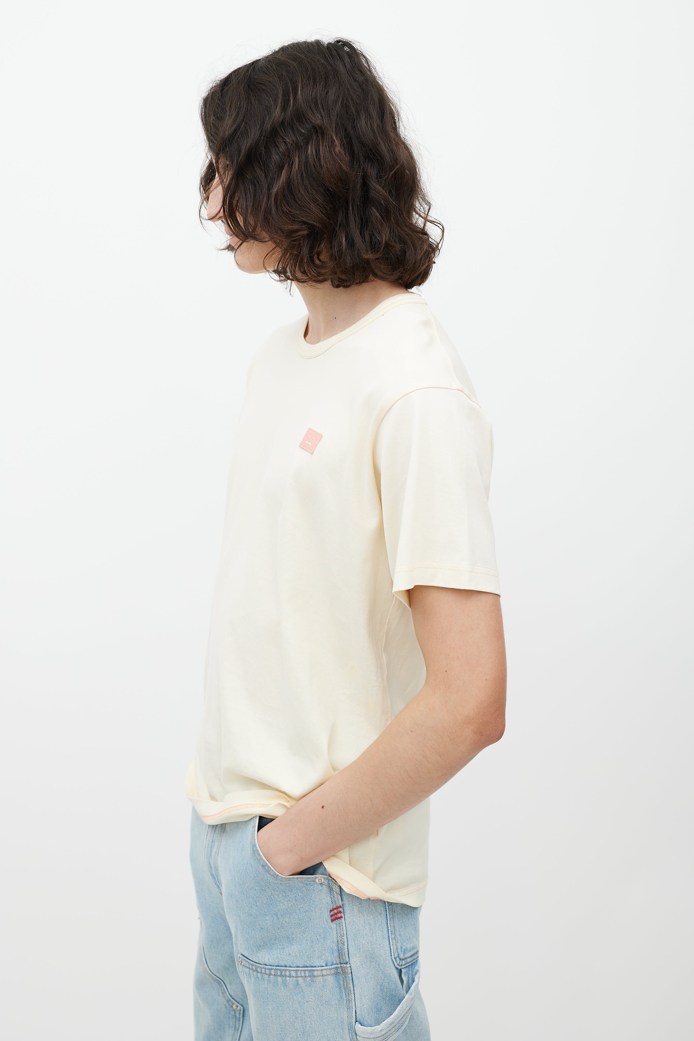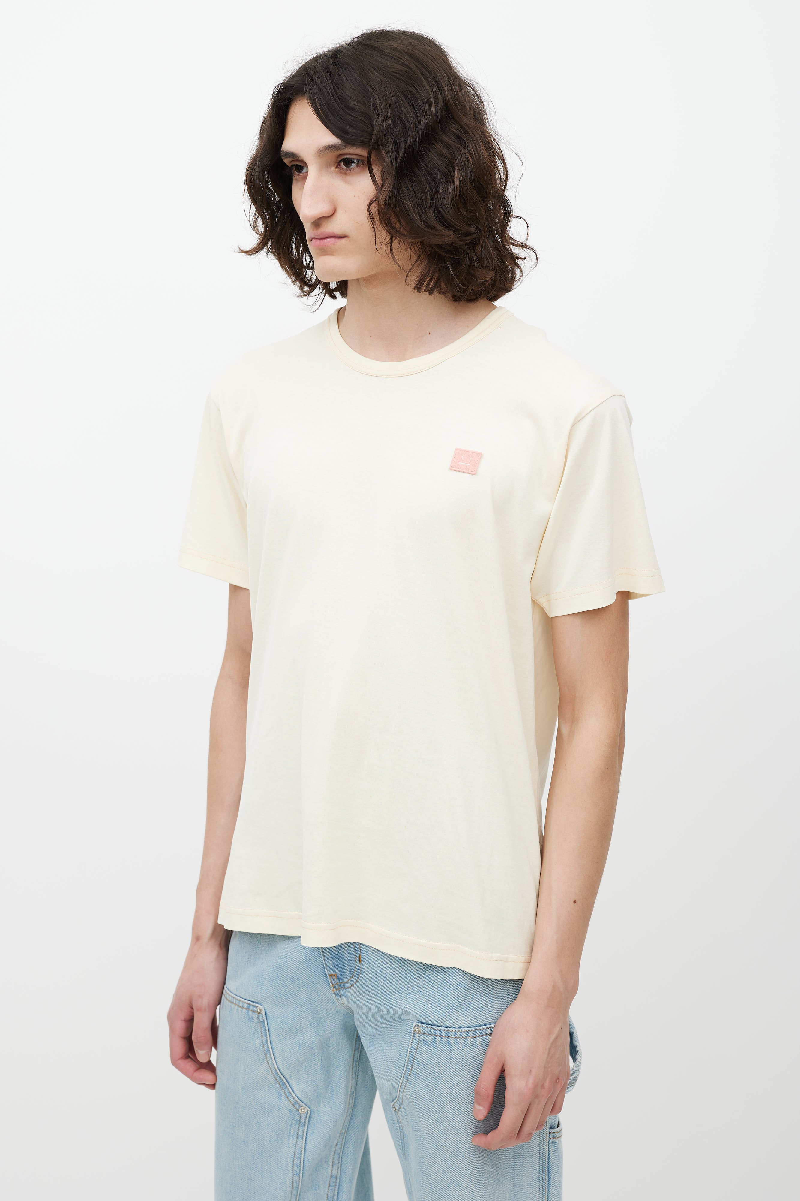 Pre-owned Acne Studios yellow T-shirt featuring a pink face patch logo at chest, crew neckline, and short sleeves.