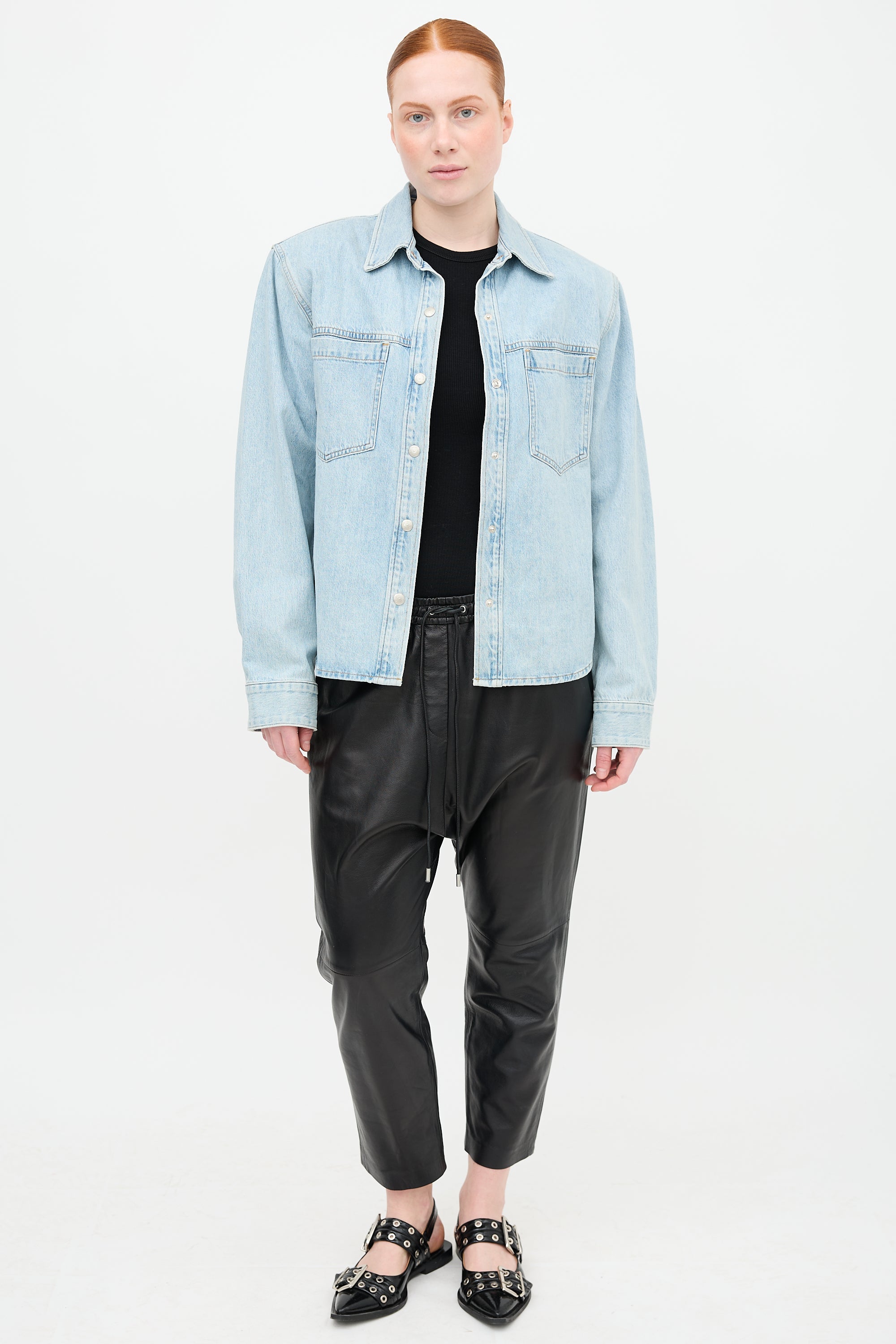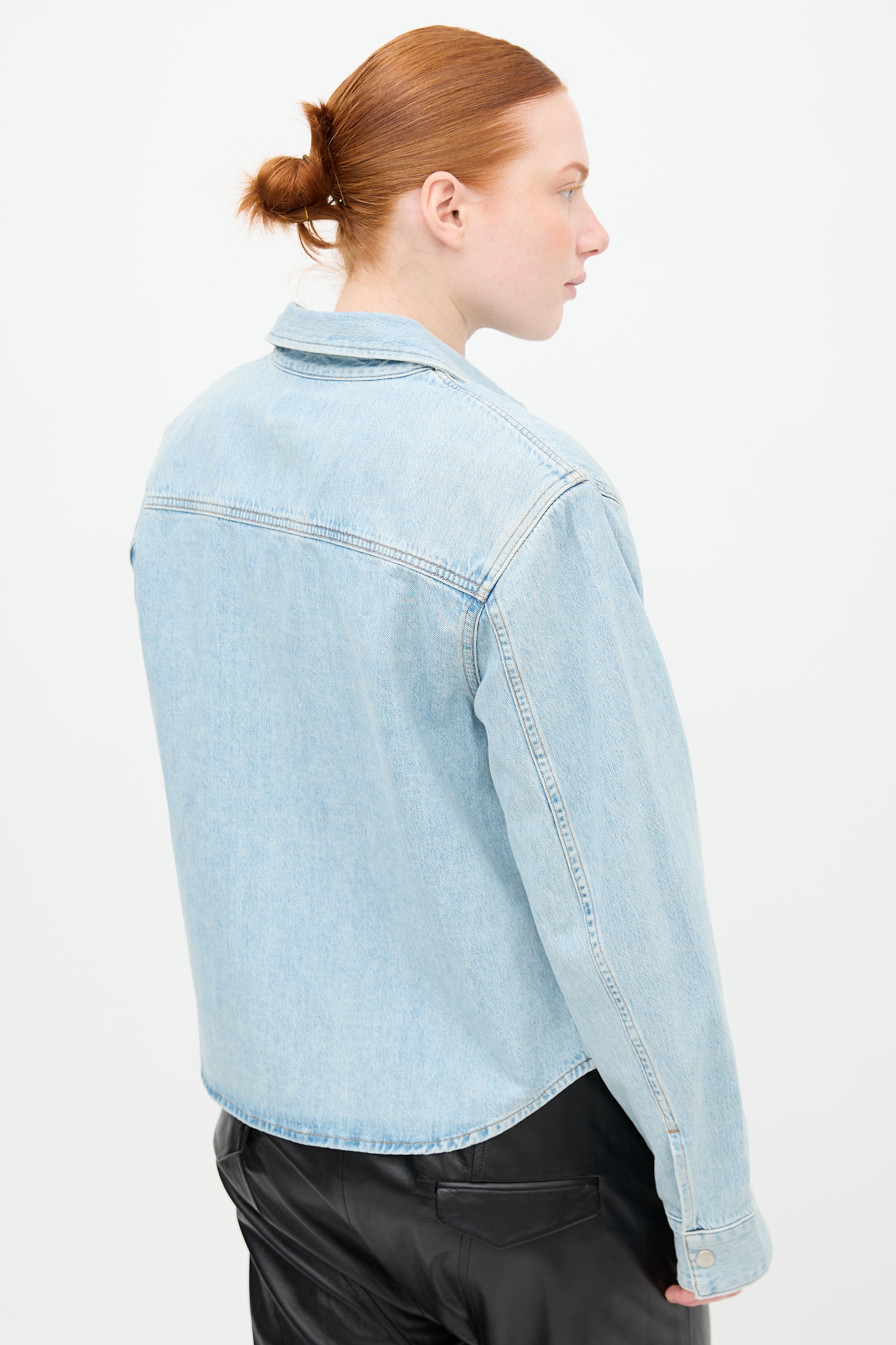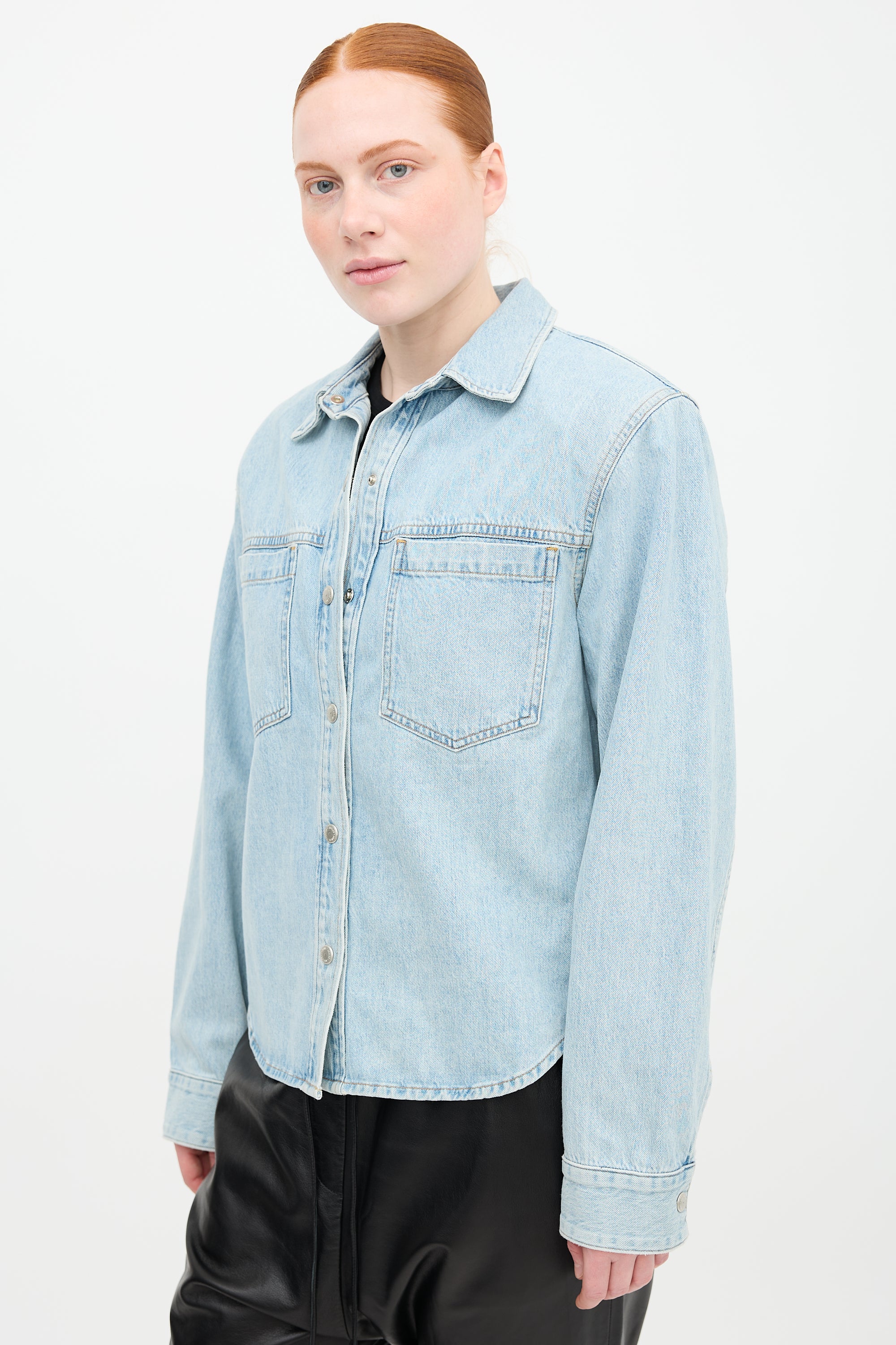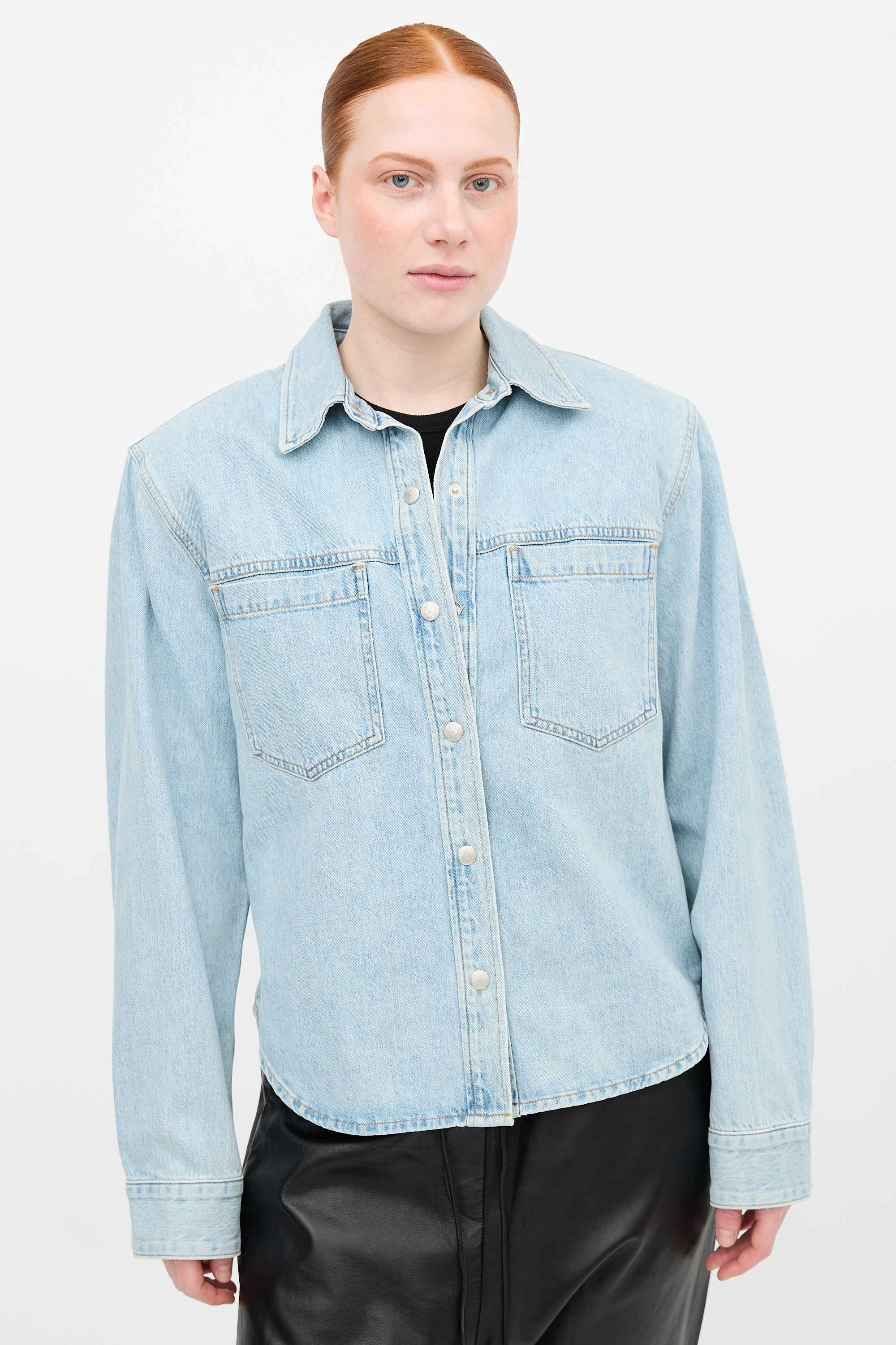Pre-owned Agolde light wash denim Brigid shirt featuring point collar, snap button front, two front patch pockets, padded shoulders, and buttoned cuffs.