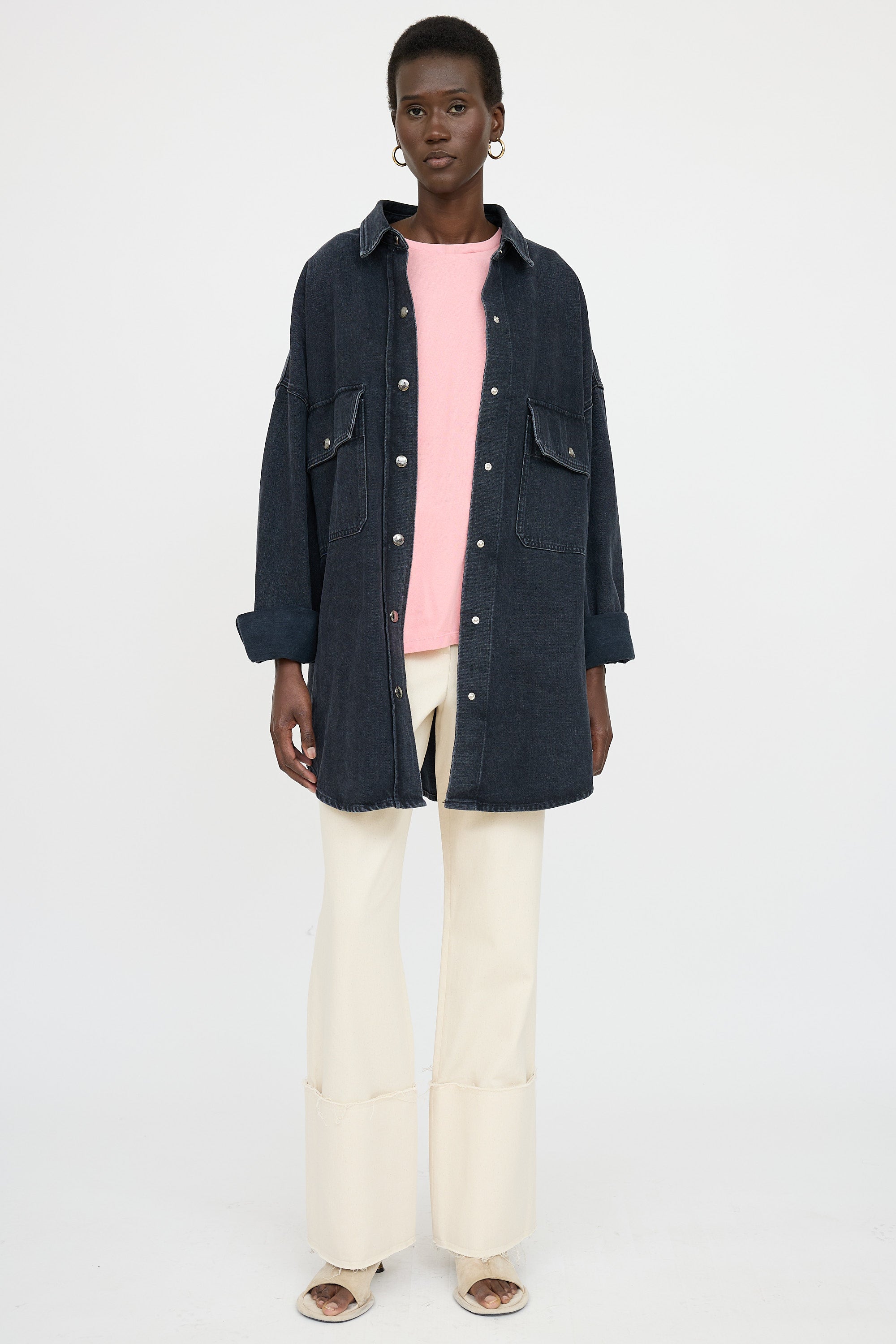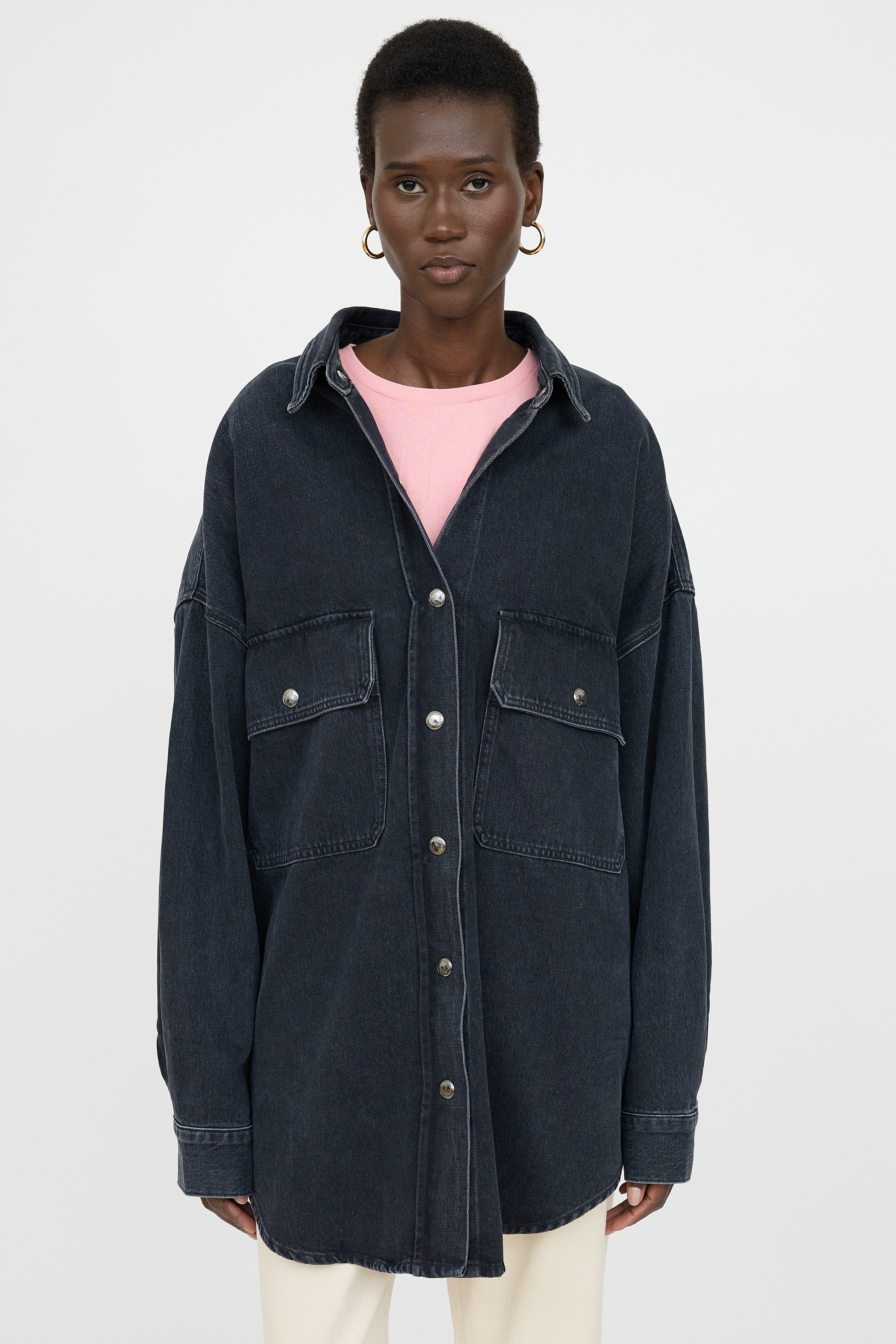 Pre-owned Agolde black Talli denim shirt featuring pointed collar, silver tone snap button front, patch pockets at chest, rounded hemline, and snap button cuffs.