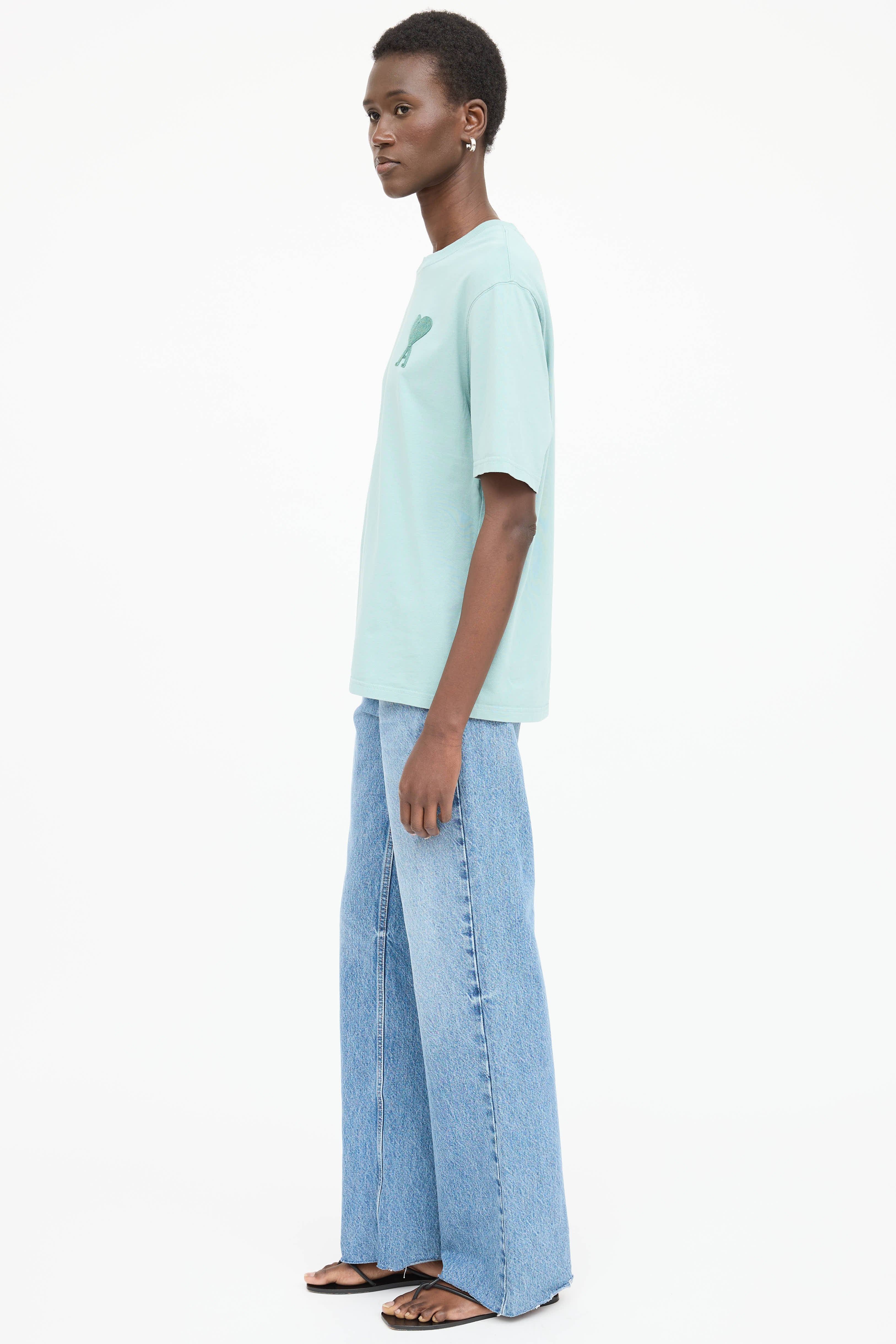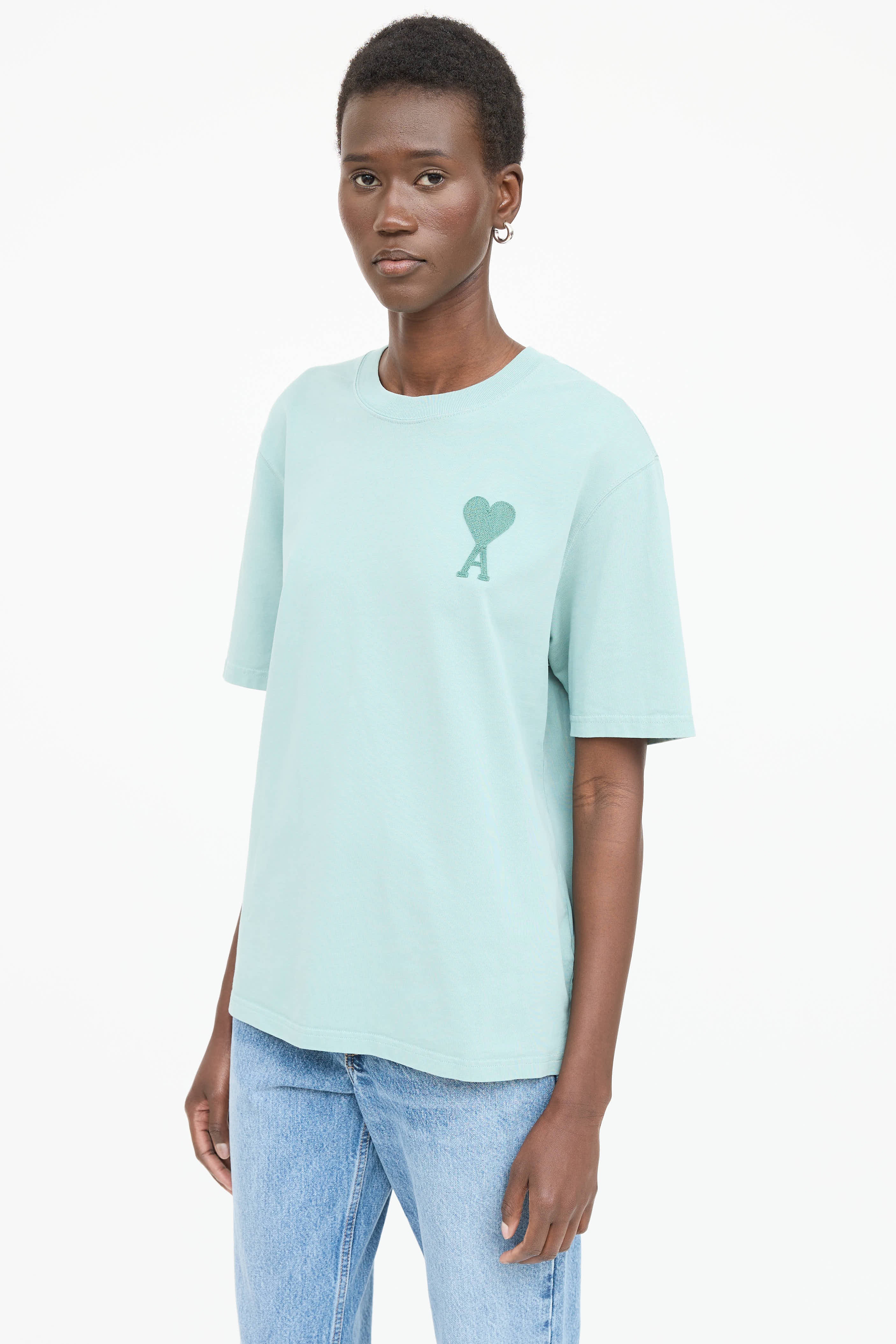 Pre-owned AMI Paris green short sleeve t-shirt featuring ribbed round neckline and embroidered patch logo at chest.