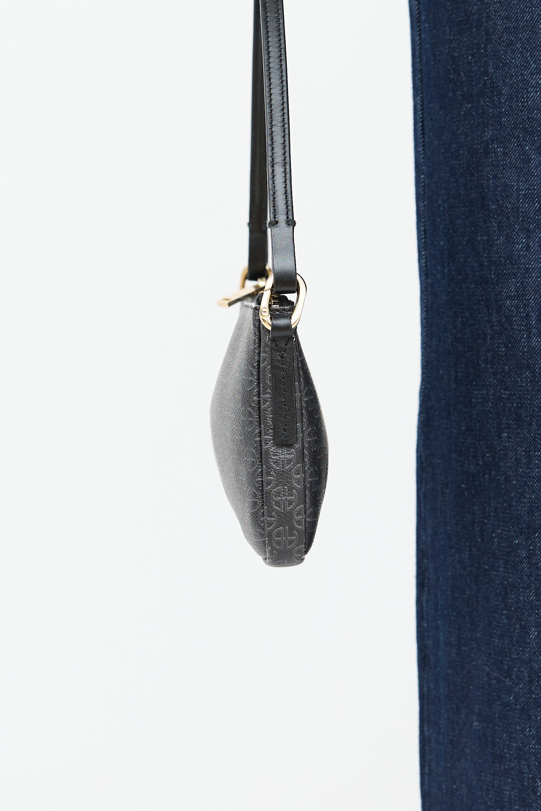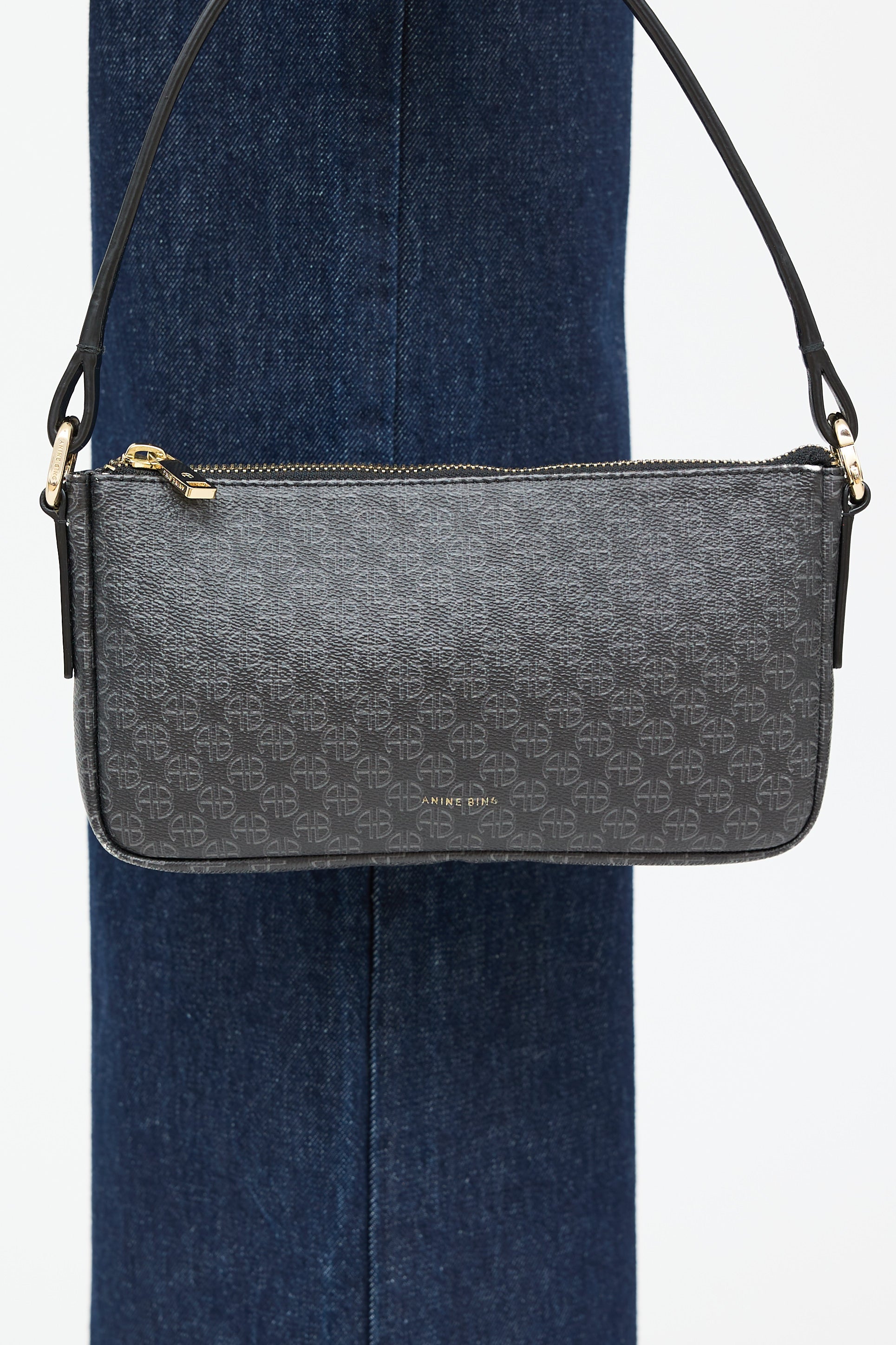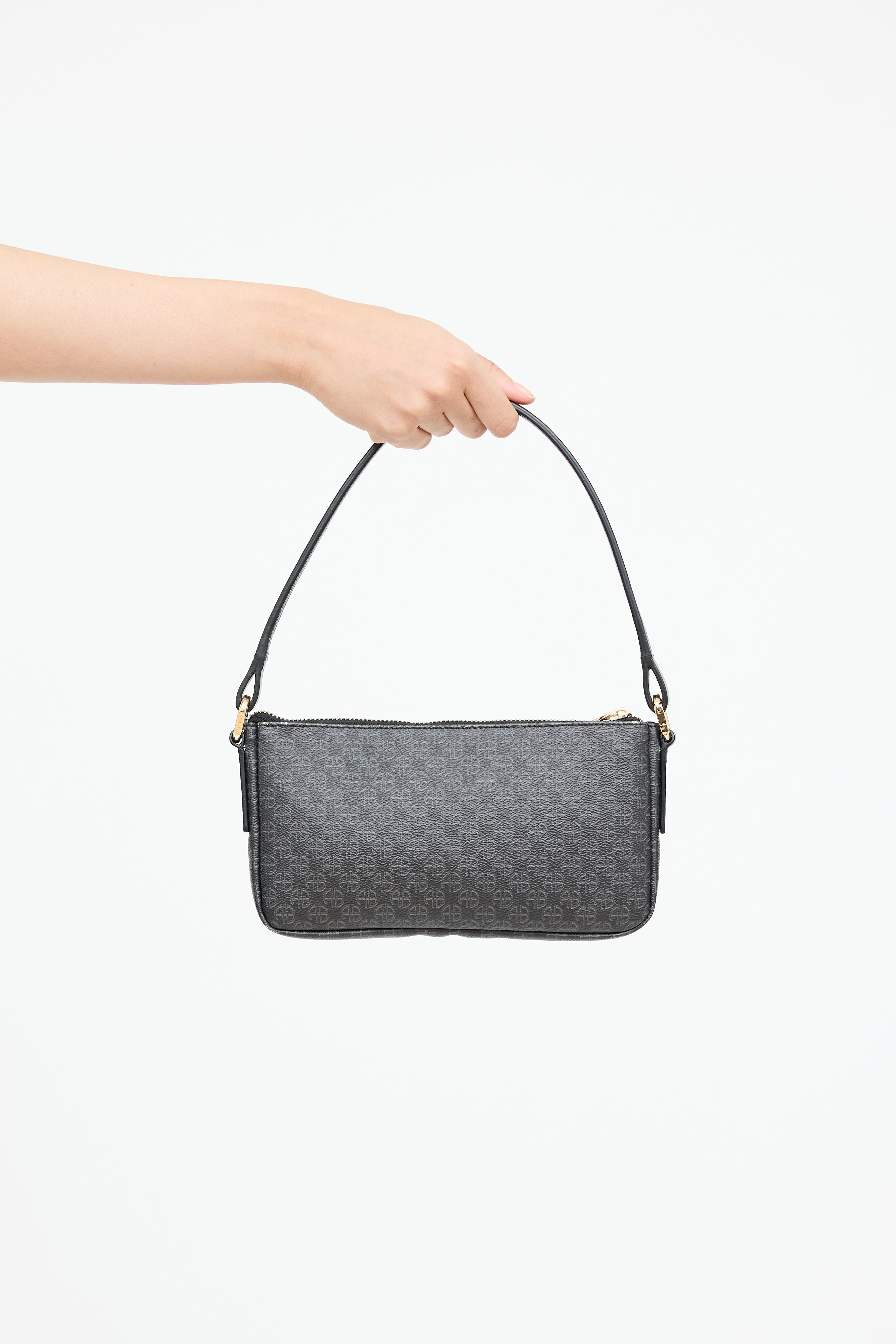 Pre-owned Anine Bing black Bianca bag in monogram coated canvas featuring a gold tone printed logo at front, leather shoulder strap, one main compartment, gold tone hardware, and top zip closure.