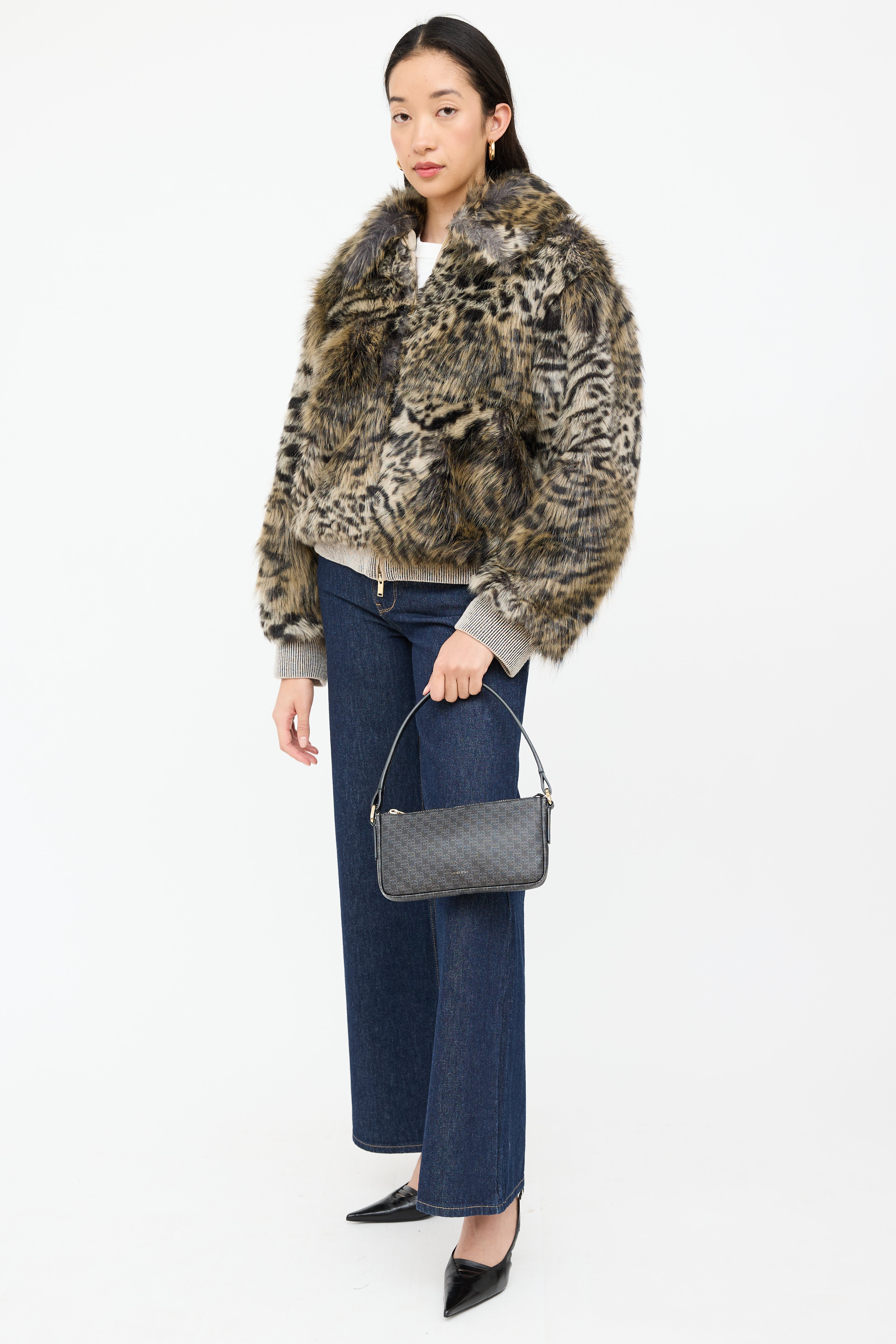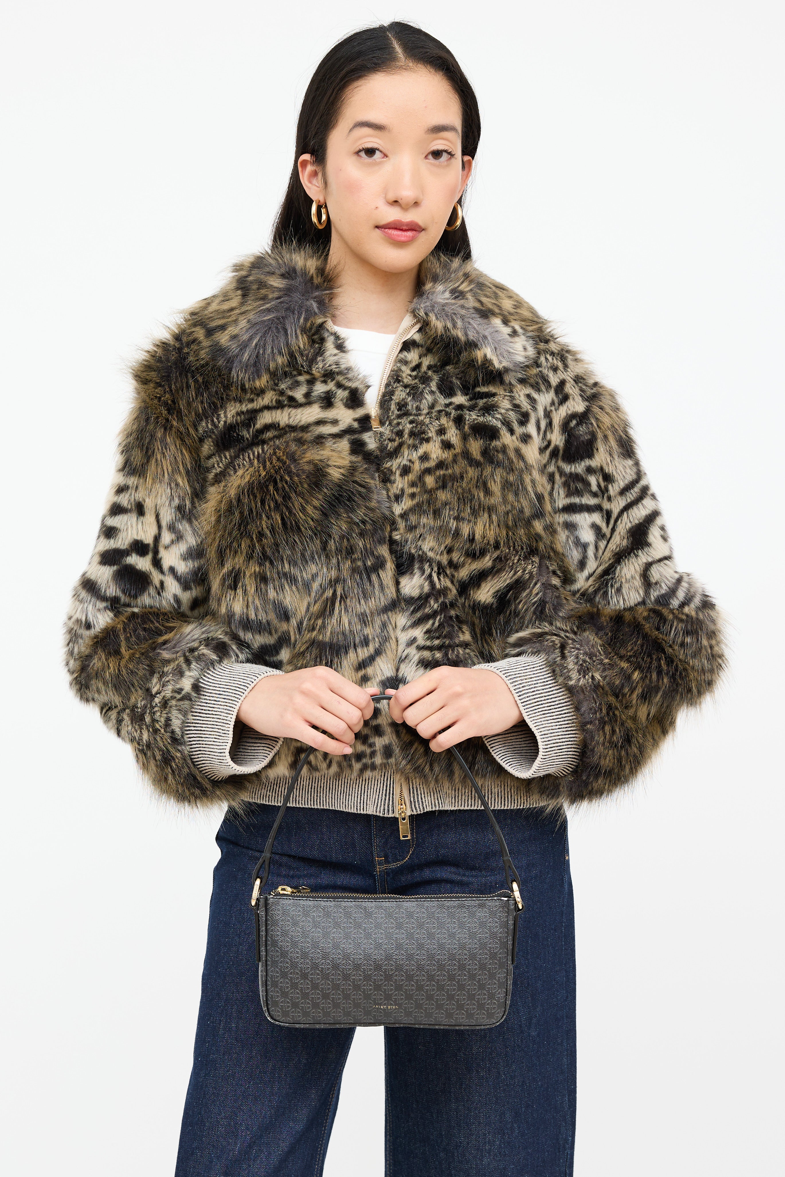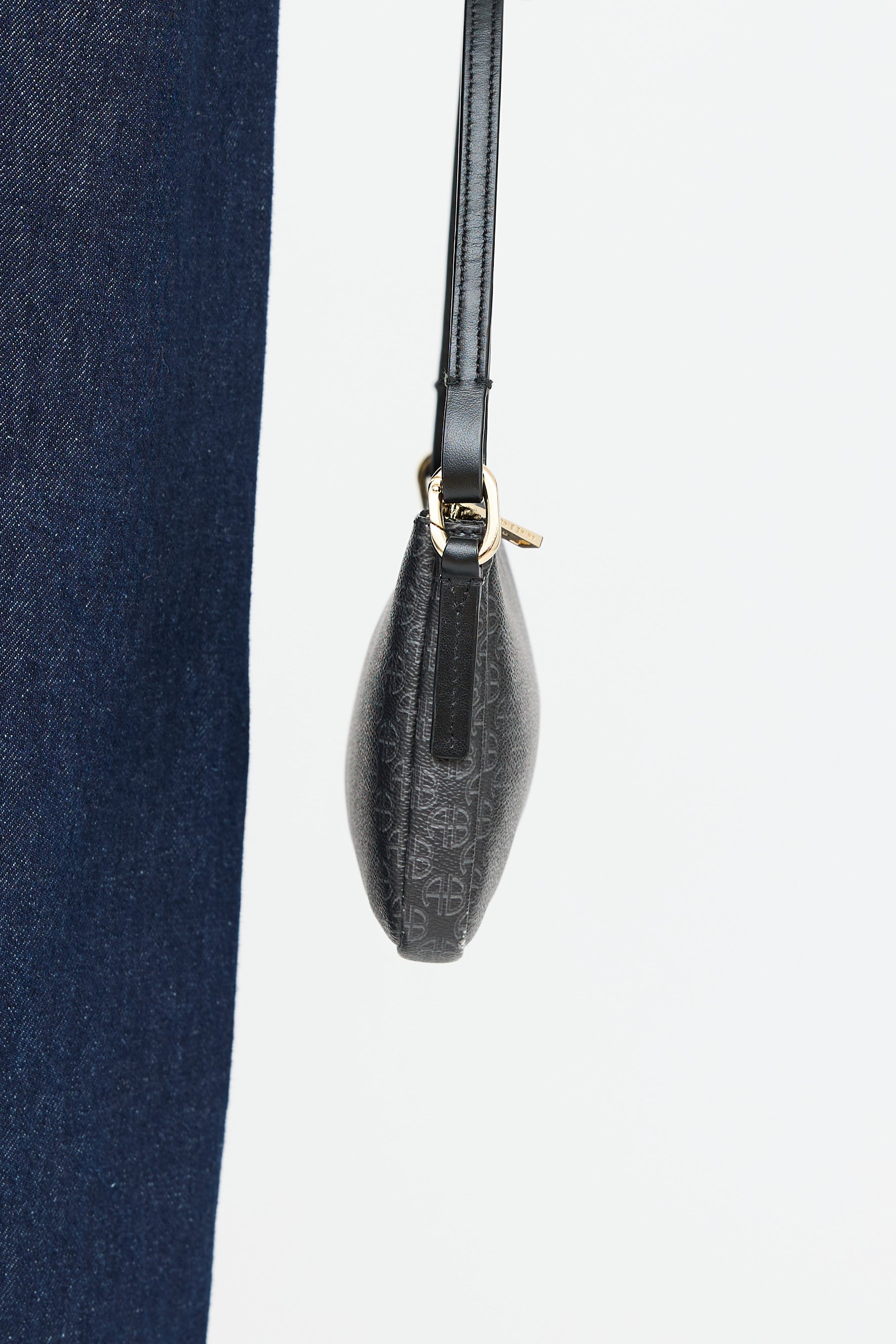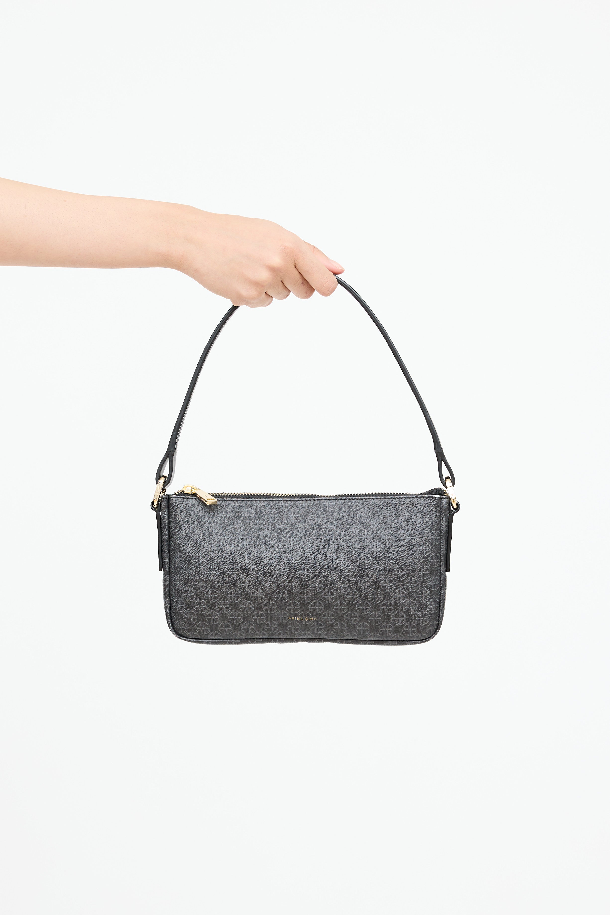 Pre-owned Anine Bing black Bianca bag in monogram coated canvas featuring a gold tone printed logo at front, leather shoulder strap, one main compartment, gold tone hardware, and top zip closure.