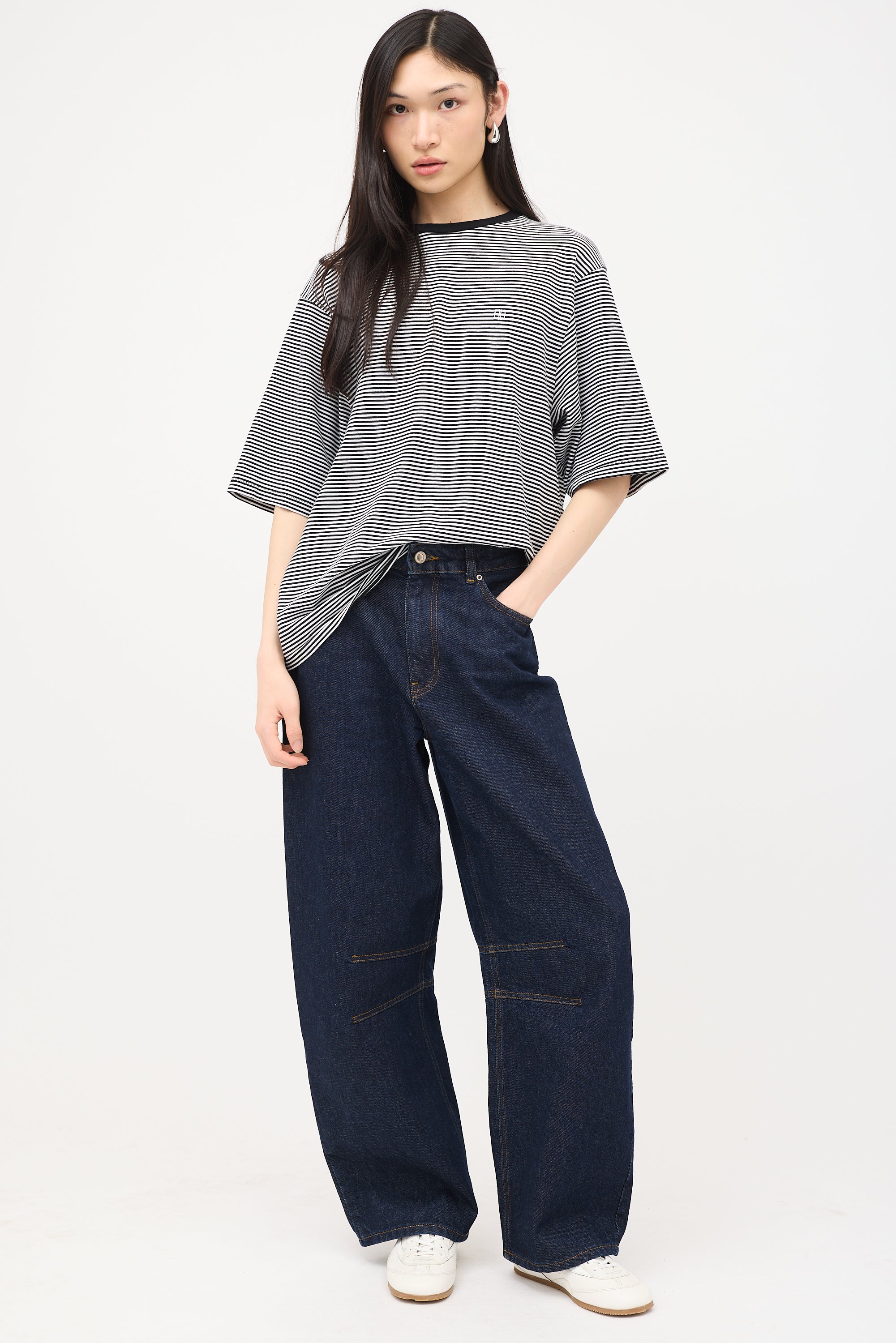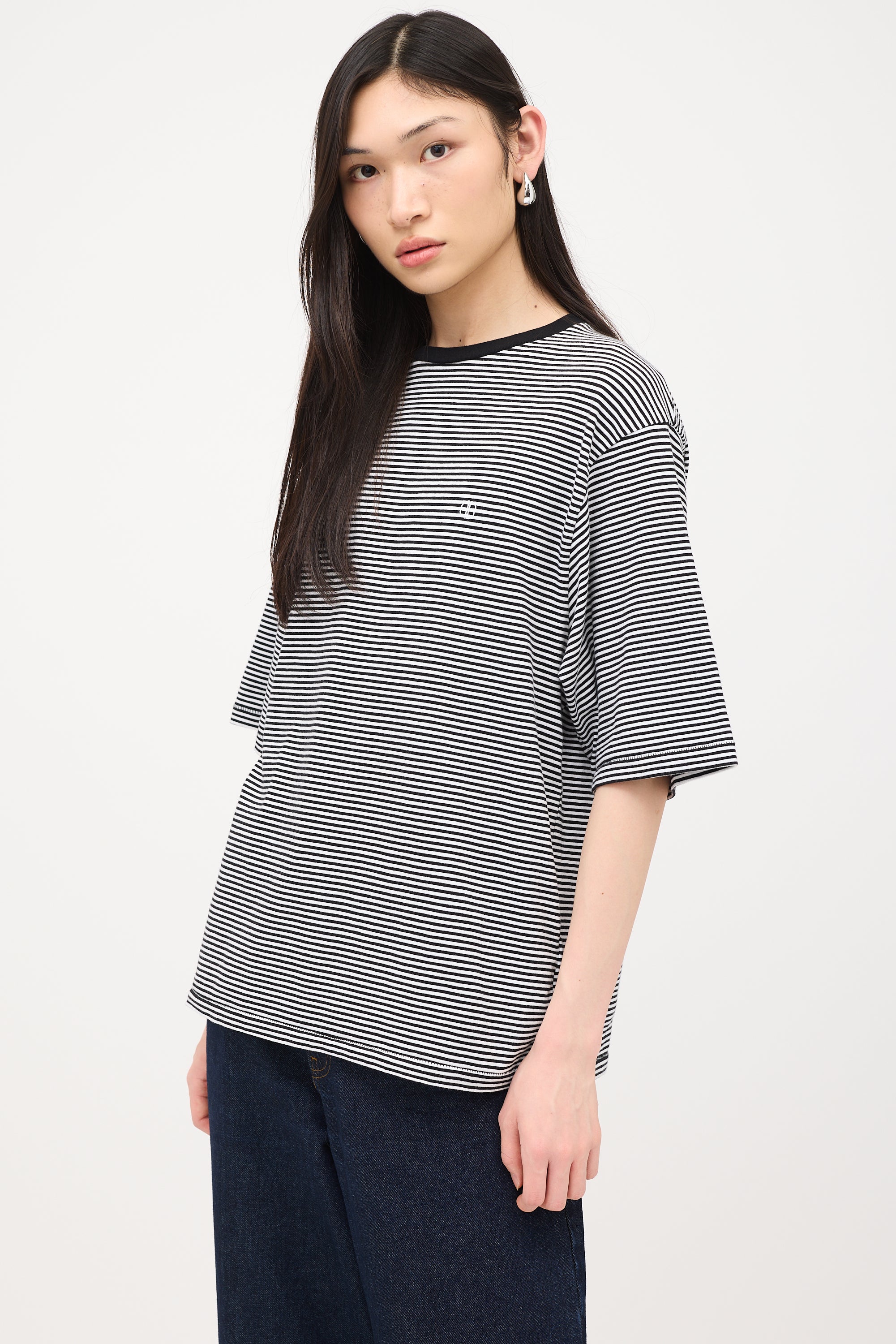 Pre-owned Anine Bing oversized Bo T-shirt featuring black and white stripe pattern, crew neckline, and embroidered logo front.