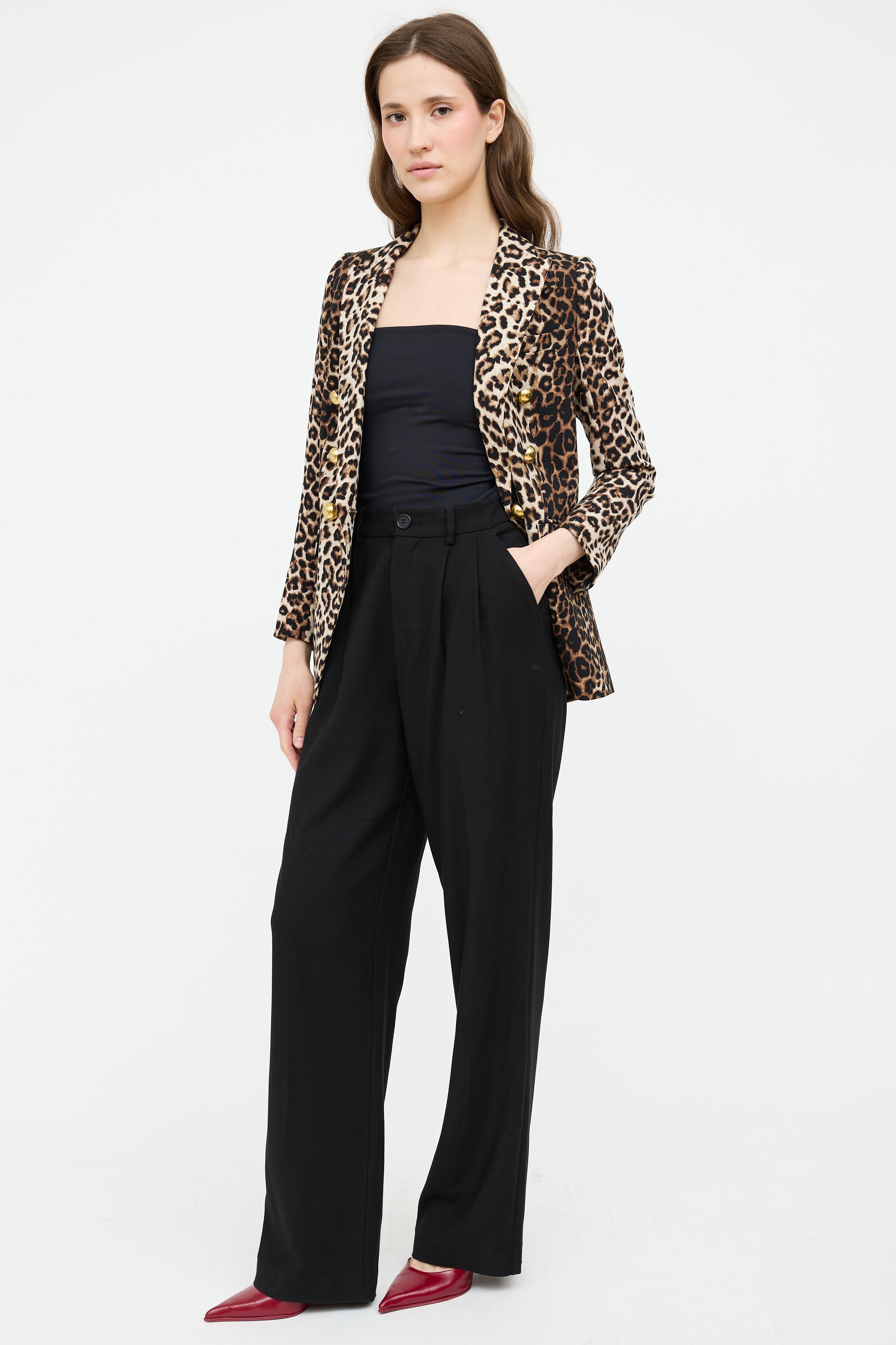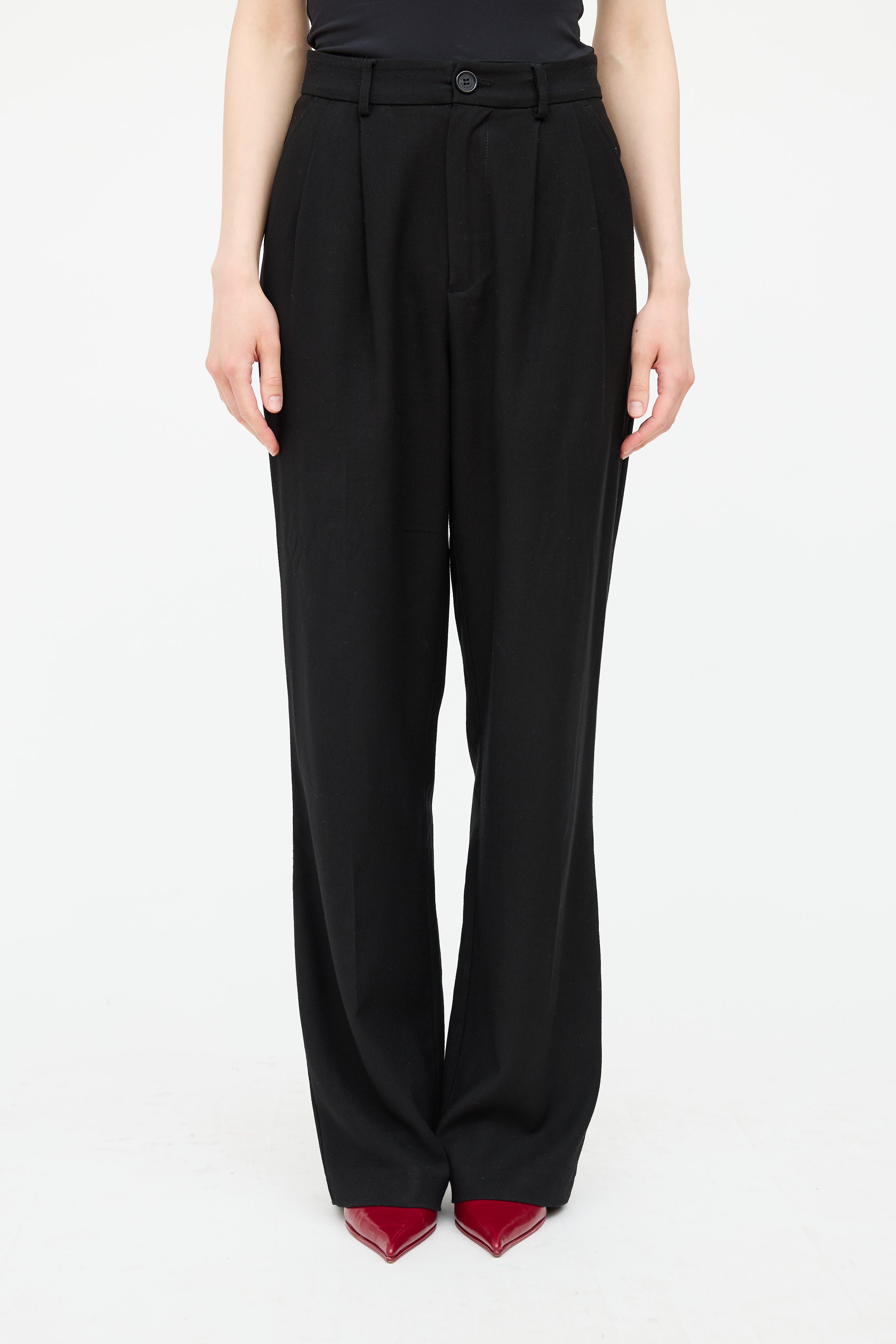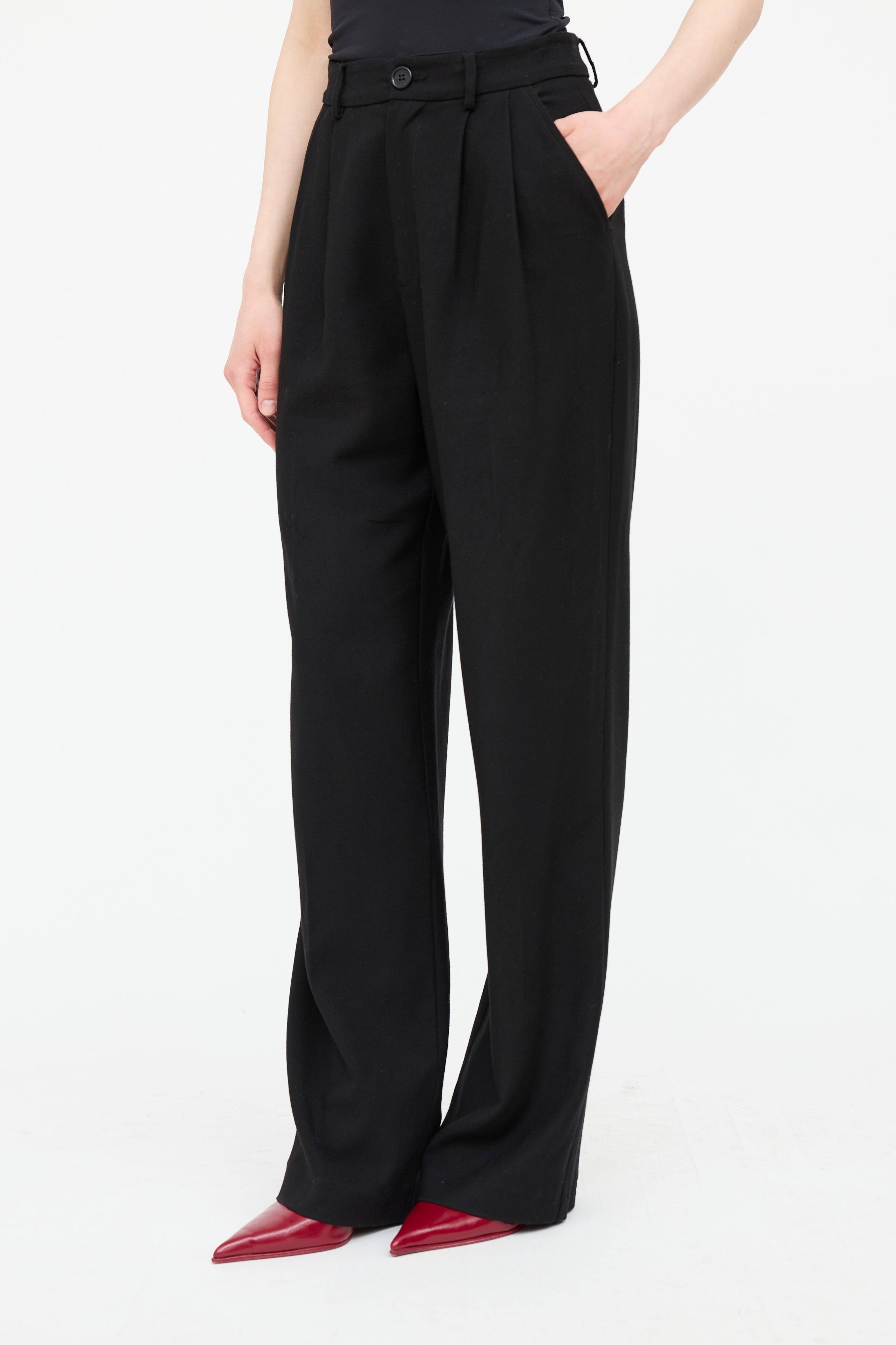 Pre-owned Anine Bing black high rise straight leg pant featuring button zip closure, belt loops, pleated detail at waist, slit pockets at side, and welt pockets at back.
