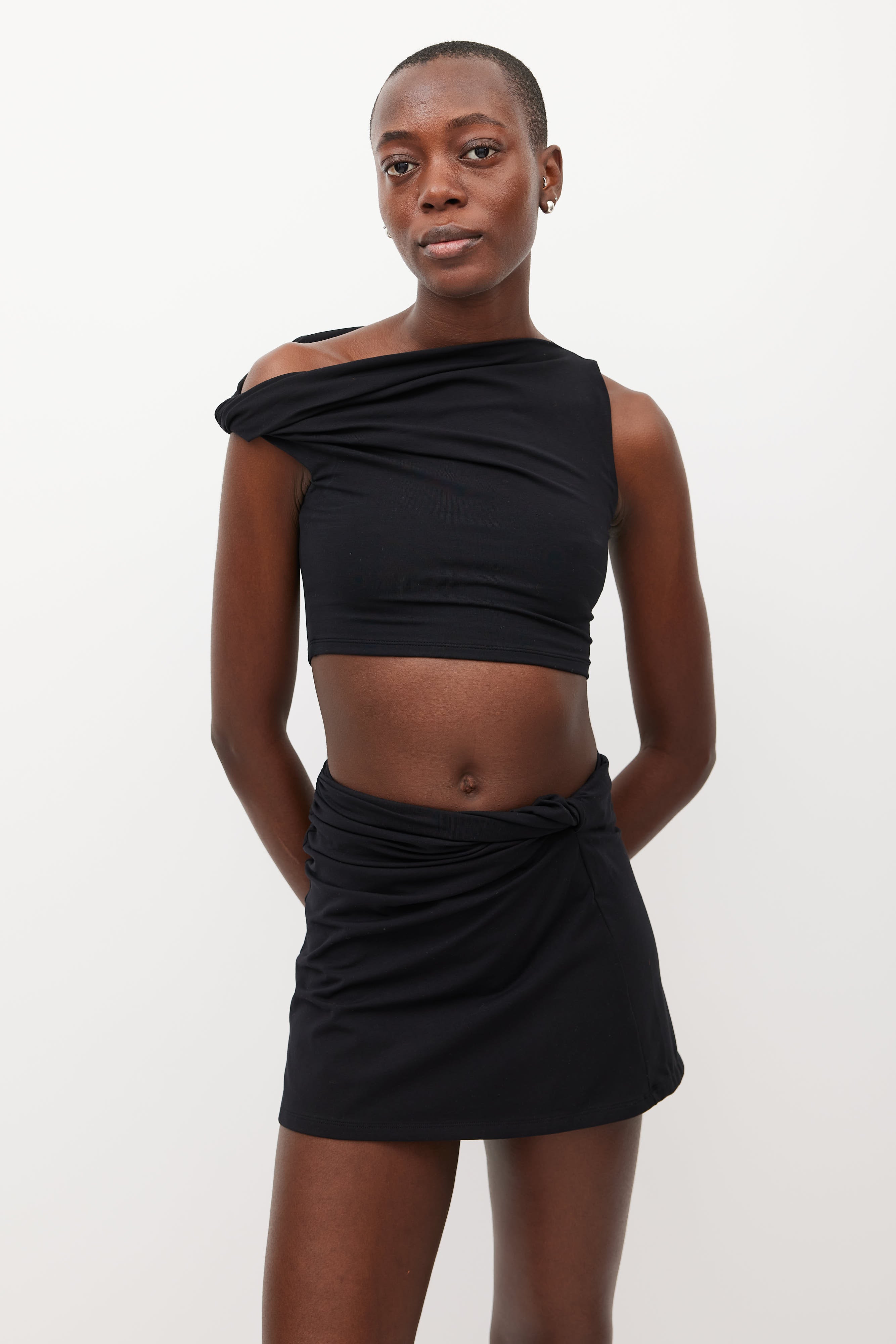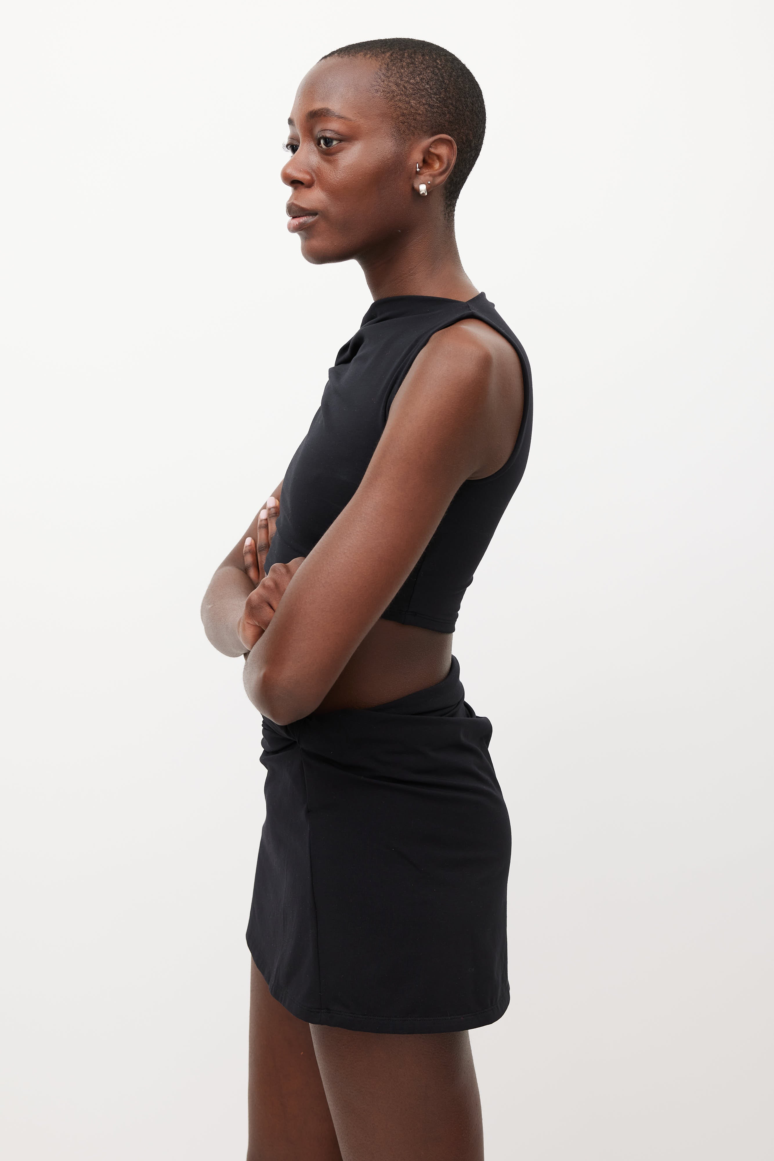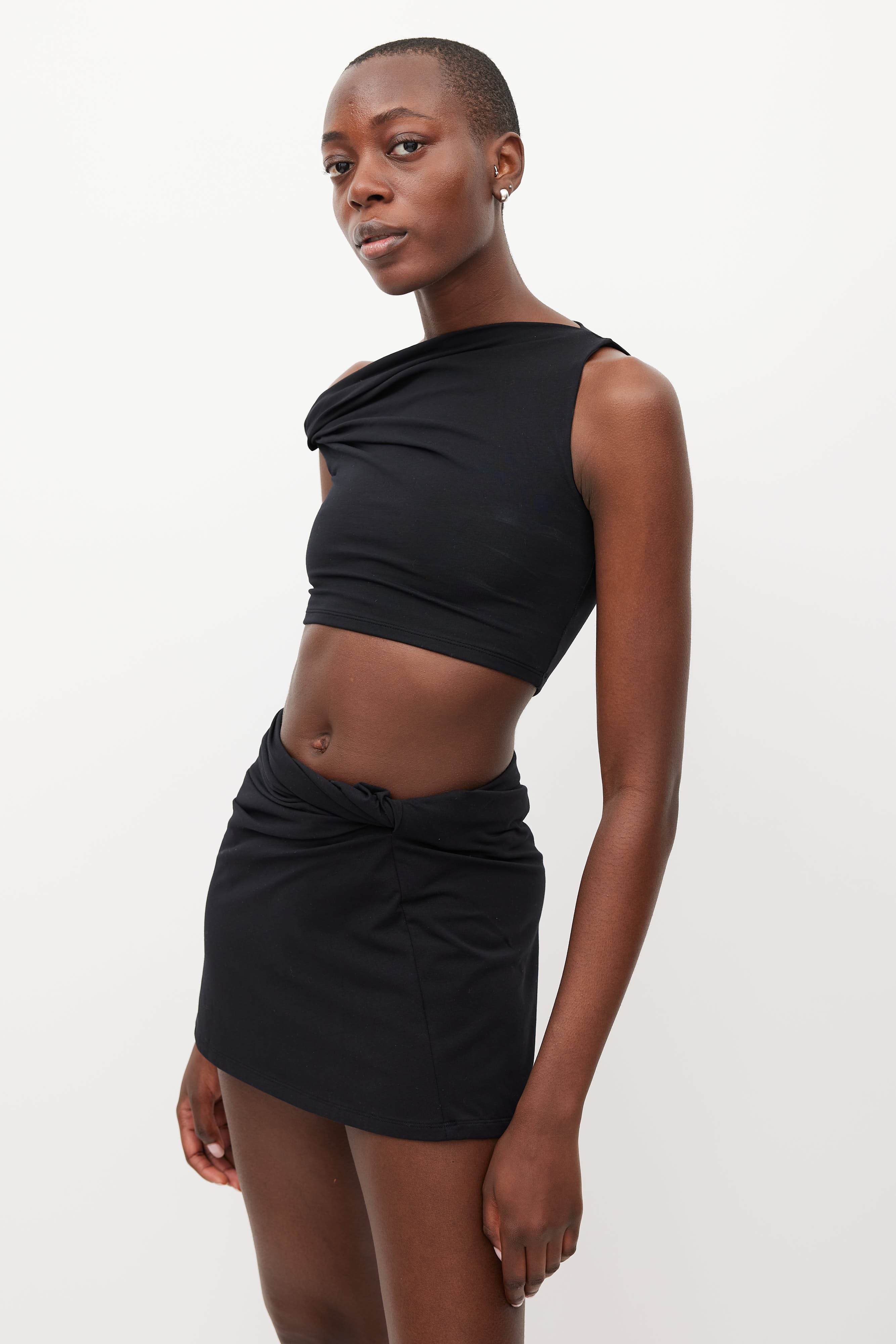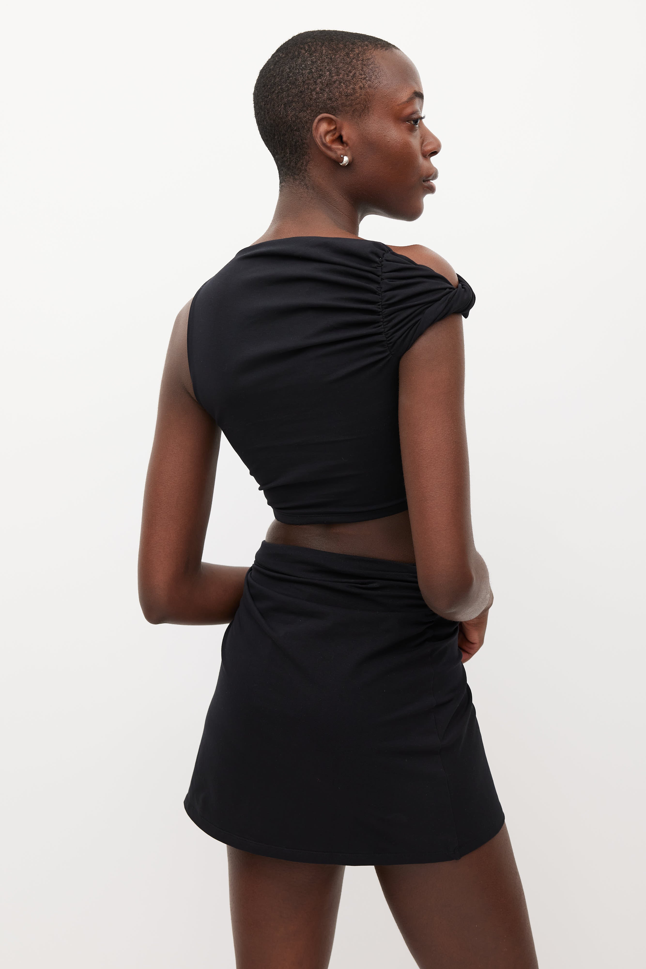 Beaufille black Indi top featuring a round neckline, gathered detailing, sleeveless styling, and cropped fit.