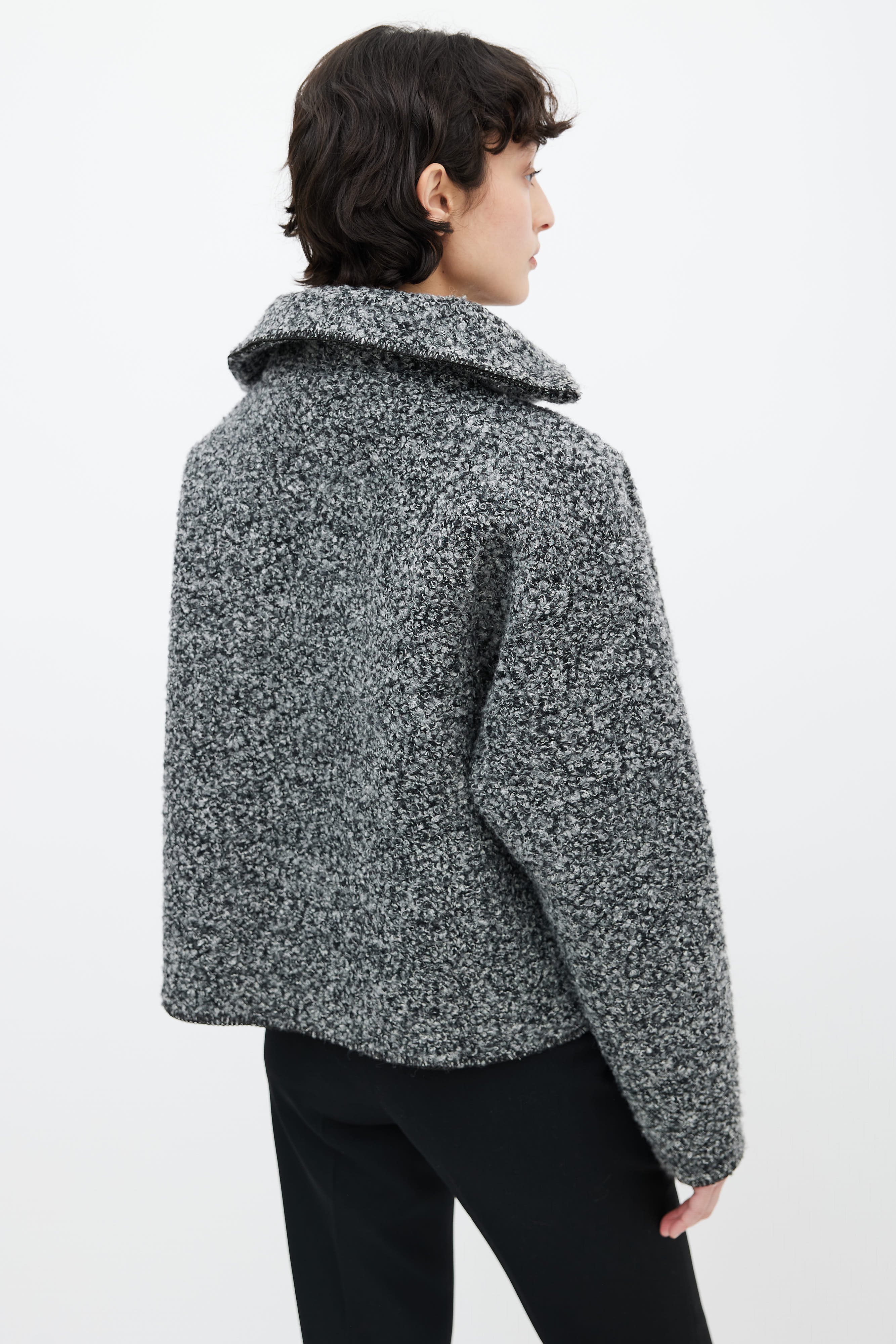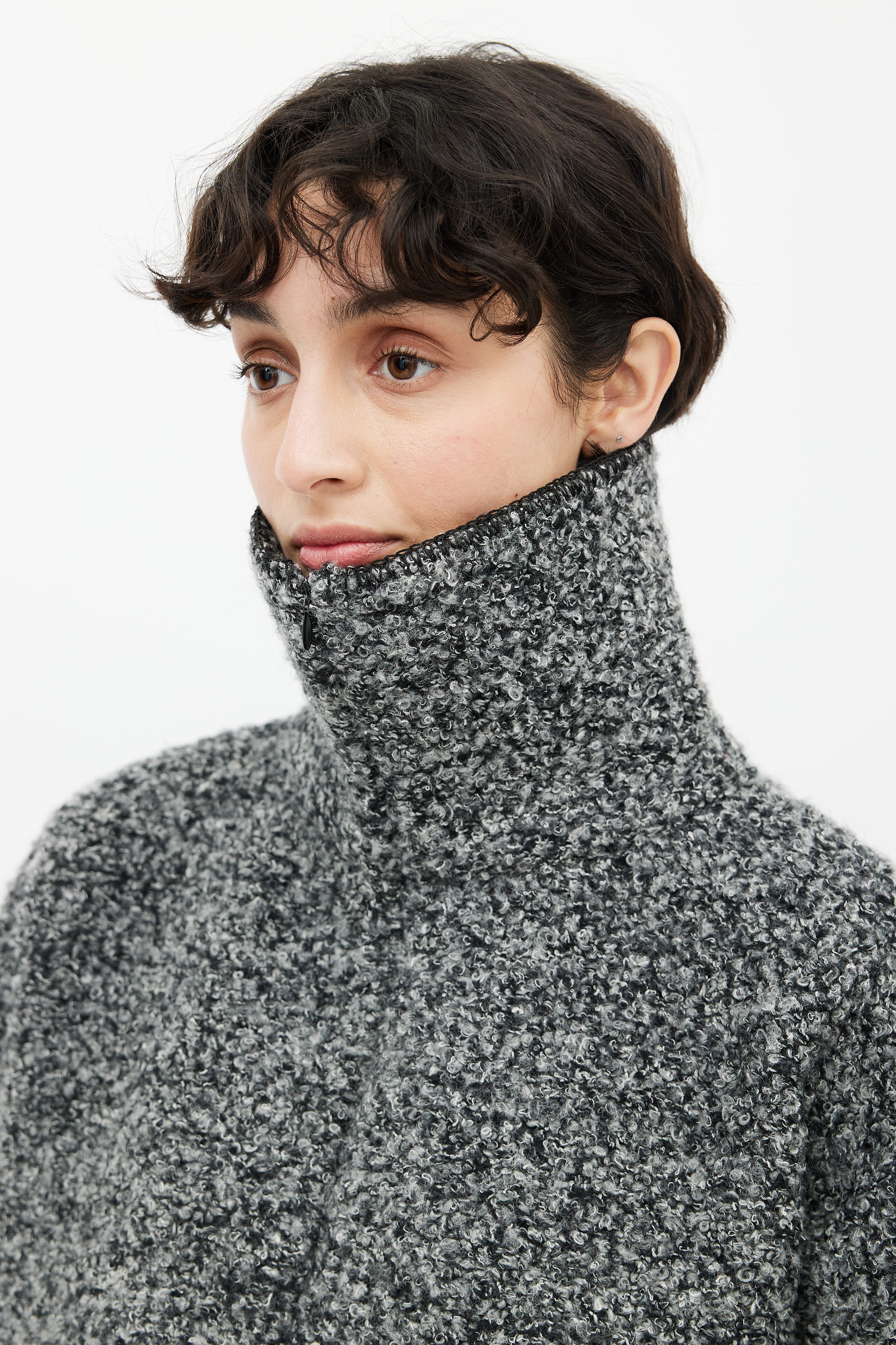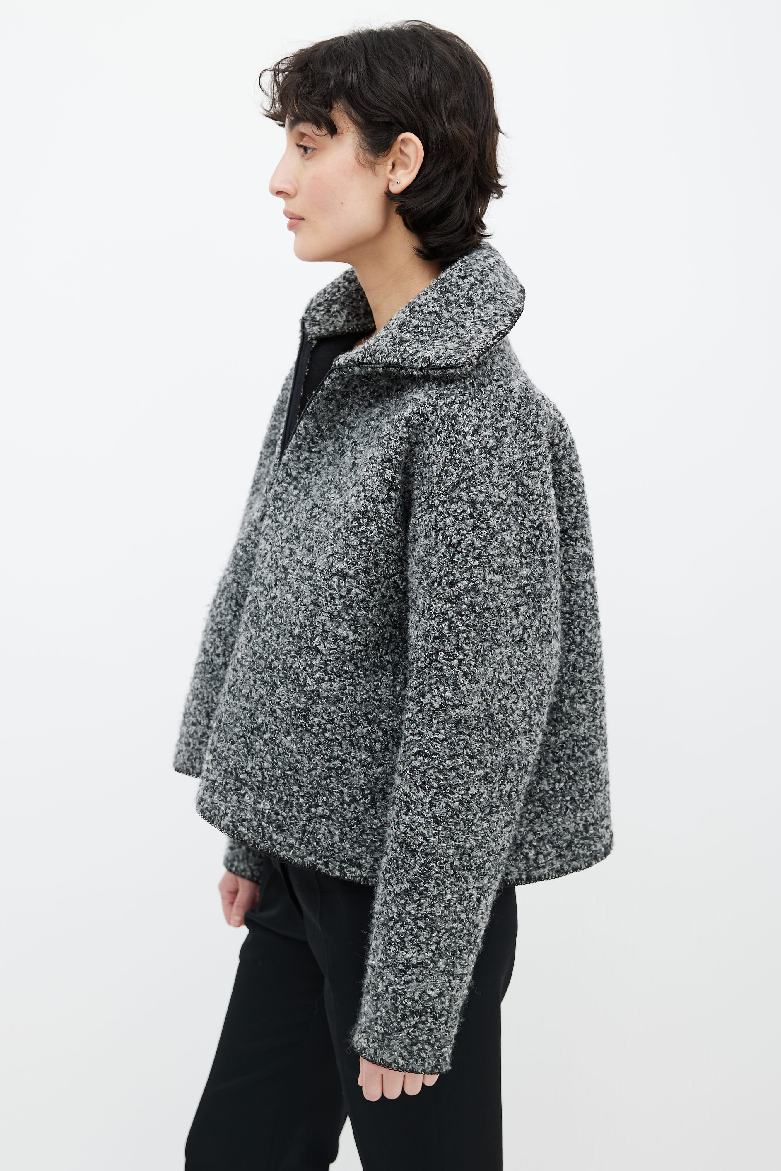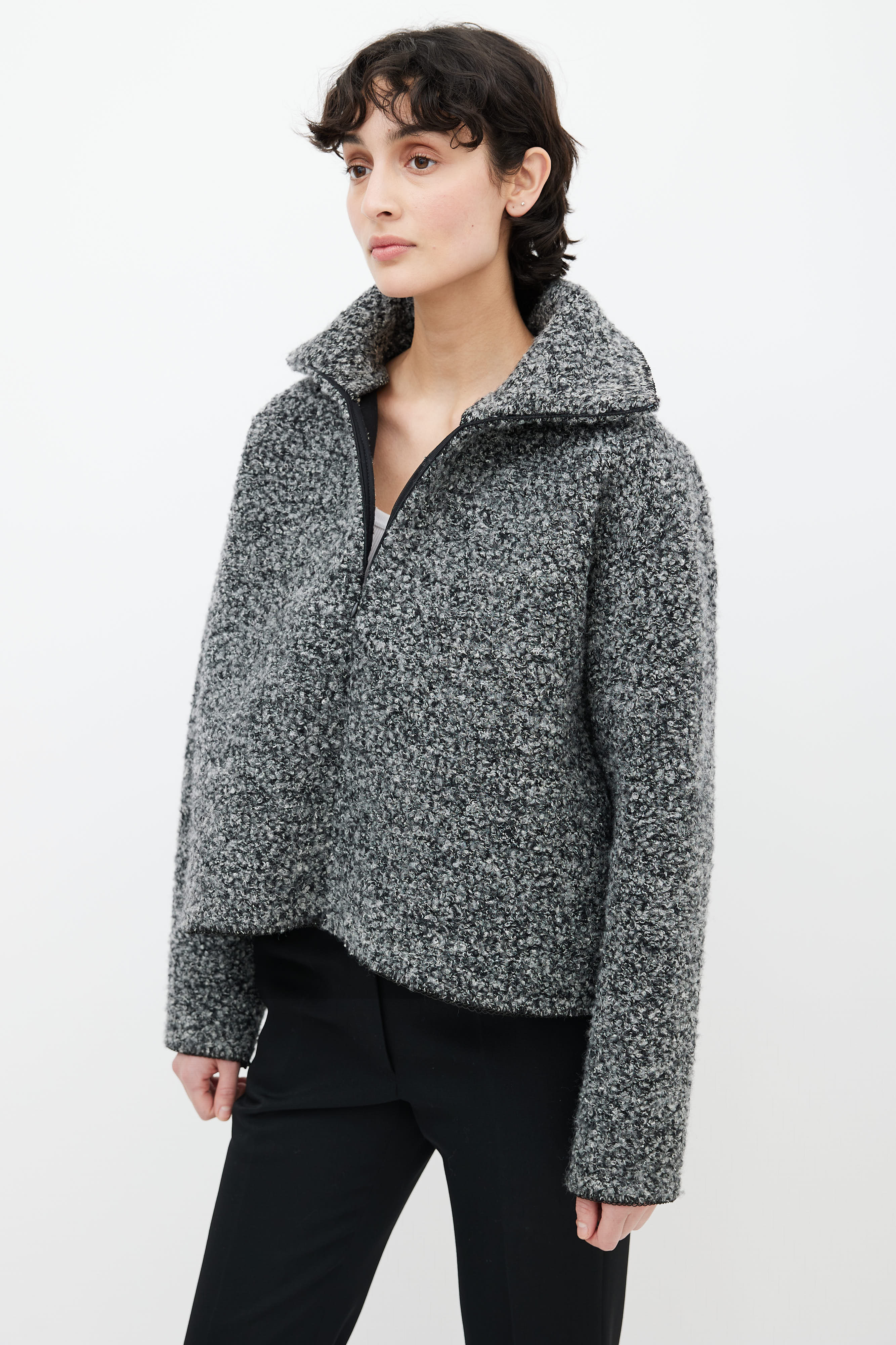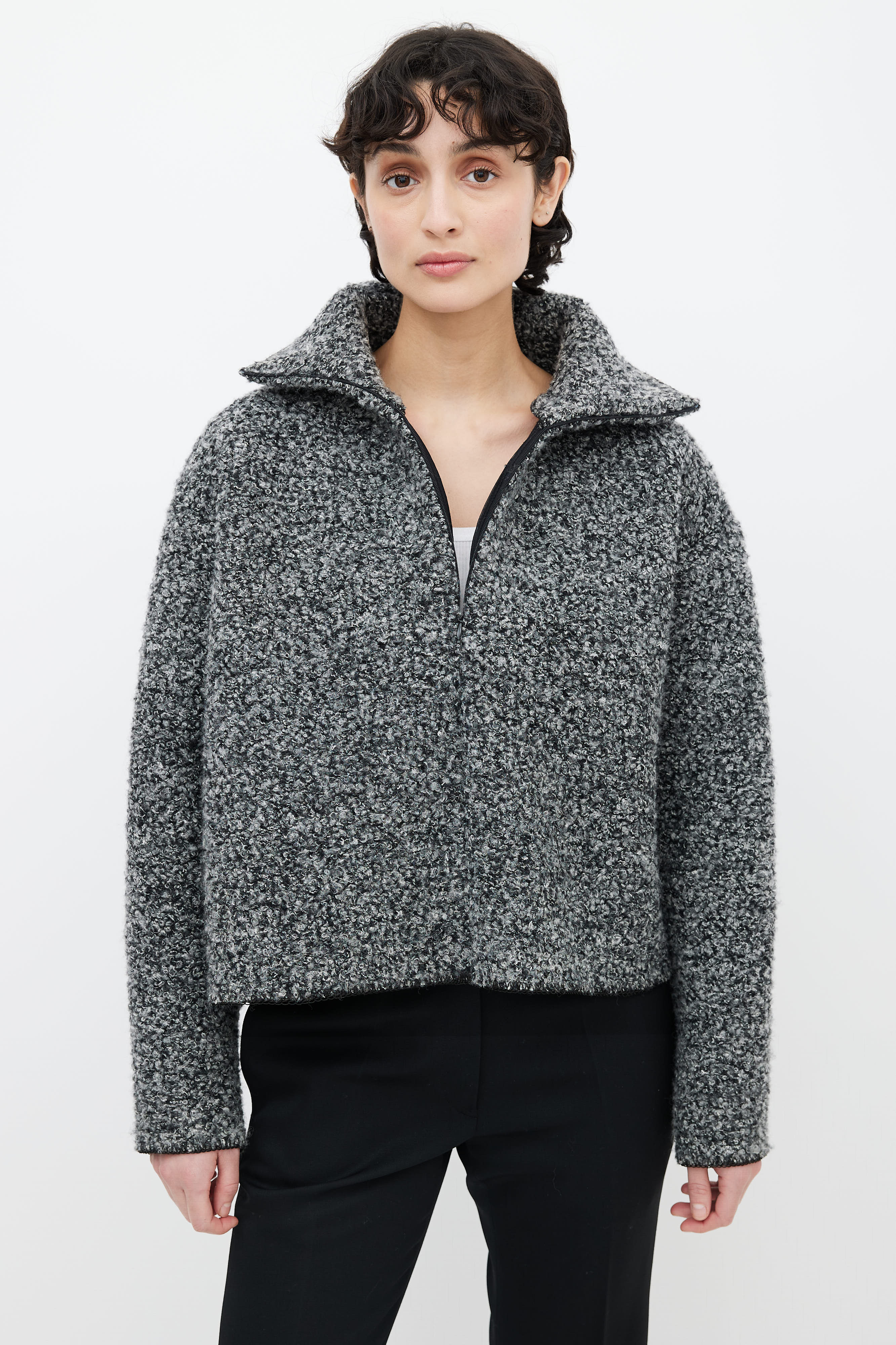 Pre-owned Beaufille sweater in grey featuring textured shag fabrication, funnel neck collar, half zip closure at front, and cropped length.