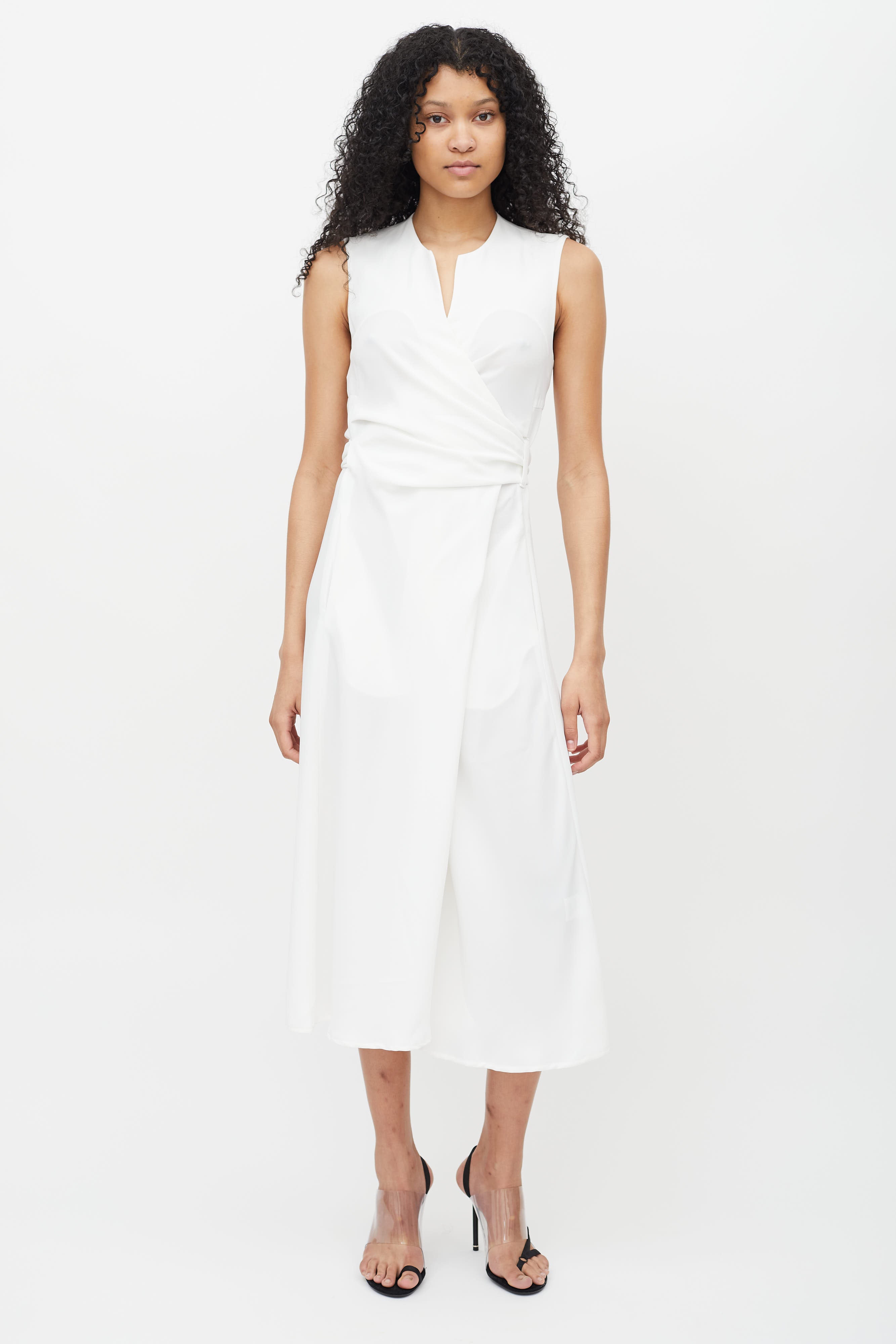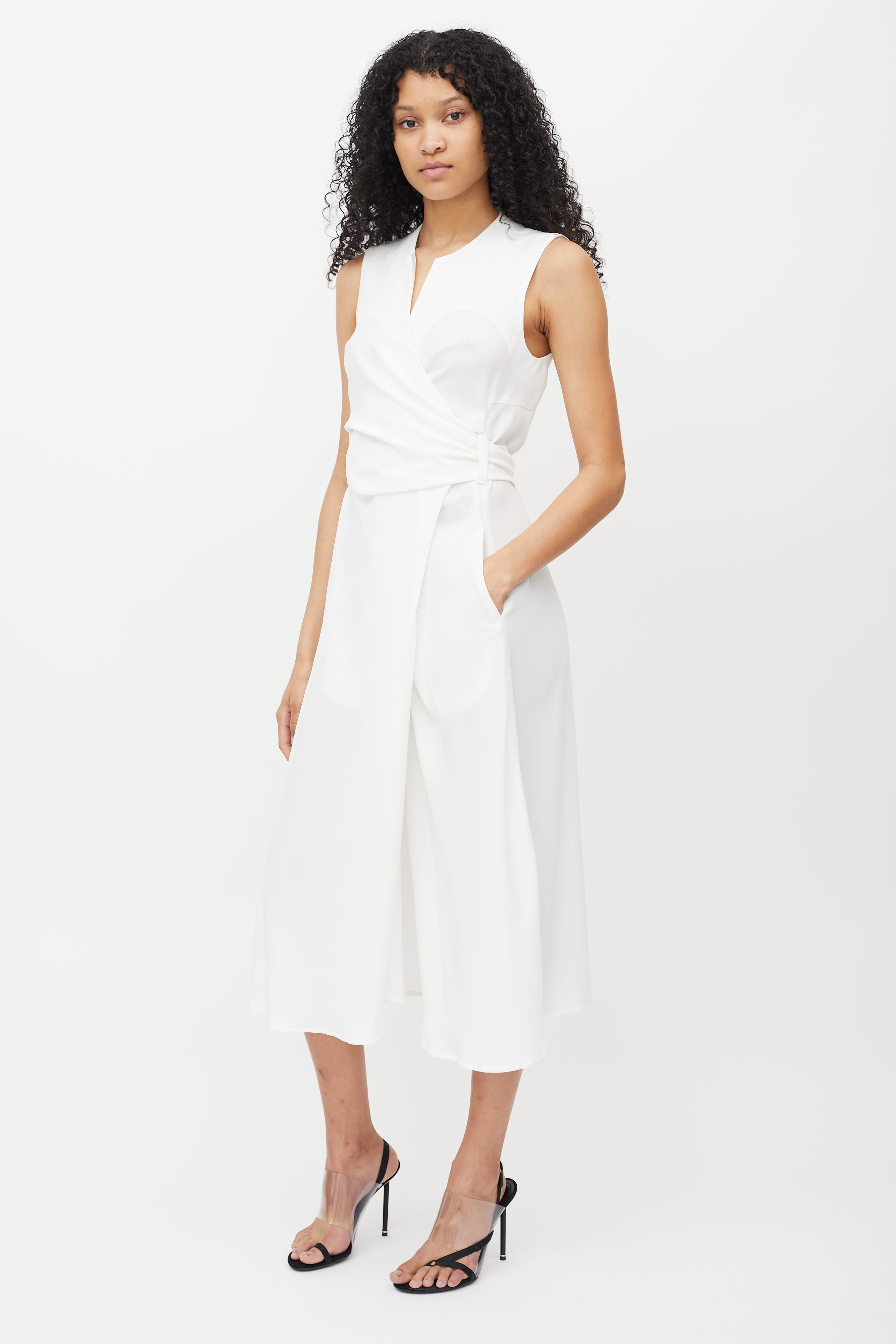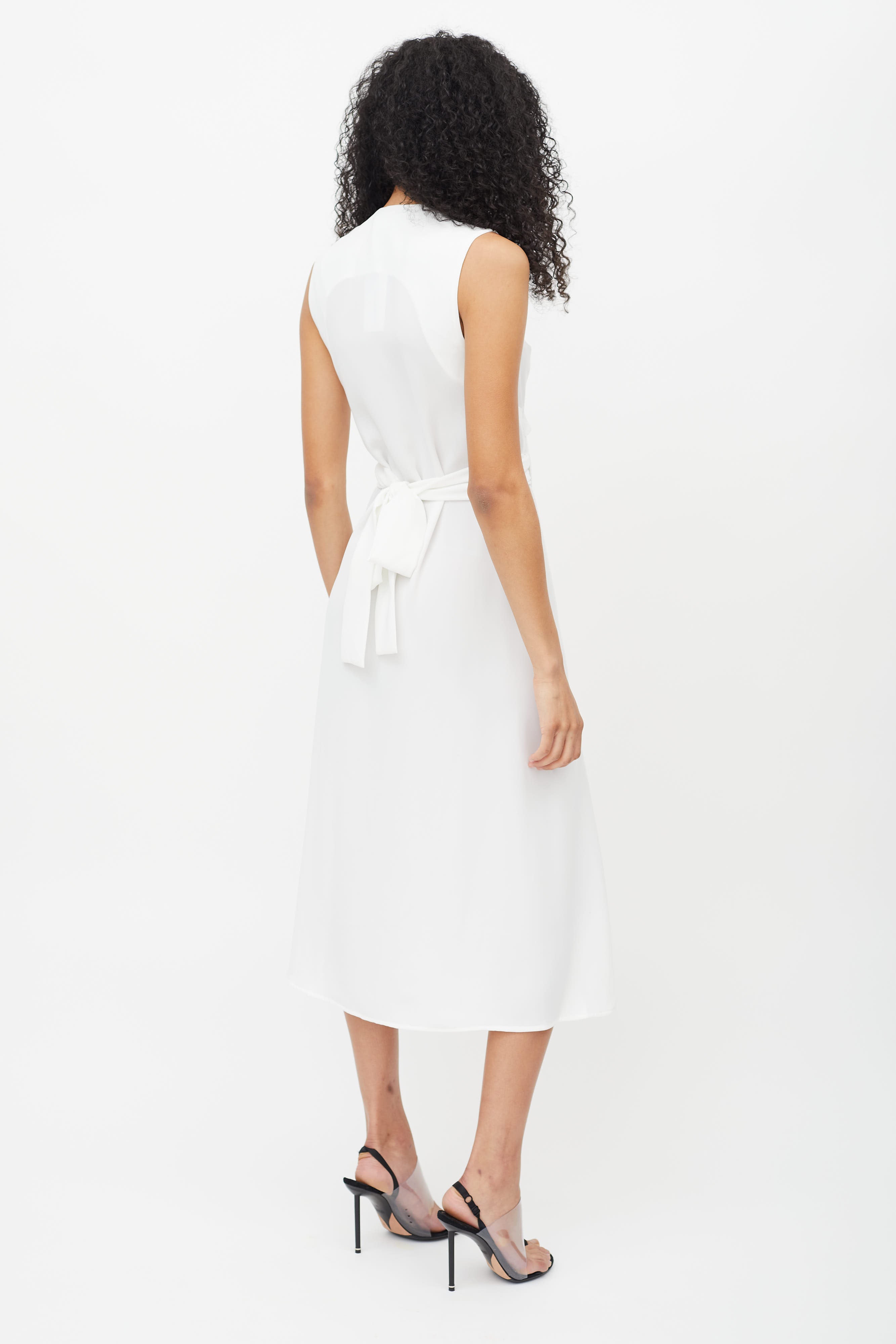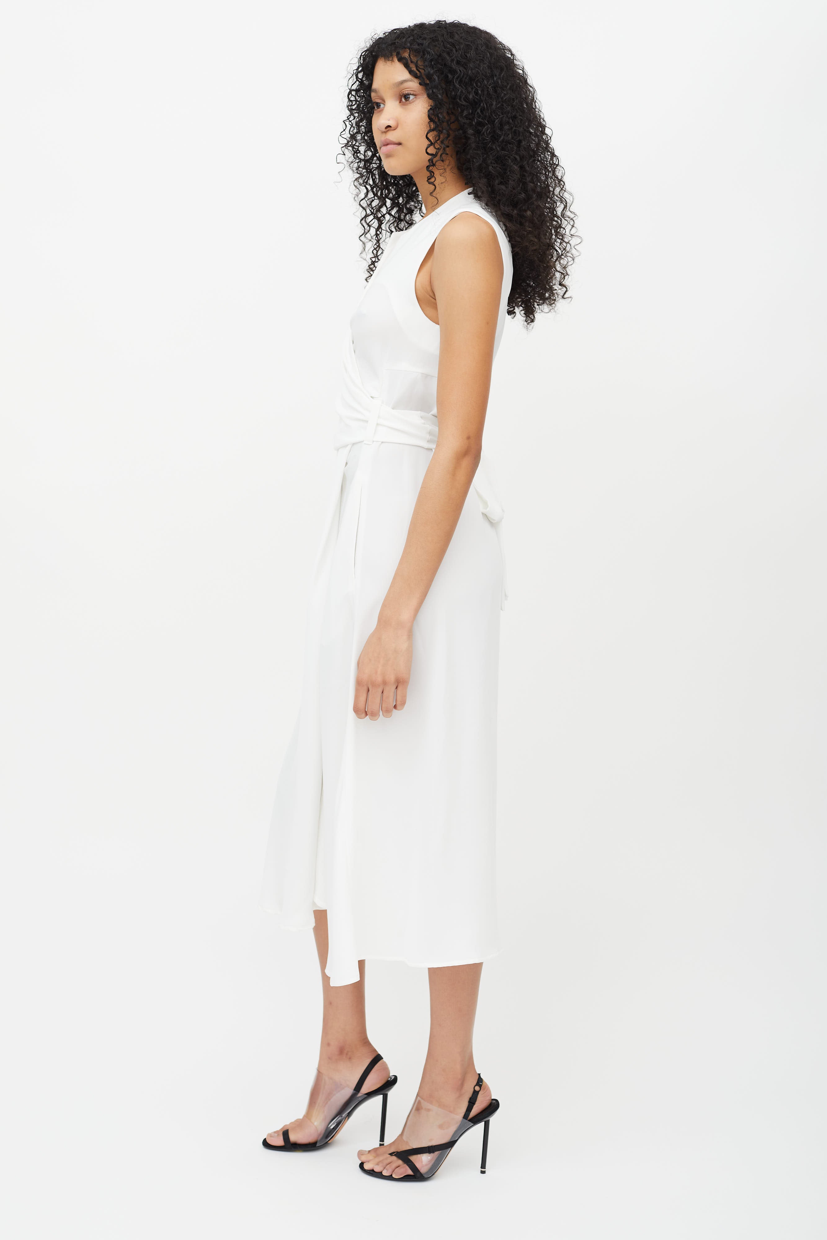Pre-owned Beaufille white Morisot dress featuring a crew neckline, belt loops at sides, open front and wrap tie closure at front. Model is wearing size US 4.
