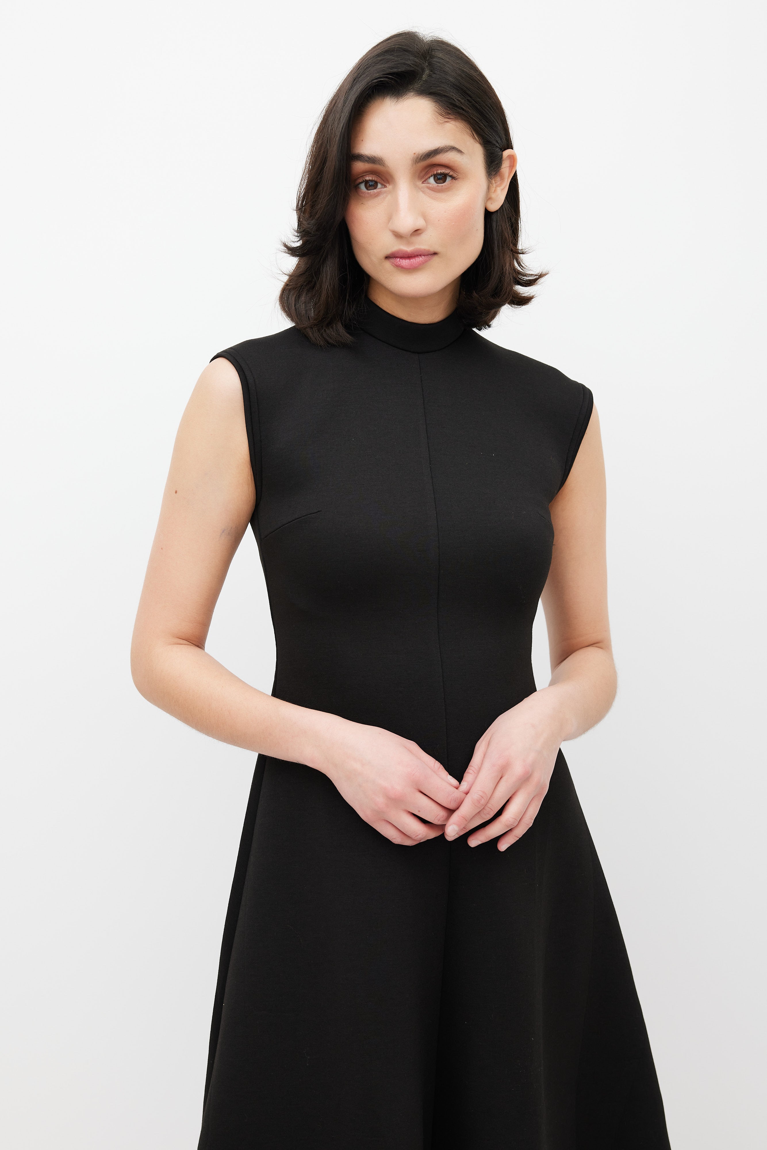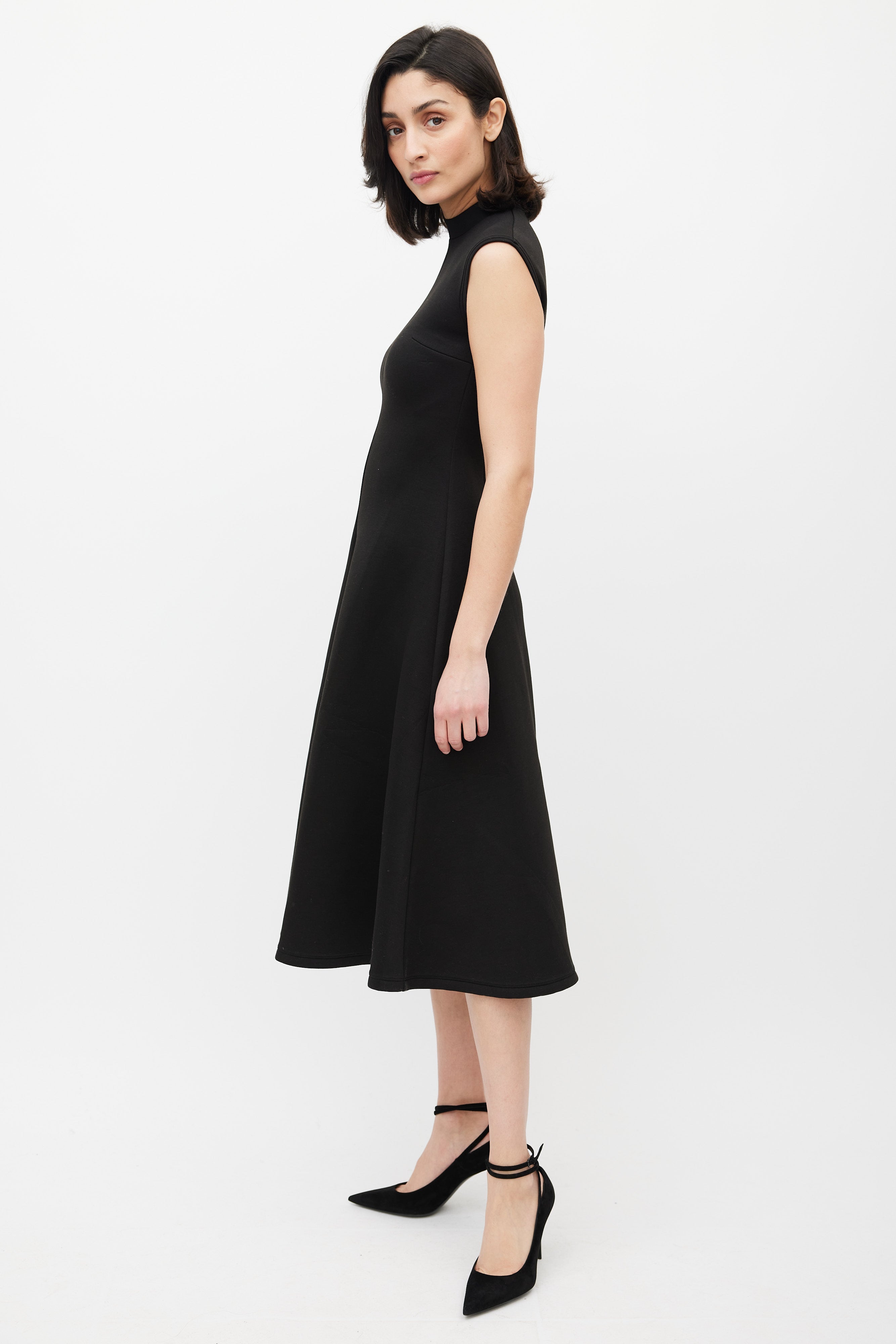 Beaufille black neoprene Getty dress featuring mock collar, A-line skirt, and concealed zip closure at back.