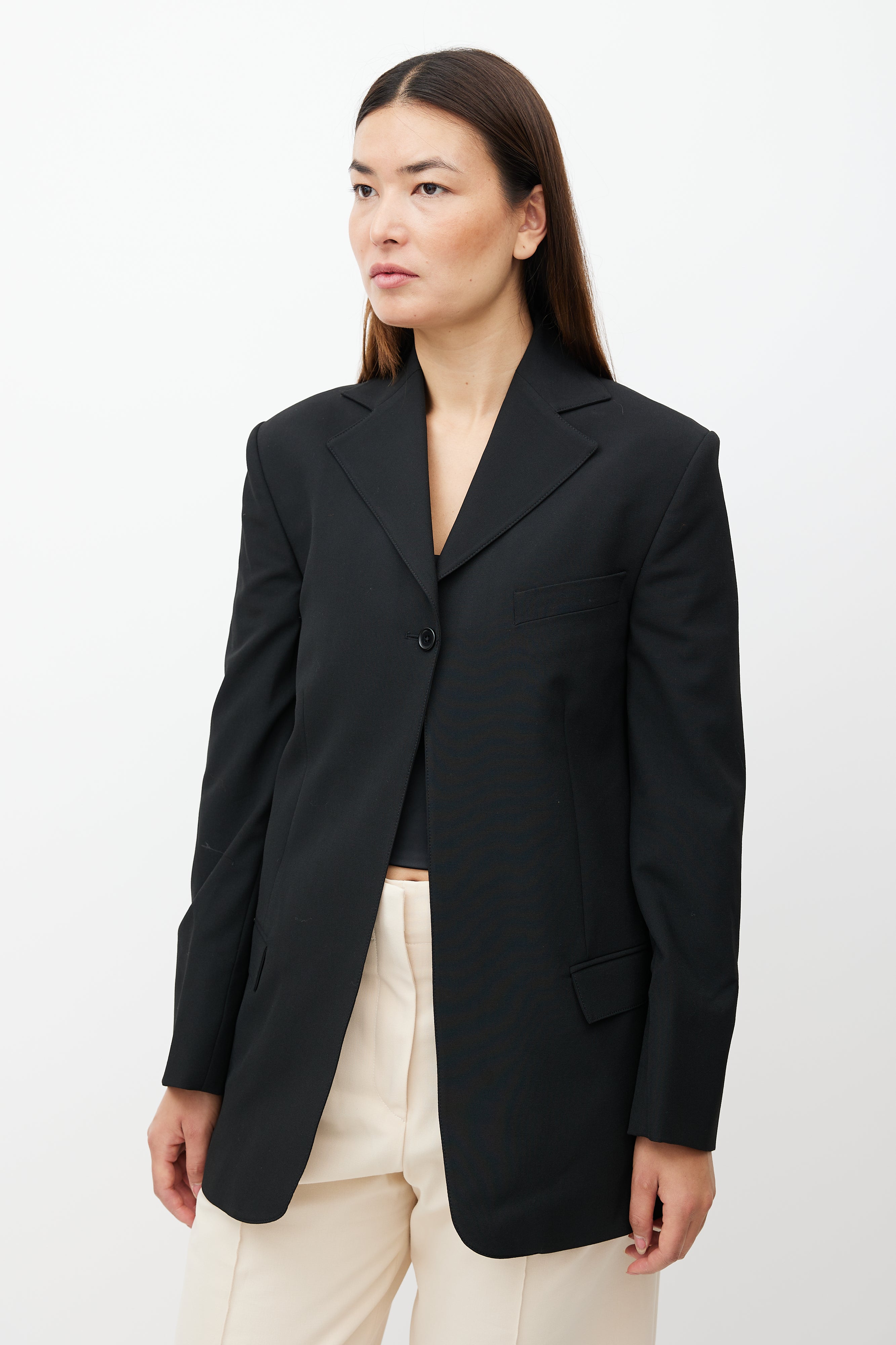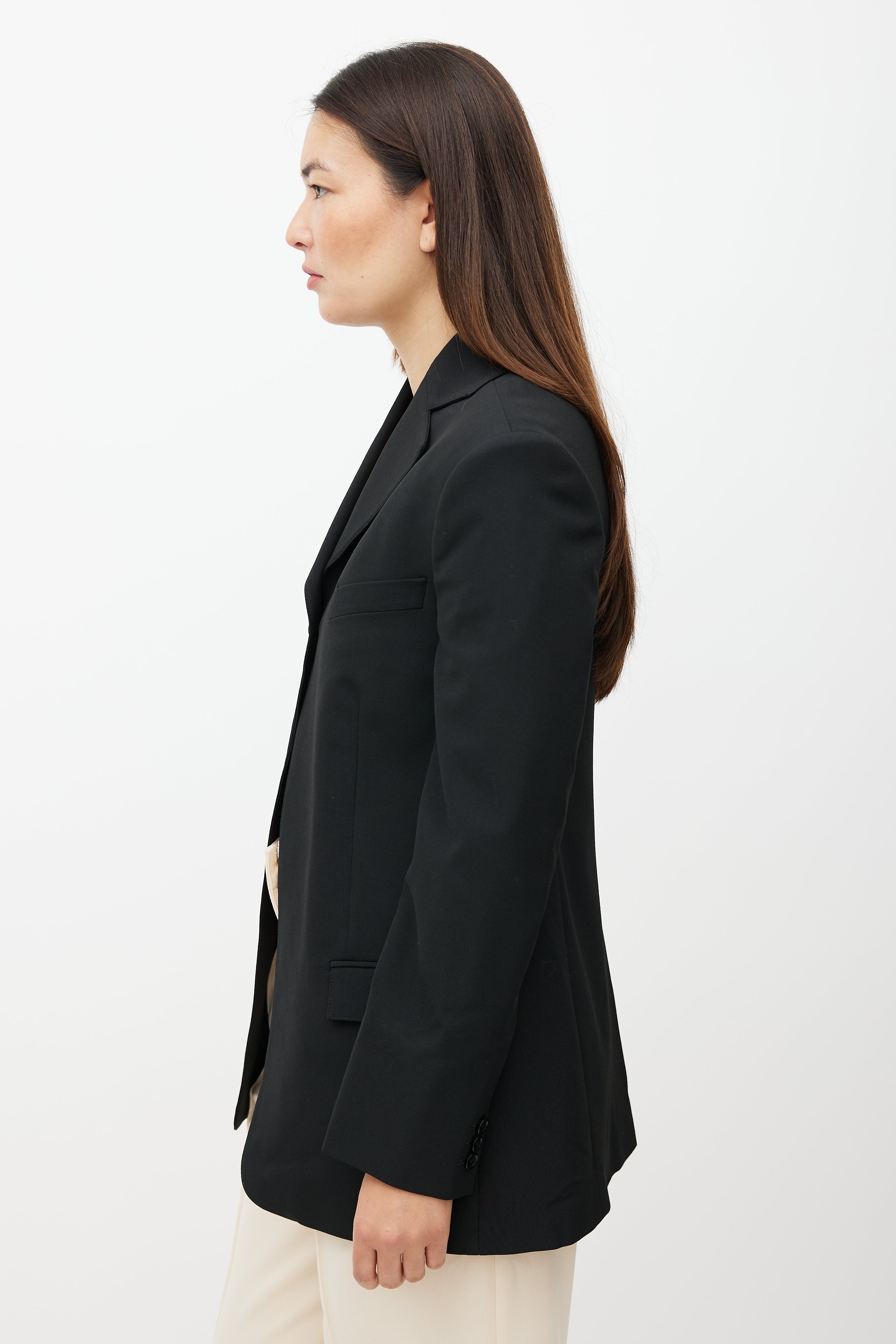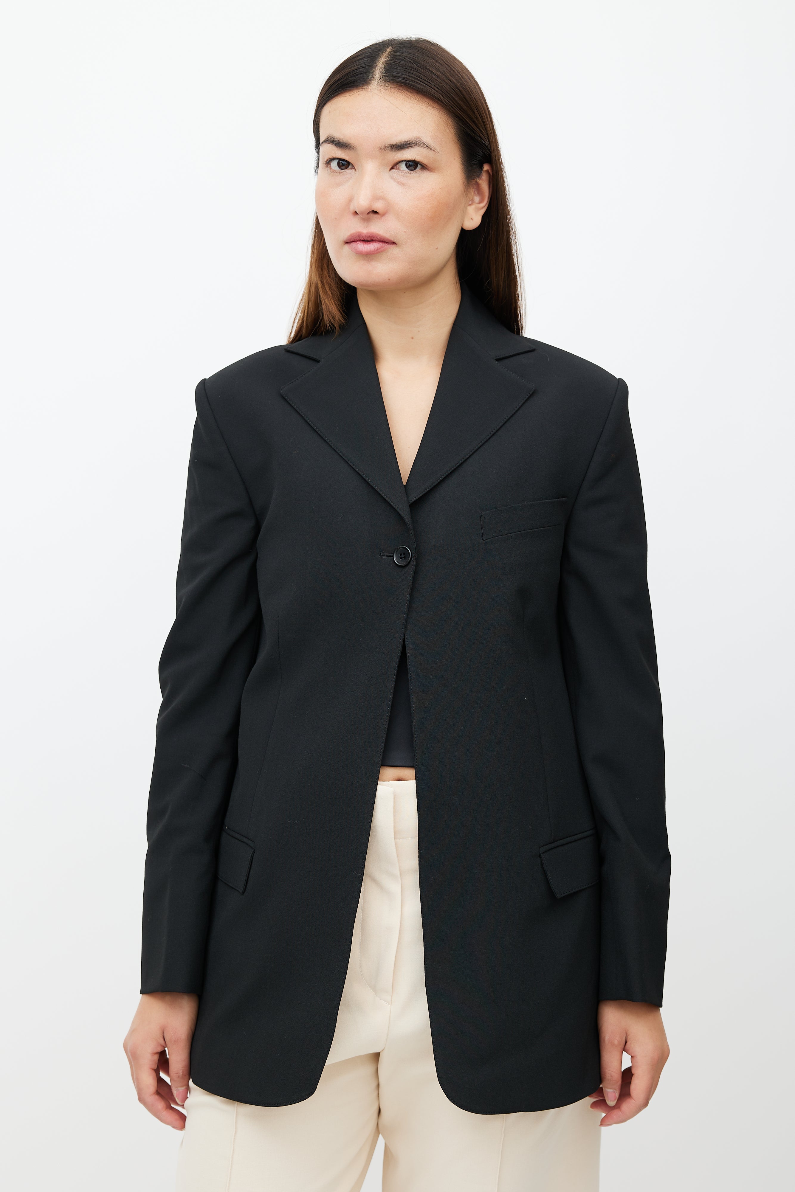 Beaufille black Rowe blazer featuring single button closure at top, notch lapel, one welt pocket at chest, two flap pockets at hips, buttoned cuffs, and back vent. Lined.