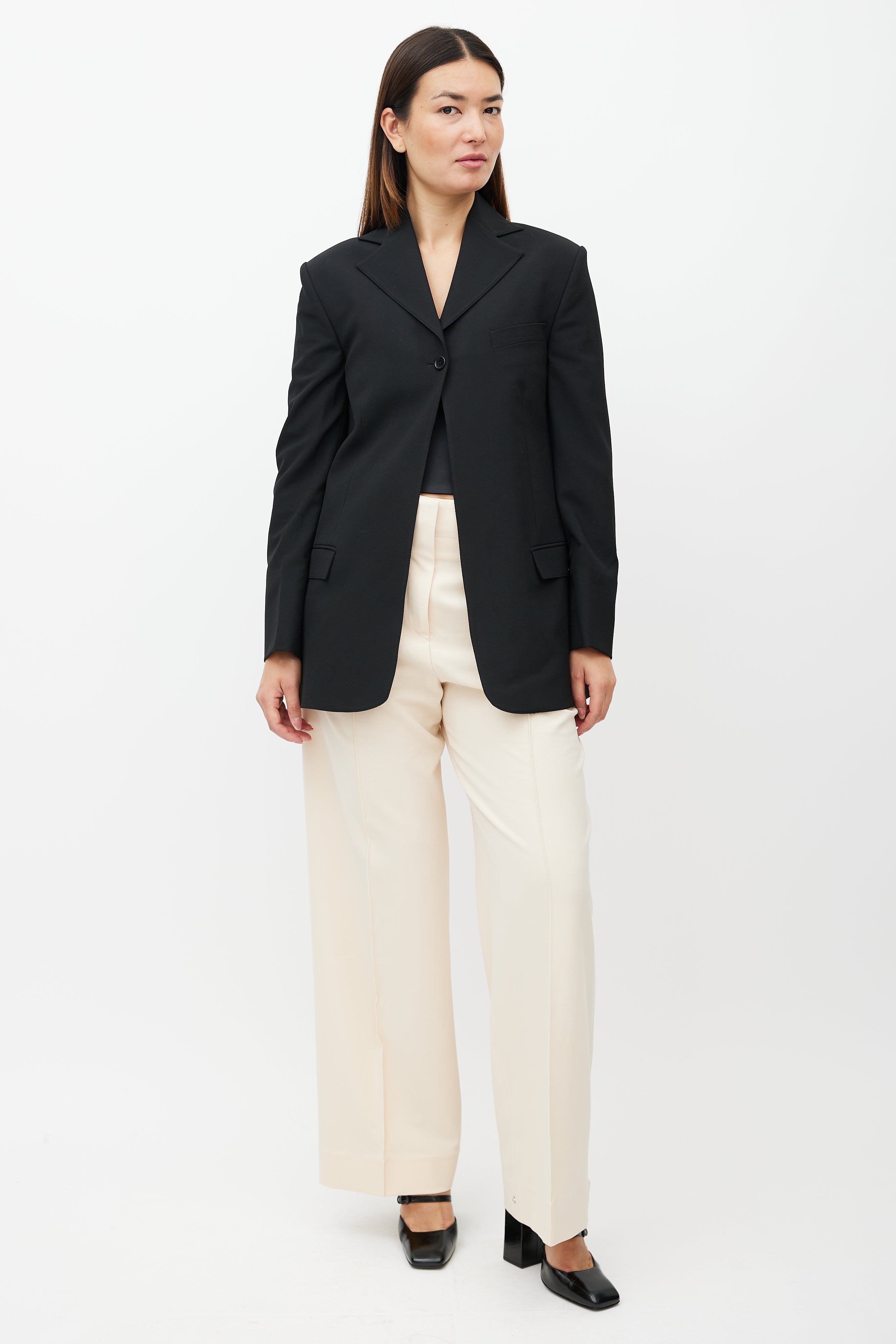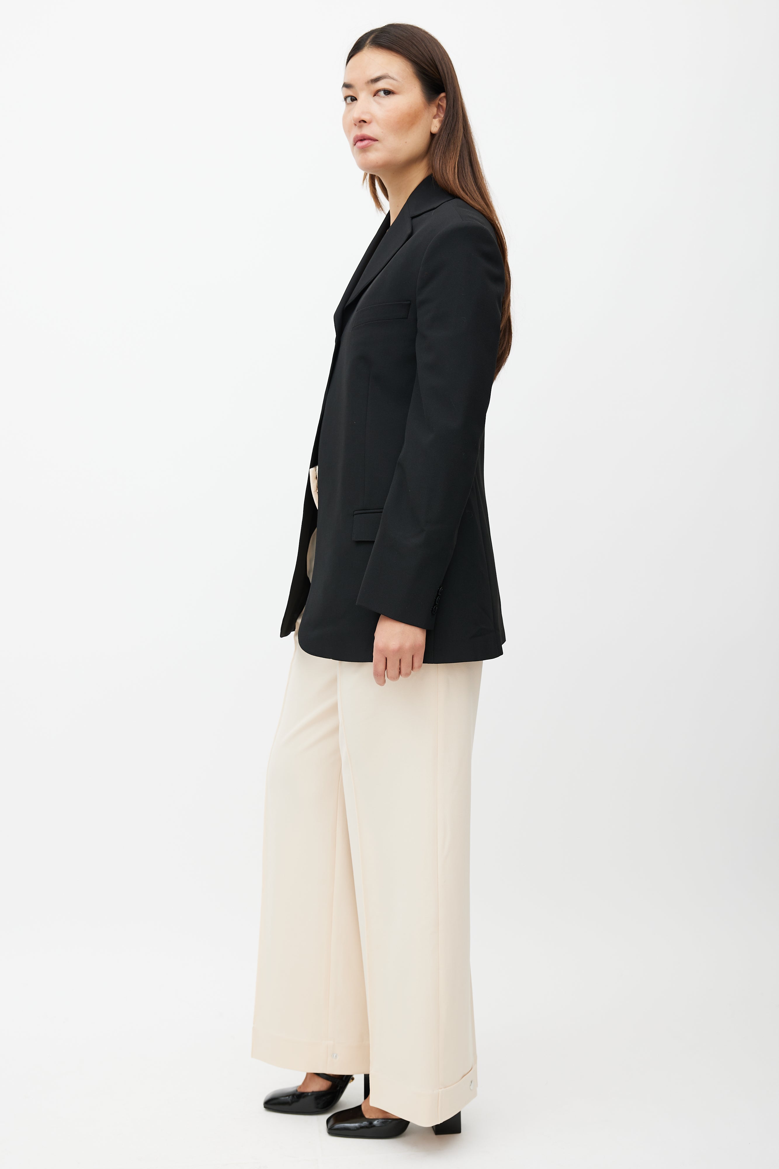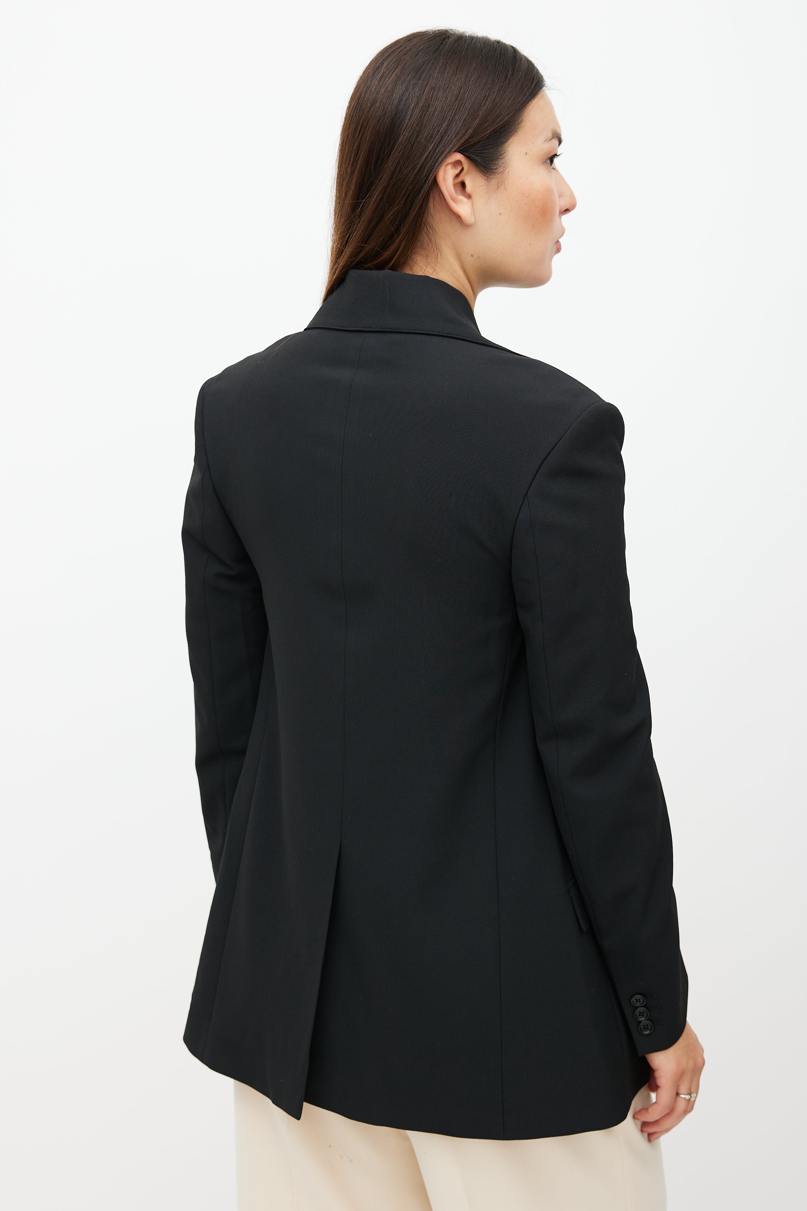 Beaufille black Rowe blazer featuring single button closure at top, notch lapel, one welt pocket at chest, two flap pockets at hips, buttoned cuffs, and back vent. Lined.