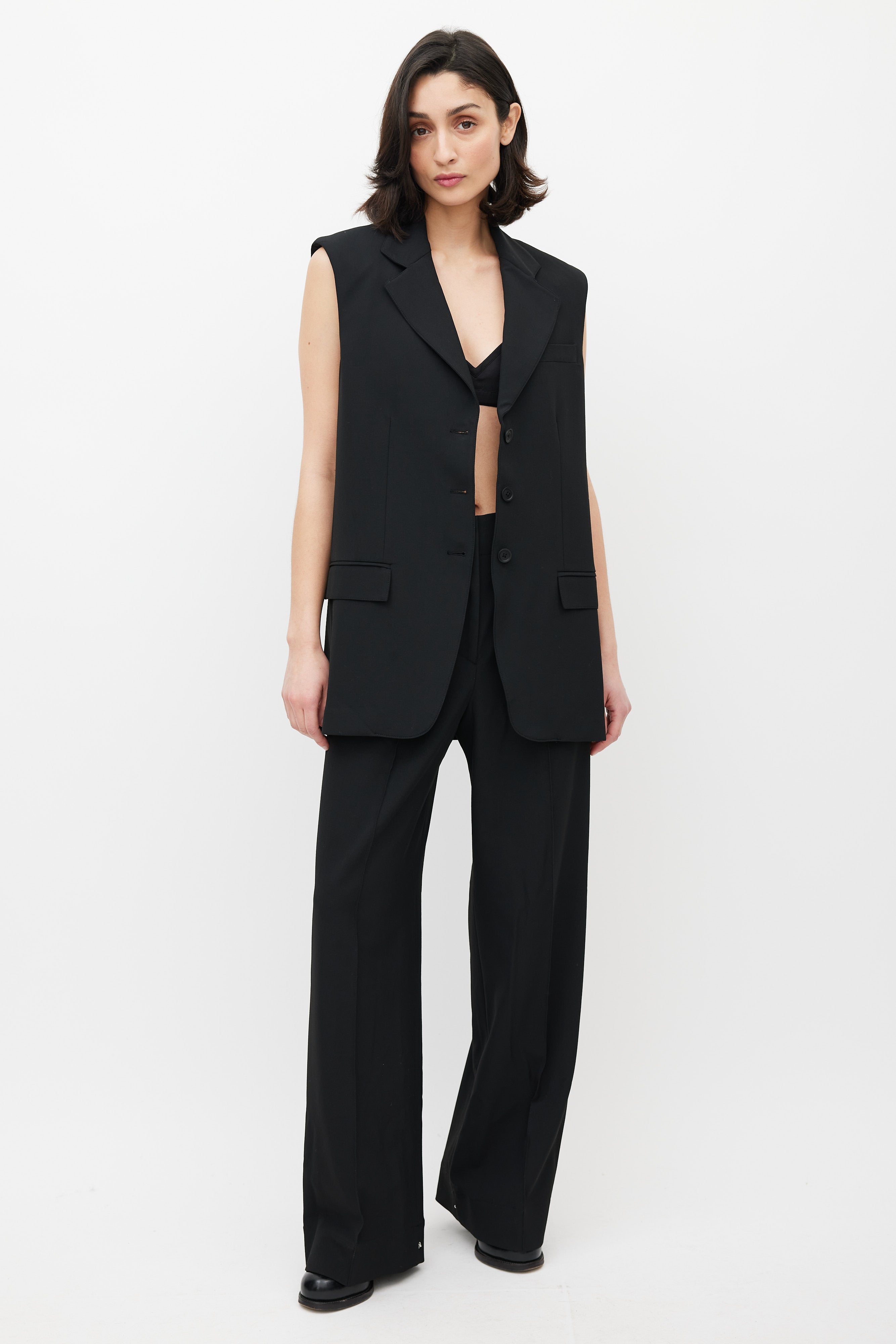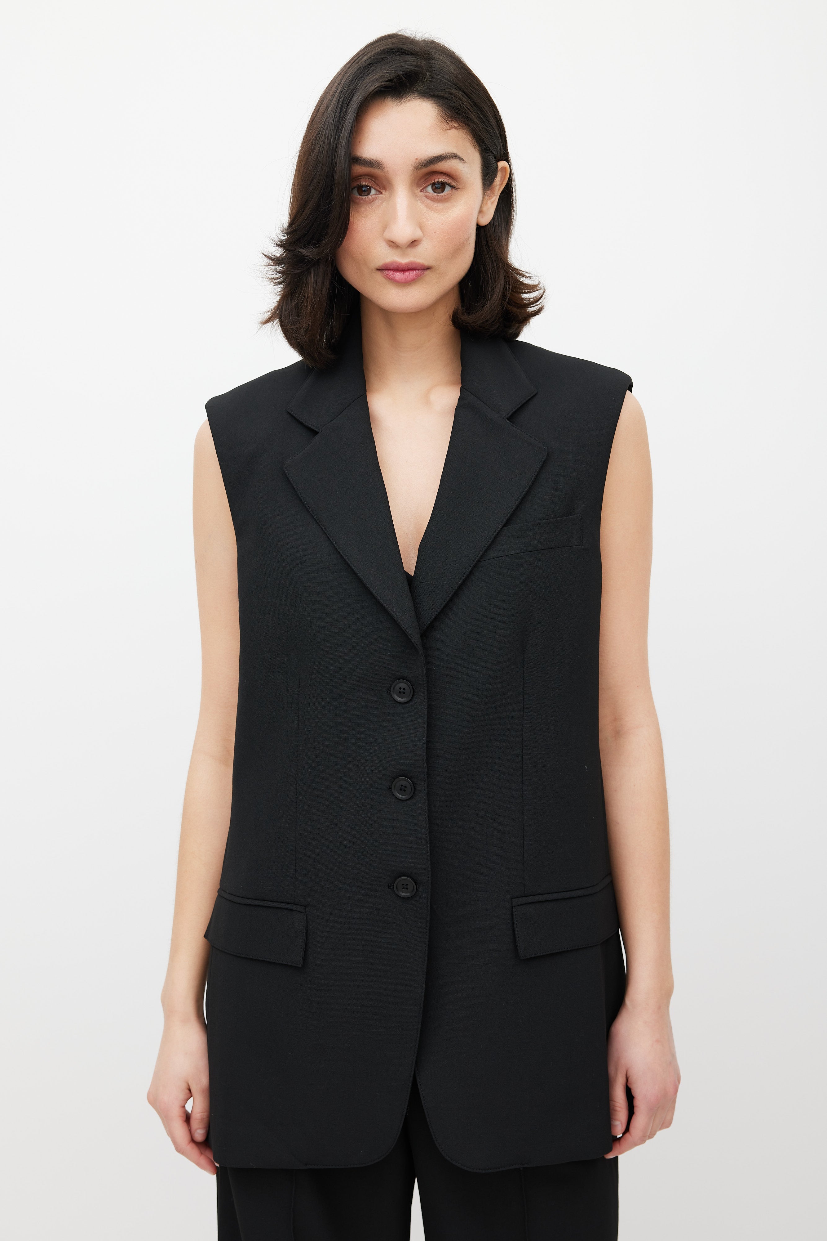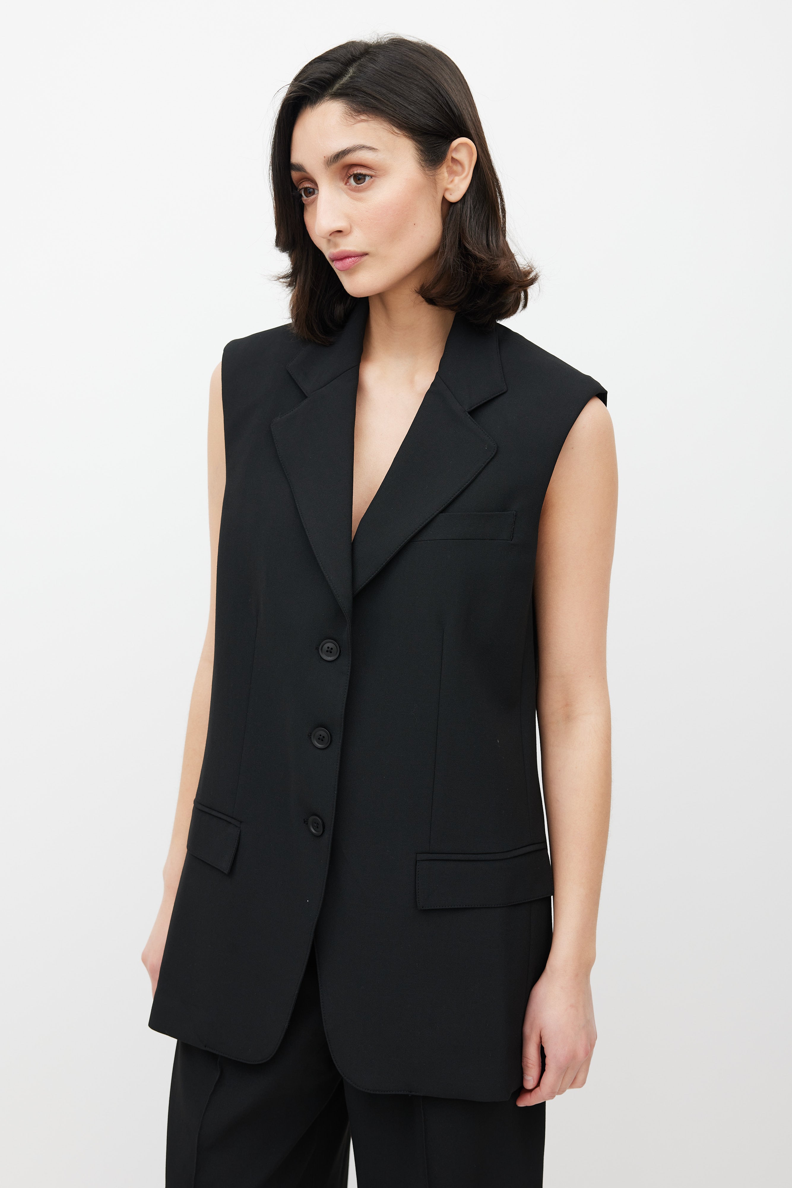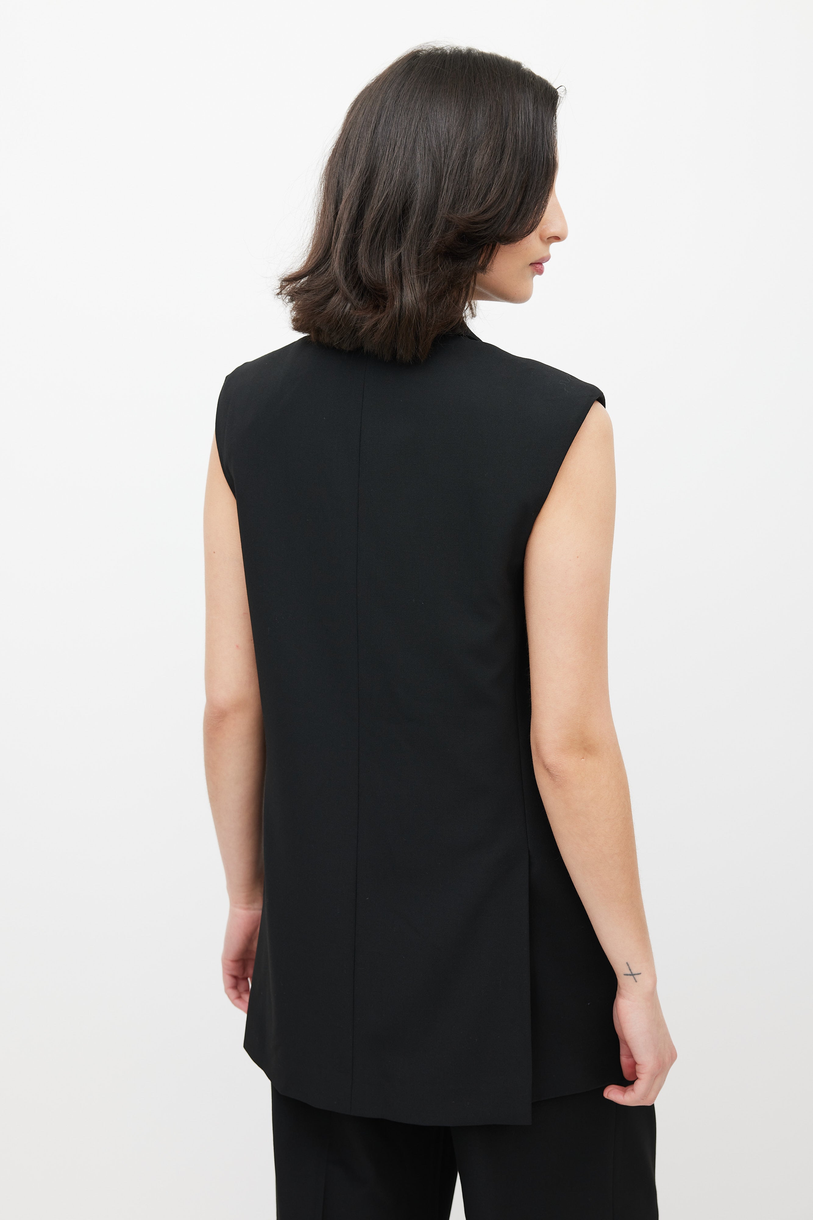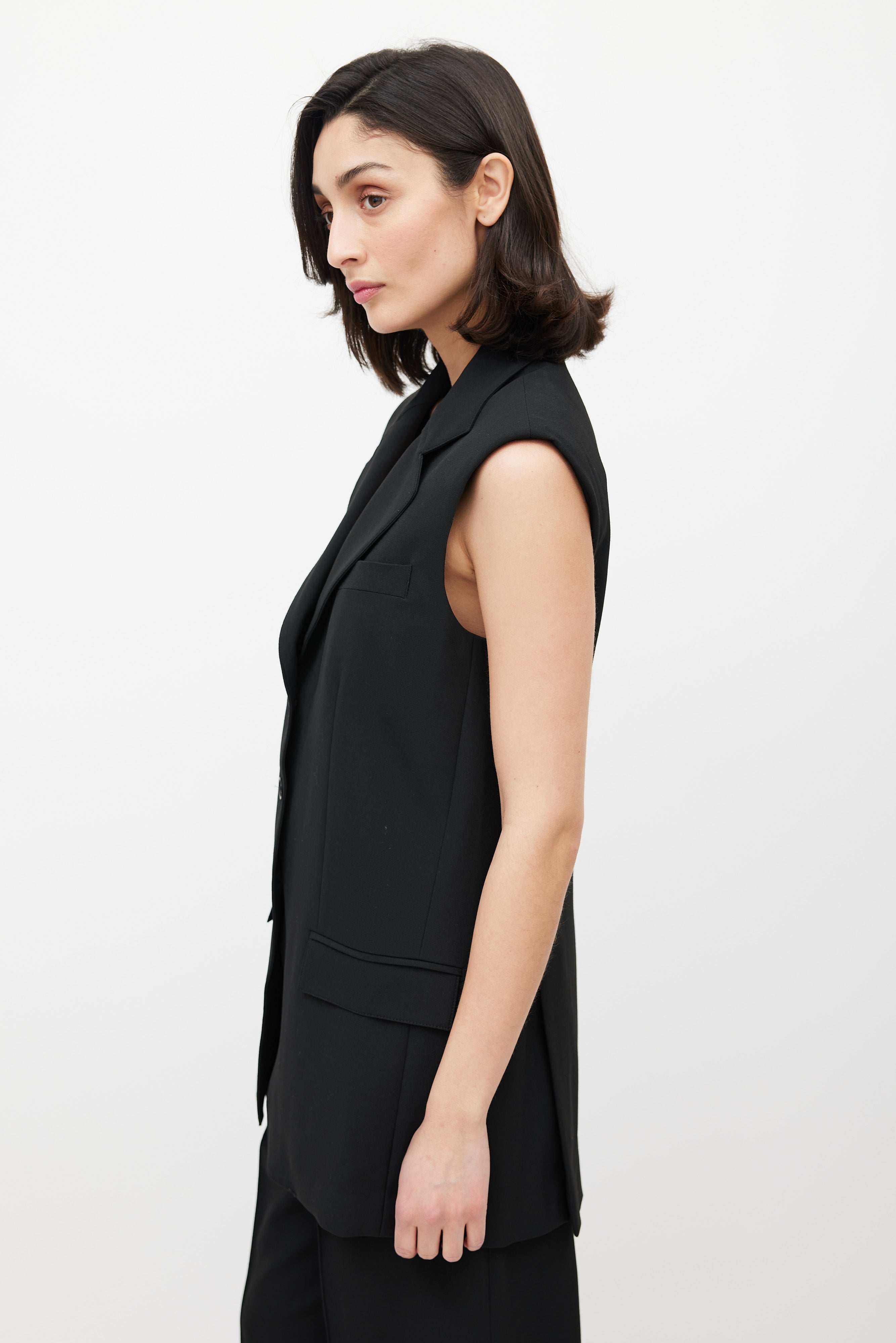 Pre-owned Beaufille black Saville blazer vest featuring notch lapel, button up front, one welt pocket at chest, two flap pockets at hips, and back vents. Lined.