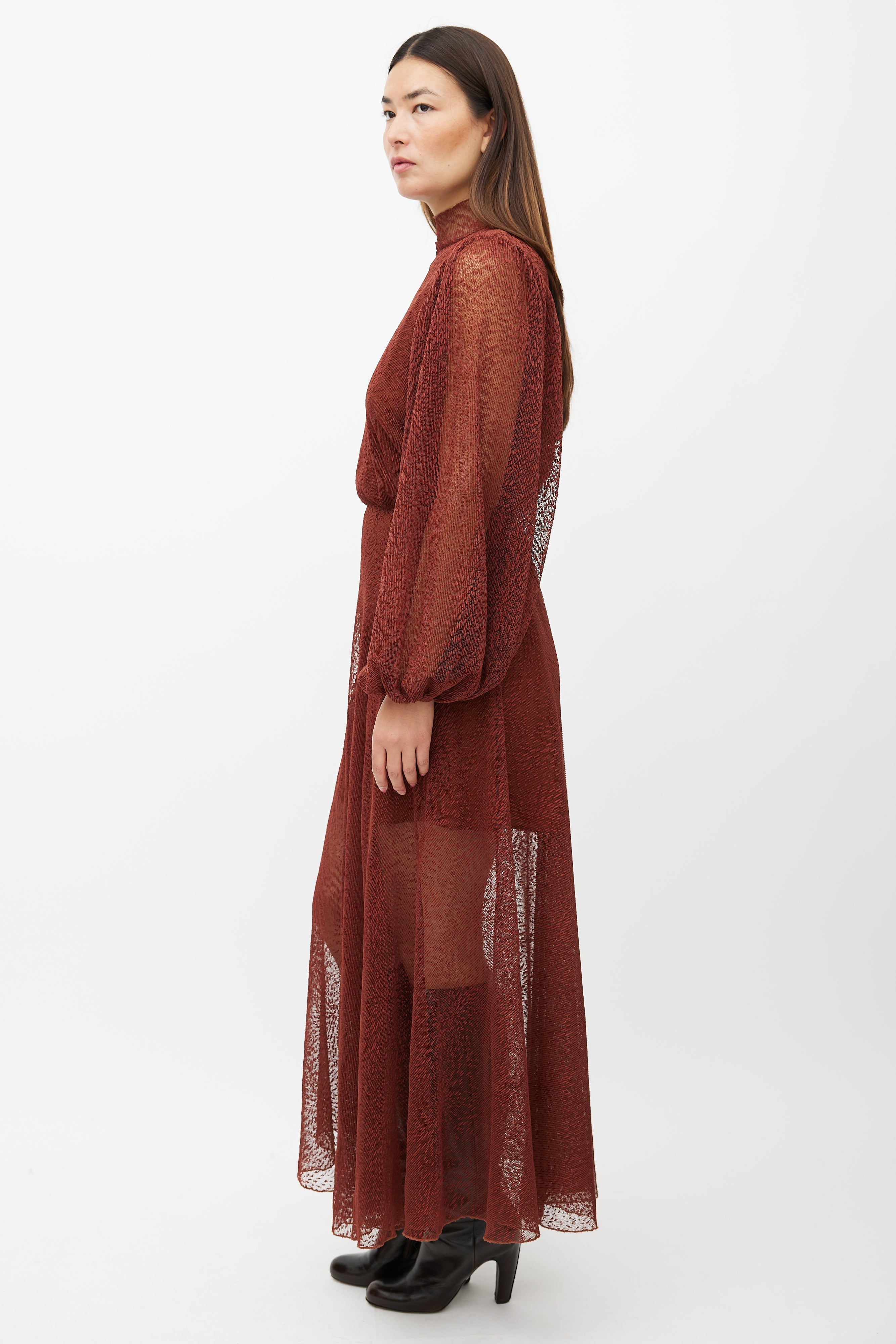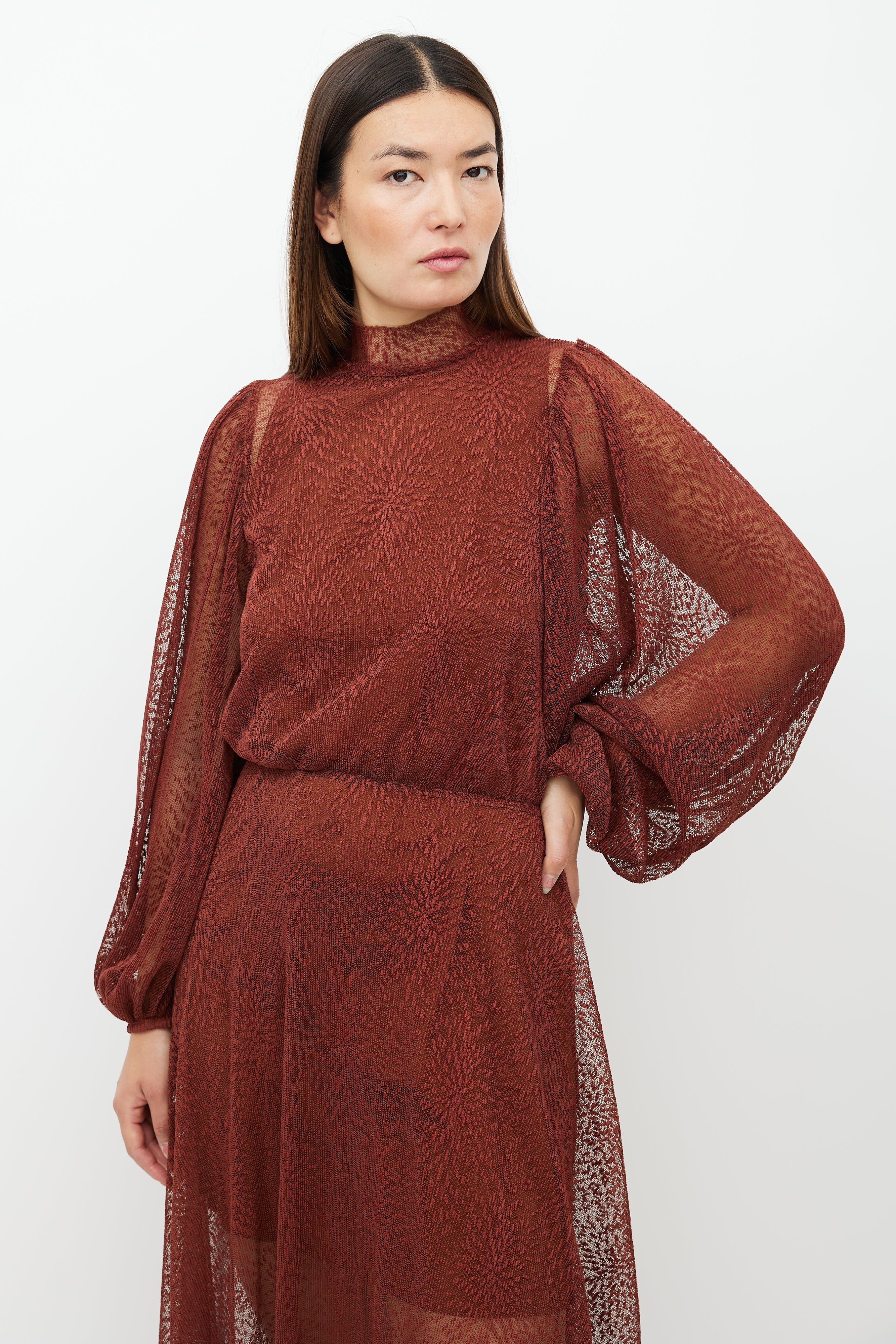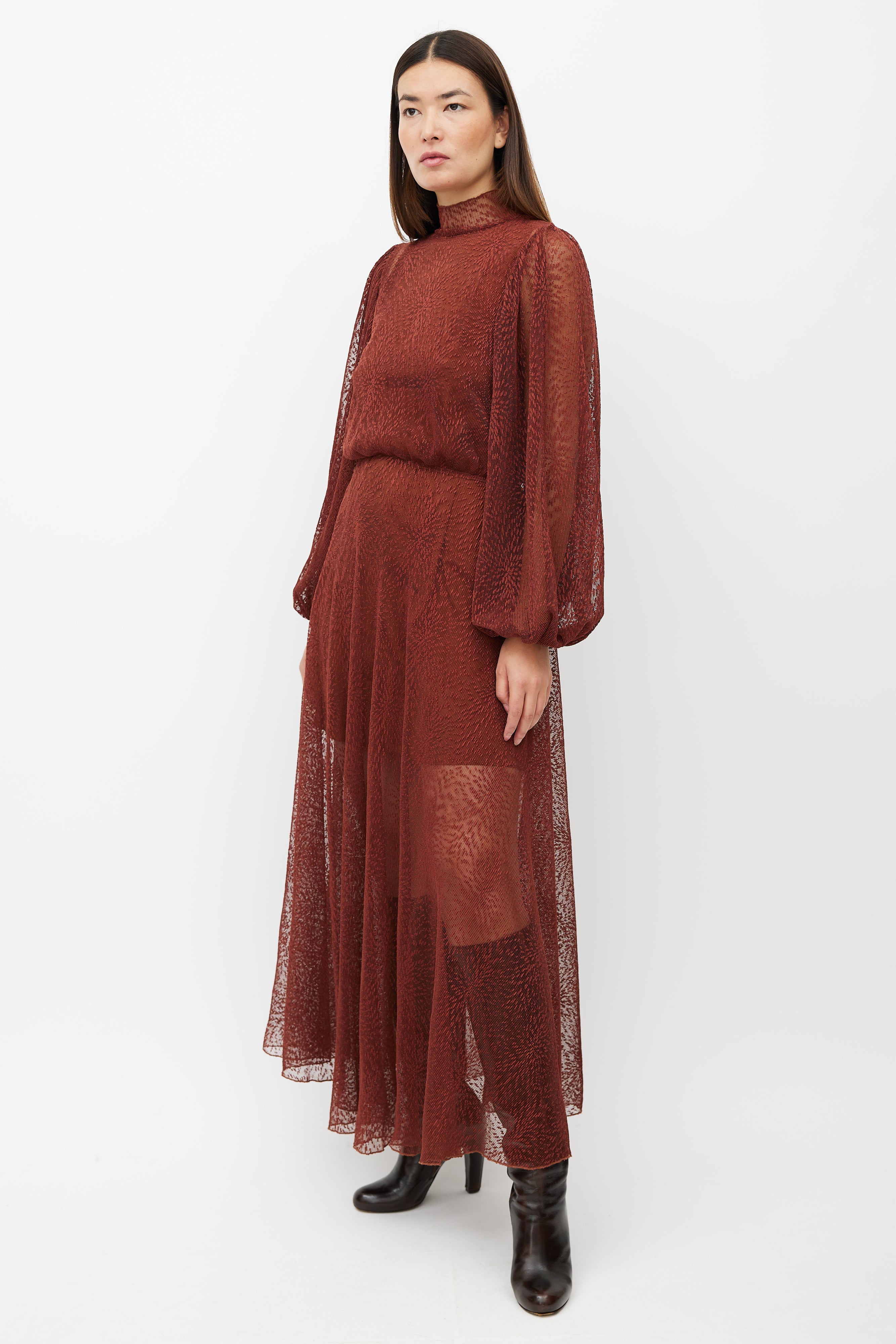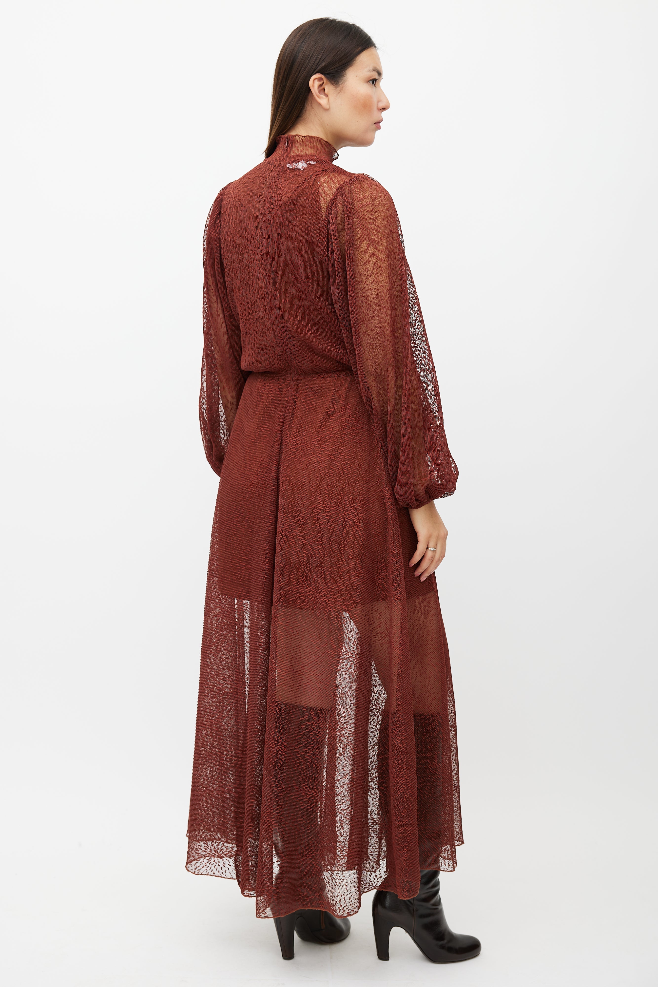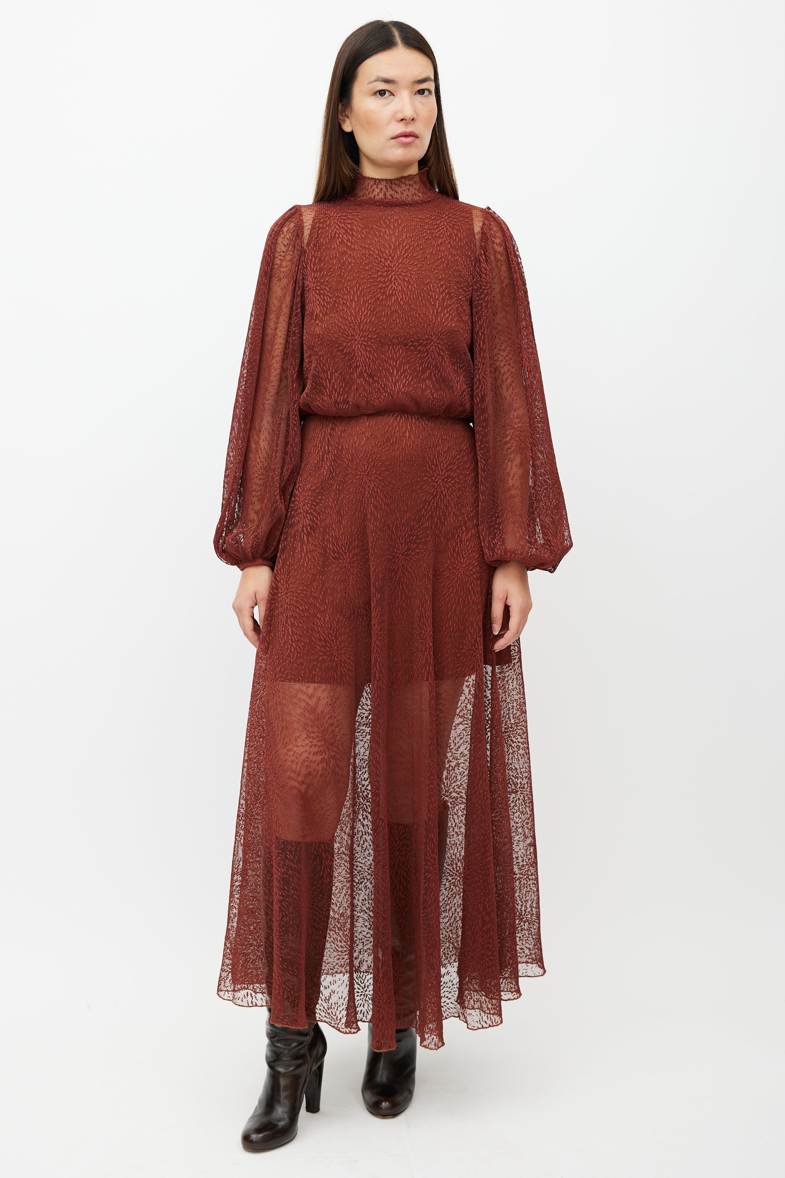 Pre-owned Beaufille brown Picasso lace dress featuring a mock neck collar, long bishop sleeves, and zip closure at back. Comes with matching slip.