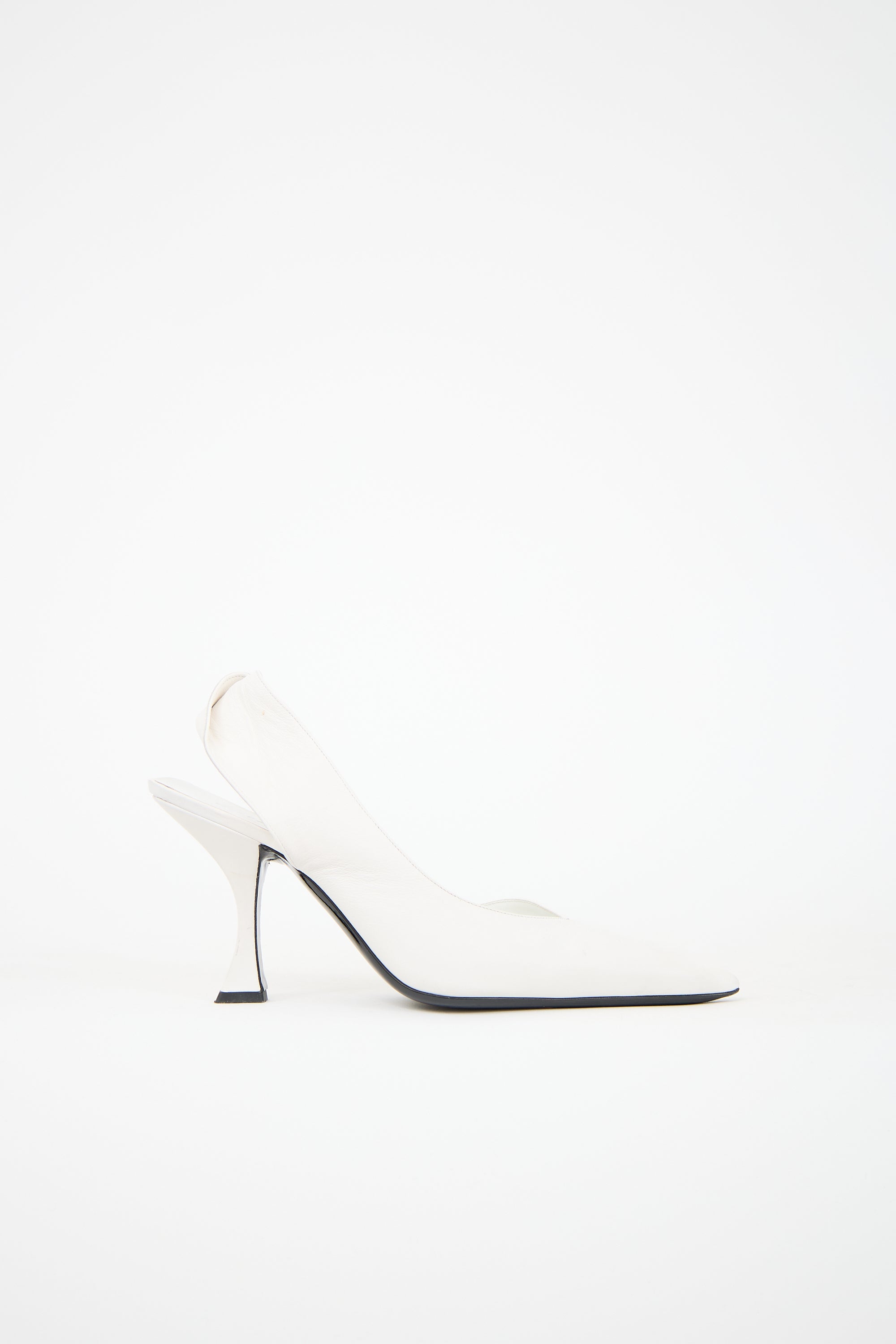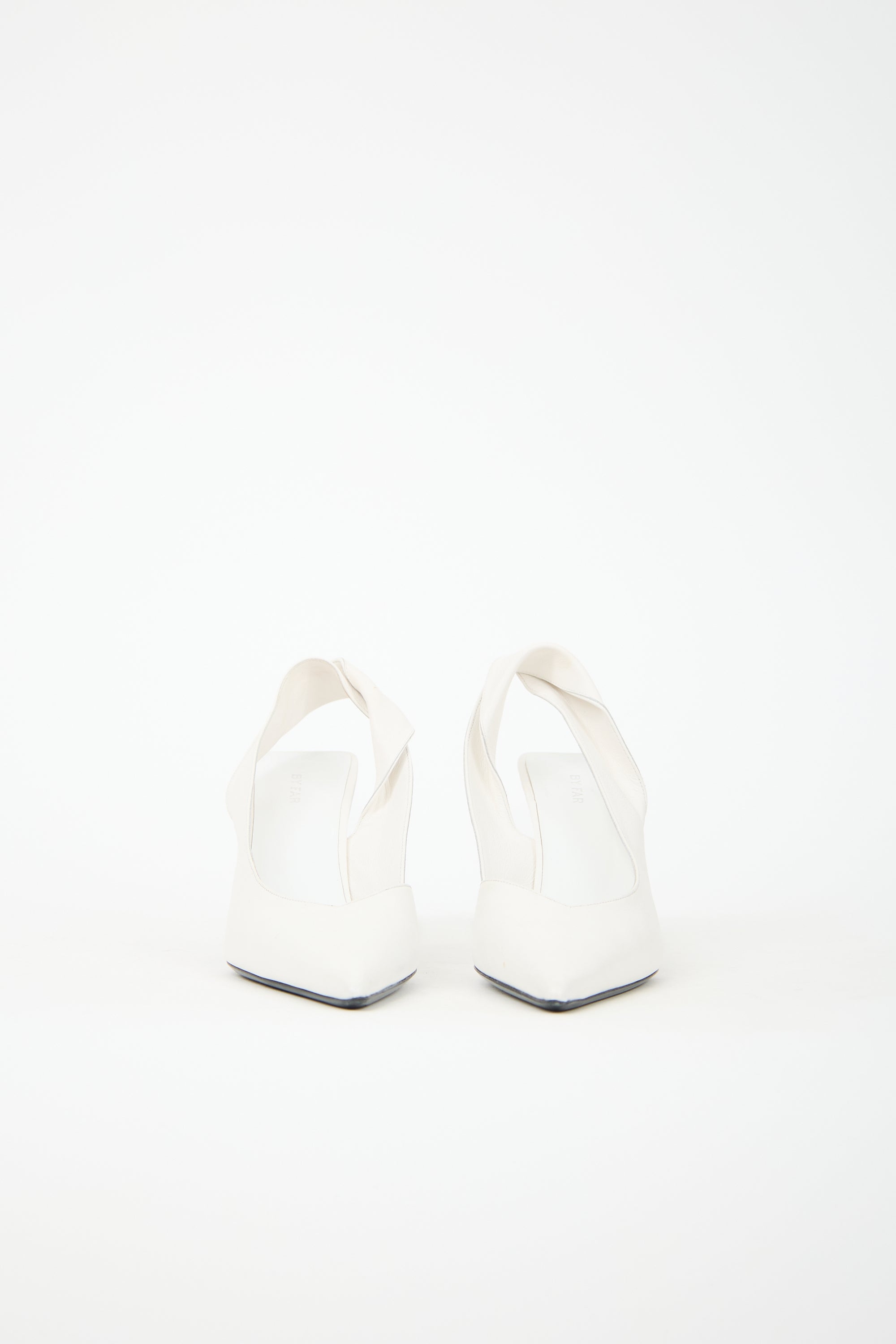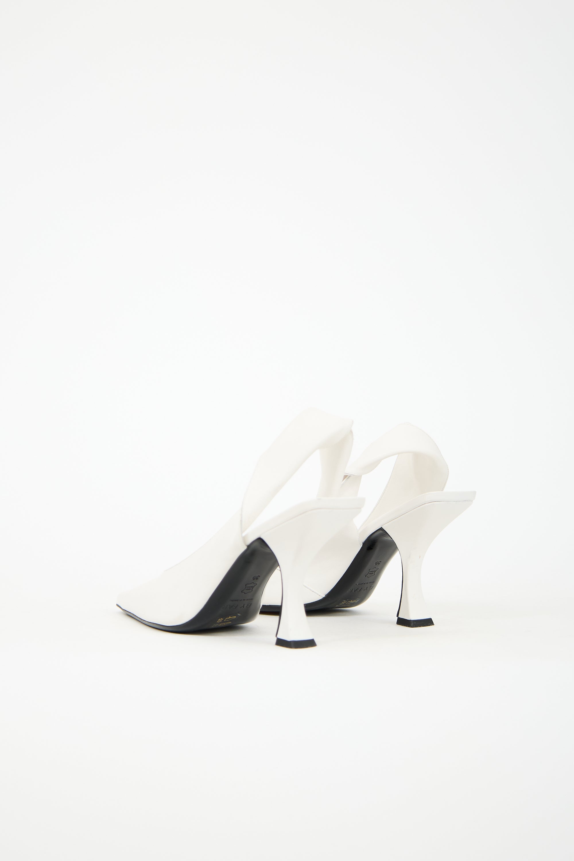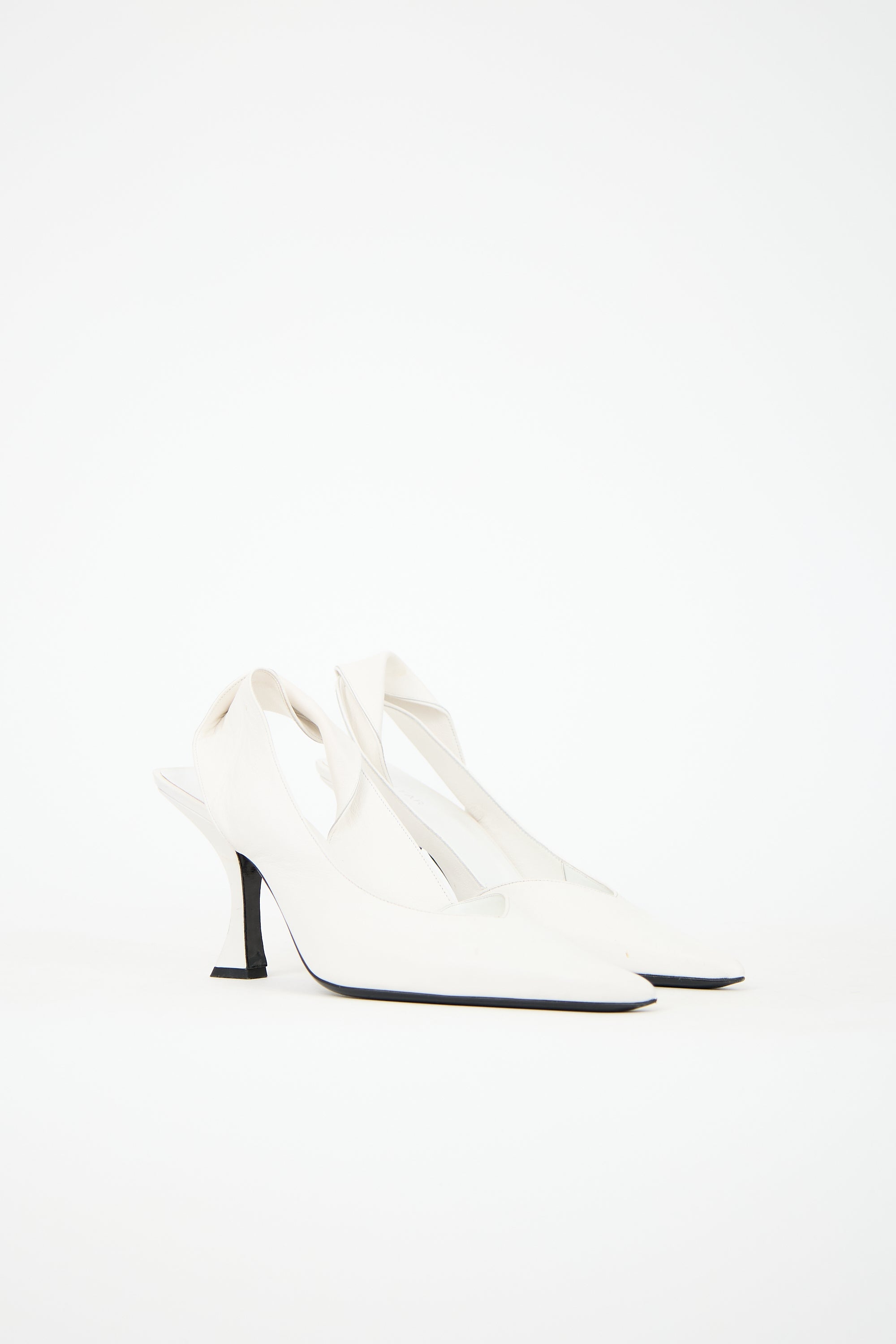 Pre-owned By Far white leather Yasha pumps featuring pointed toe, twisted slingback strap, and comma heel.