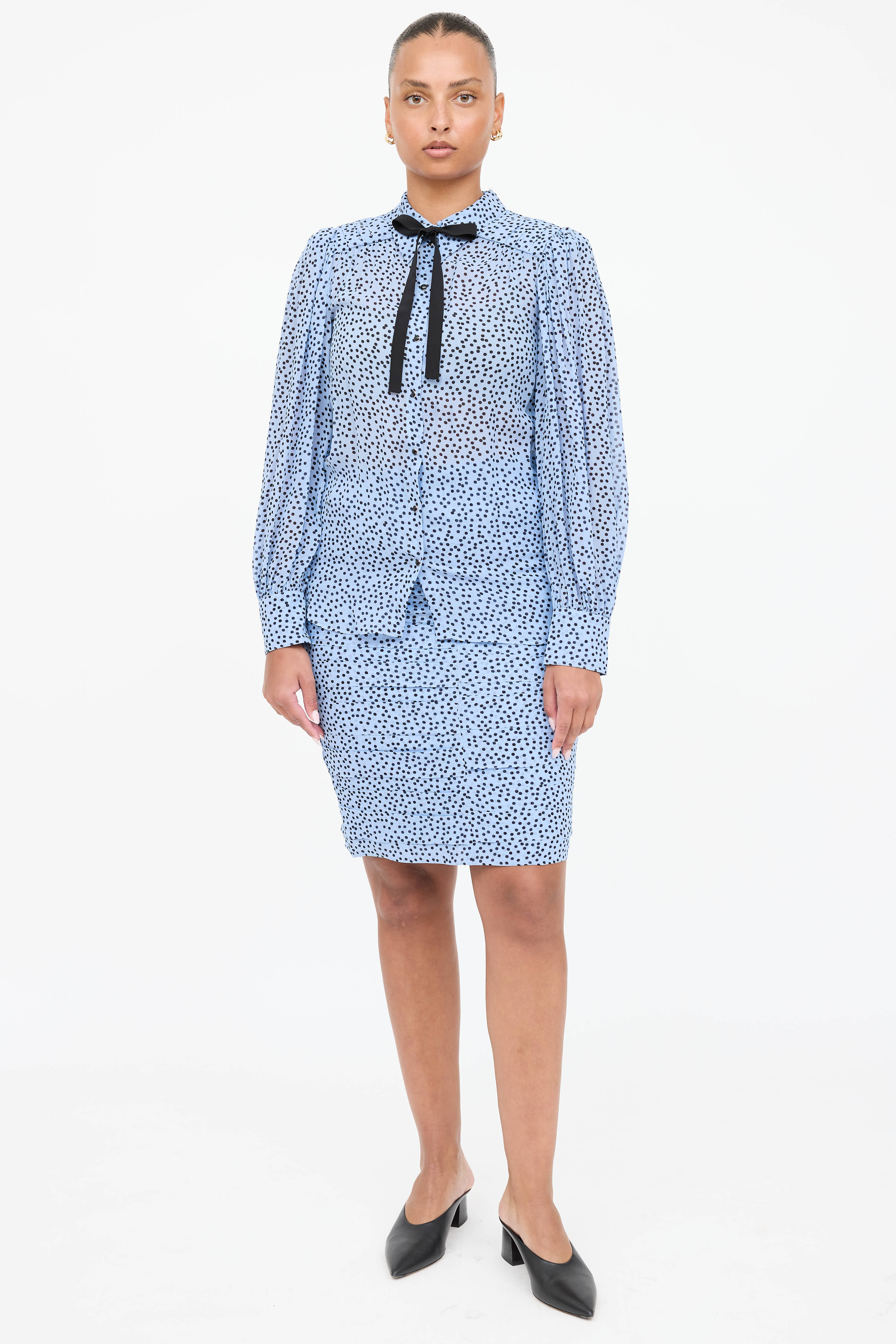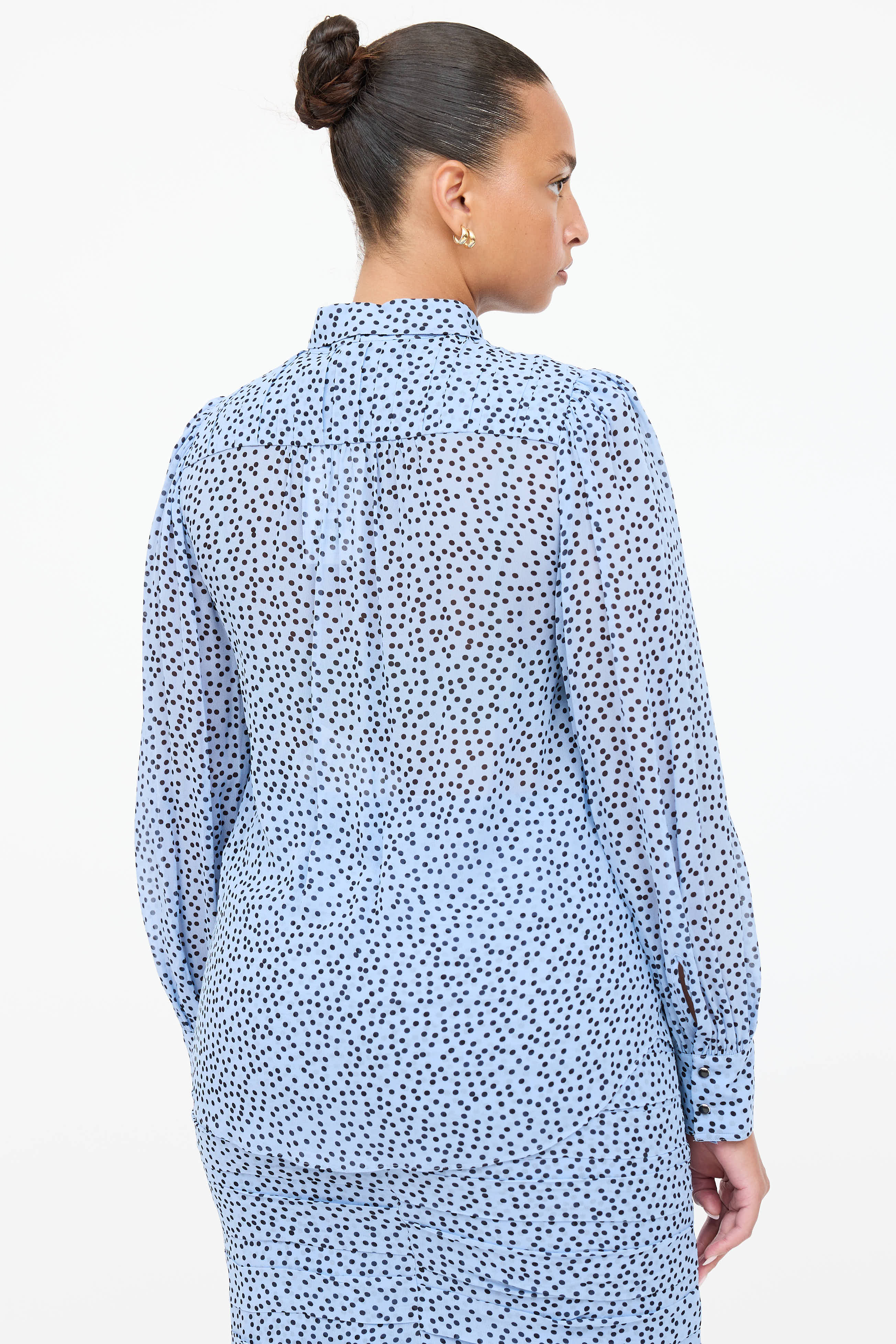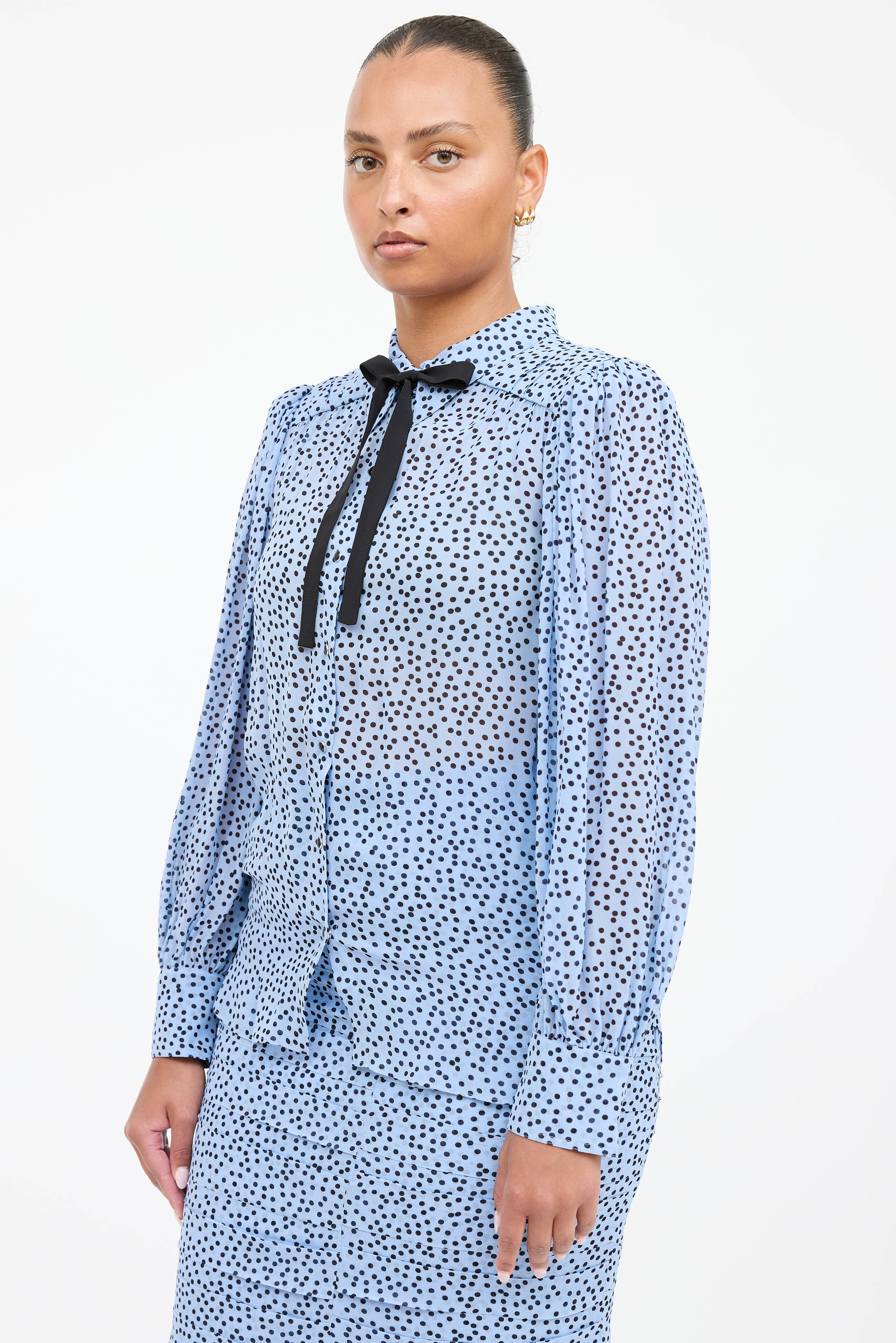Dorothee Schumacher blue shirt featuring a black polka dot pattern throughout, pointed collar with tie detail, long sleeves with buttoned cuffs, pleated detailing at shoulders, and button up closure.