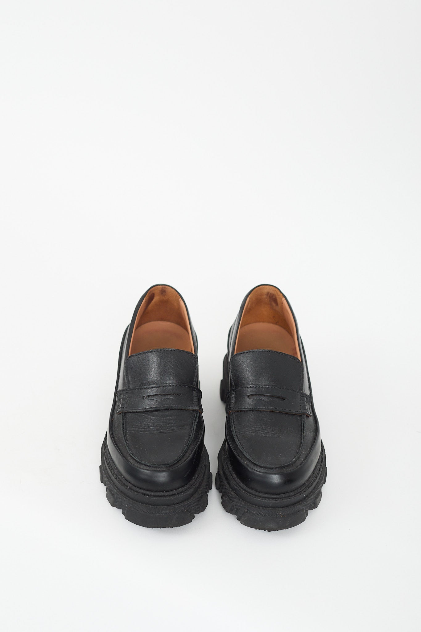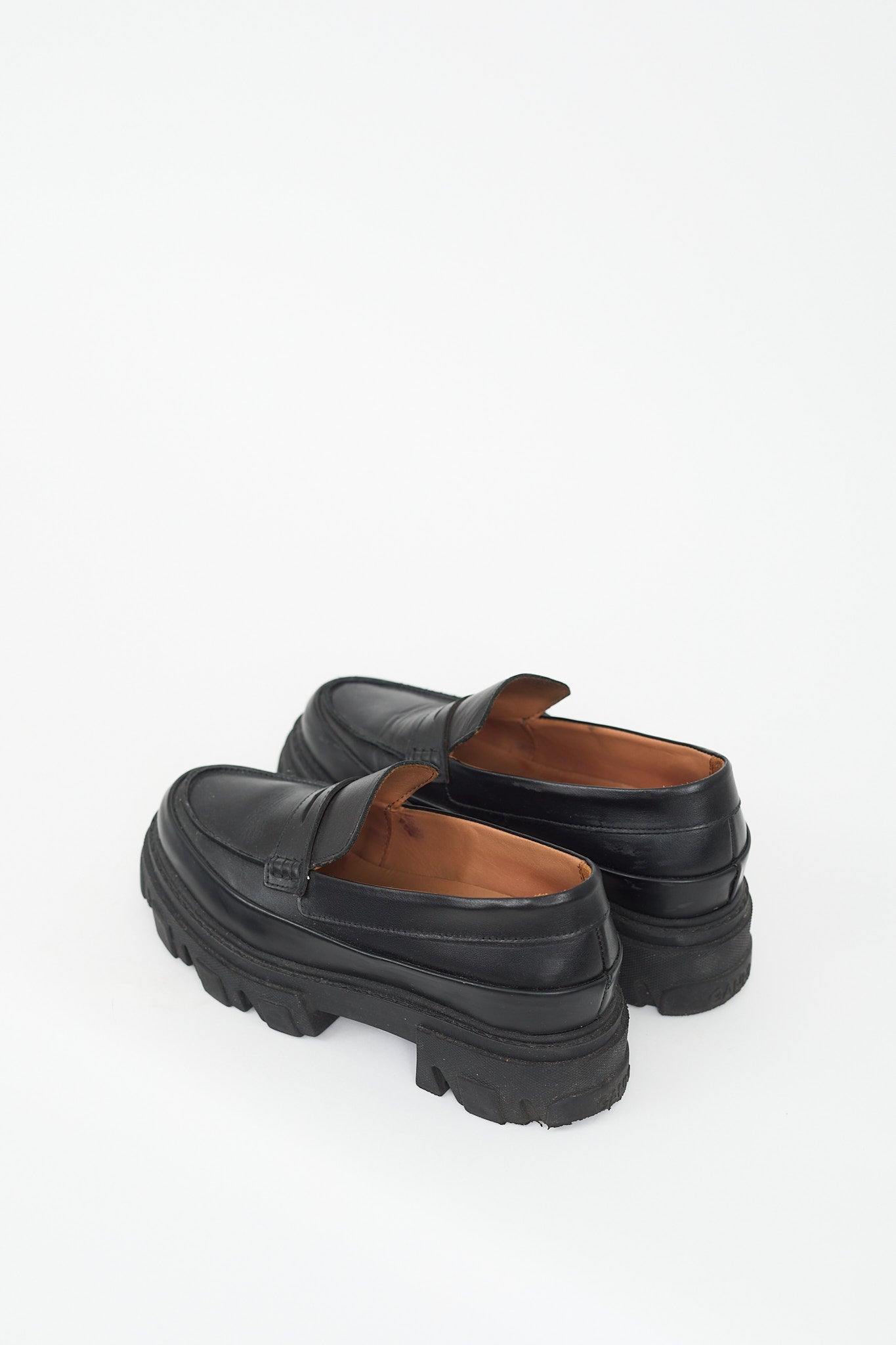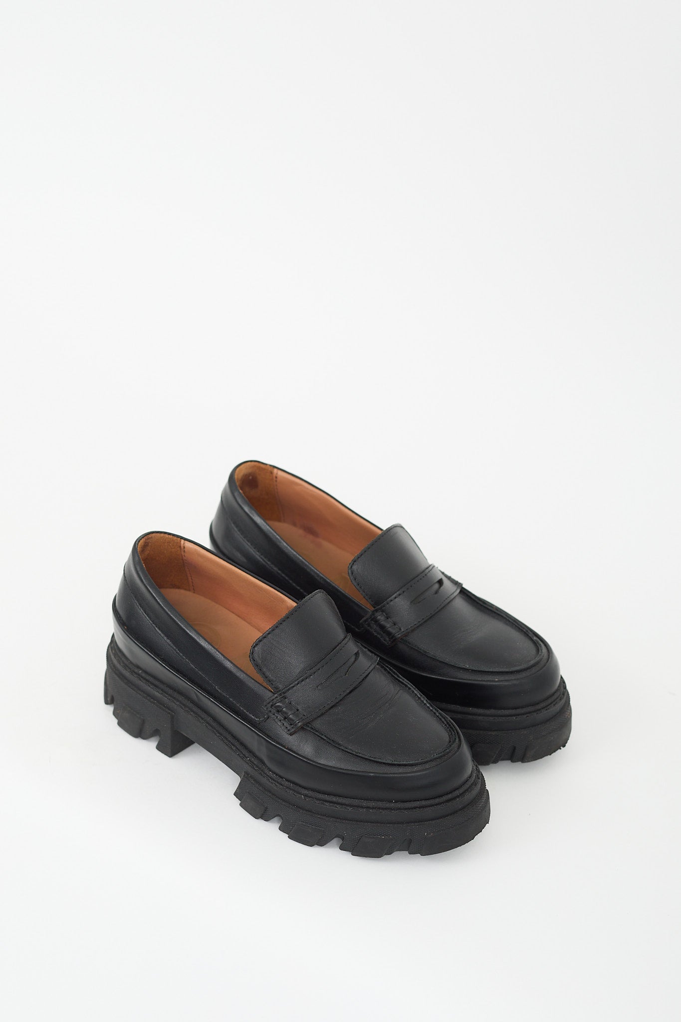 Pre-owned Ganni black leather loafers featuring a round toe, strap at vamp, chunky outsole, and slip on entry.