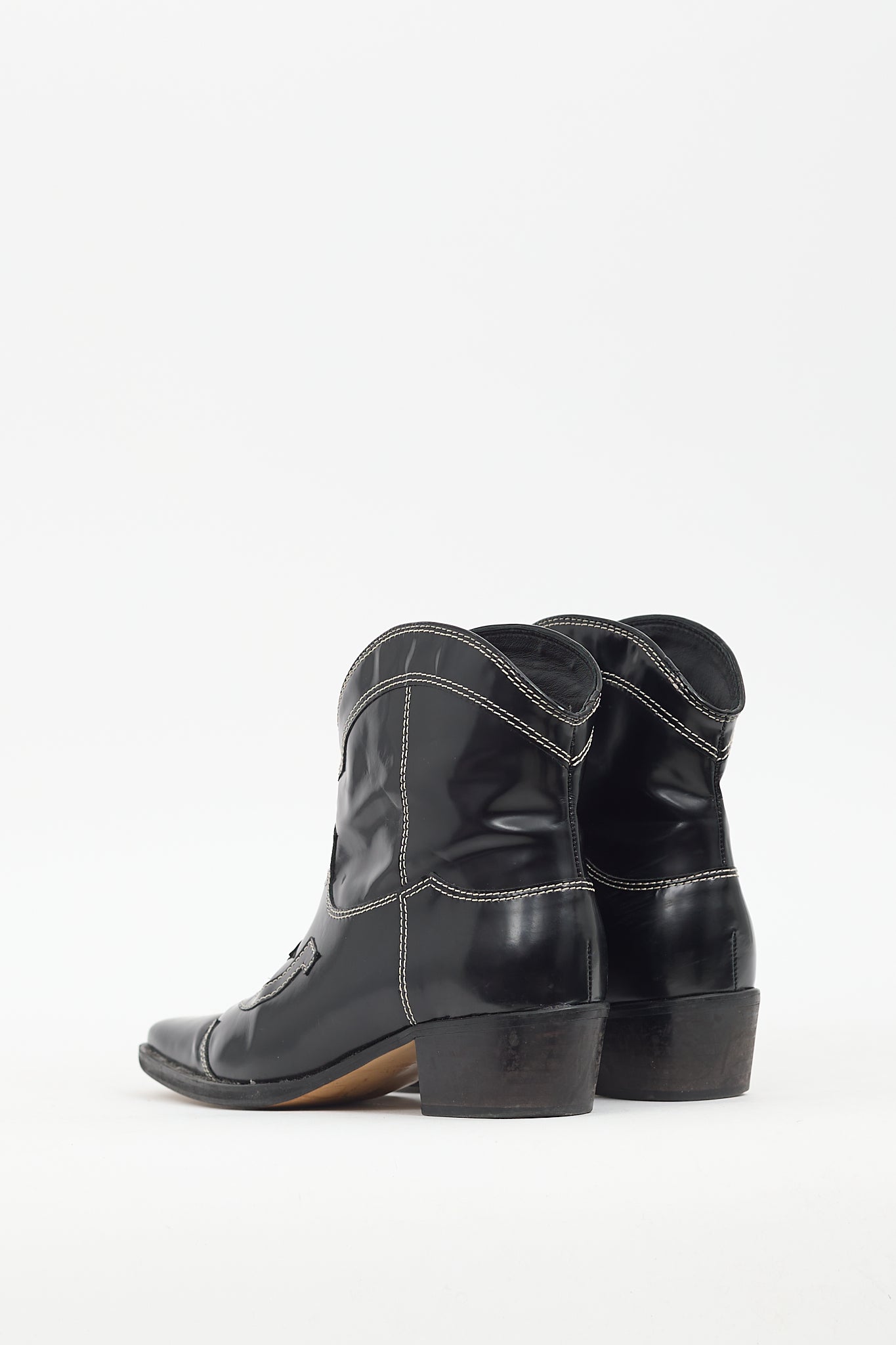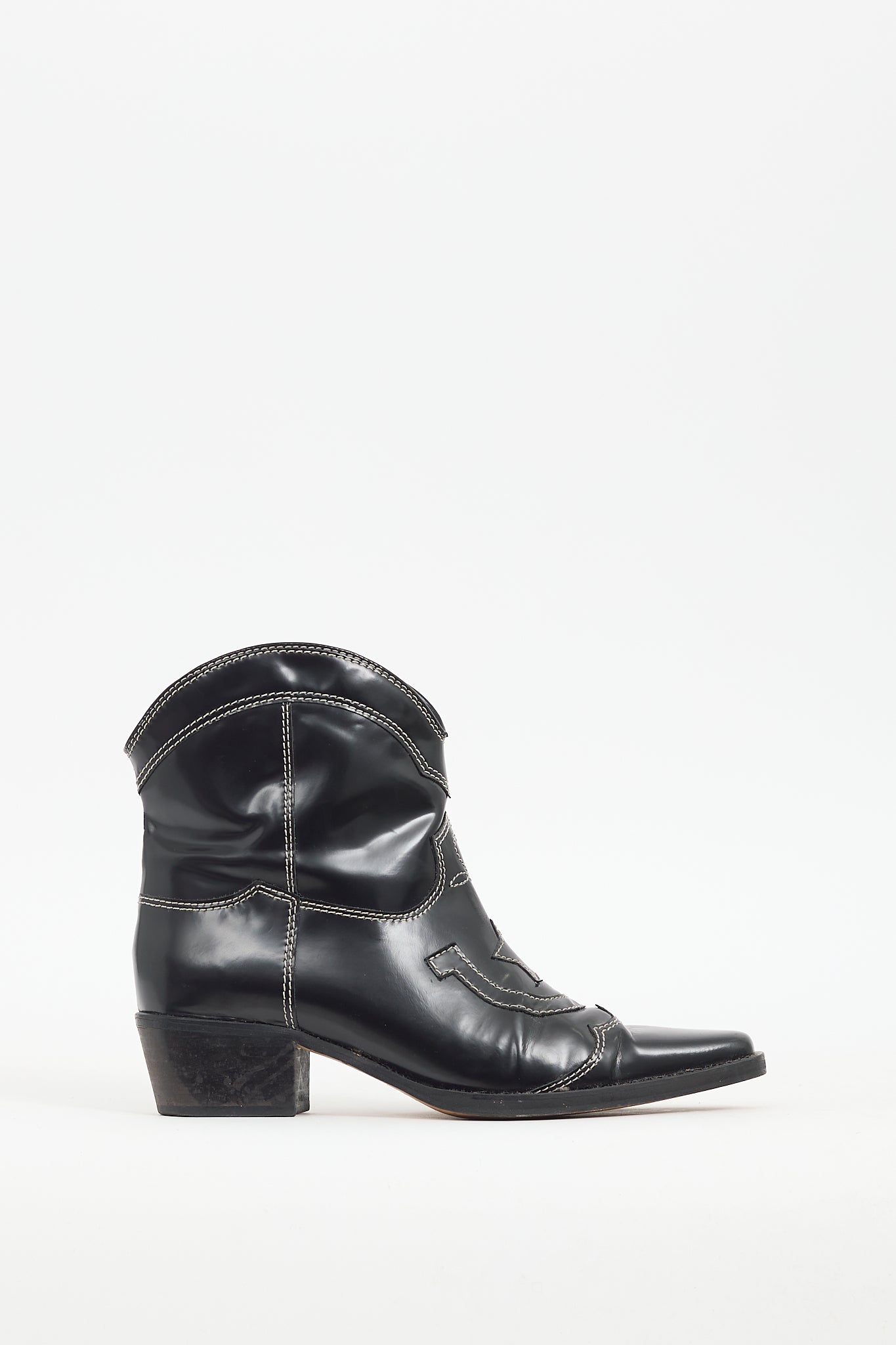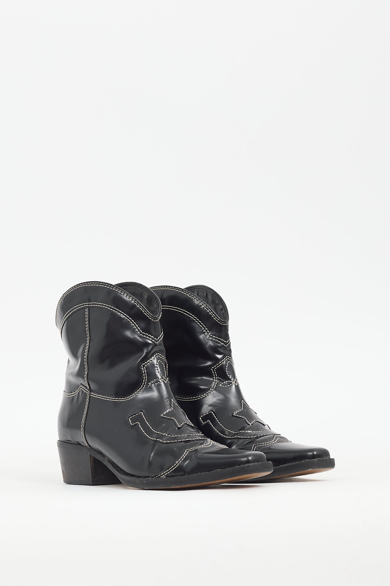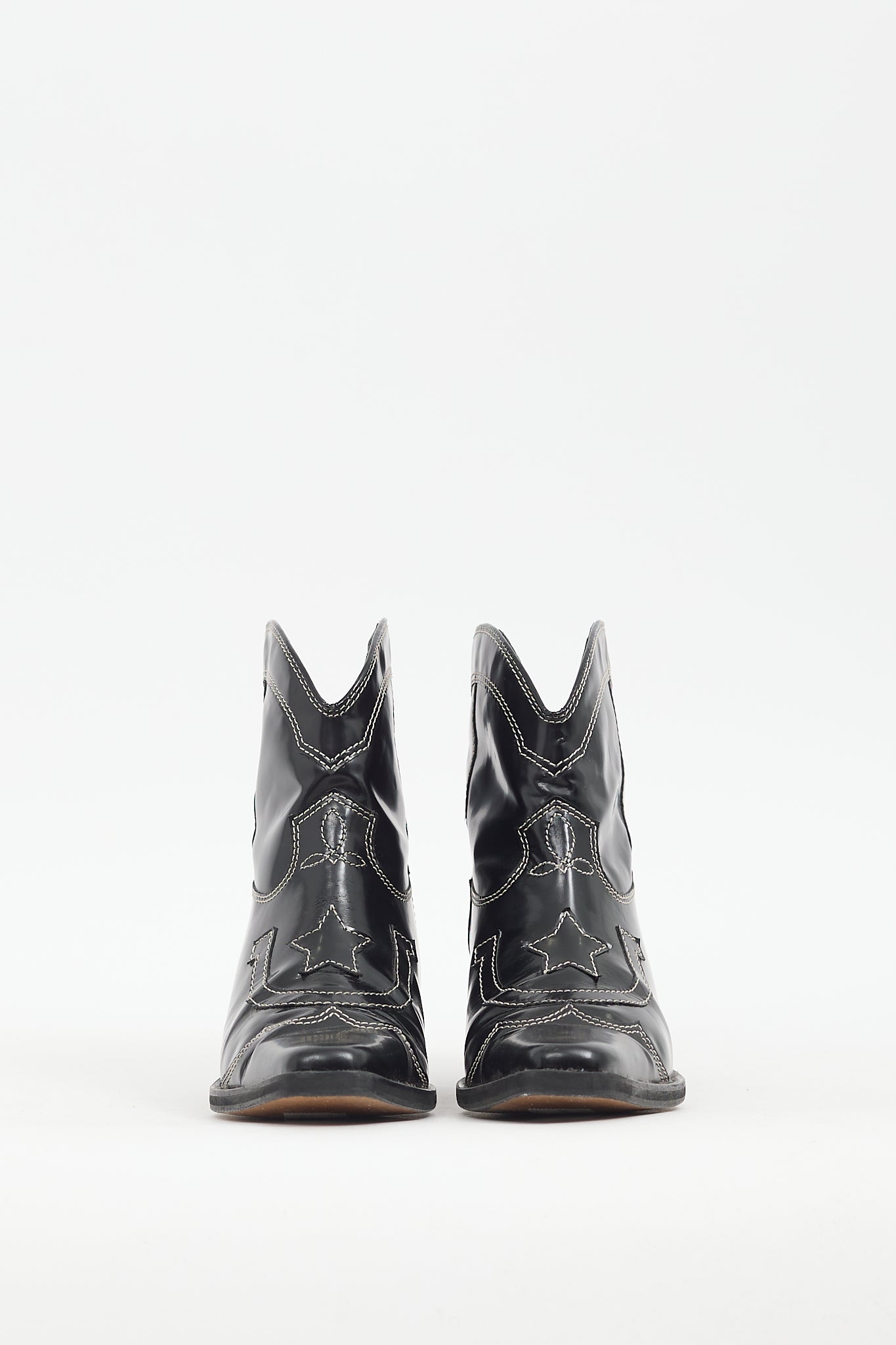 Pre-owned Ganni black leather embroidered western boots featuring tapered square toe, pull on entry, low stacked block heel, and western style embroidery at upper.