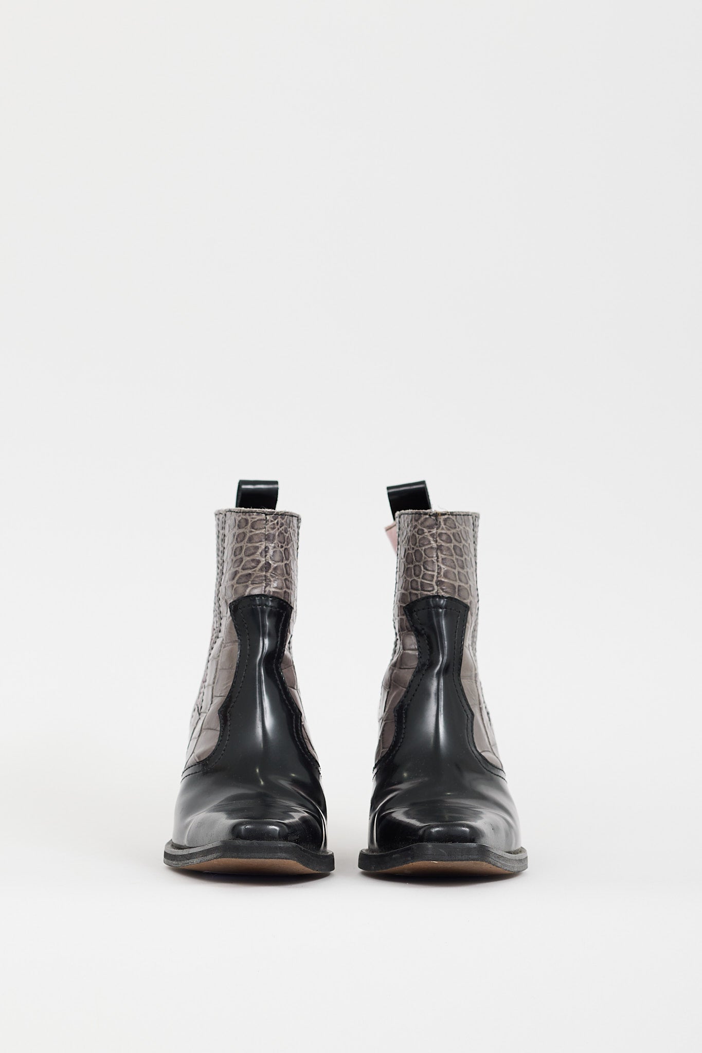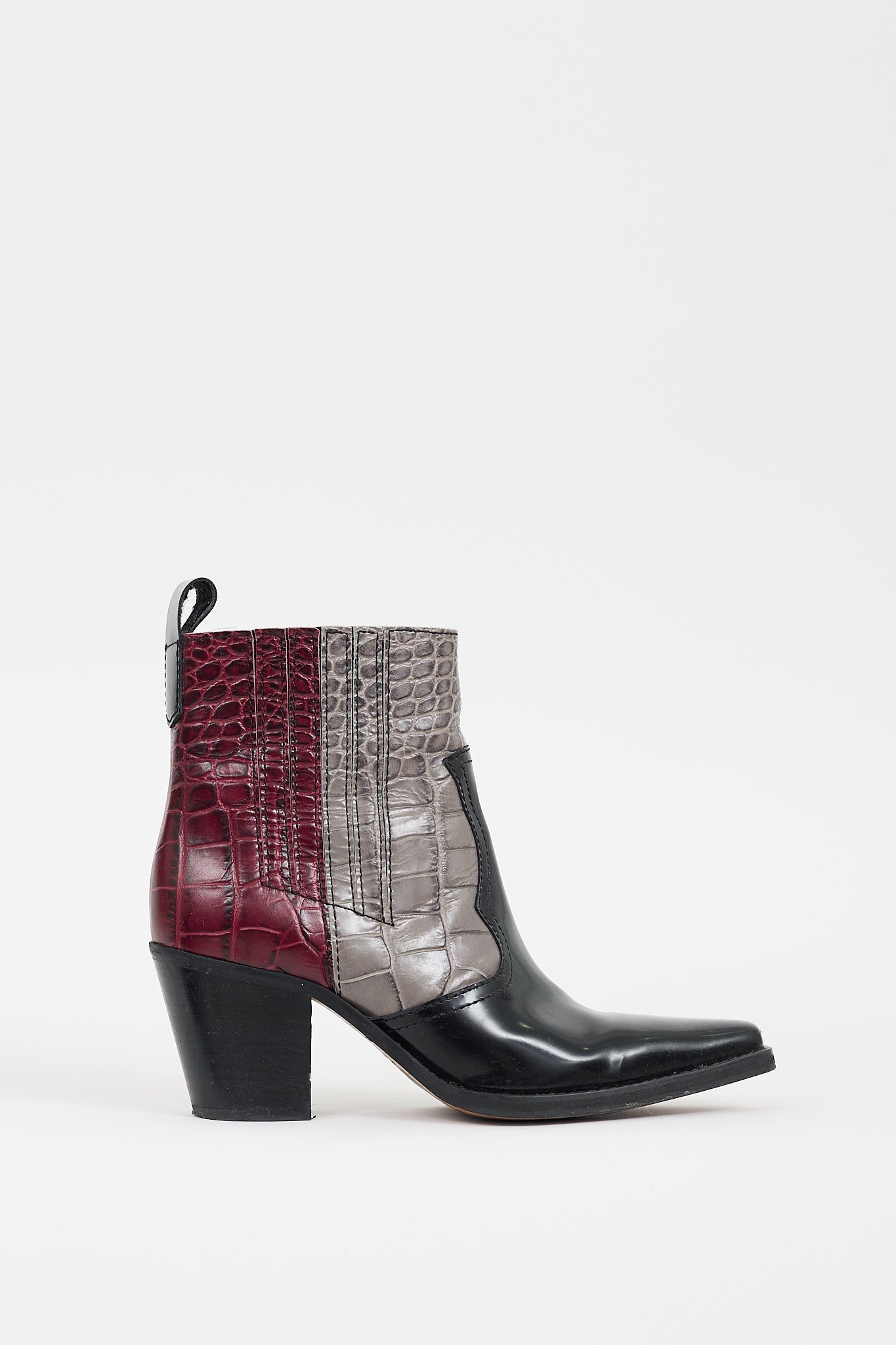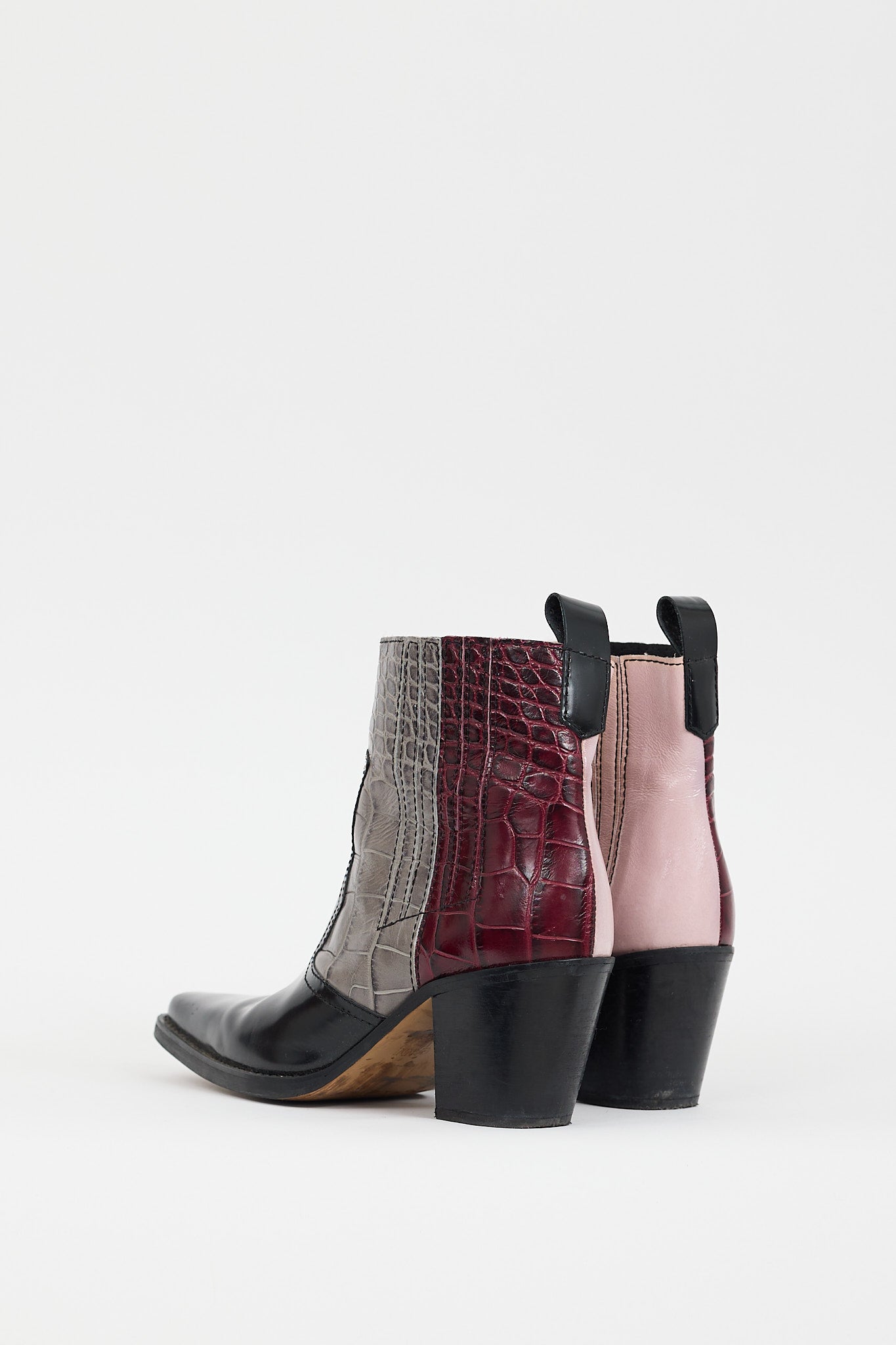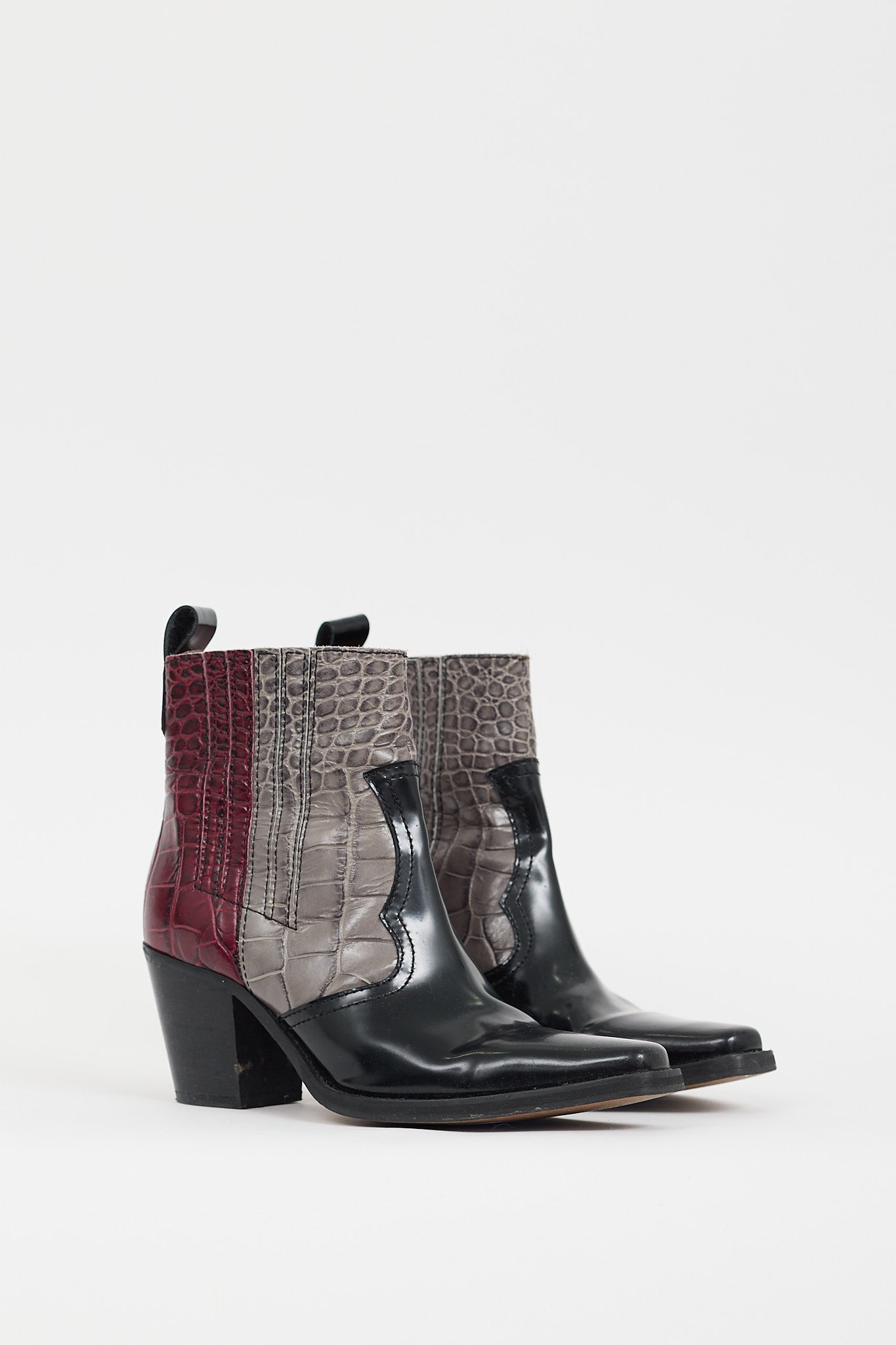 Pre-owned Ganni black and multicolour western boots featuring a tapered square toe, embossed leather panelling throughout shaft, elastic side inserts, pull tab at counter, and Cuban heel. Comes with original dust bag.