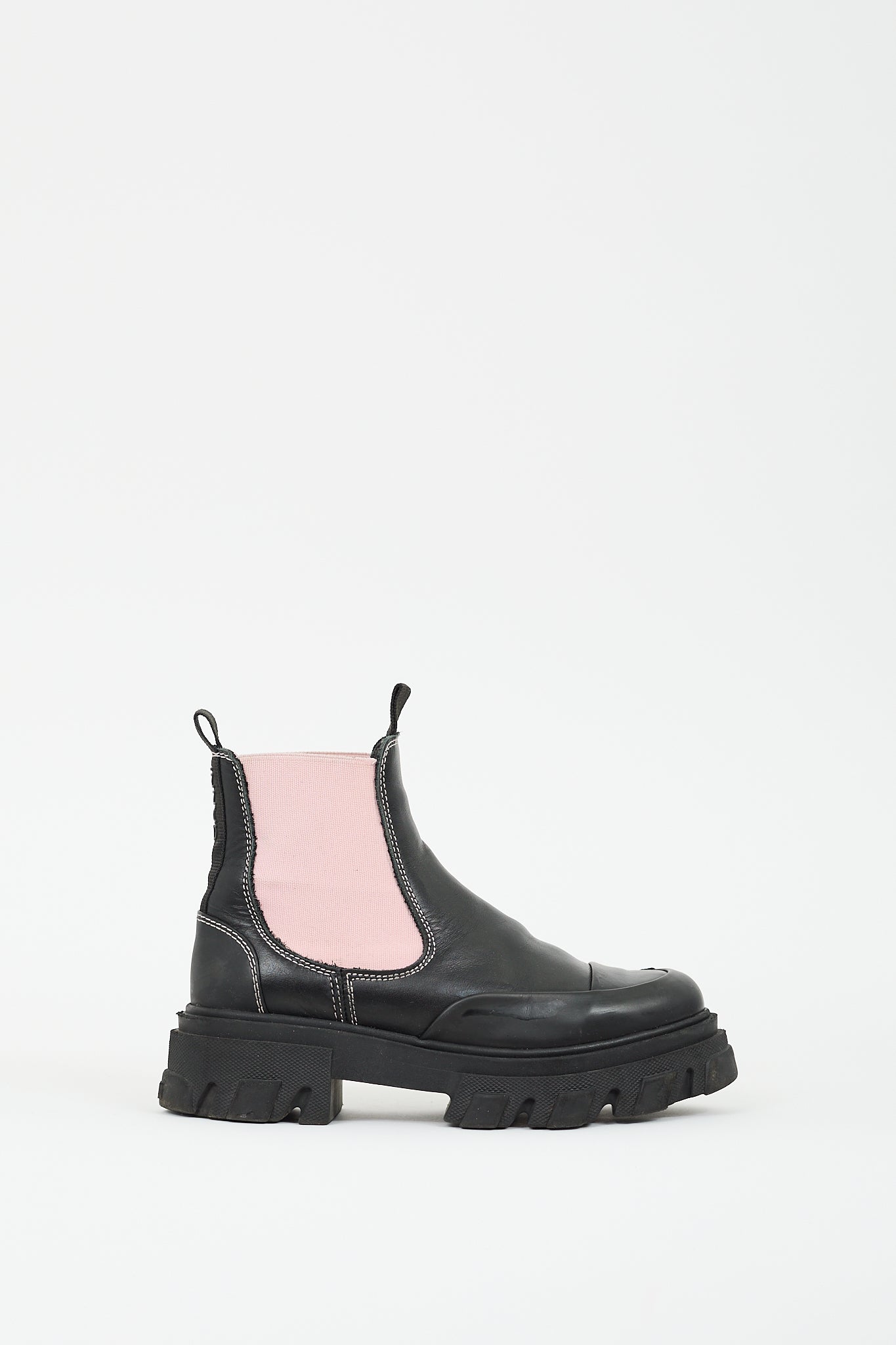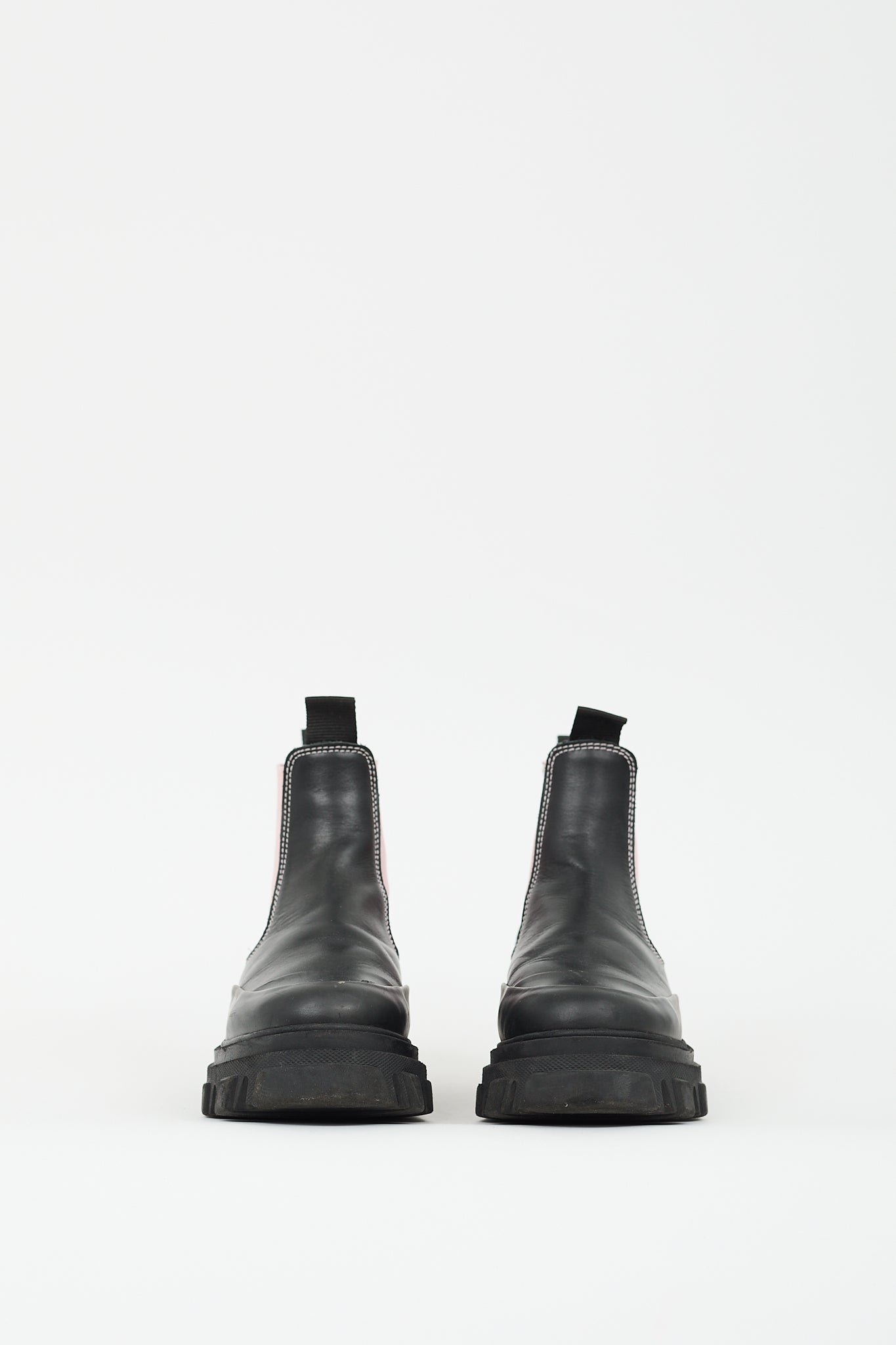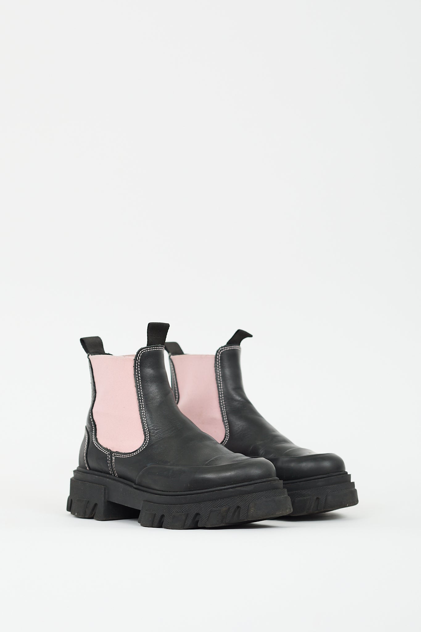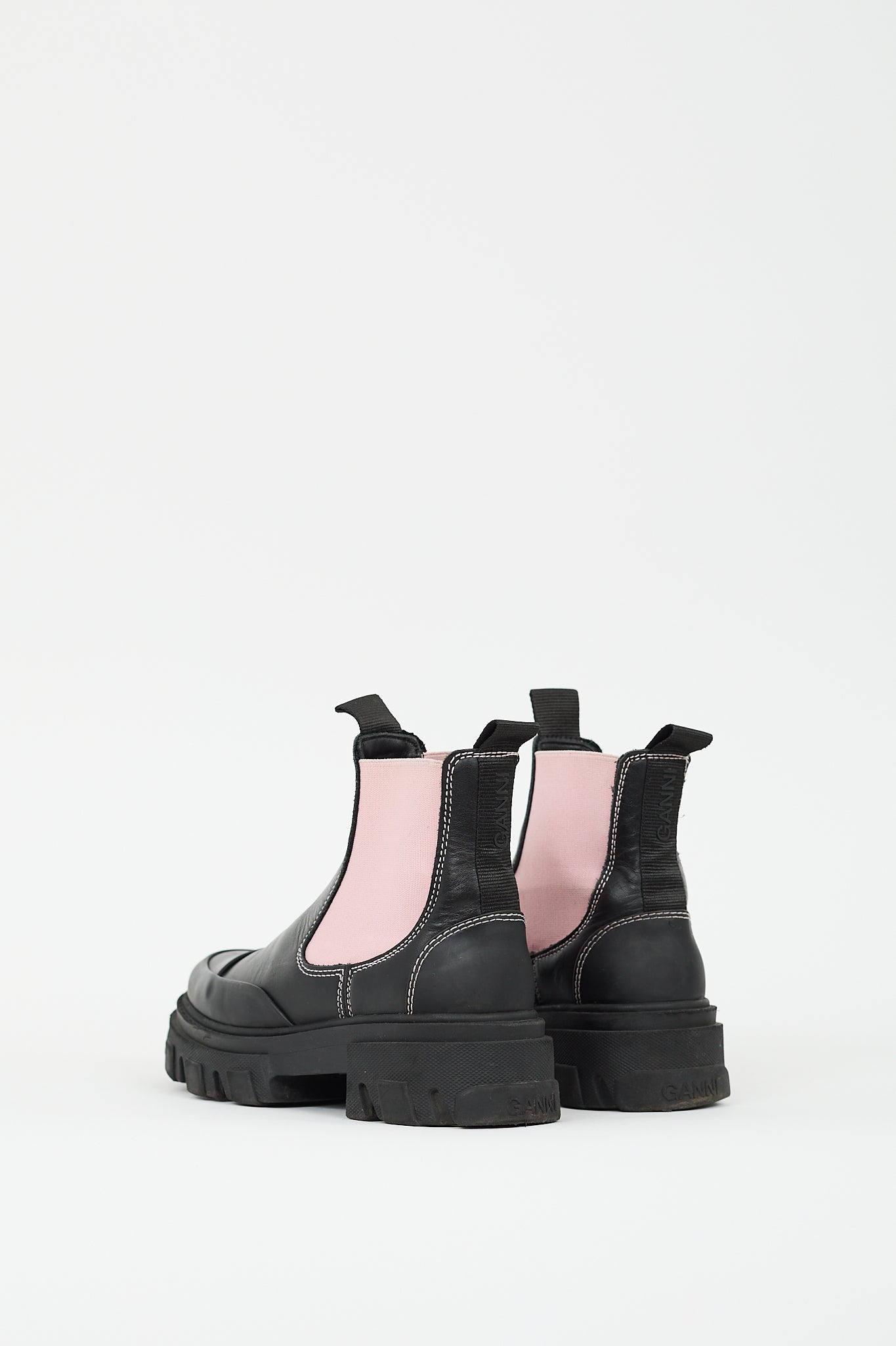 Pre-owned Ganni Chelsea boots featuring a rounded toe, black leather upper, notched topline design, white stitching, pink elastic side panelling, pull tab at tongue and counter, rubberized logo at backstay pull on entry, and black rubber lug sole with embossed logo at heel.