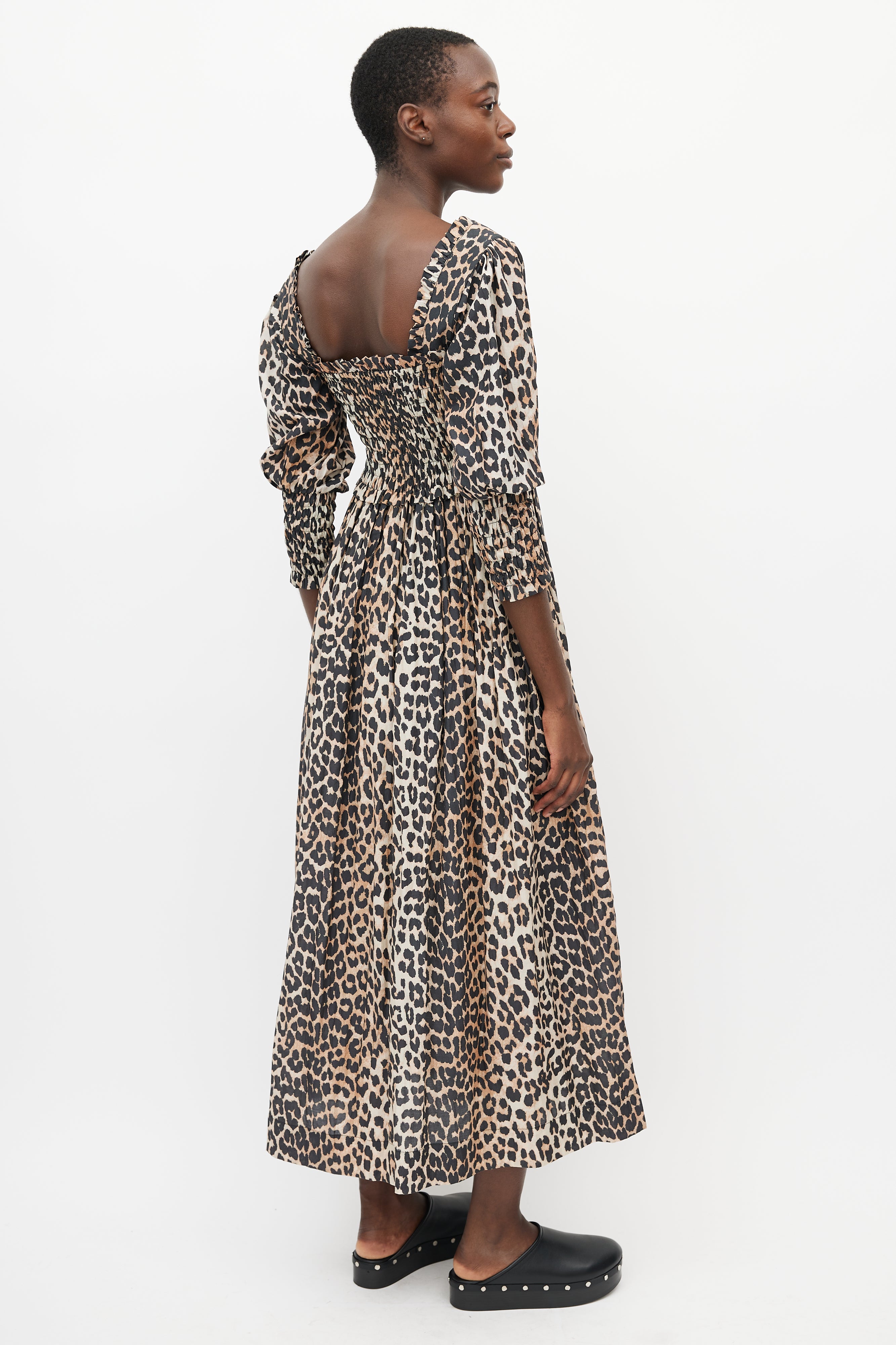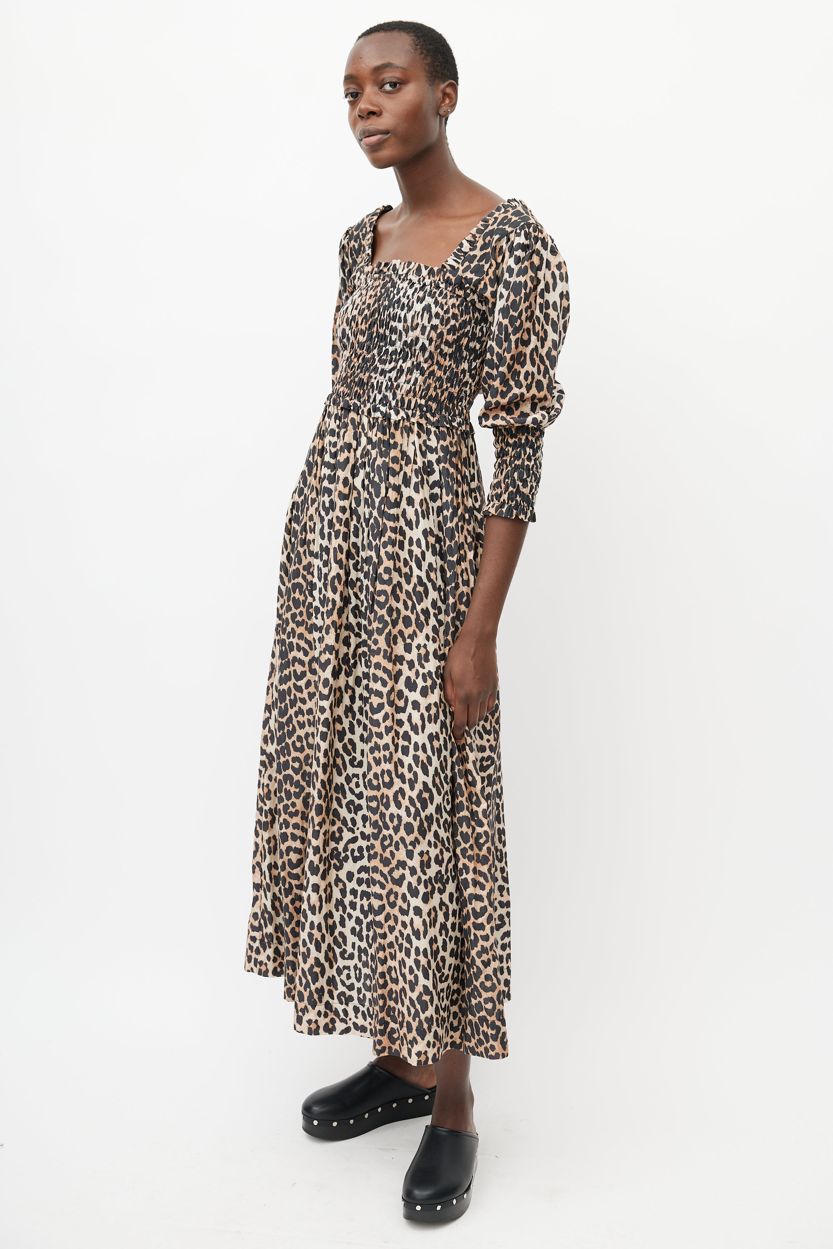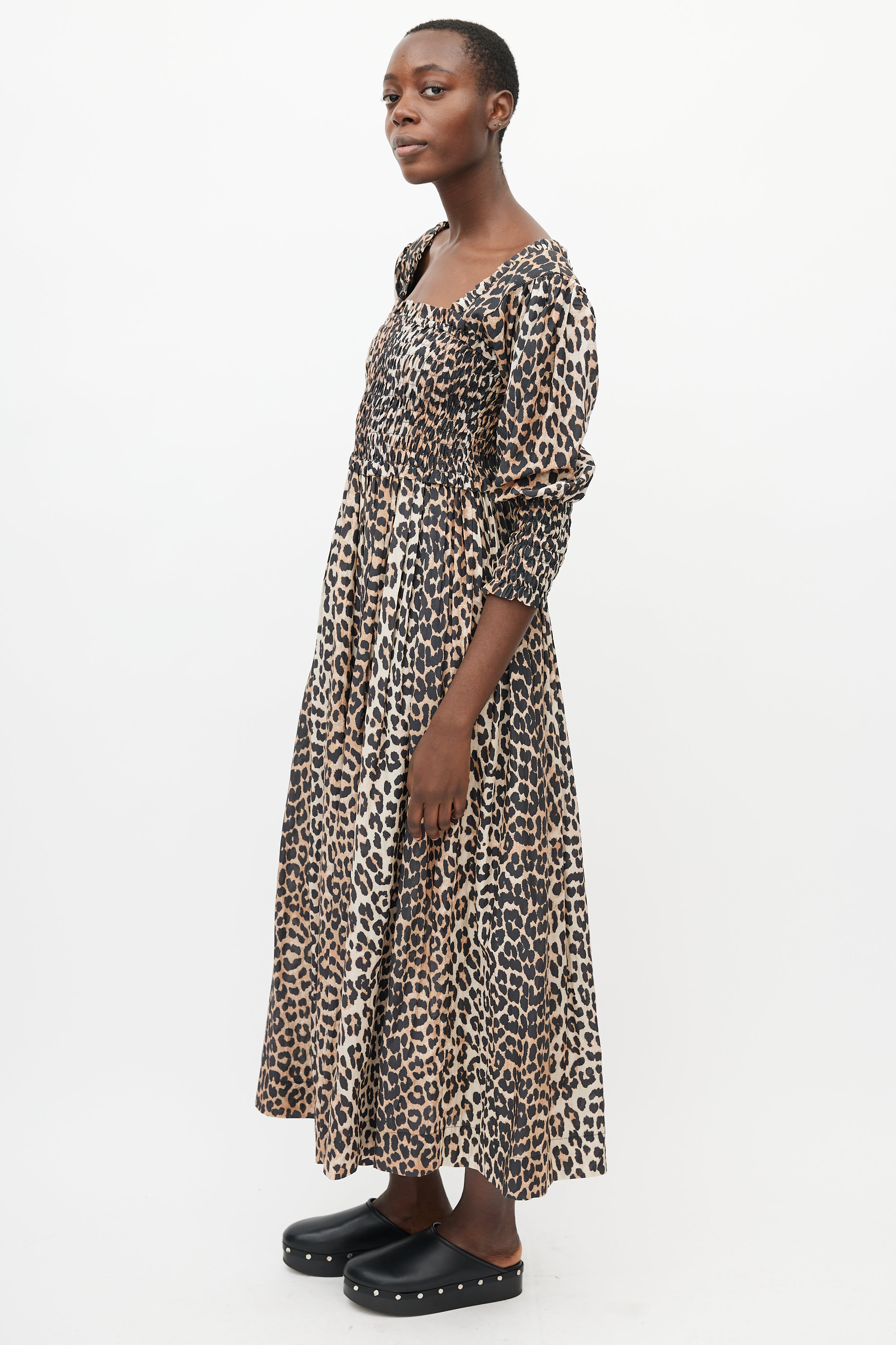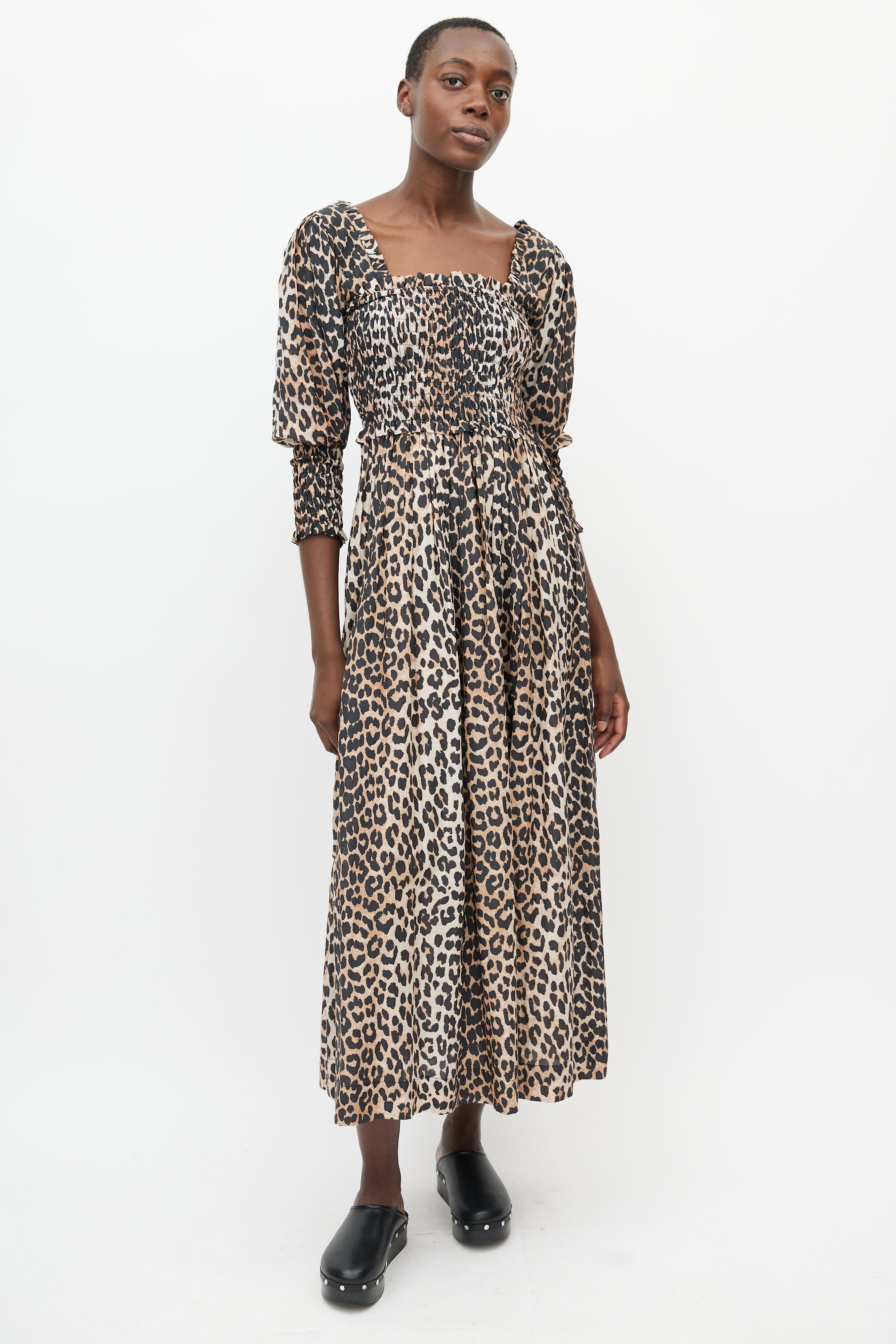 Pre-owned Ganni brown dress featuring a black leopard print throughout, scoop neckline, smocked bodice, long sleeves with puffed shoulders, and ruffled skirt.