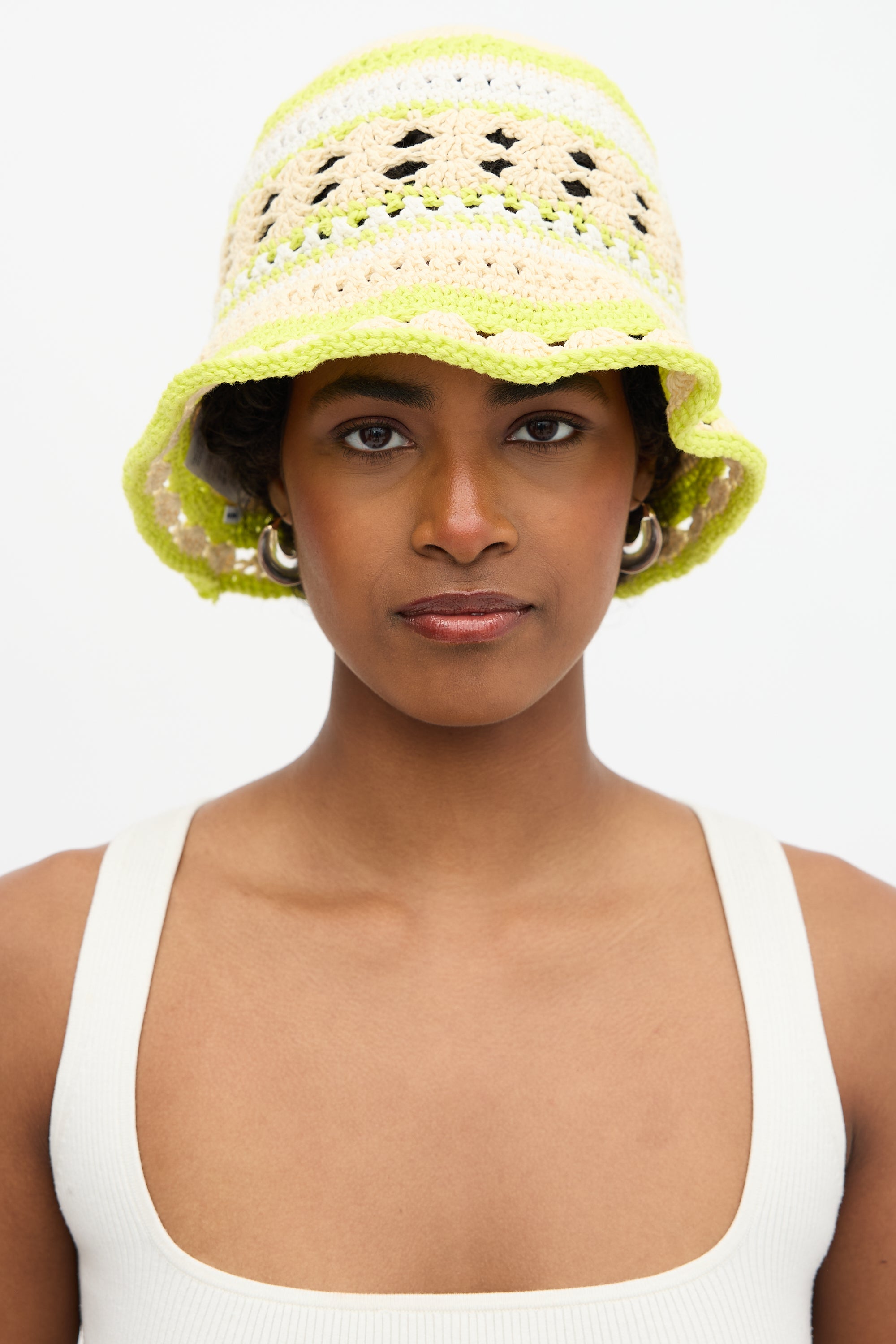 Pre-owned Ganni yellow and beige crochet bucket hat featuring white logo patch and flared brim.