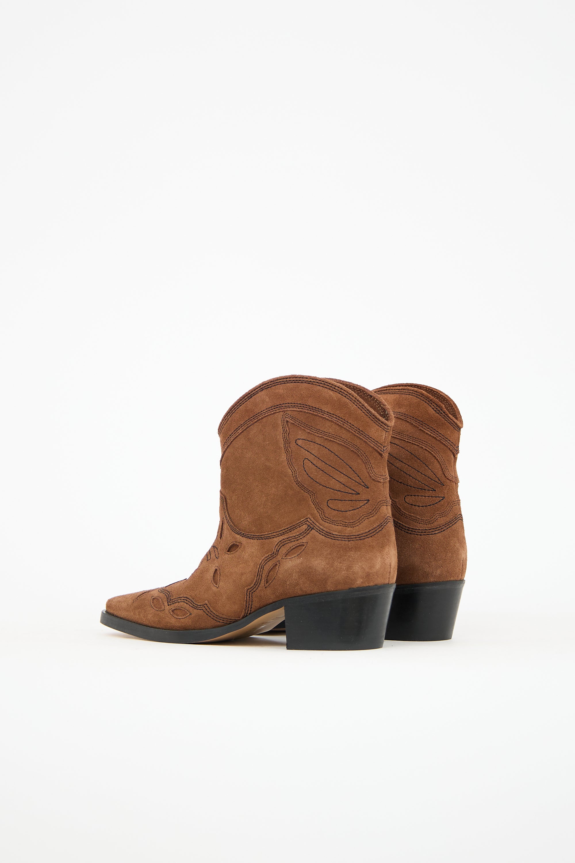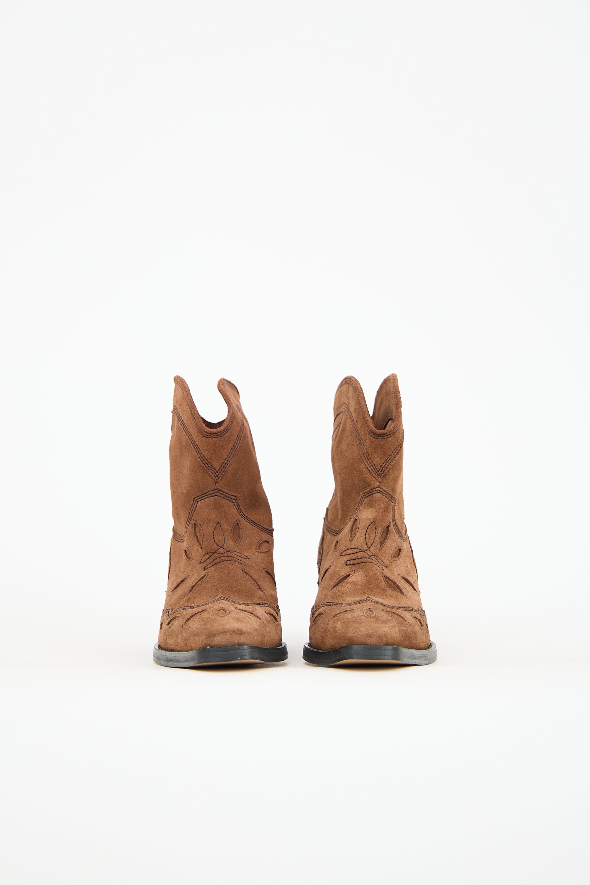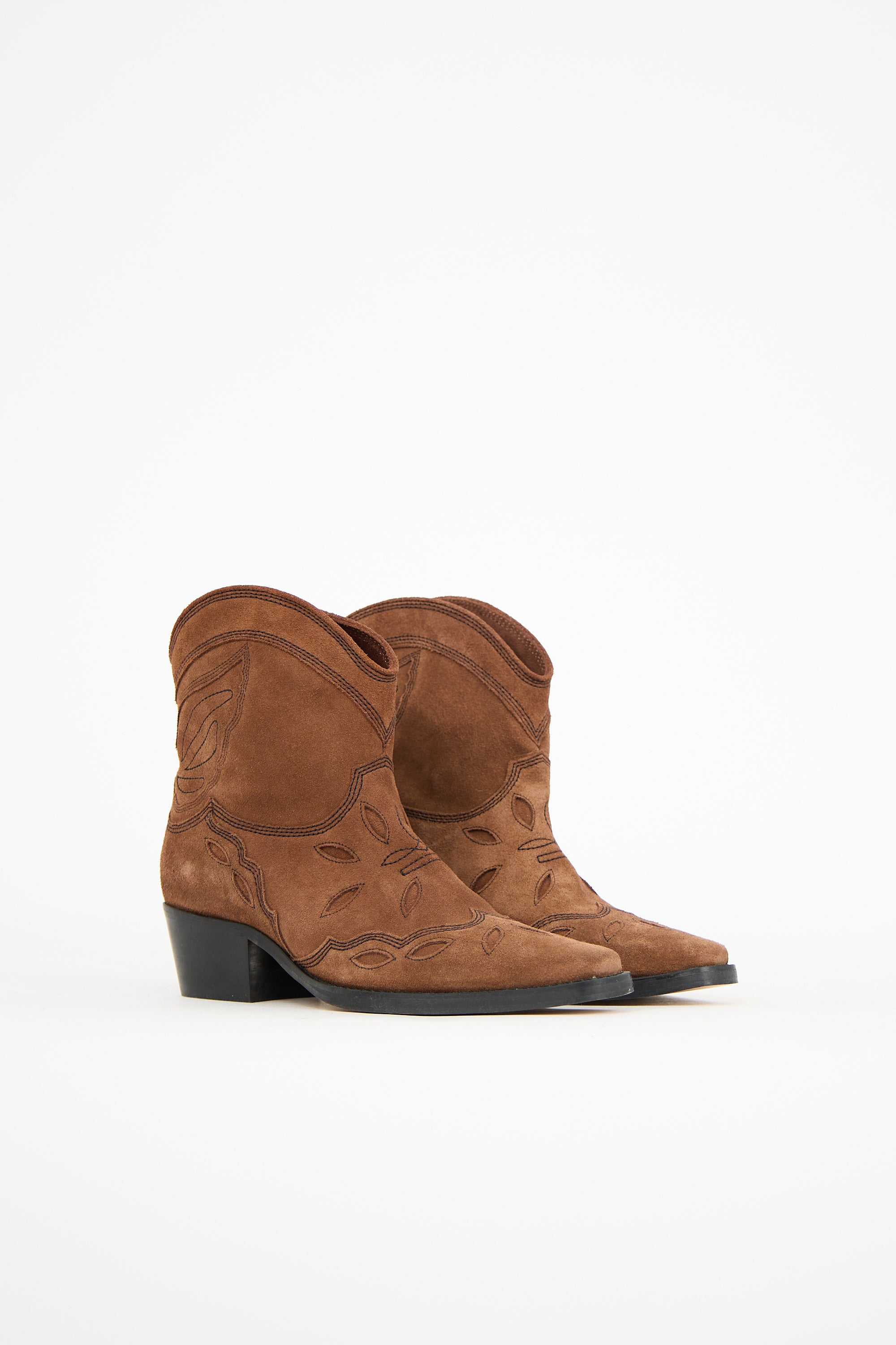 Pre-owned Ganni brown suede Low Texas ankle boots featuring a tapered square toe, laser cut detail and decorative top stitching throughout upper, pull on entry, and block heel. Comes with original dust bag.