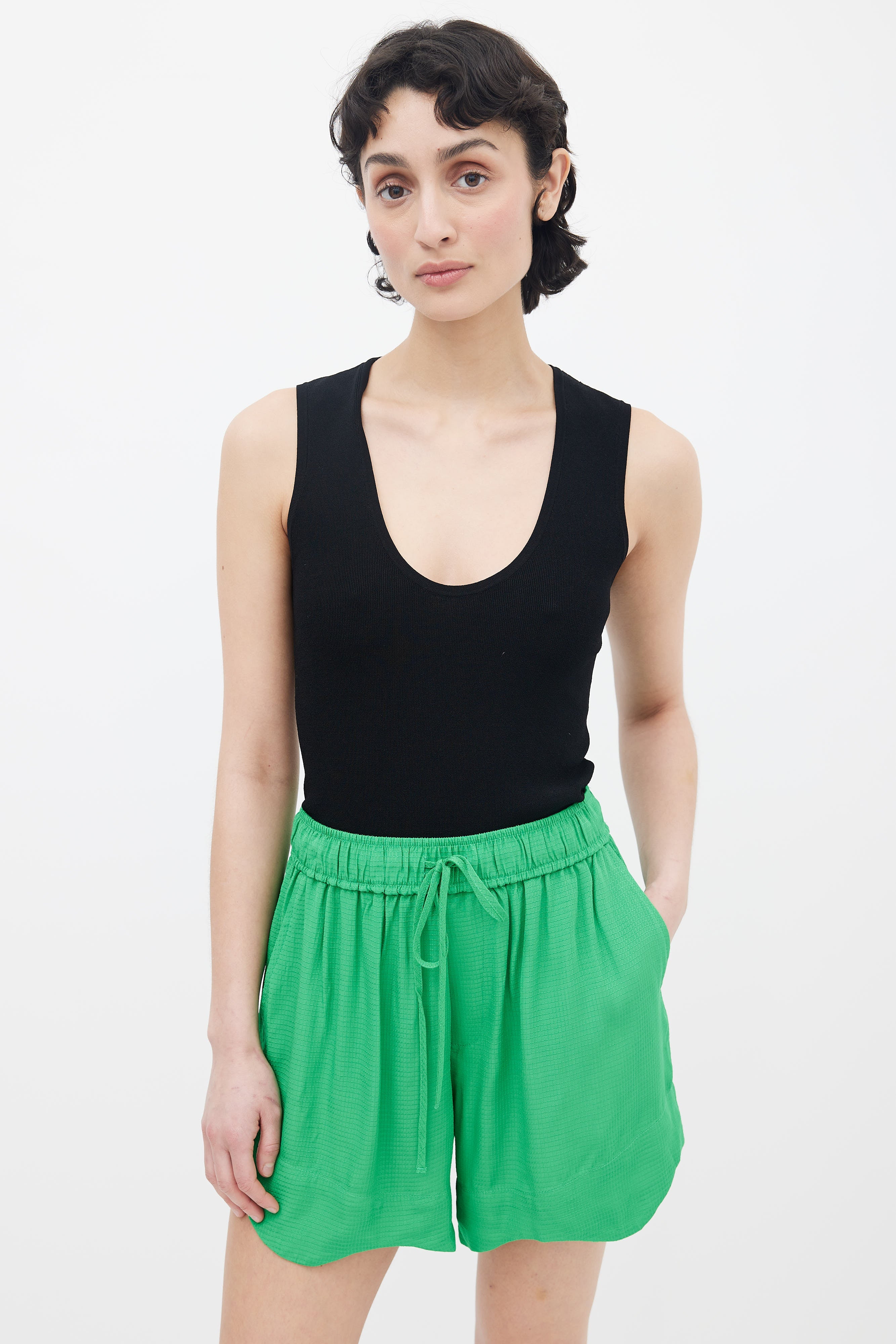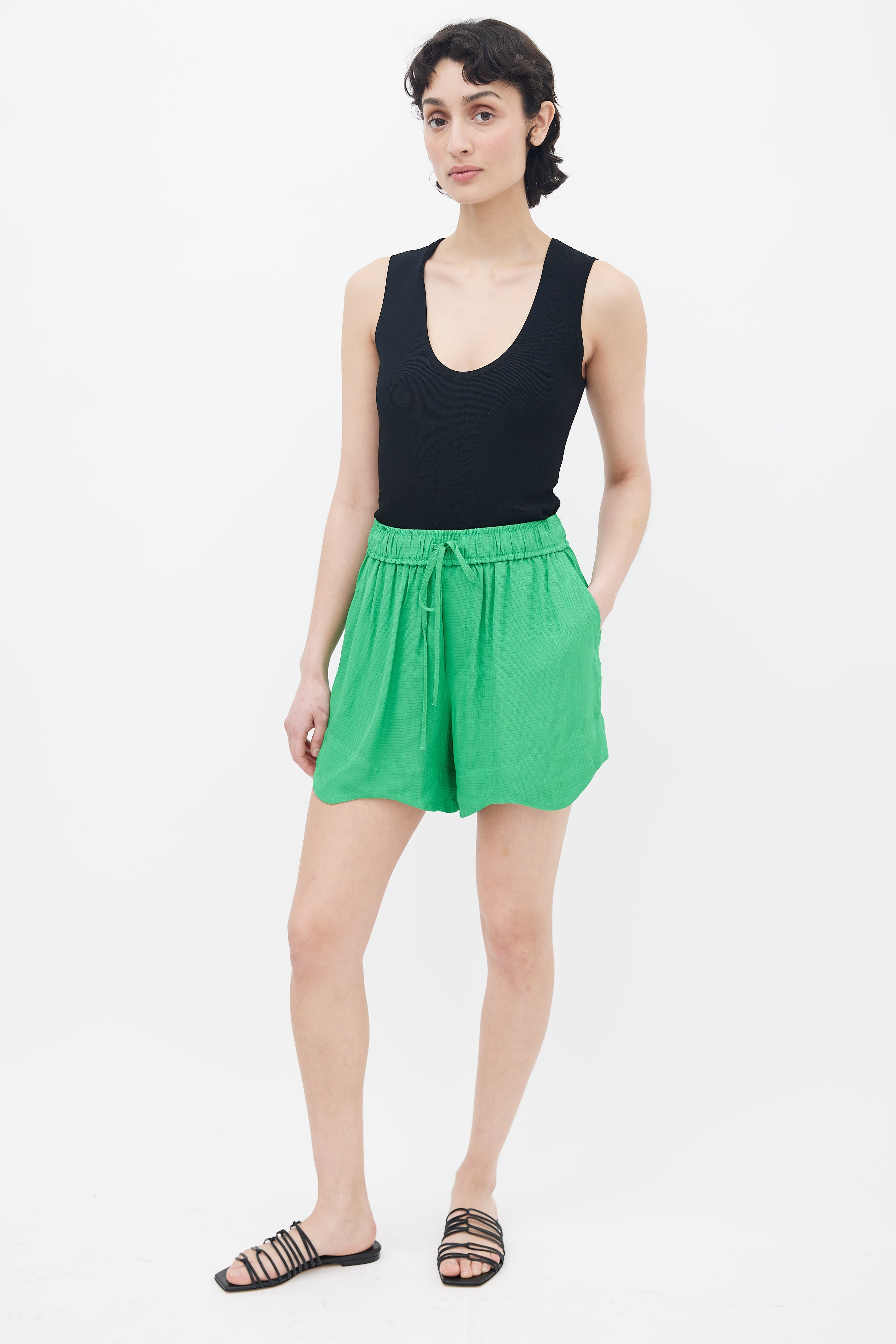 Ganni ripstop short in green featuring elasticized waistband with drawstring fastening, two slash pockets, welt back pocket, and scallop hem.