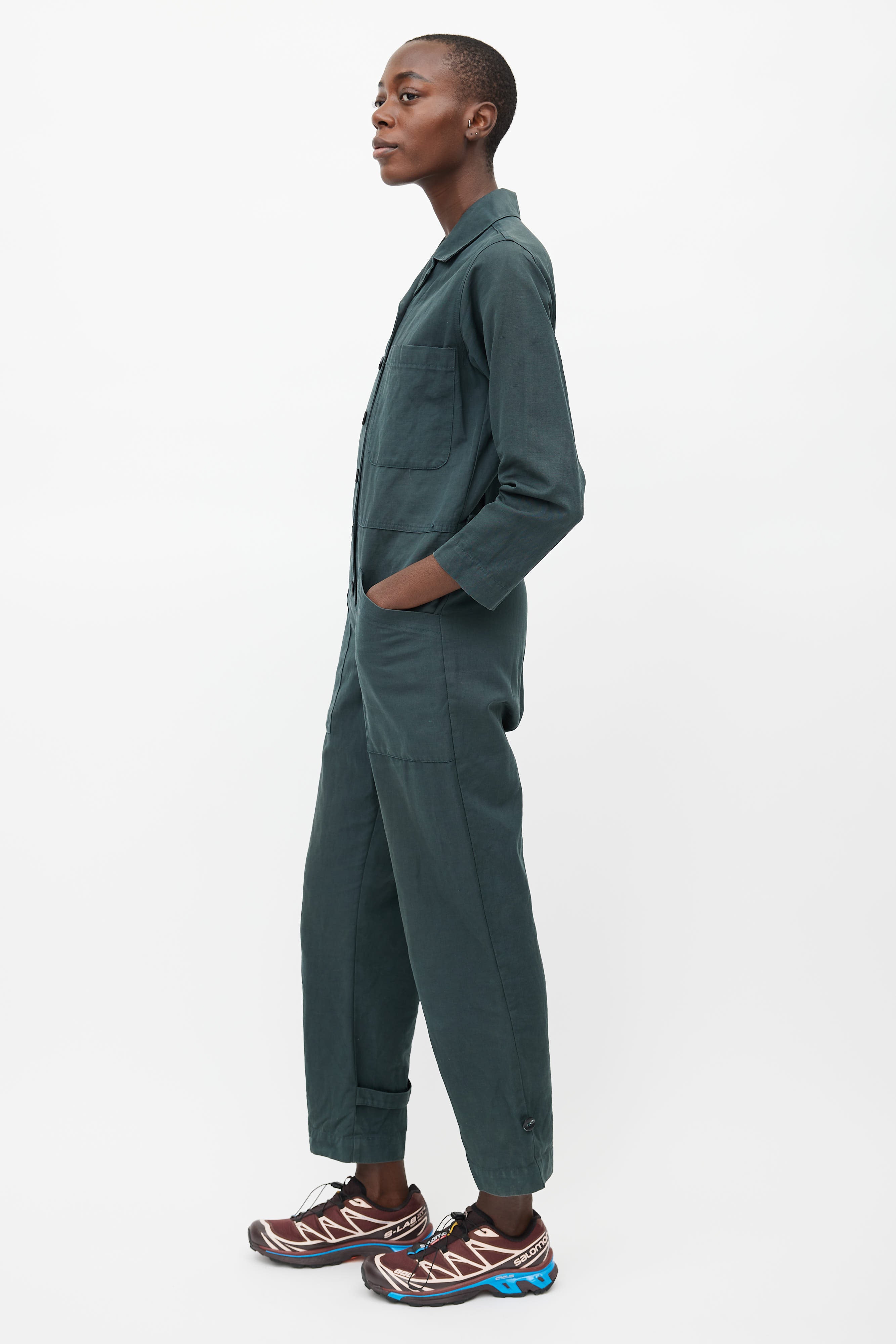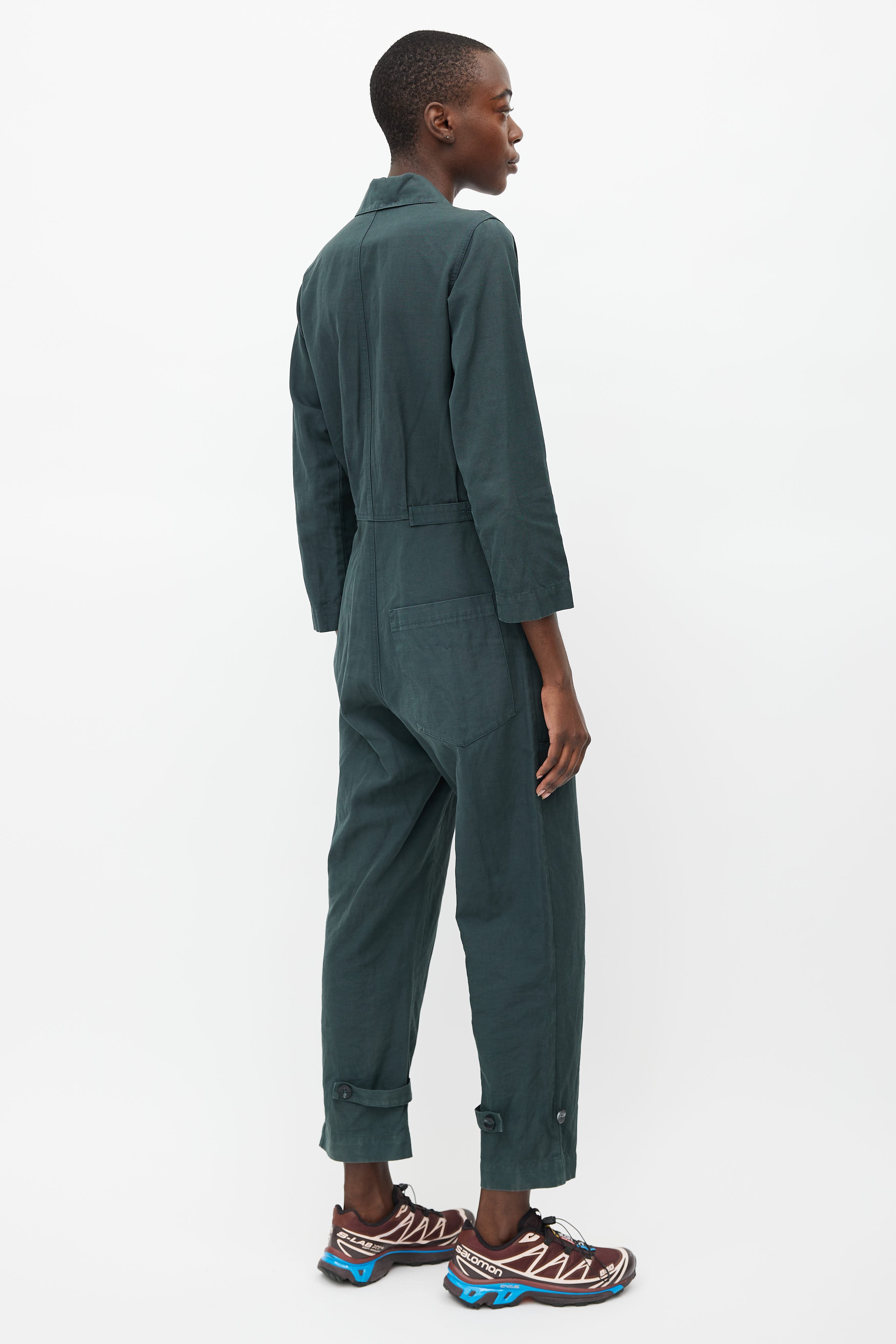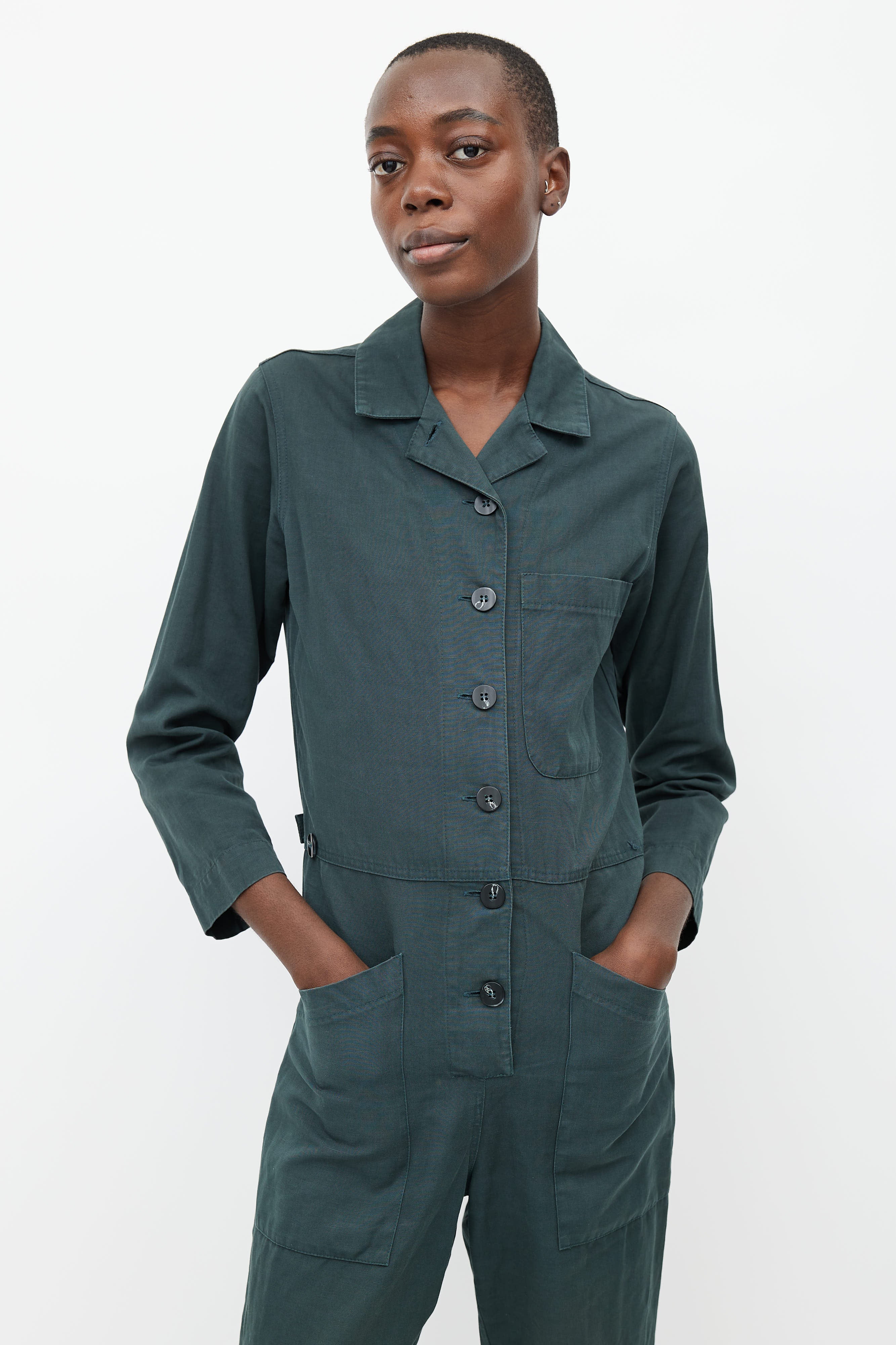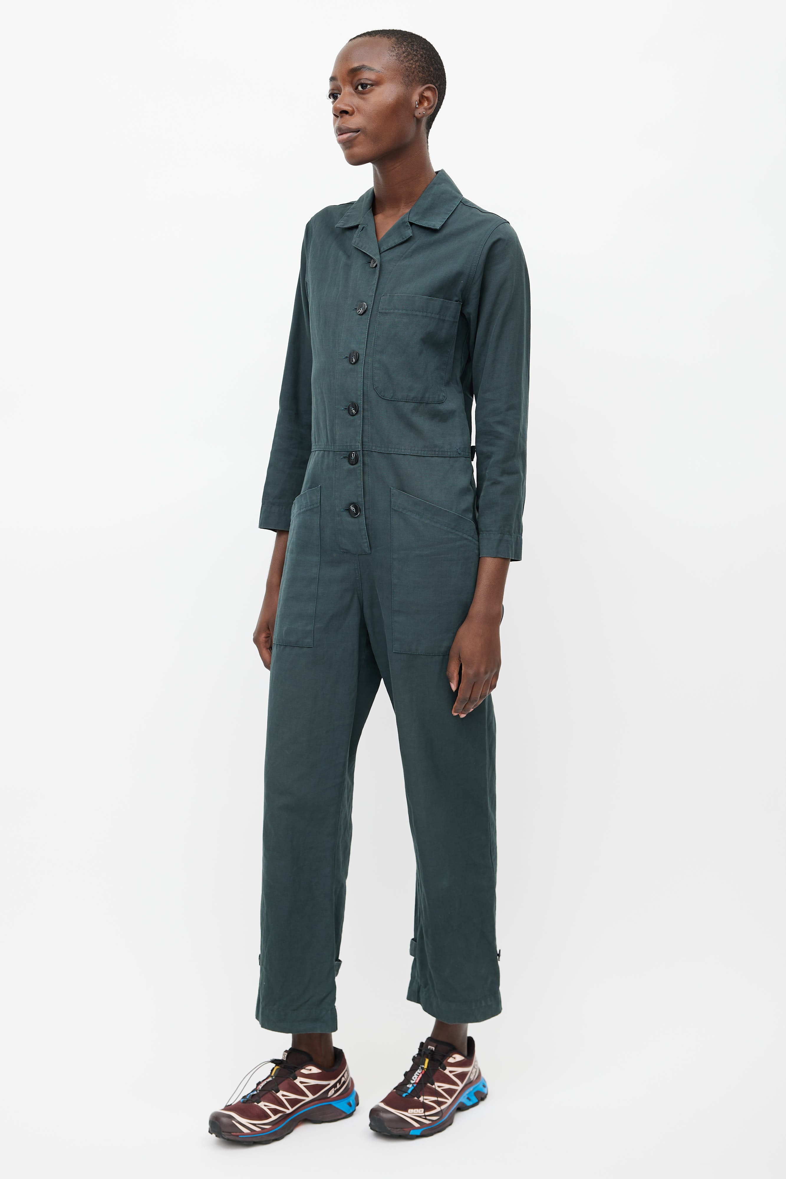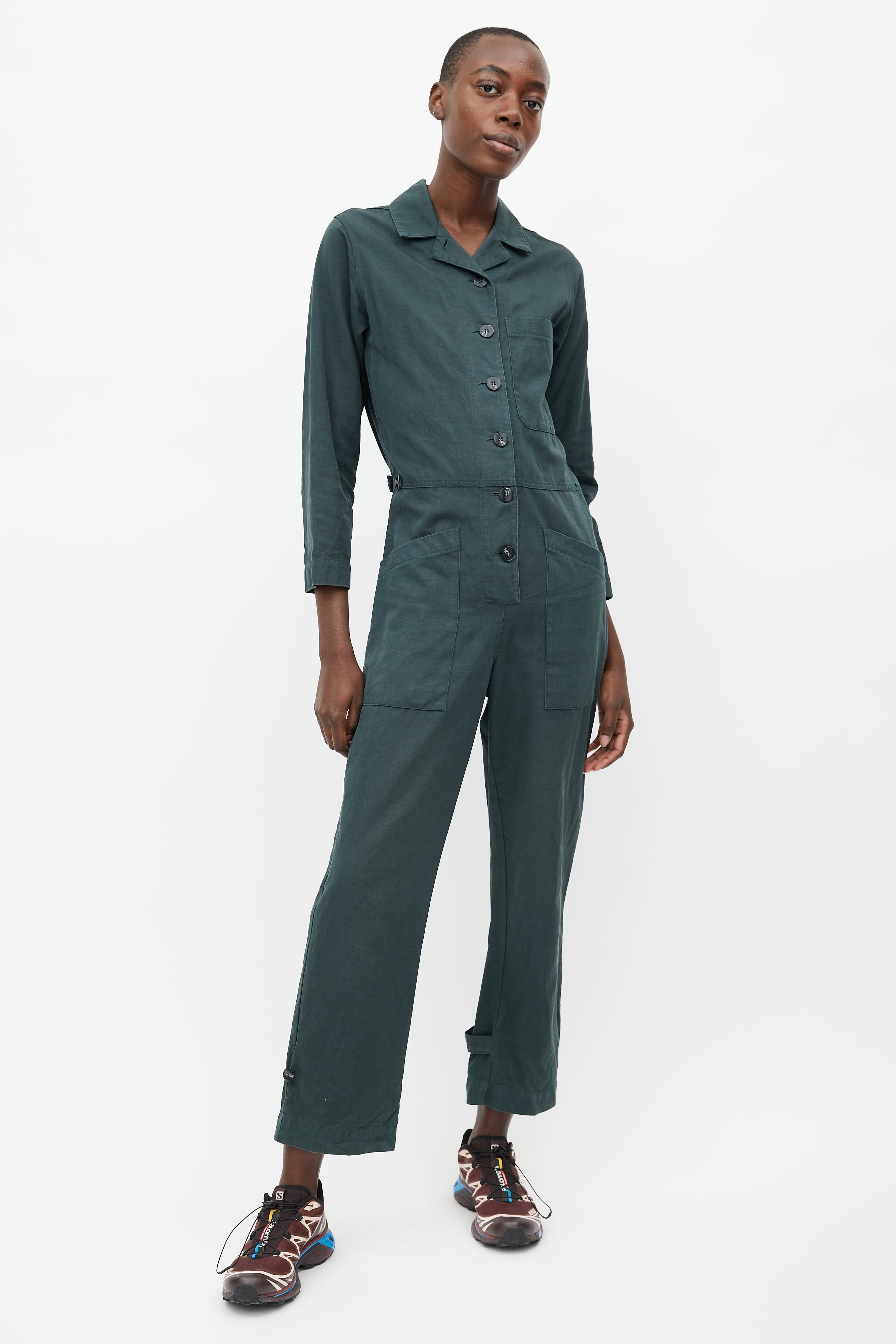 Pre-owned Horses Atelier dark green jumpsuit featuring button up front, camp collar, chest pocket, two oversized hip pockets, one back pocket, buttoned tabs at waist, and adjustable ankle cuffs with button fastening.