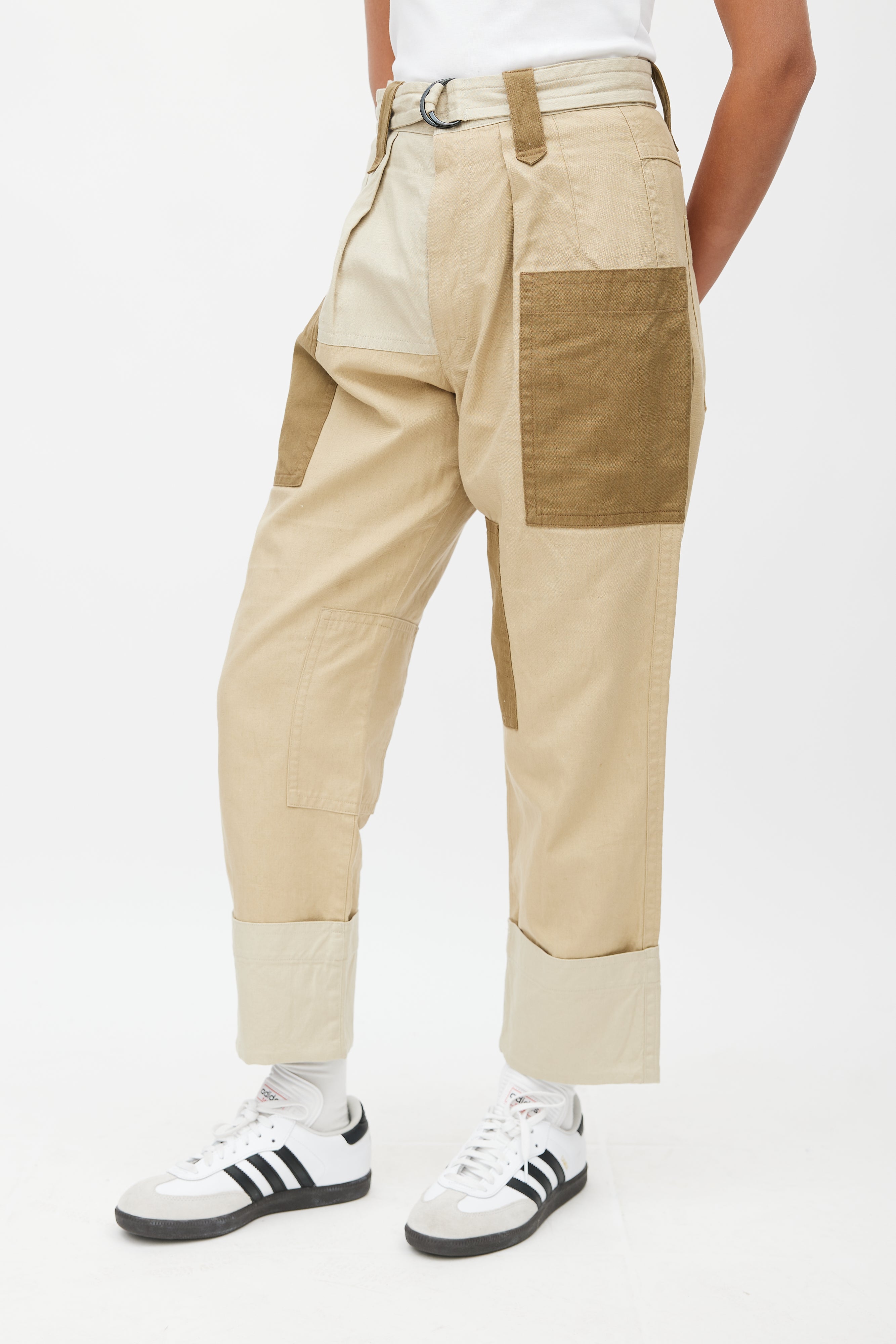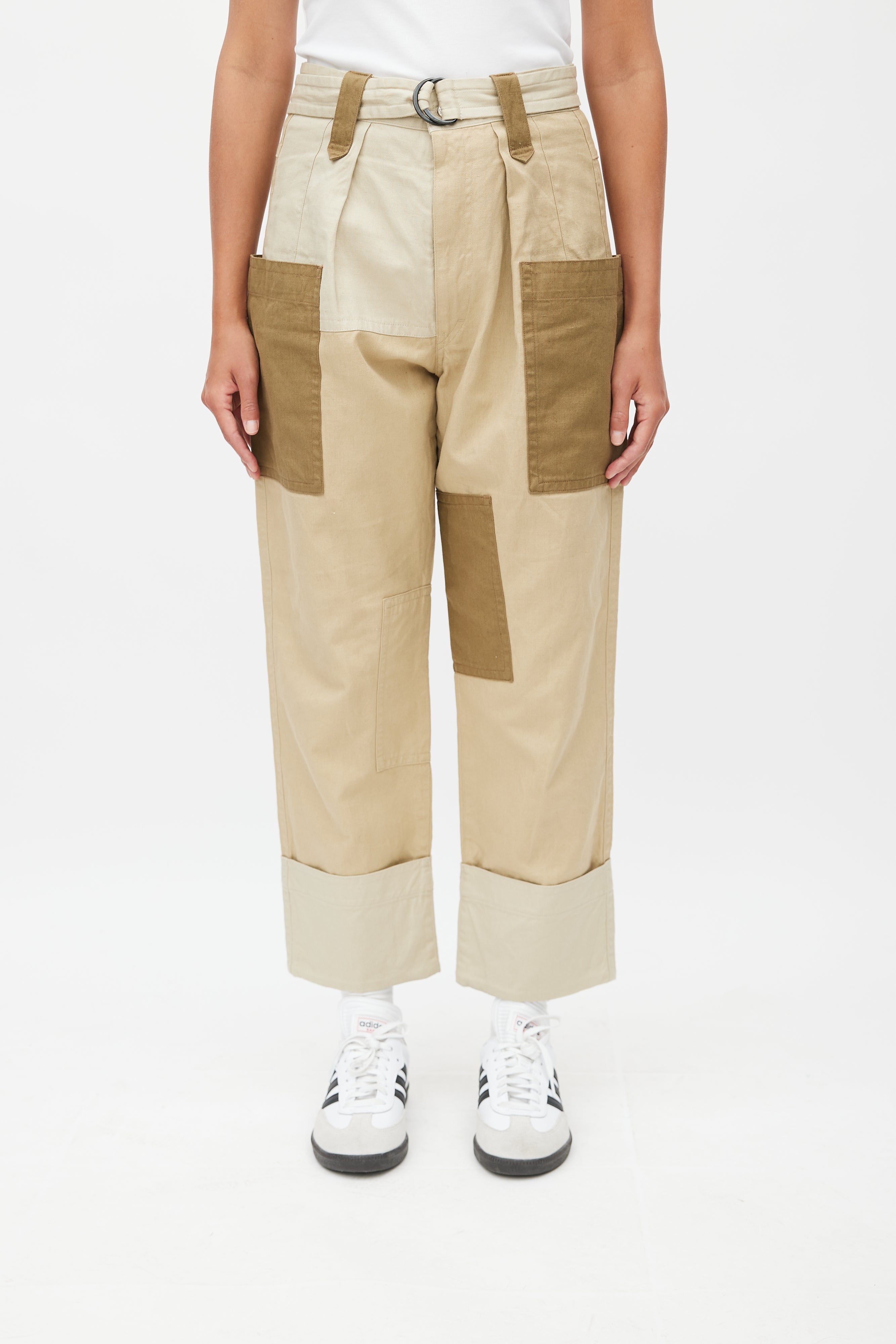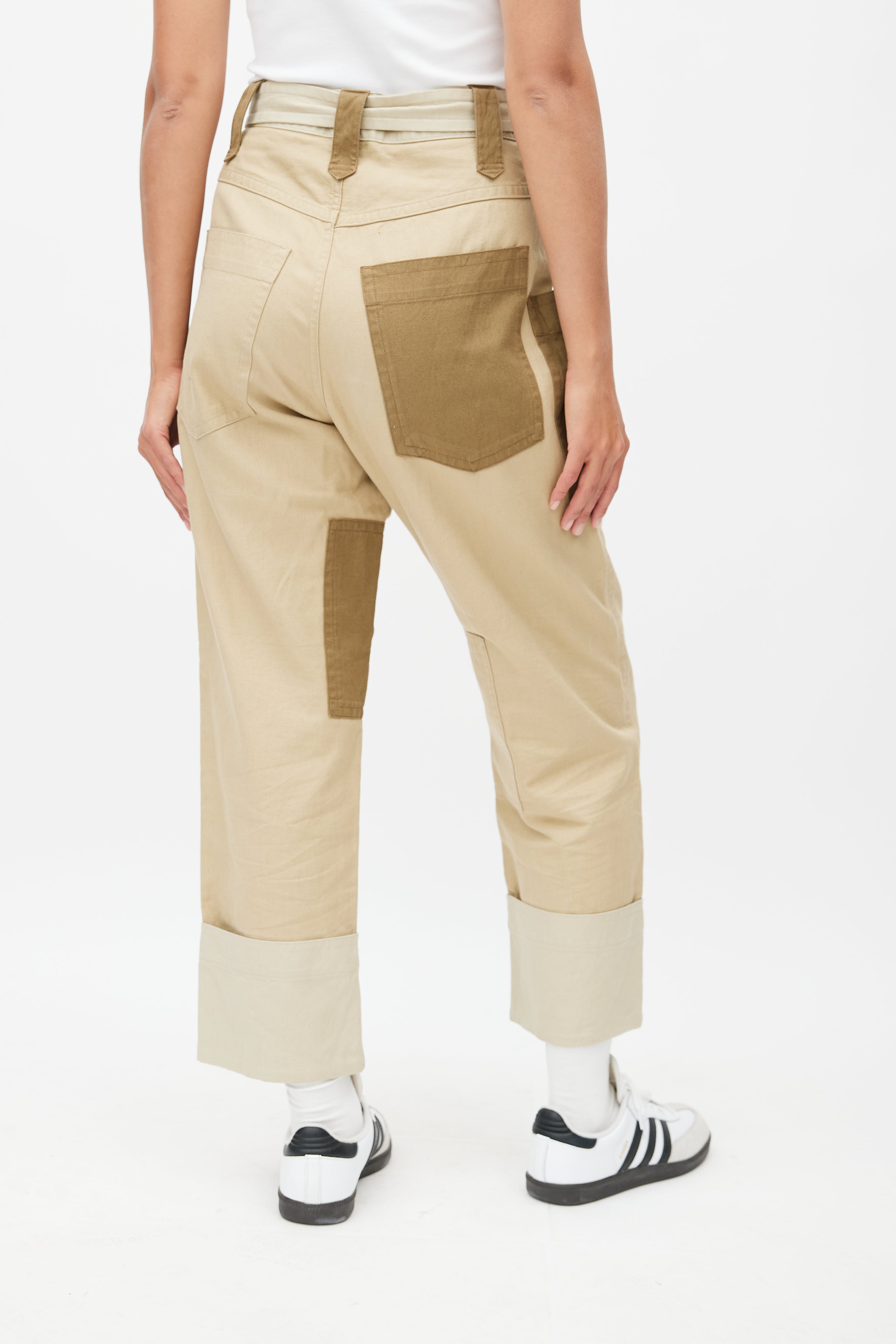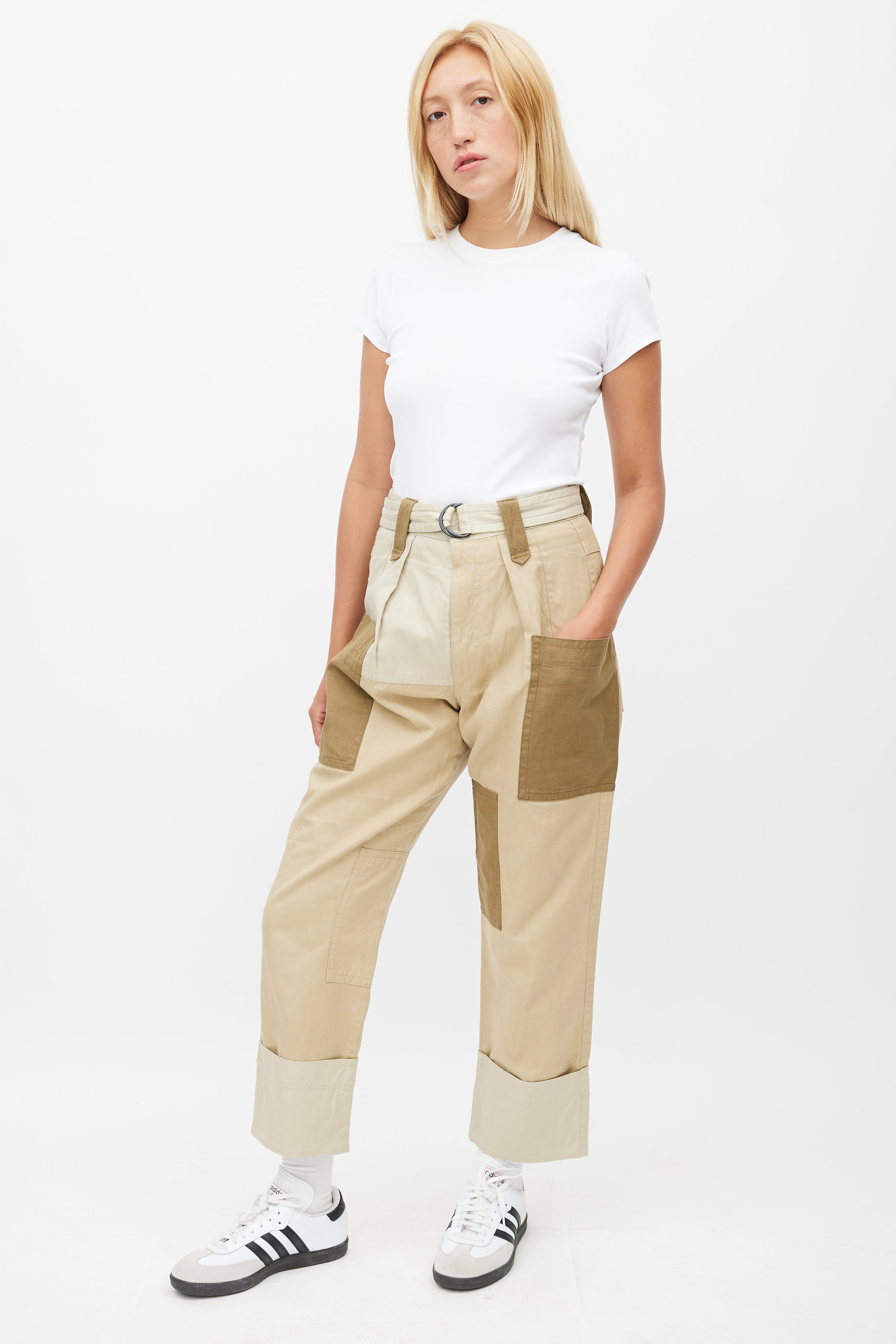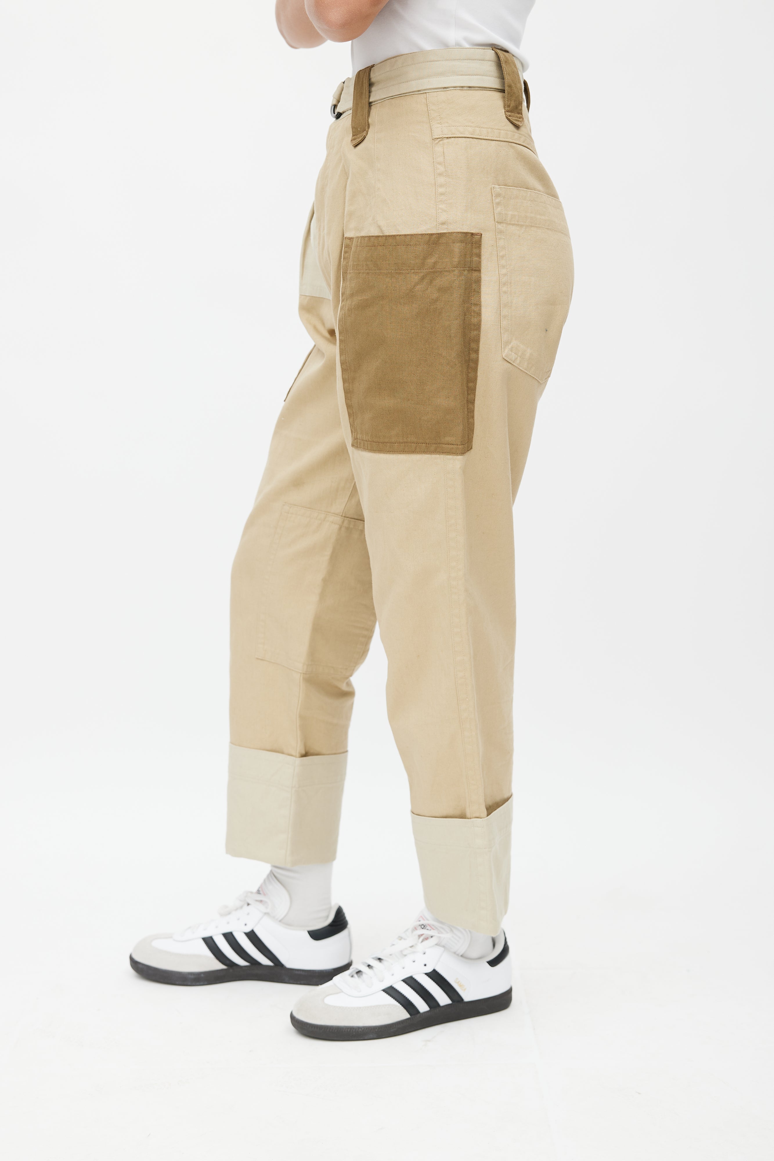 Pre-owned Isabel Marant Étoile beige trousers featuring multicolour patches throughout, two slip pockets at hip, two patch pockets at back, cuffed hem, adjustable belt at waist, and zip fly with button closure.