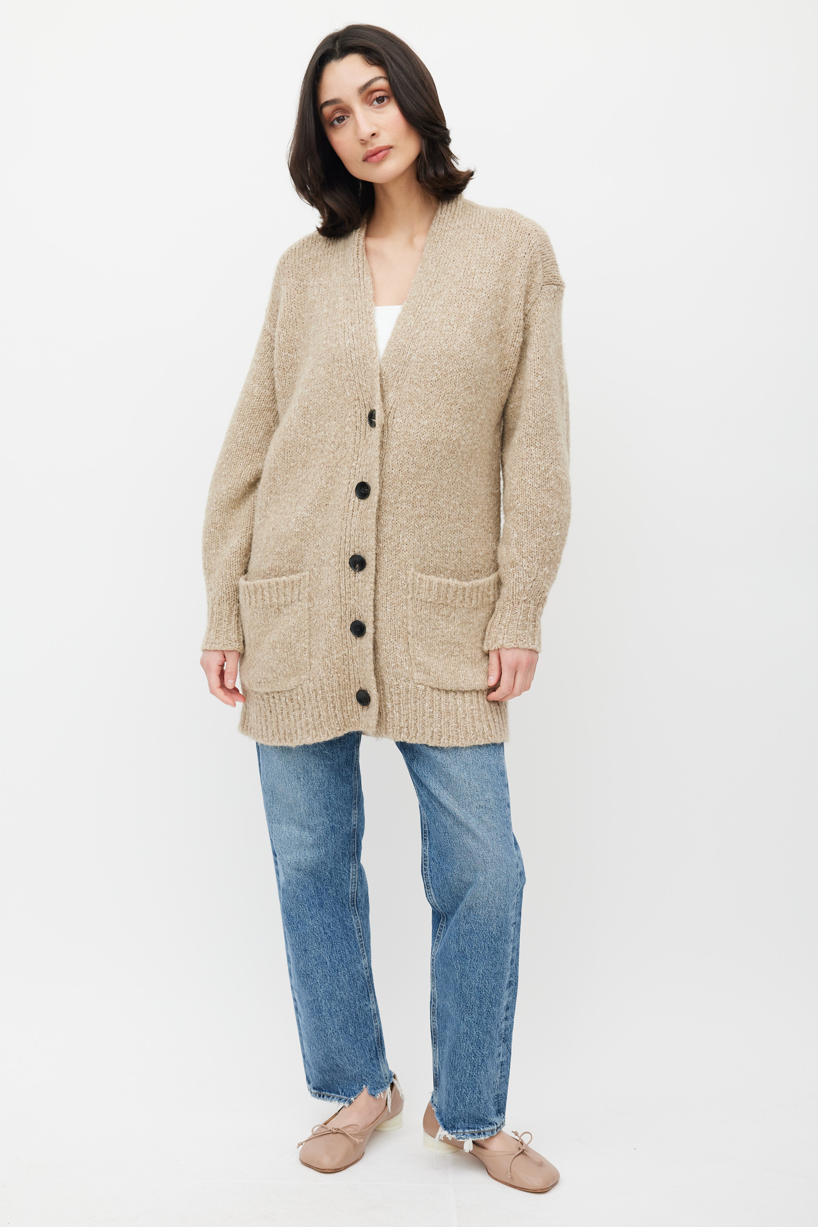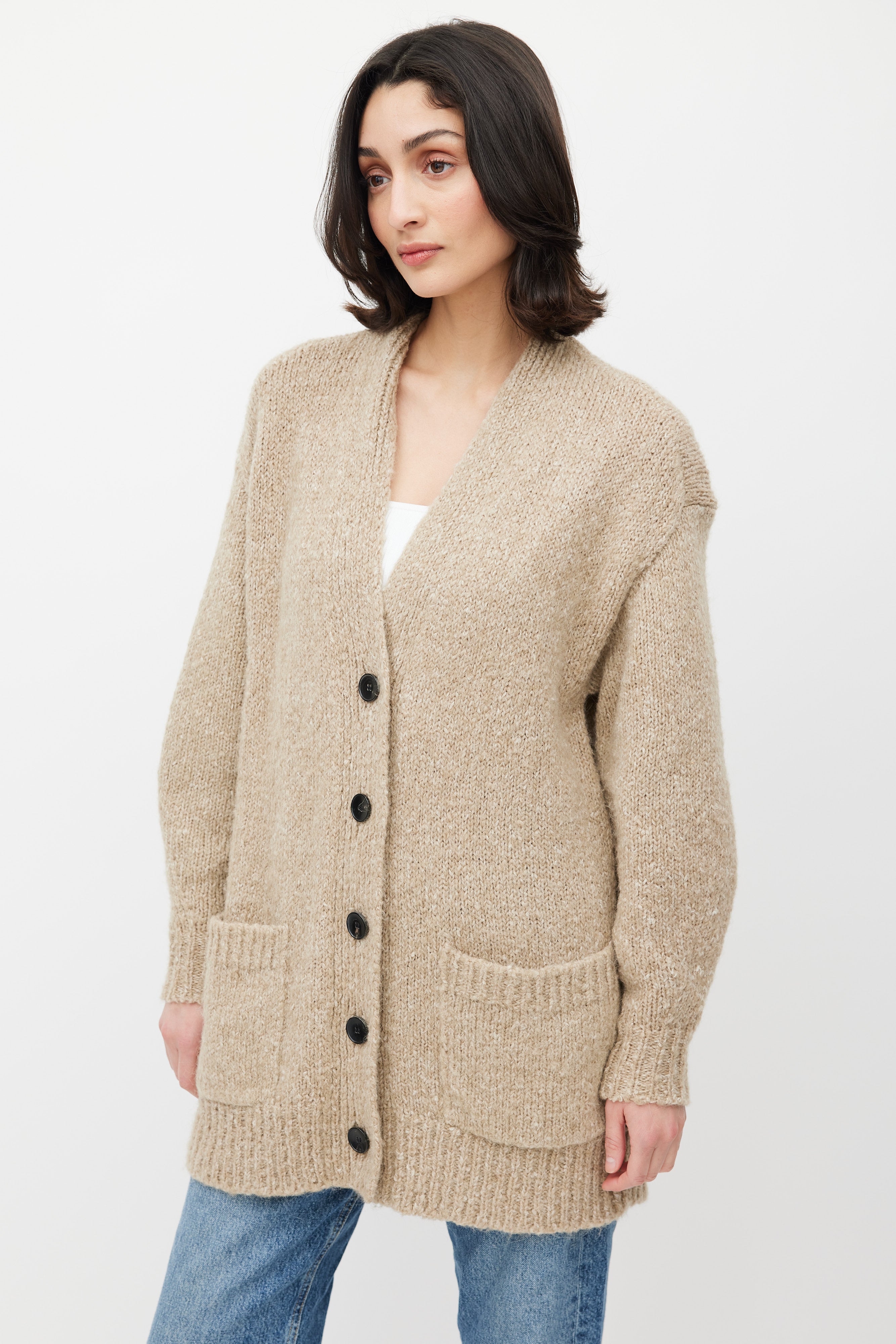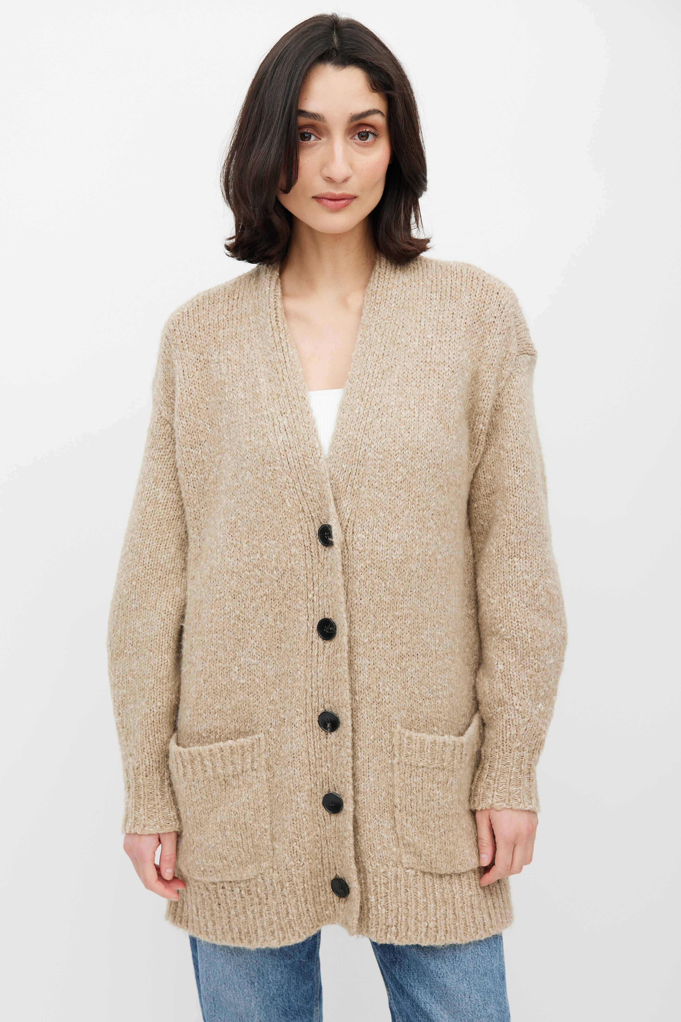Pre-owned Isabel Marant Étoile beige Scott knit cardigan featuring V-neck, black button up front, two patch pockets at front, and ribbed cuffs and hem.