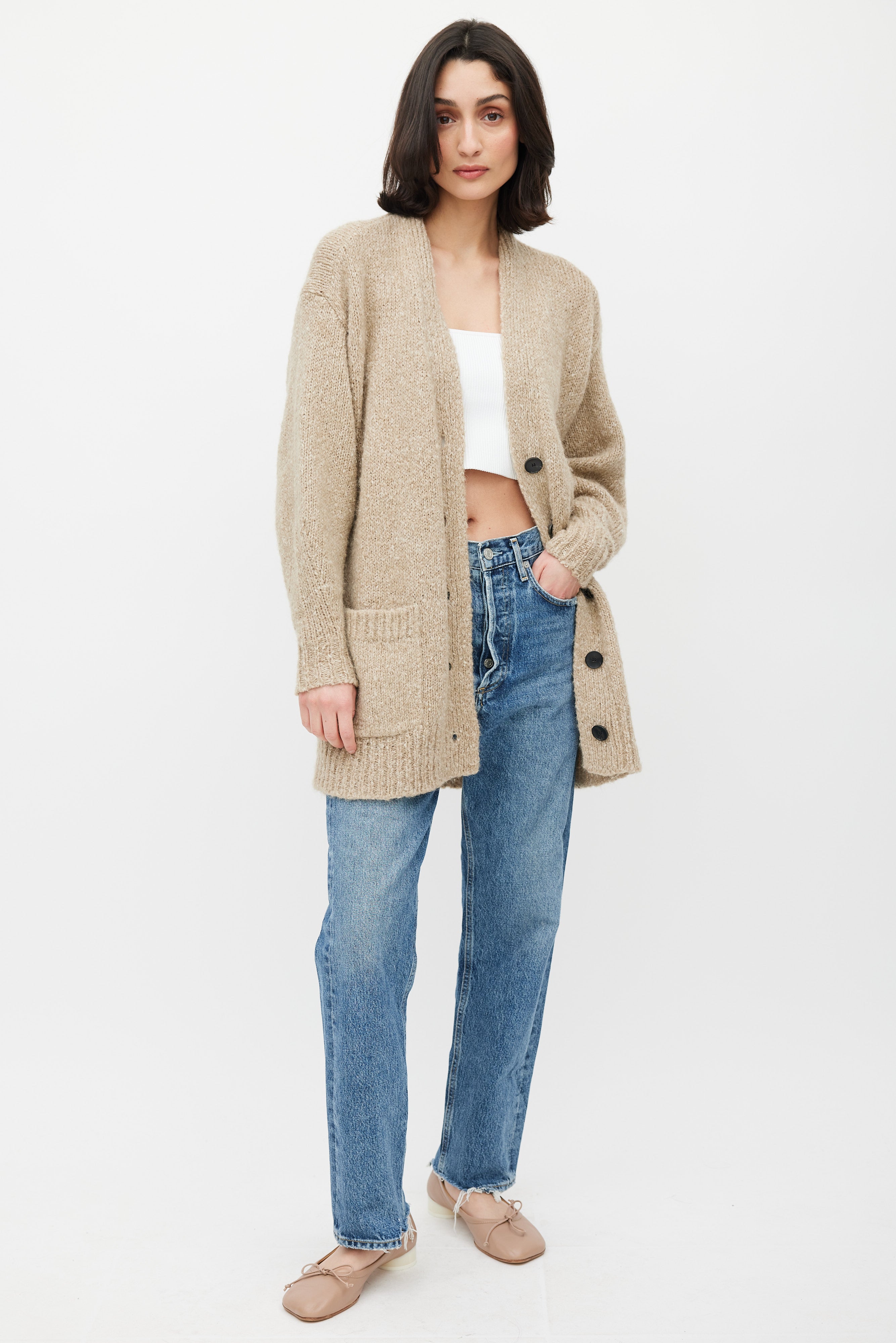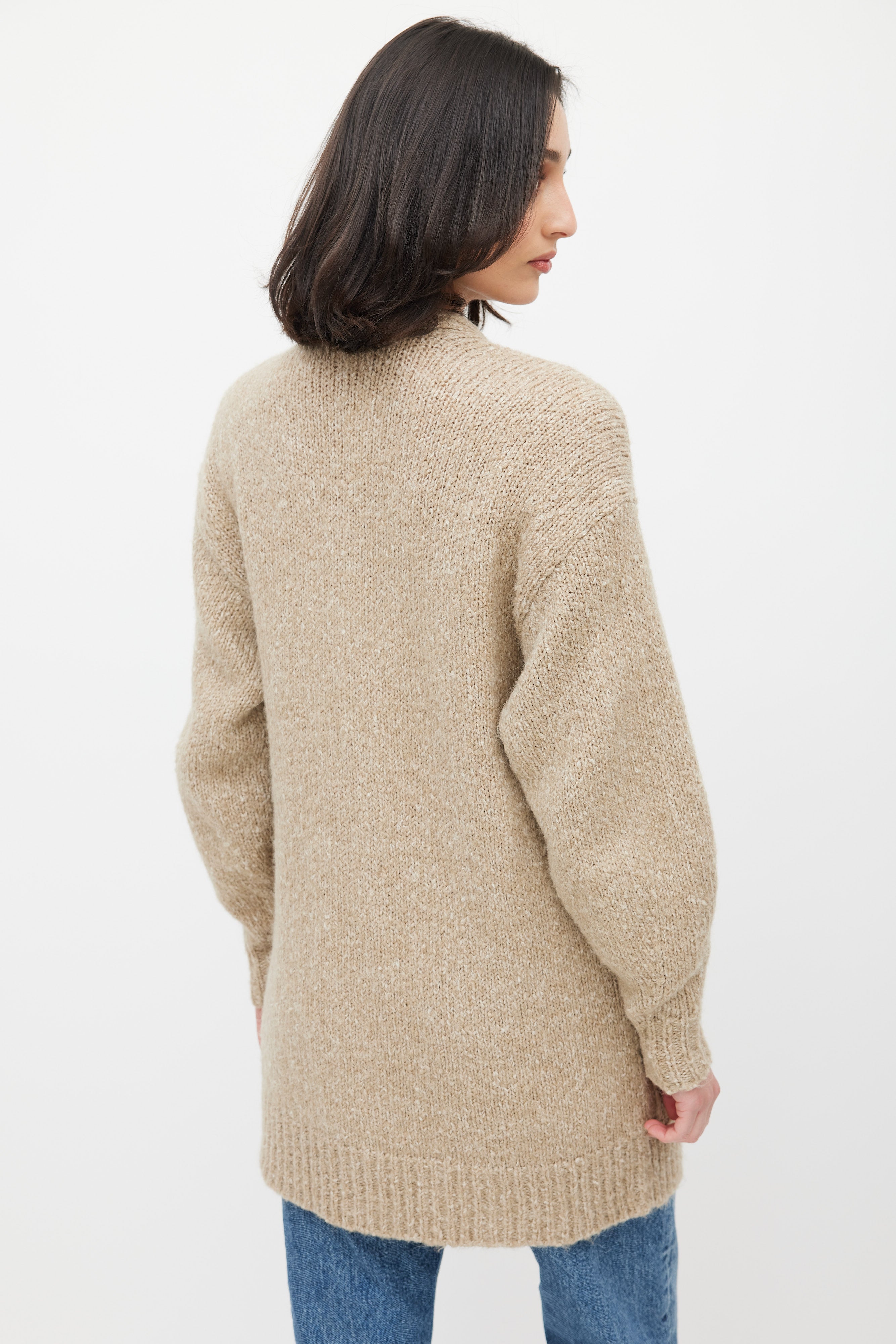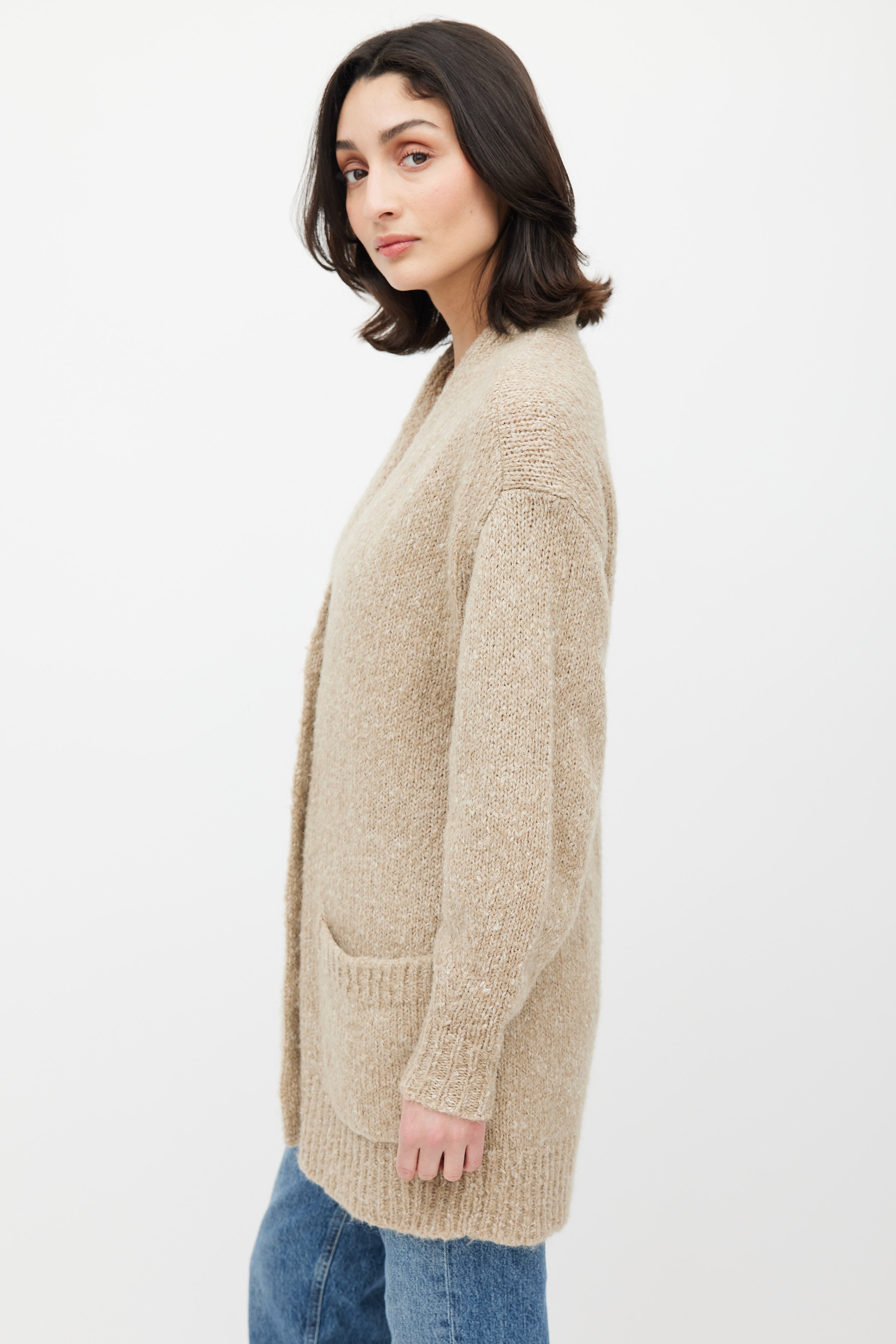 Pre-owned Isabel Marant Étoile beige Scott knit cardigan featuring V-neck, black button up front, two patch pockets at front, and ribbed cuffs and hem.