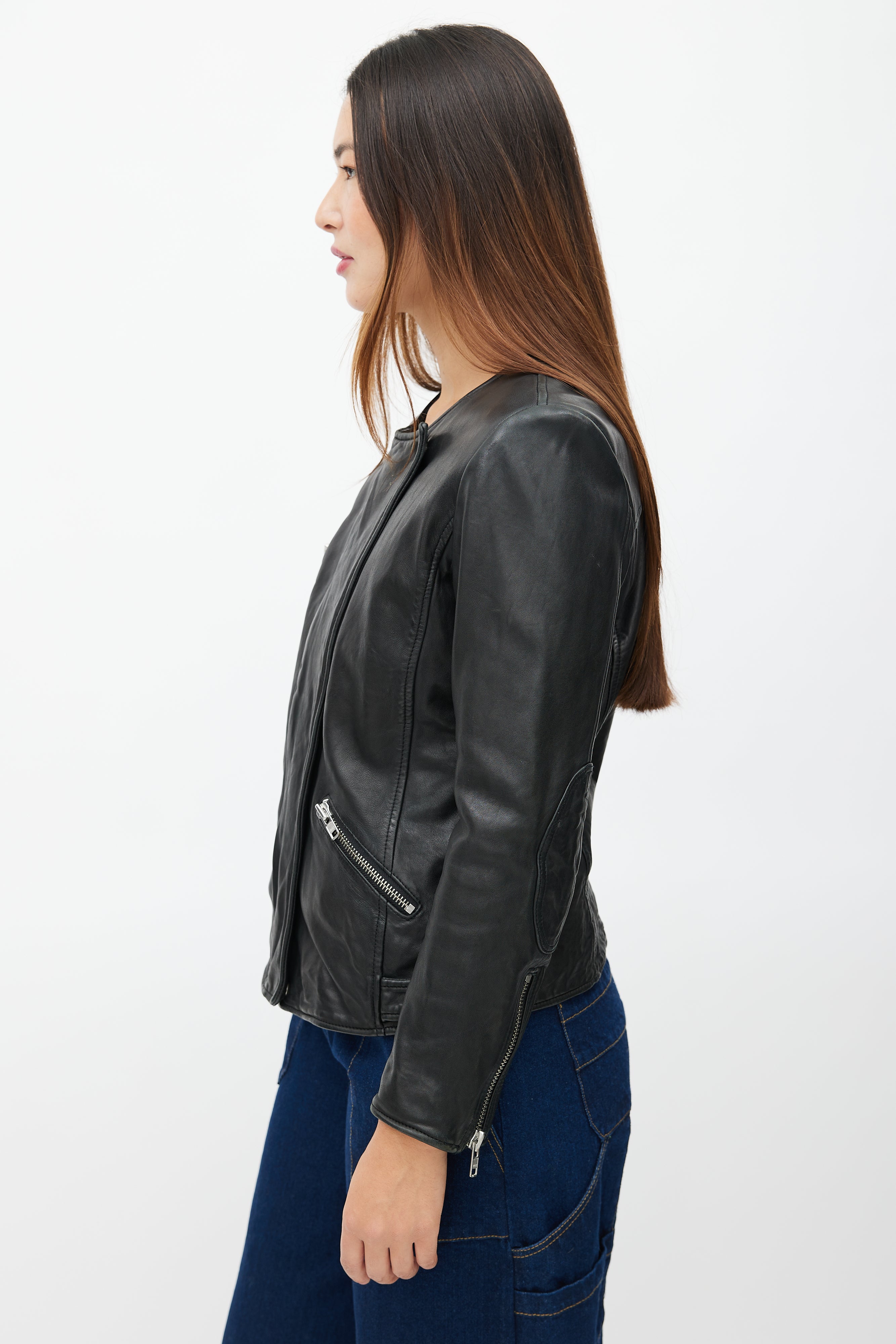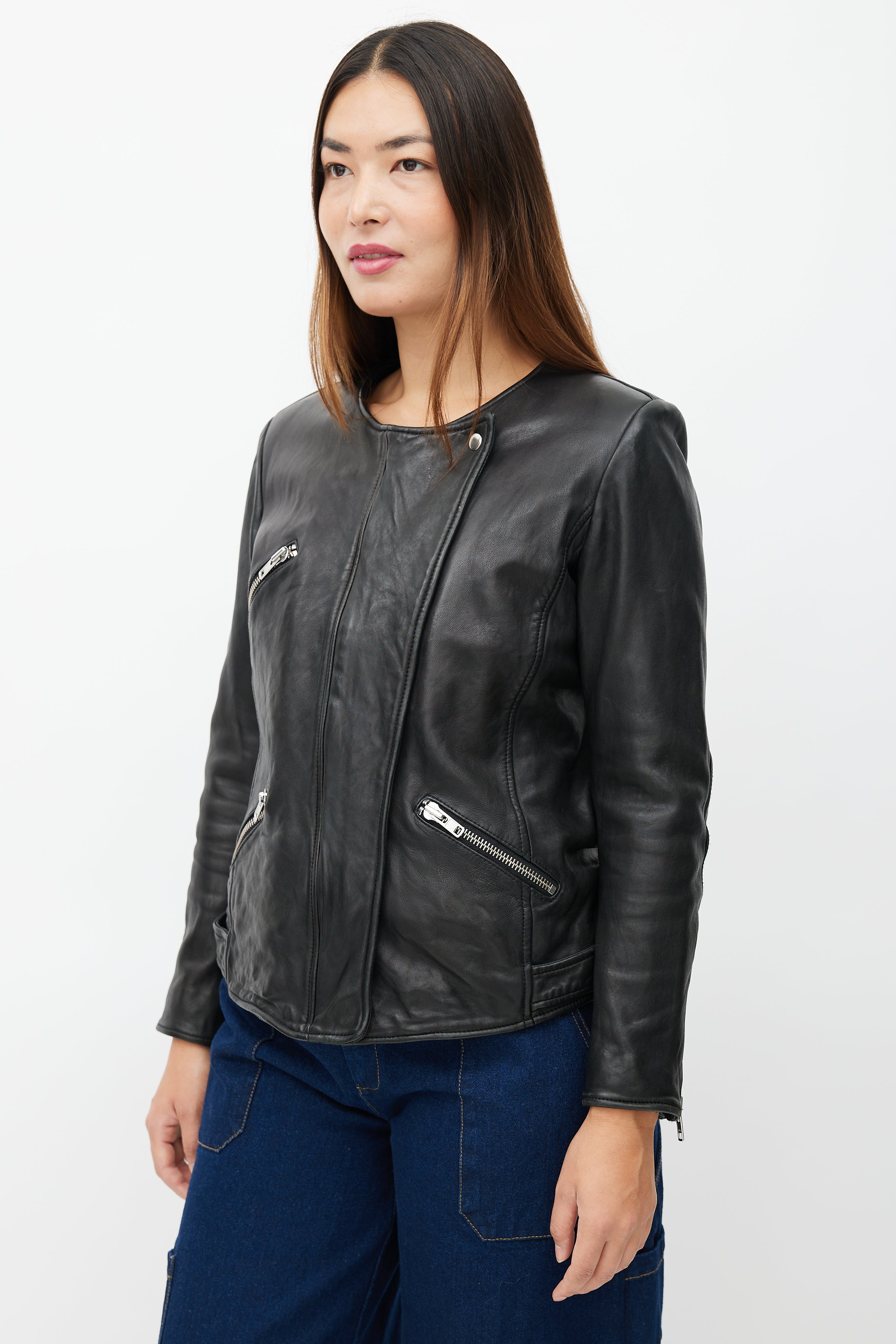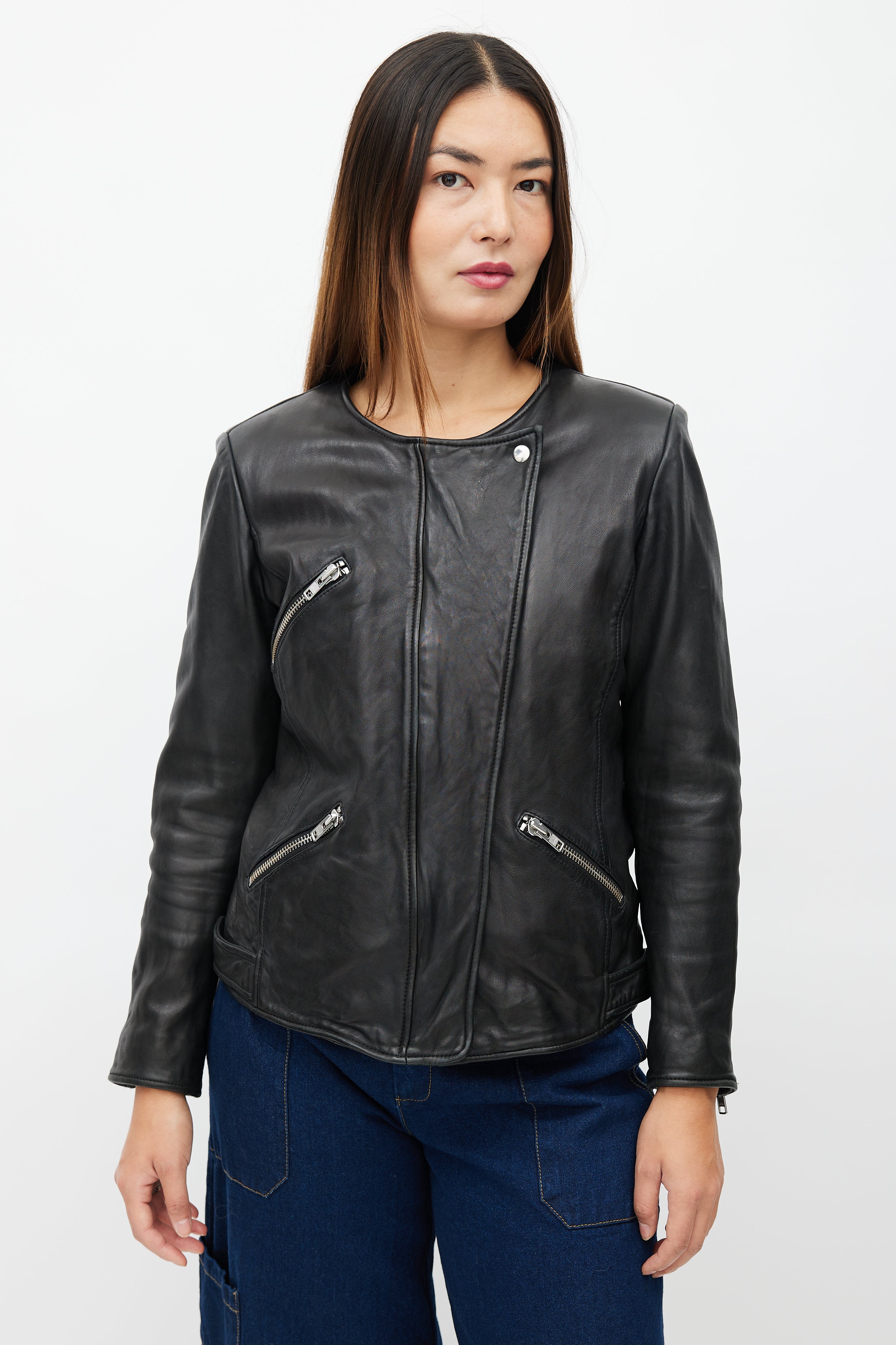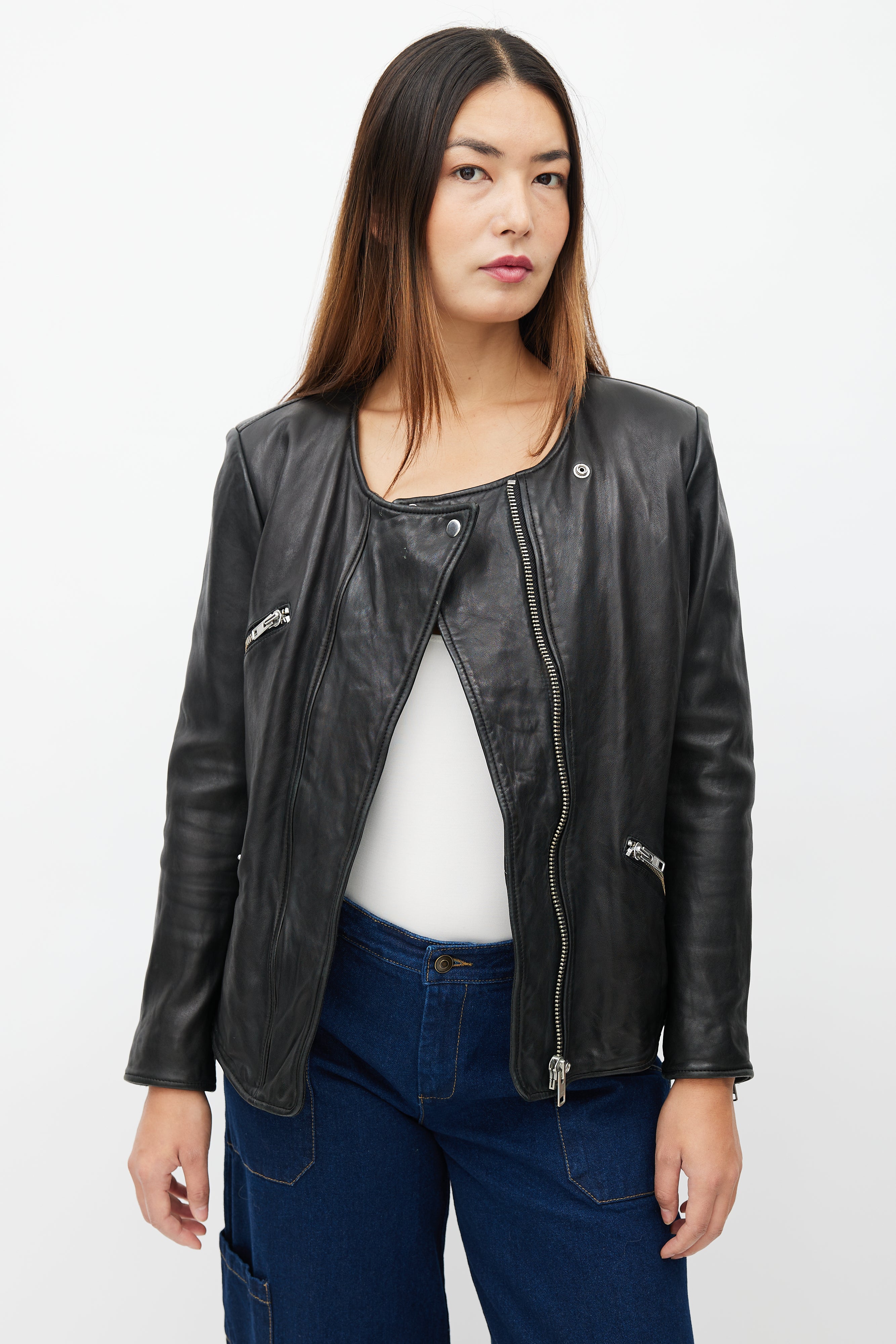 Pre-owned Isabel Marant Étoile black leather jacket featuring concealed zip up front, round neckline, three zip pockets, zipped cuffs, buttoned waist, tonal knee pads, and yellow satin padded lining.