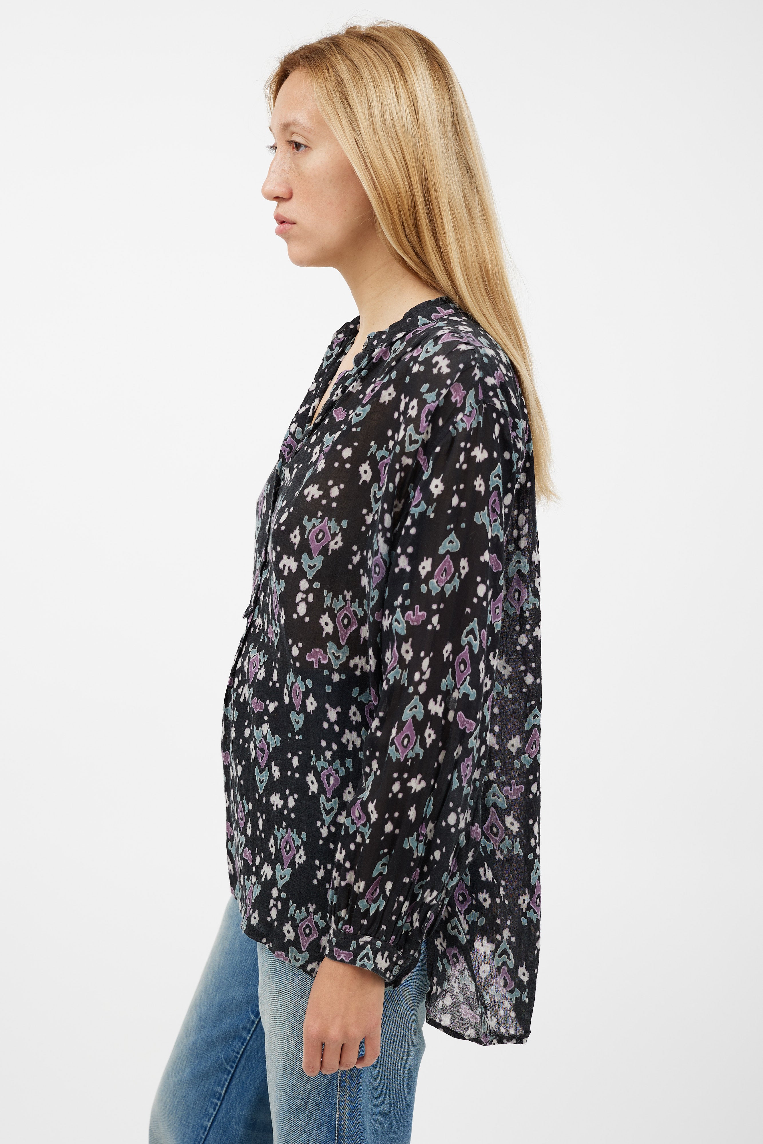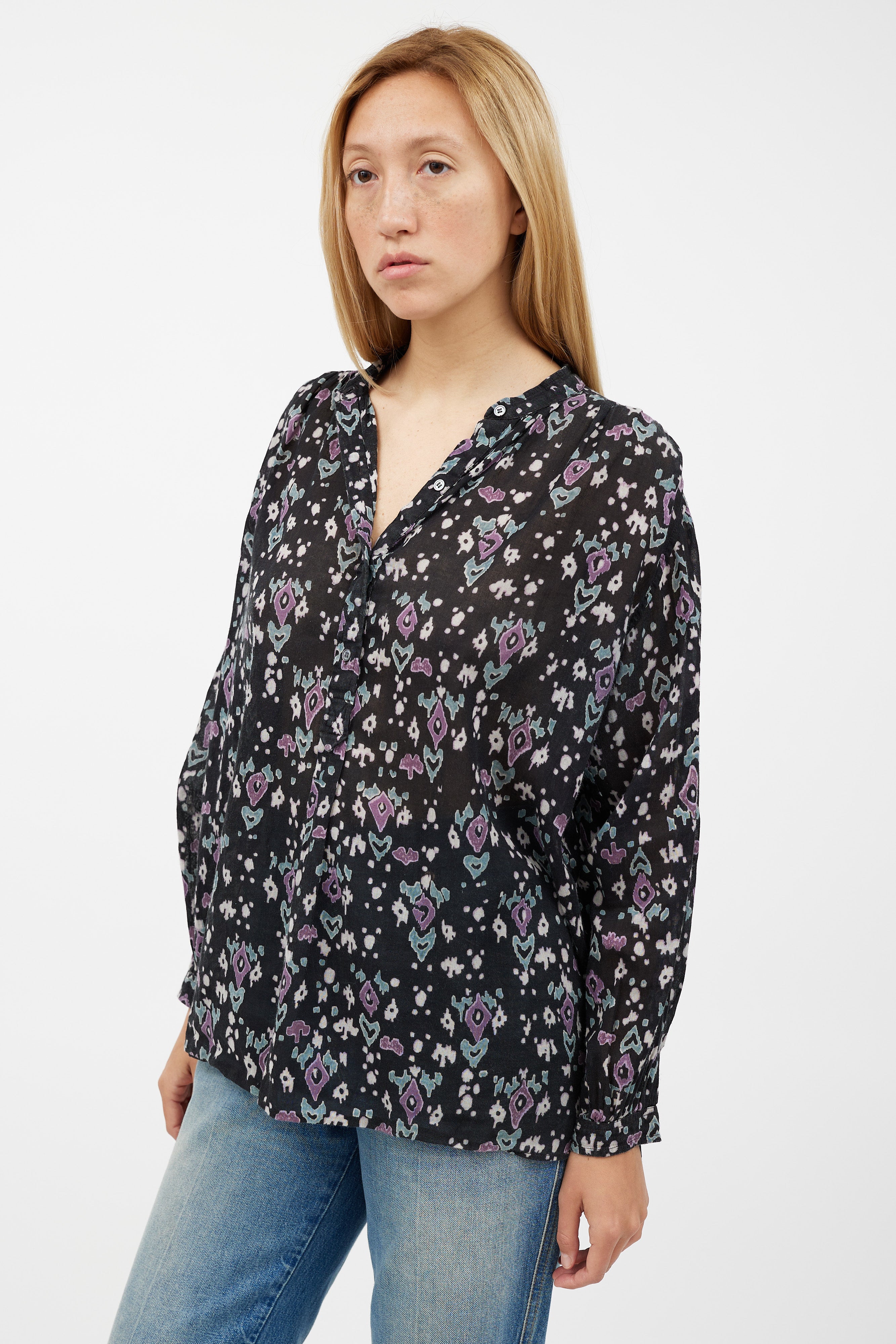Pre-owned Isabel Marant Étoile black top featuring a purple pattern throughout, round neckline, long sleeves with gathered cuffs, and quarter button up closure.