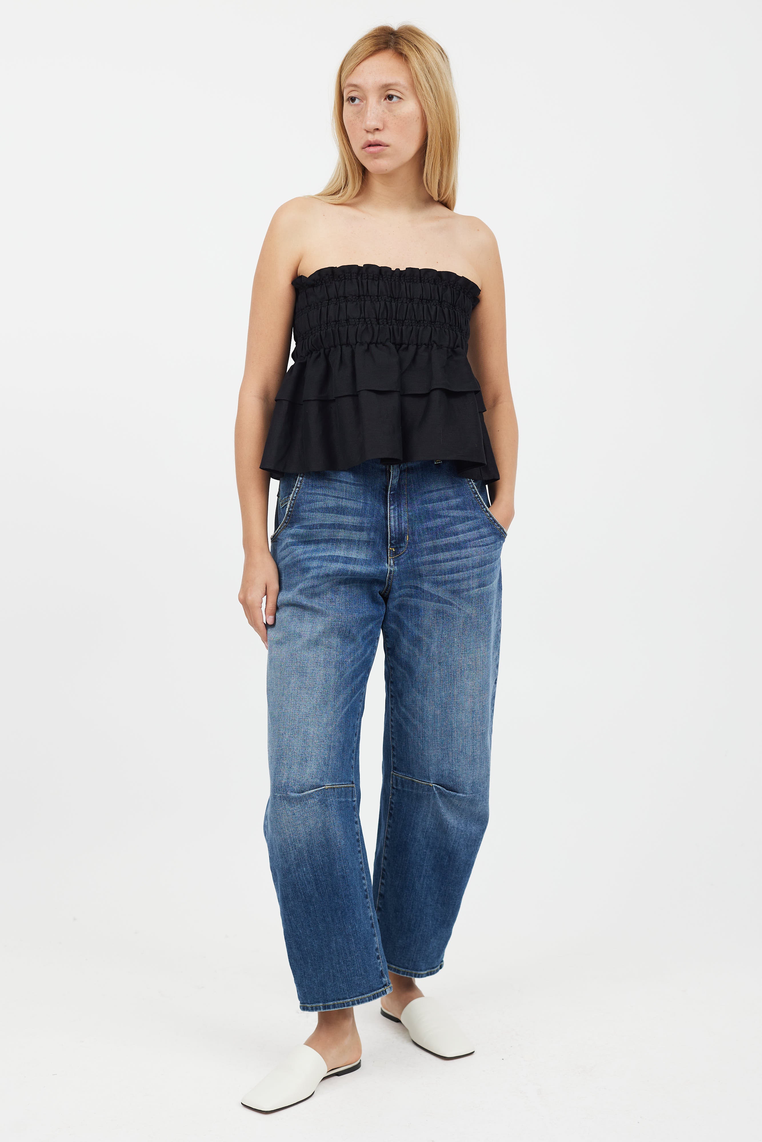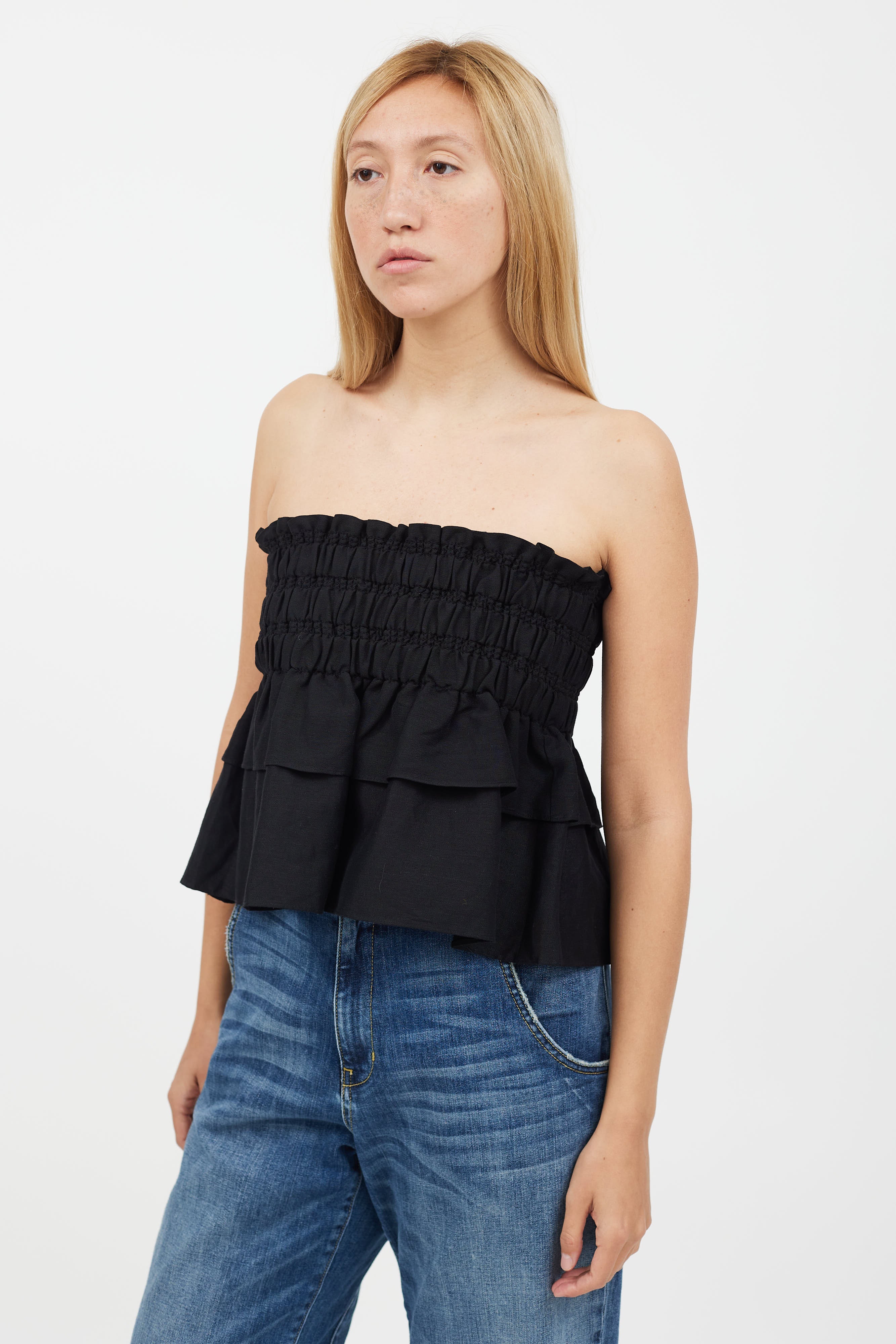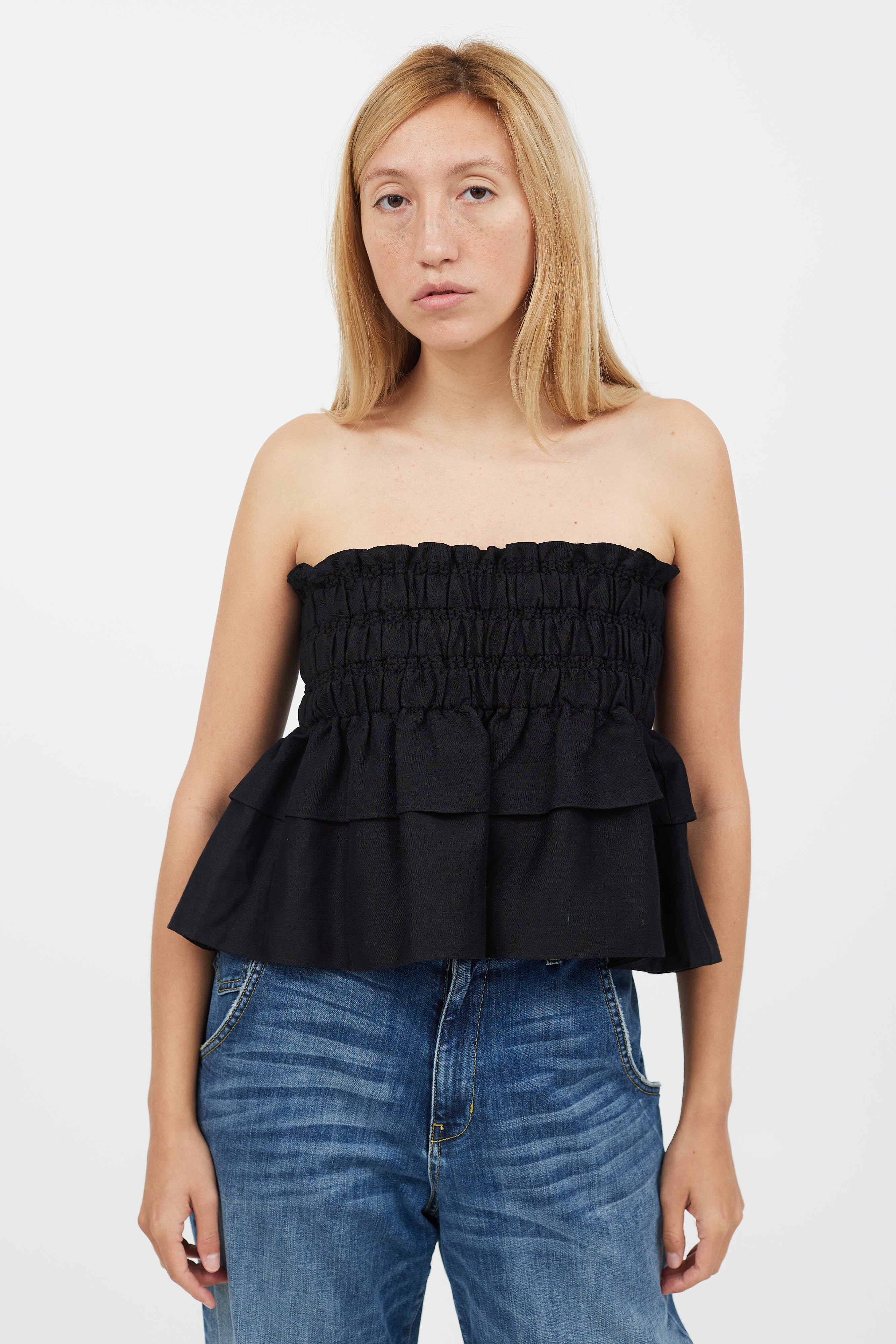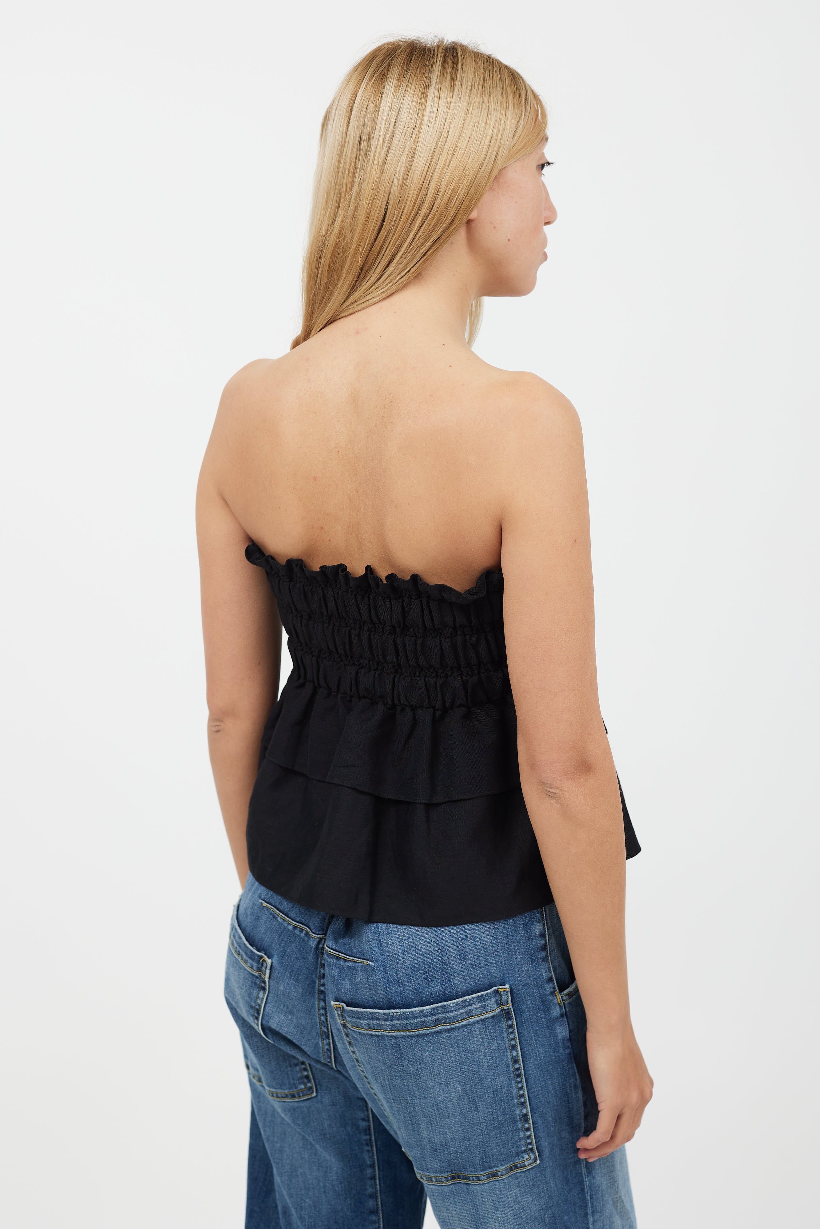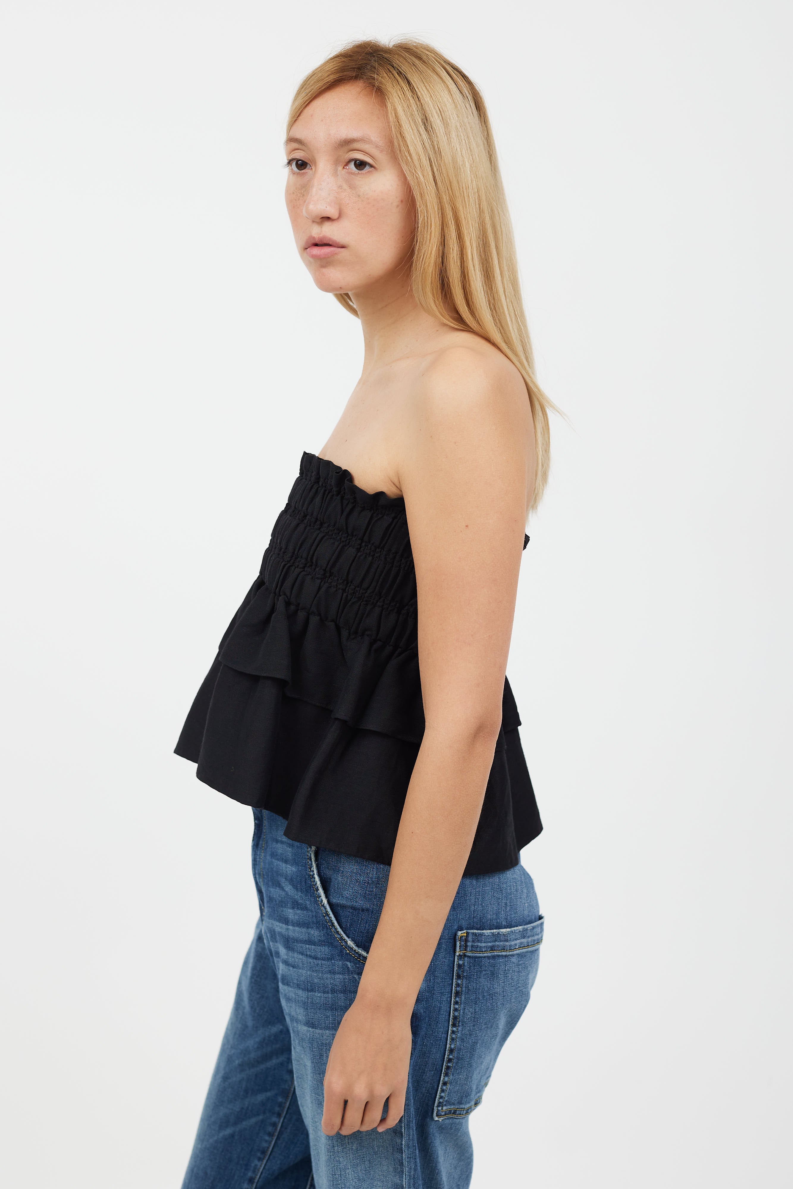 Pre-owned Isabel Marant Étoile black strapless linen top featuring thick ruched band at waist and tiered ruffle layers.