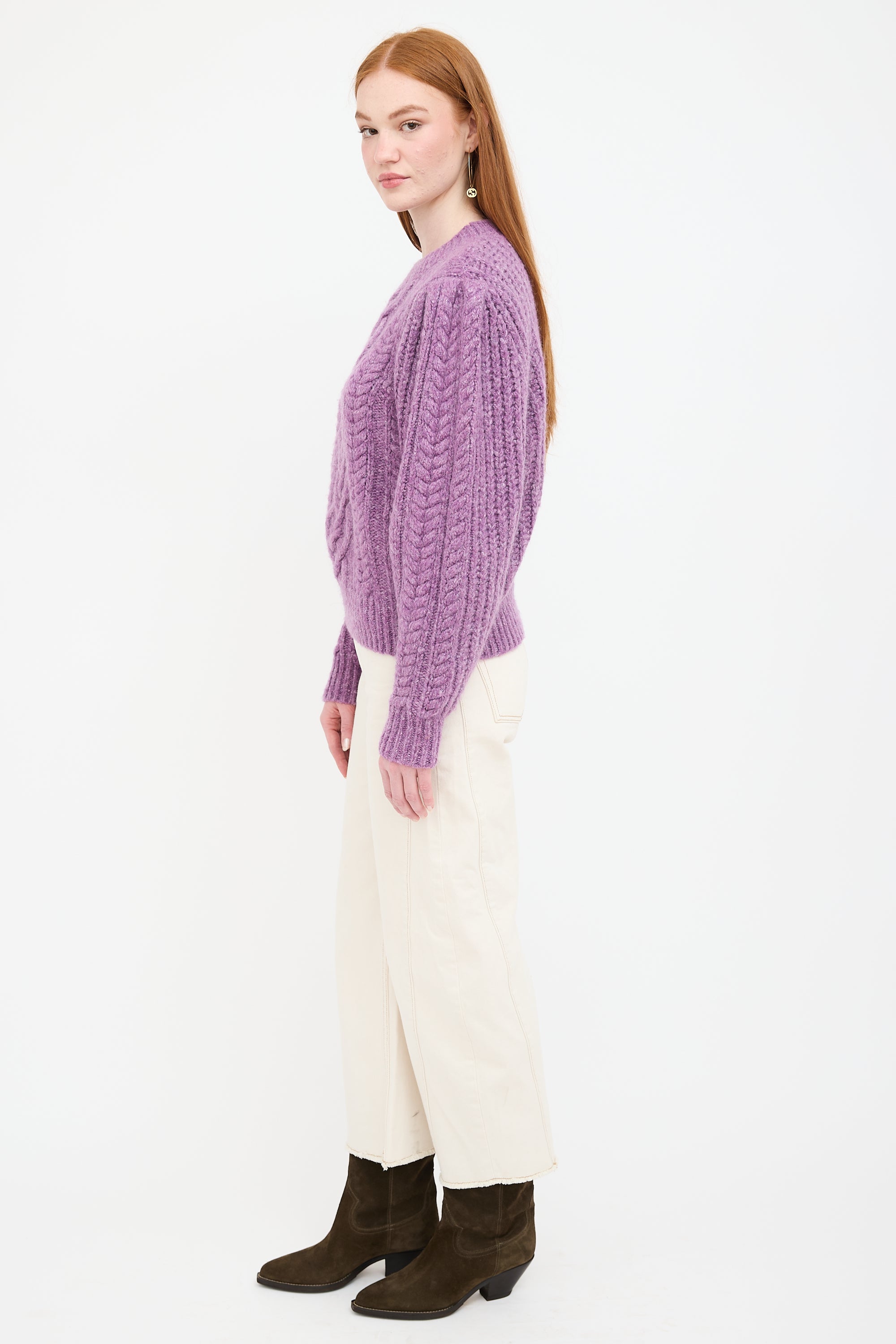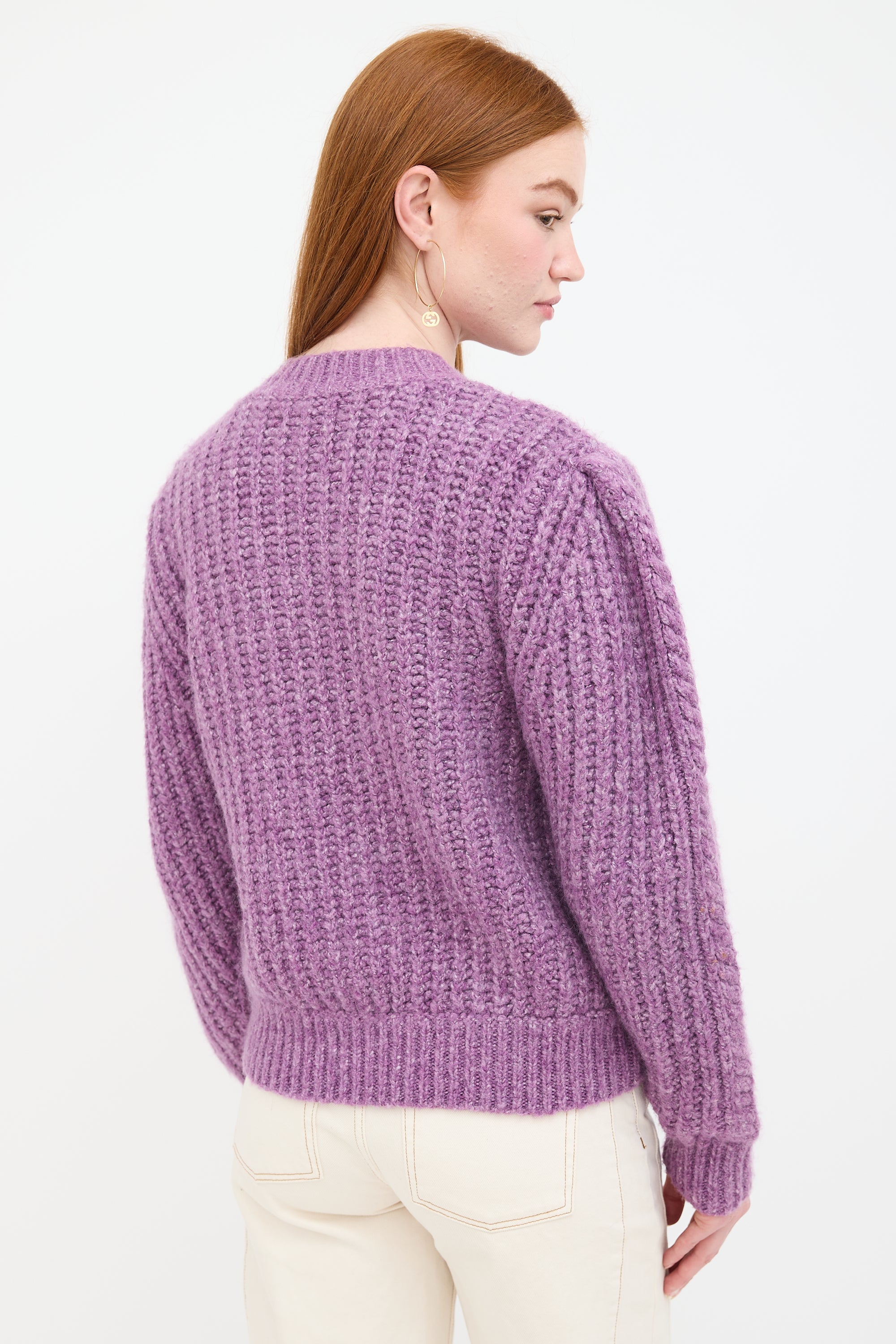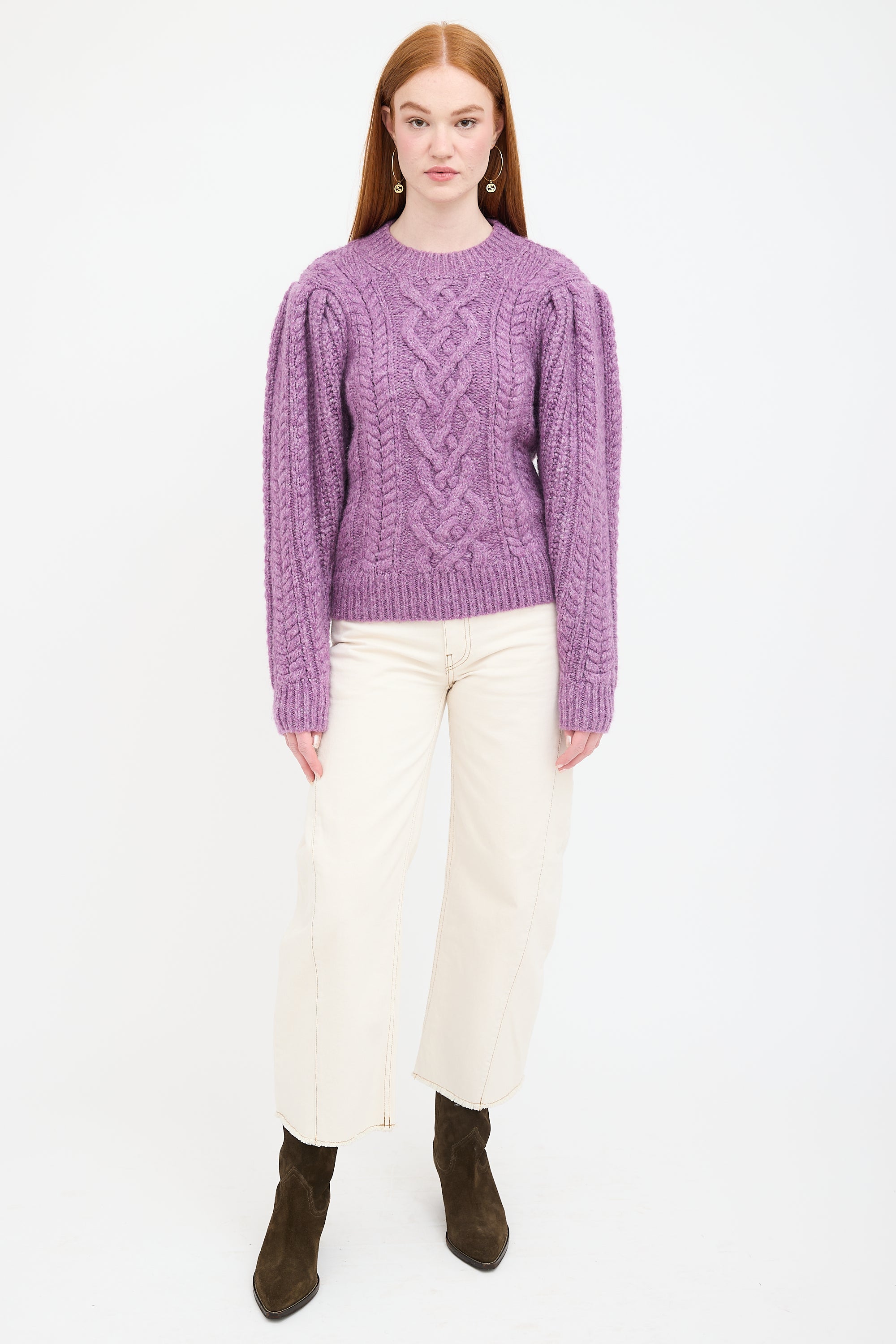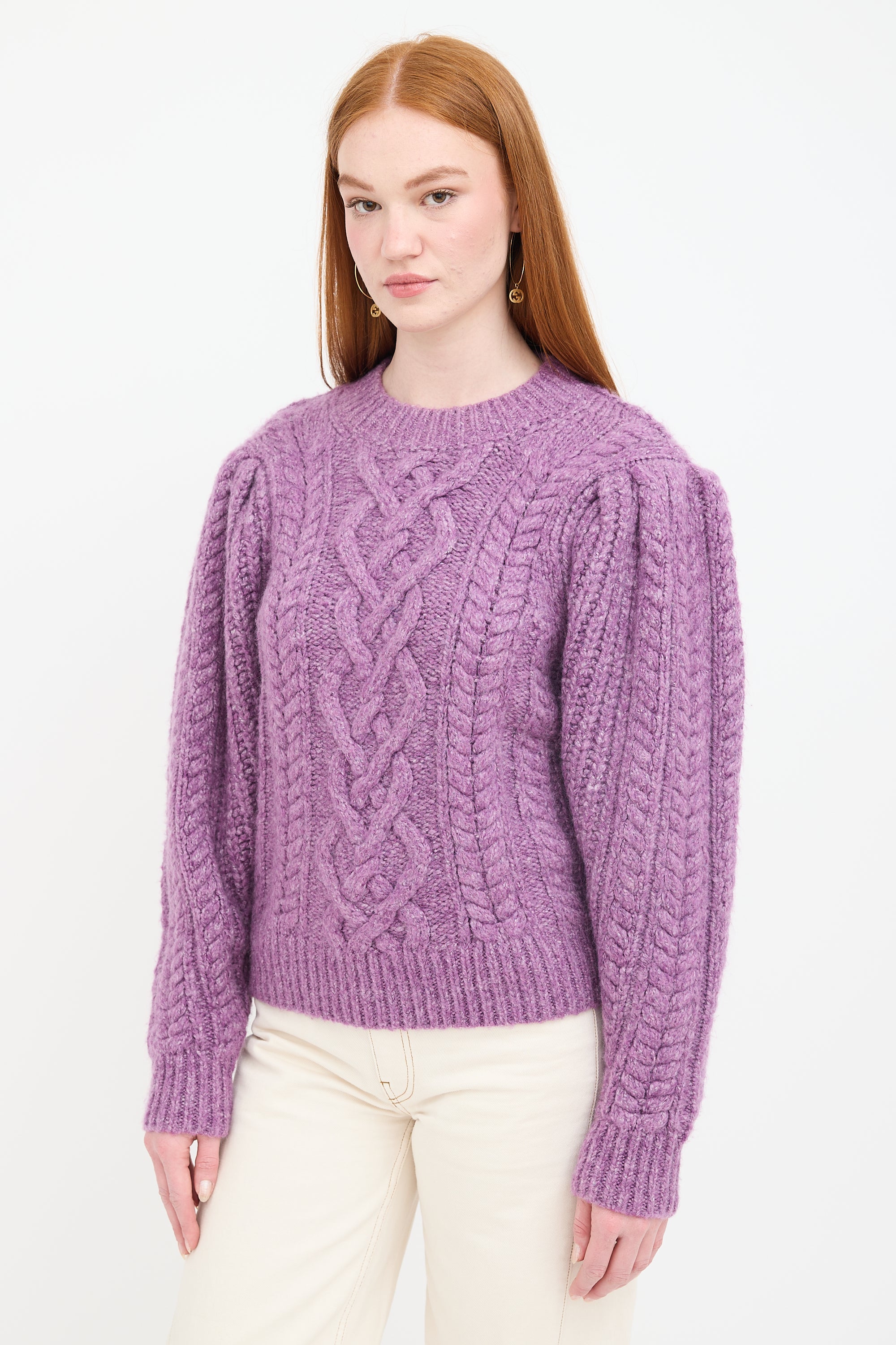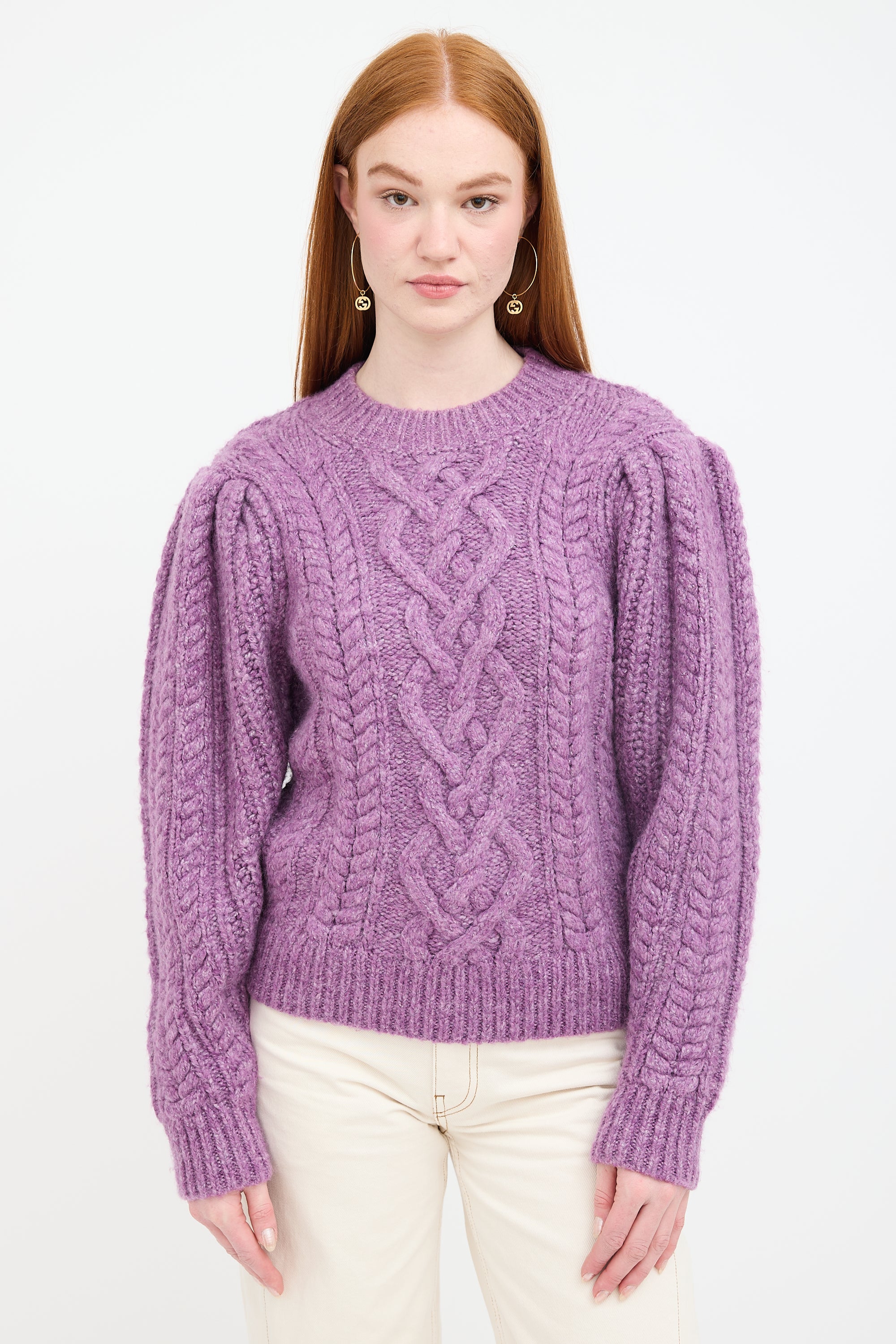 Pre-owned Isabel Marant Étoile purple chunky cable knit sweater featuring a crew neckline, puffed shoulder, and a ribbed hem and cuffs.